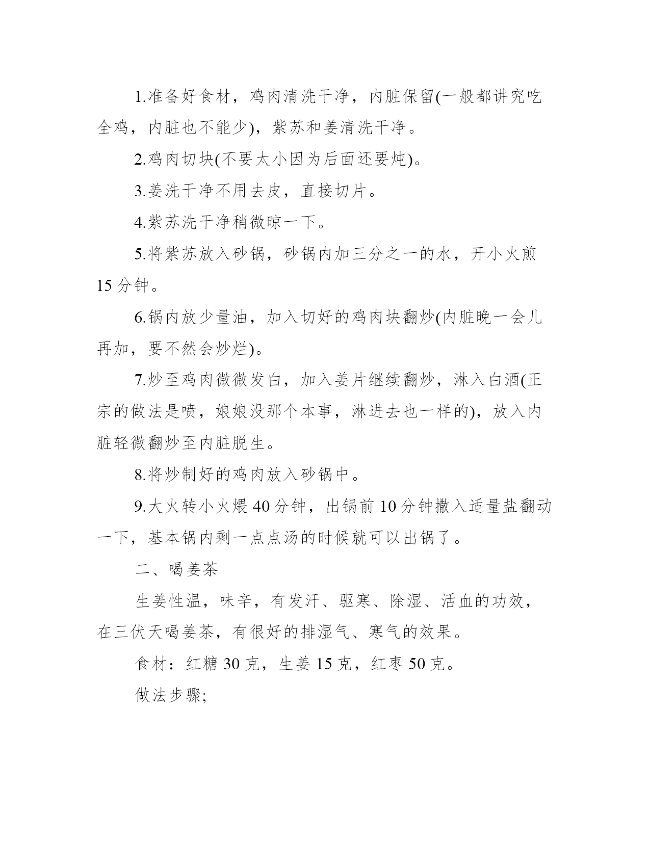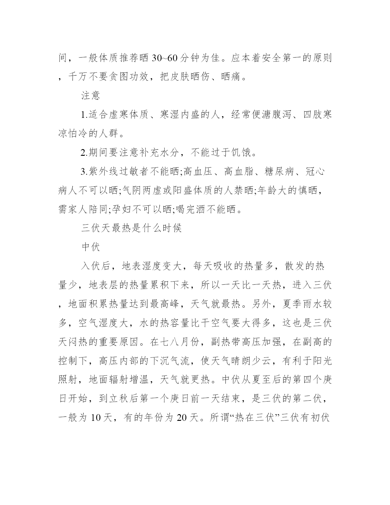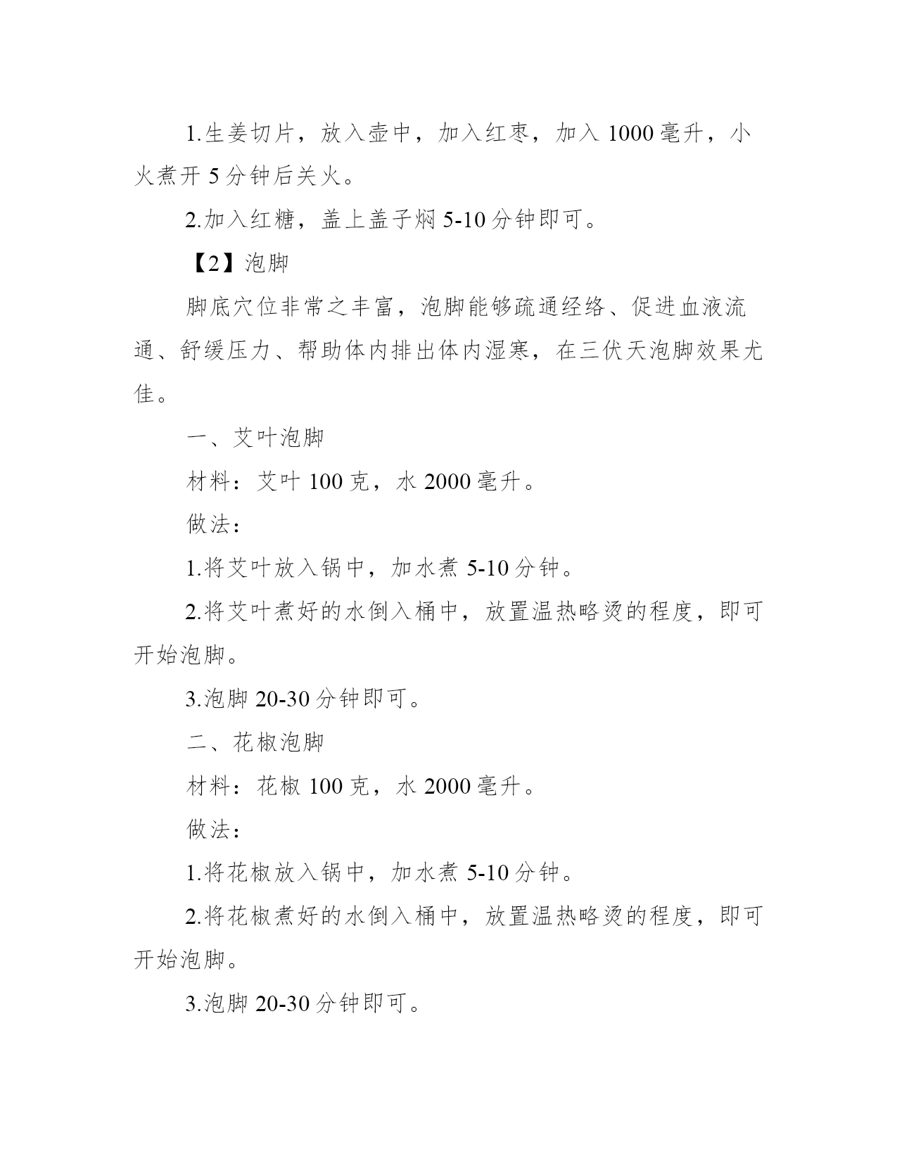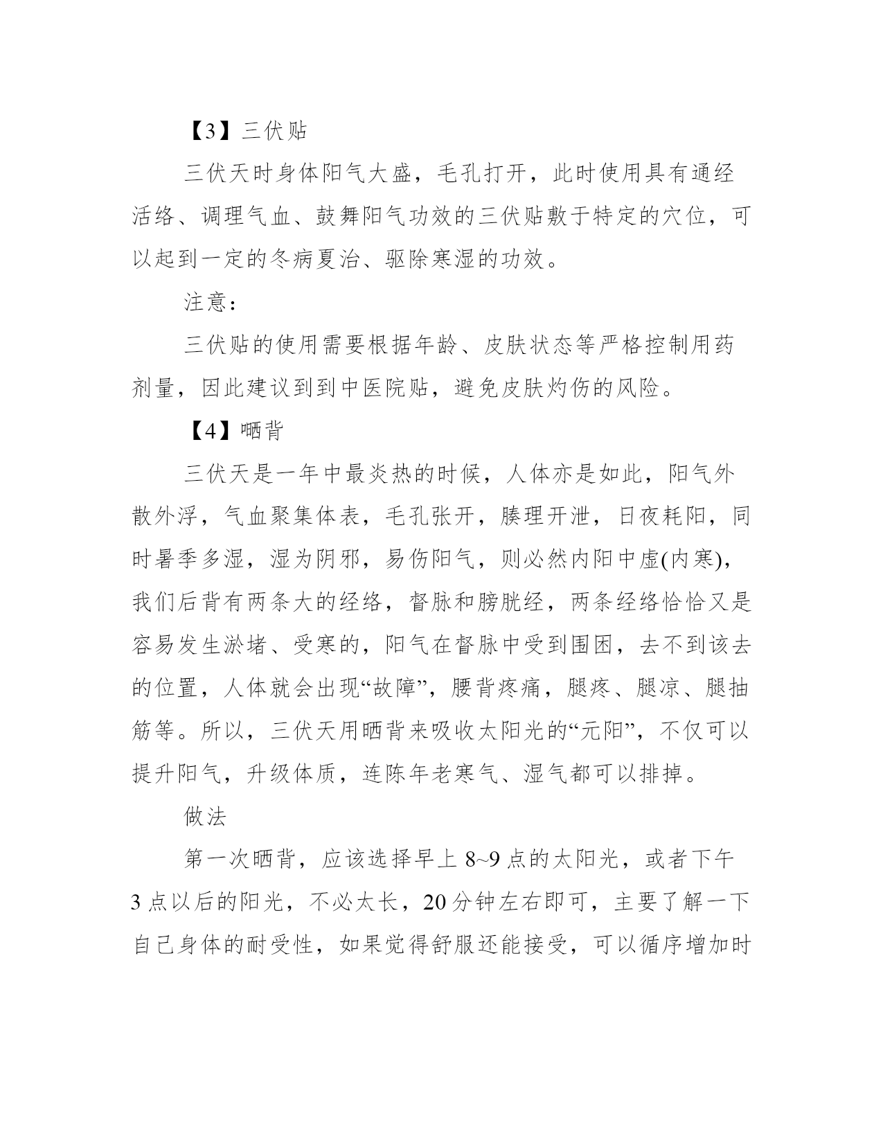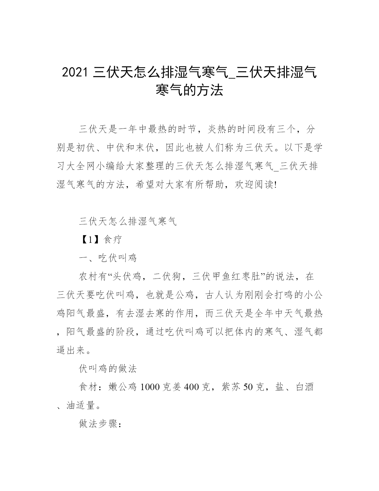 2021三伏天怎么排湿气寒气_三伏天排湿气寒气的方法三伏天是一年中最热的时节,炎热的时间段有三个,分别是初伏、中伏和末伏,因此也被人们称为三伏天。以下是学习大全网小编给大家整理的三伏天怎么排湿气寒气_三伏天排湿气寒气的方法,希望对大家有所帮助,欢迎阅读!三伏天怎么排湿气寒气【1】食疗一、吃伏叫鸡农村有“头伏鸡,二伏狗,三伏甲鱼红枣肚”的说法,在三伏天要吃伏叫鸡,也就是公鸡,古人认为刚刚会打鸣的小公鸡阳气最盛,有去湿去寒的作用,而三伏天是全年中天气最热,阳气最盛的阶段,通过吃伏叫鸡可以把体内的寒气、湿气都逼出来。伏叫鸡的做法食材:嫩公鸡1000克姜400克,紫苏50克,盐、白酒、油适量。做法步骤:1.准备好食材,鸡肉清洗干净,内脏保留(一般都讲究吃全鸡,内脏也不能少),紫苏和姜清洗干净。2.鸡肉切块(不要太小因为后面还要炖)。3.姜洗干净不用去皮,直接切片。4.紫苏洗干净稍微晾一下。5.将紫苏放入砂锅,砂锅内加三分之一的水,开小火煎15分钟。6.锅内放少量油,加入切好的鸡肉块翻炒(内脏晚一会儿再加,要不然会炒烂)。7.炒至鸡肉微微发白,加入姜片继续翻炒,淋入白酒(正宗的做法是喷,娘娘没那个本事,淋进去也一样的),放入内脏轻微翻炒至内脏脱生。8.将炒制好的鸡肉放入砂锅中。9.大火转小火煨40分钟,出锅前10分钟撒入适量盐翻动一下,基本锅内剩一点点汤的时候就可以出锅了。二、喝姜茶生姜性温,味辛,有发汗、驱寒、除湿、活血的功效,在三伏天喝姜茶,有很好的排湿气、寒气的效果。食材:红糖30克,生姜15克,红枣50克。做法步骤;1.生姜切片,放入壶中,加入红枣,加入1000毫升,小火煮开5分钟后关火。2.加入红糖,盖上盖子焖5-10分钟即可。【2】泡脚脚底穴位非常之丰富,泡脚能够疏通经络、促进血液流通、舒缓压力、帮助体内排出体内湿寒,在三伏天泡脚效果尤佳。一、艾叶泡脚材料:艾叶100克,水2000毫升。做法:1.将艾叶放入锅中,加水煮5-10分钟。2.将艾叶煮好的水倒入桶中,放置温热略烫的程度,即可开始泡脚。3.泡脚20-30分钟即可。二、花椒泡脚材料:花椒100克,水2000毫升。做法:1.将花椒放入锅中,加水煮5-10分钟。2.将花椒煮好的水倒入桶中,放置温热略烫的程度,即可开始泡脚。3.泡脚20-30分钟即可。【3】三伏贴三伏天时身体阳气大盛,毛孔打开,此时使用具有通经活络、调理气血、鼓舞阳气功效的三伏贴敷于特定的穴位,可以起到一定的冬病夏治、驱除寒湿的功效。注意:三伏贴的使用需要根据年龄、皮肤状态等严格控制用药剂量,因此建议到到中医院贴,避免皮肤灼伤的风险。【4】嗮背三伏天是一年中最炎热的时候,人体亦是如此,阳气外散外浮,气血聚集体表,毛孔张开,腠理开泄,日夜耗阳,同时暑季多湿,湿为阴邪,易伤阳气,则必然内阳中虚(内寒),我们后背有两条大的经络,督脉和膀胱经,两条经络恰恰又是容易发生淤堵、受寒的,阳气在督脉中受到围困,去不到该去的位置,人体就会出现“故障”,腰背疼痛,腿疼、腿凉、腿抽筋等。所以,三伏天用晒背来吸收太阳光的“元阳”,不仅可以提升阳气,升级体质,连陈年老寒气、湿气都可以排掉。做法第一次晒背,应该选择早上8~9点的太阳光,或者下午3点以后的阳光,不必太长,20分钟左右即可,主要了解一下自己身体的耐受性,如果觉得舒服还能接受,可以循序增加时间,一般体质推荐晒30~60分钟为佳。应本着安全第一的原则,千万不要贪图功效,把皮肤晒伤、晒痛。注意1.适合虚寒体质、寒湿内盛的人,经常便溏腹泻、四肢寒凉怕冷的人群。2.期间要注意补充水分,不能过于饥饿。3.紫外线过敏者不能晒;高血压、高血脂、糖尿病、冠心病人不可以晒;气阴两虚或阳盛体质的人禁晒;年龄大的慎晒,需家人陪同;孕妇不可以晒;喝完酒不能晒。三伏天最热是什么时候中伏入伏后,地表湿度变大,每天吸收的热量多,散发的热量少,地表层的热量累积下来,所以一天比一天热,进入三伏,地面积累热量达到最高峰,天气就最热。另外,夏季雨水较多,空气湿度大,水的热容量比干空气要大得多,这也是三伏天闷热的重要原因。在七八月份,副热带高压加强,在副高的控制下,高压内部的下沉气流,使天气晴朗少云,有利于阳光照射,地面辐射增温,天气就更热。中伏从夏至后的第四个庚日开始,到立秋后第一个庚日前一天结束,是三伏的第二伏,一般为10天,有的年份为20天。所谓“热在三伏”三伏有初伏、中伏和末伏之分,它的日期是由节气的日期和干支纪日的日期相配合来决定的。三伏天为什么那么热“三伏天”的气候特点是气温高、气压低、湿度大、风速小,是一年中最热的时节。这是因为,夏季的白天比黑夜长,白天时间长,阳光照射的时间也长,地表吸收的热量远大于支出,这就使地面一天天聚集的热量增加,温度持续增高,在盛夏,也就是在三伏天期间地表热量的积累达到高峰。