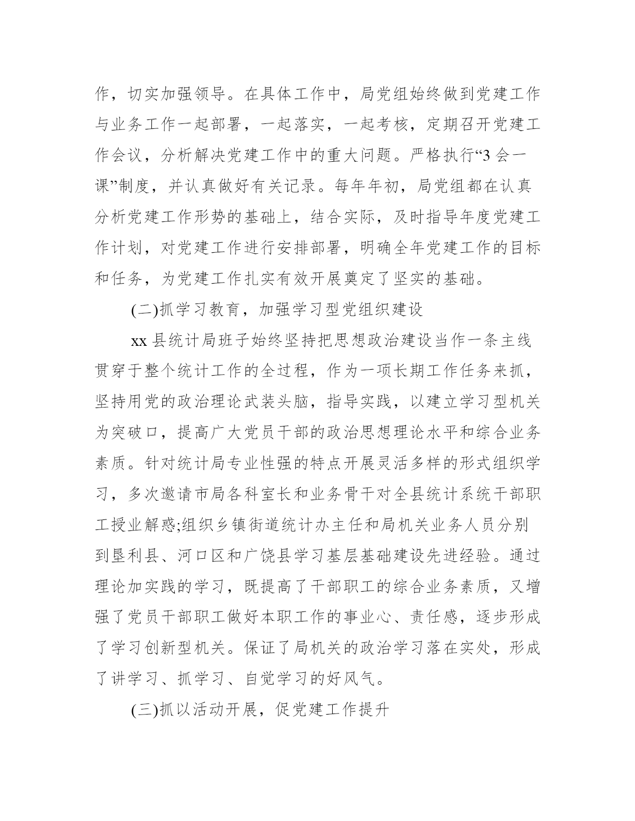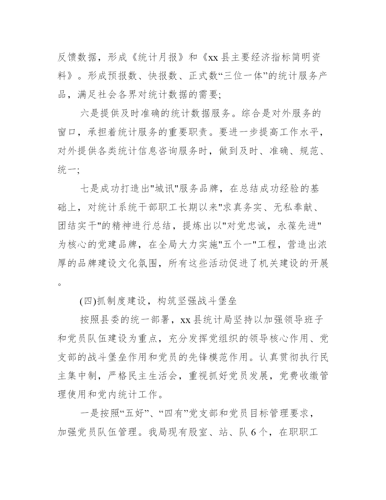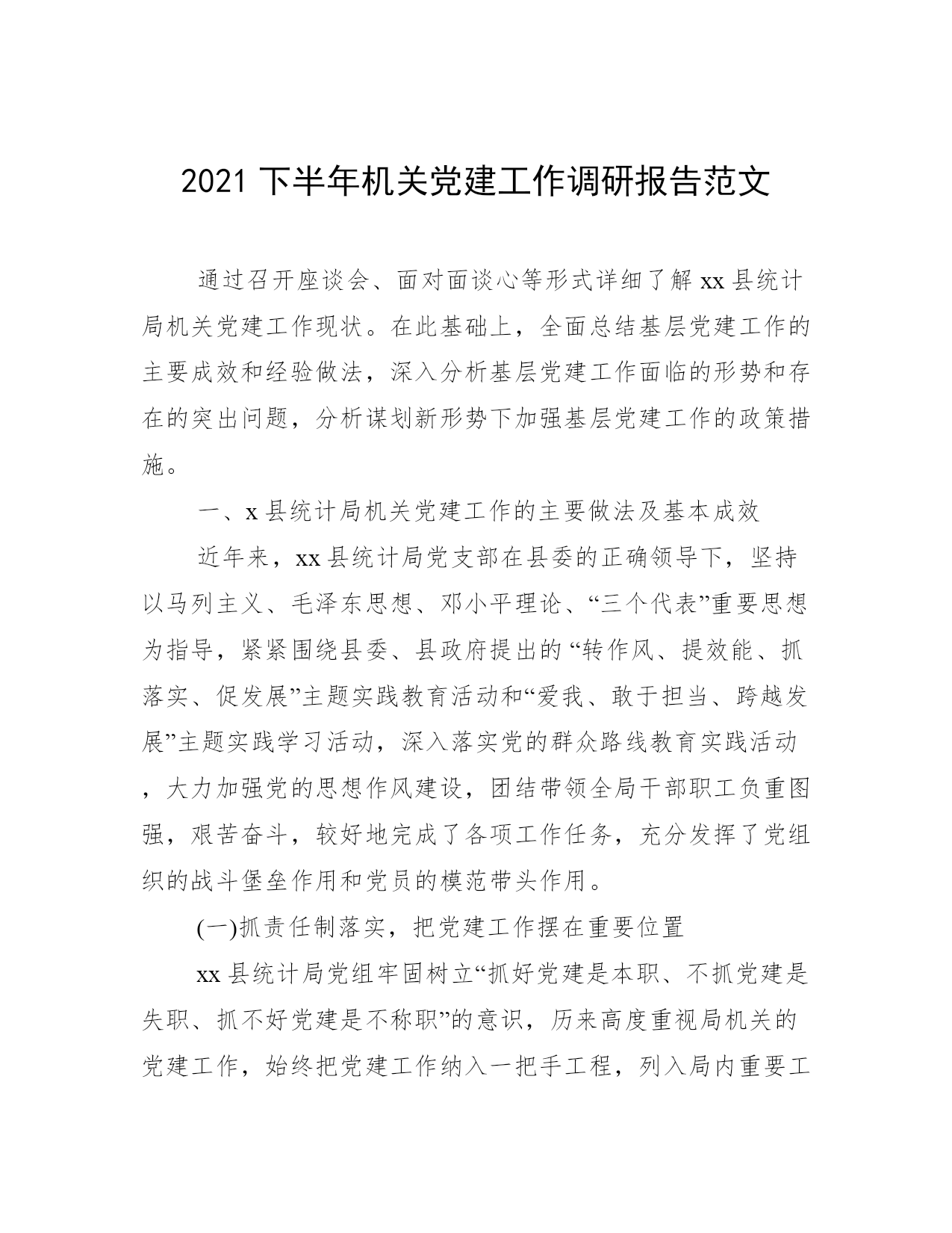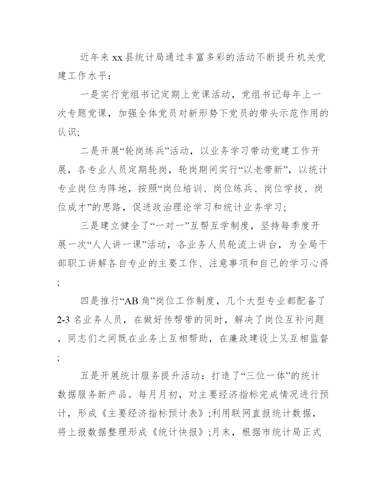 2021下半年机关党建工作调研报告范文通过召开座谈会、面对面谈心等形式详细了解xx县统计局机关党建工作现状。在此基础上,全面总结基层党建工作的主要成效和经验做法,深入分析基层党建工作面临的形势和存在的突出问题,分析谋划新形势下加强基层党建工作的政策措施。一、x县统计局机关党建工作的主要做法及基本成效近年来,xx县统计局党支部在县委的正确领导下,坚持以马列主义、毛泽东思想、邓小平理论、“三个代表”重要思想为指导,紧紧围绕县委、县政府提出的“转作风、提效能、抓落实、促发展”主题实践教育活动和“爱我、敢于担当、跨越发展”主题实践学习活动,深入落实党的群众路线教育实践活动,大力加强党的思想作风建设,团结带领全局干部职工负重图强,艰苦奋斗,较好地完成了各项工作任务,充分发挥了党组织的战斗堡垒作用和党员的模范带头作用。(一)抓责任制落实,把党建工作摆在重要位置xx县统计局党组牢固树立“抓好党建是本职、不抓党建是失职、抓不好党建是不称职”的意识,历来高度重视局机关的党建工作,始终把党建工作纳入一把手工程,列入局内重要工作,切实加强领导。在具体工作中,局党组始终做到党建工作与业务工作一起部署,一起落实,一起考核,定期召开党建工作会议,分析解决党建工作中的重大问题。严格执行“3会一课”制度,并认真做好有关记录。每年年初,局党组都在认真分析党建工作形势的基础上,结合实际,及时指导年度党建工作计划,对党建工作进行安排部署,明确全年党建工作的目标和任务,为党建工作扎实有效开展奠定了坚实的基础。(二)抓学习教育,加强学习型党组织建设xx县统计局班子始终坚持把思想政治建设当作一条主线贯穿于整个统计工作的全过程,作为一项长期工作任务来抓,坚持用党的政治理论武装头脑,指导实践,以建立学习型机关为突破口,提高广大党员干部的政治思想理论水平和综合业务素质。针对统计局专业性强的特点开展灵活多样的形式组织学习,多次邀请市局各科室长和业务骨干对全县统计系统干部职工授业解惑;组织乡镇街道统计办主任和局机关业务人员分别到垦利县、河口区和广饶县学习基层基础建设先进经验。通过理论加实践的学习,既提高了干部职工的综合业务素质,又增强了党员干部职工做好本职工作的事业心、责任感,逐步形成了学习创新型机关。保证了局机关的政治学习落在实处,形成了讲学习、抓学习、自觉学习的好风气。(三)抓以活动开展,促党建工作提升近年来xx县统计局通过丰富多彩的活动不断提升机关党建工作水平:一是实行党组书记定期上党课活动,党组书记每年上一次专题党课,加强全体党员对新形势下党员的带头示范作用的认识;二是开展“轮岗练兵”活动,以业务学习带动党建工作开展,各专业人员定期轮岗,轮岗期间实行“以老带新”,以统计专业岗位为阵地,按照“岗位培训、岗位练兵、岗位学技、岗位成才”的思路,促进政治理论学习和统计业务学习;三是建立健全了“一对一”互帮互学制度,坚持每季度开展一次“人人讲一课”活动,各业务人员轮流上讲台,为全局干部职工讲解各自专业的主要工作、注意事项和自己的学习心得;四是推行“AB角”岗位工作制度,几个大型专业都配备了2-3名业务人员,在做好传帮带的同时,解决了岗位互补问题,同志们之间既在业务上互相帮助,在廉政建设上又互相监督;五是开展统计服务提升活动:打造了“三位一体”的统计数据服务新产品。每月月初,对主要经济指标完成情况进行预计,形成《主要经济指标预计表》;利用联网直报统计数据,将上报数据整理形成《统计快报》;月末,根据市统计局正式反馈数据,形成《统计月报》和《xx县主要经济指标简明资料》。形成预报数、快报数、正式数“三位一体”的统计服务产品,满足社会各界对统计数据的需要;六是提供及时准确的统计数据服务。综合是对外服务的窗口,承担着统计服务的重要职责。要进一步提高工作水平,对外提供各类统计信息咨询服务时,做到及时、准确、规范、统一;七是成功打造出"城讯"服务品牌,在总结成功经验的基础上,对统计系统干部职工长期以来"求真务实、无私奉献、团结实干"的精神进行总结,提炼出以"对党忠诚,永葆先进"为核心的党建品牌,在全局大力实施"五个一"工程,营造出浓厚的品牌建设文化氛围,所有这些活动促进了机关建设的开展。(四)抓制度建设,构筑坚强战斗堡垒按照县委的统一部署,xx县统计局坚持以加强领导班子和党员队伍建设为重点,充分发挥党组织的领导核心作用、党支部的战斗堡垒作用和党员的先锋模范作用。认真贯彻执行民主集中制,严格民主生活会,重视抓好党员发展,党费收缴管理使用和党内统计工作。一是按照“五好”、“四有”党支部和党员目标管理要求,加强党员队伍管理。我局现有股室、站、队6个,在职职工26人。截至目前,共有党员19人,其中在职党员14人,支部班子成员各负其责,对支部工作做到有组织、有领导、有人管、有人办,形成了一个组织健全、班子