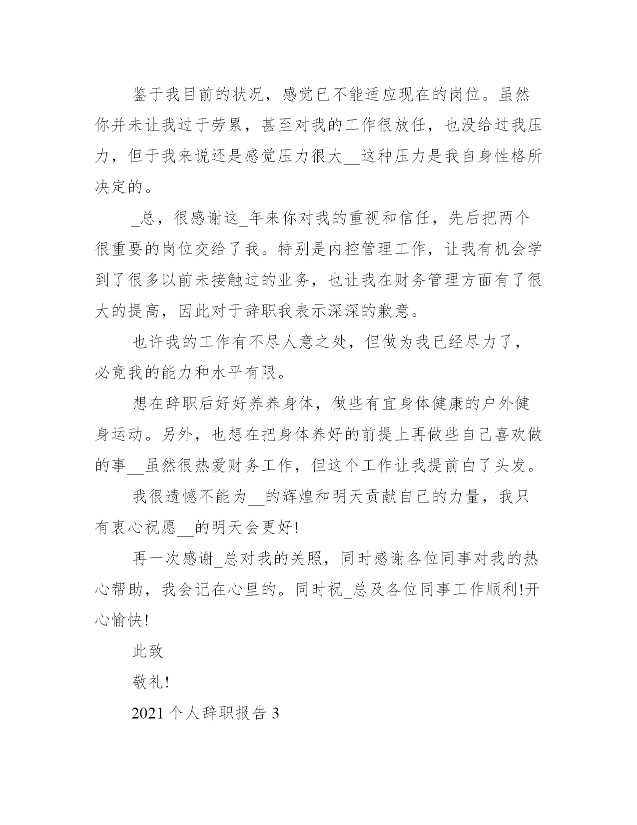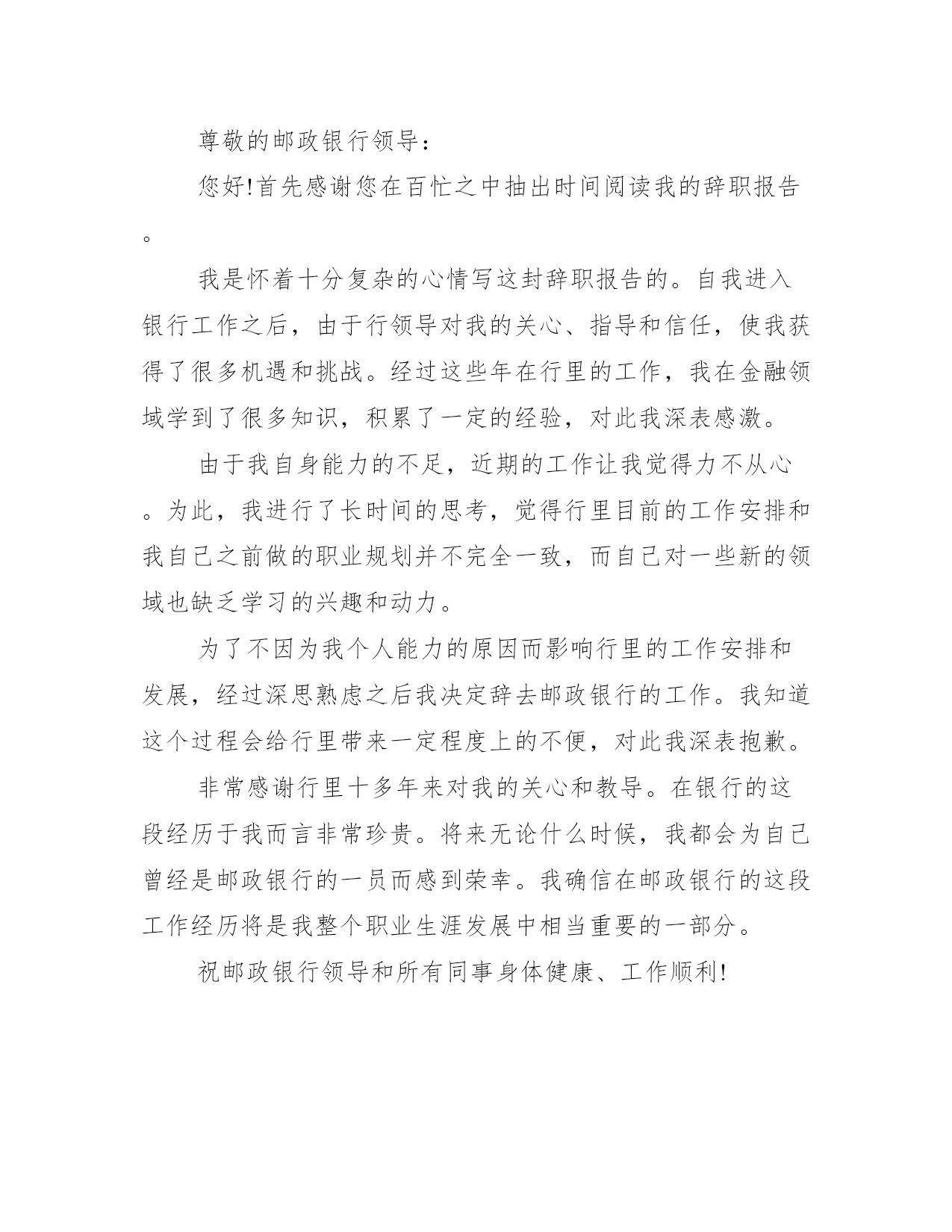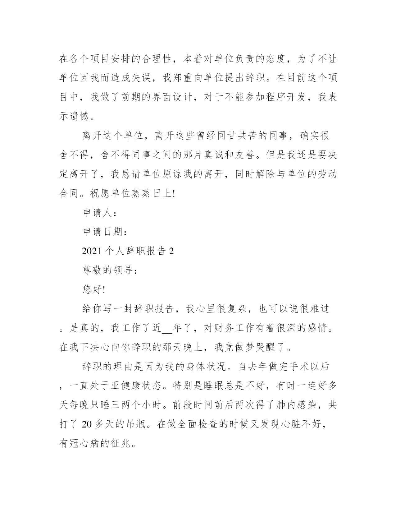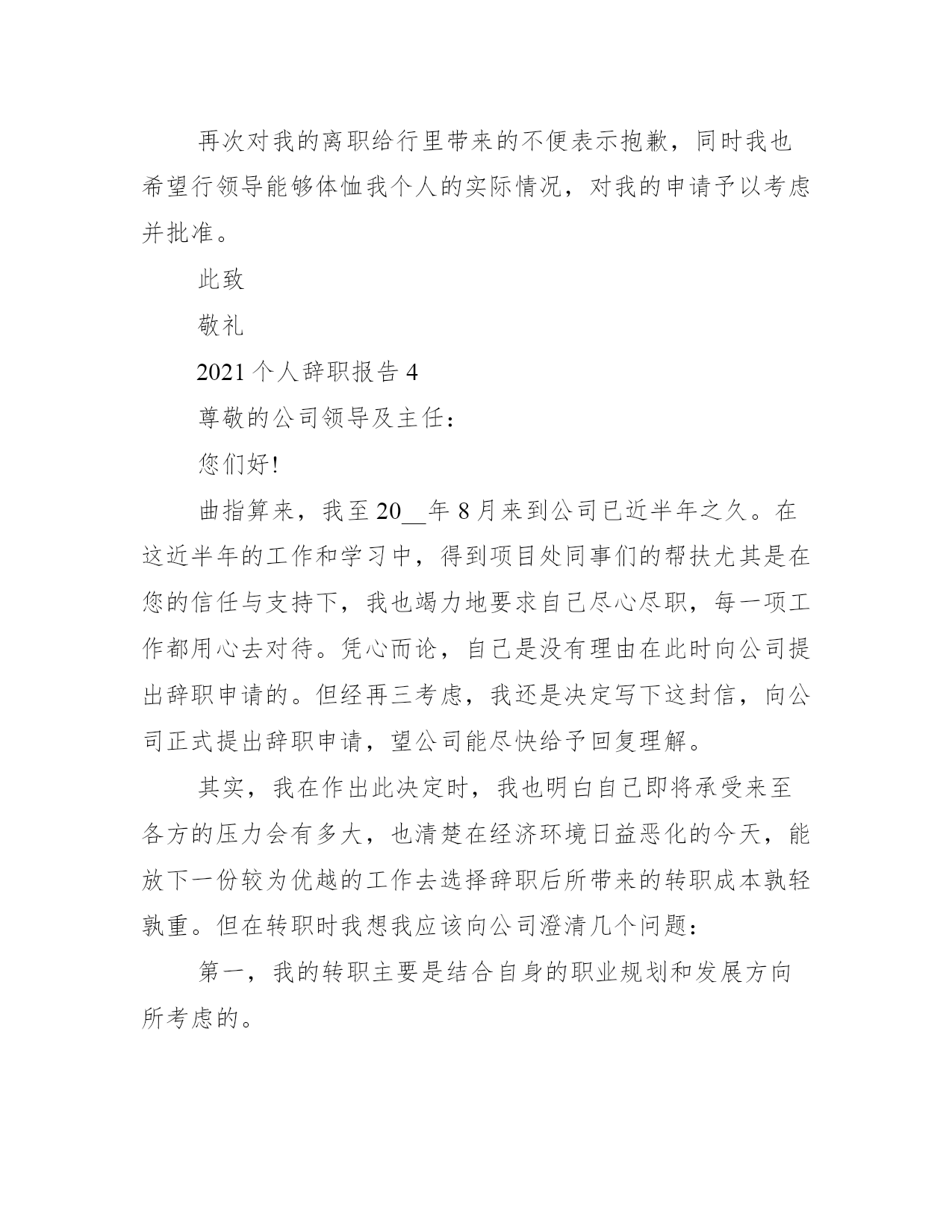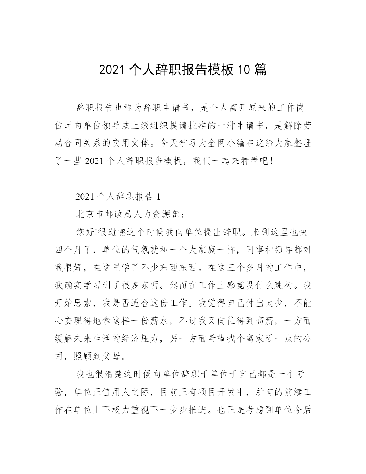 2021个人辞职报告模板10篇辞职报告也称为辞职申请书,是个人离开原来的工作岗位时向单位领导或上级组织提请批准的一种申请书,是解除劳动合同关系的实用文体。今天学习大全网小编在这给大家整理了一些2021个人辞职报告模板,我们一起来看看吧!2021个人辞职报告1北京市邮政局人力资源部:您好!很遗憾这个时候我向单位提出辞职。来到这里也快四个月了,单位的气氛就和一个大家庭一样,同事和领导都对我很好,在这里学了不少东西东西。在这三个多月的工作中,我确实学习到了很多东西。然而在工作上感觉没什么建树。我开始思索,我是否适合这份工作。我觉得自己付出太少,不能心安理得地拿这样一份薪水,不过我又向往得到高薪,一方面缓解未来生活的经济压力,另一方面希望找个离家近一点的公司,照顾到父母。我也很清楚这时候向单位辞职于单位于自己都是一个考验,单位正值用人之际,目前正有项目开发中,所有的前续工作在单位上下极力重视下一步步推进。也正是考虑到单位今后在各个项目安排的合理性,本着对单位负责的态度,为了不让单位因我而造成失误,我郑重向单位提出辞职。在目前这个项目中,我做了前期的界面设计,对于不能参加程序开发,我表示遗憾。离开这个单位,离开这些曾经同甘共苦的同事,确实很舍不得,舍不得同事之间的那片真诚和友善。但是我还是要决定离开了,我恳请单位原谅我的离开,同时解除与单位的劳动合同。祝愿单位蒸蒸日上!申请人:申请日期:2021个人辞职报告2尊敬的领导:您好!给你写一封辞职报告,我心里很复杂,也可以说很难过。是真的,我工作了近__年了,对财务工作有着很深的感情。在我下决心向你辞职的那天晚上,我竞做梦哭醒了。辞职的理由是因为我的身体状况。自去年做完手术以后,一直处于亚健康状态。特别是睡眠总是不好,有时一连好多天每晚只睡三两个小时。前段时间前后两次得了肺内感染,共打了20多天的吊瓶。在做全面检查的时候又发现心脏不好,有冠心病的征兆。鉴于我目前的状况,感觉已不能适应现在的岗位。虽然你并未让我过于劳累,甚至对我的工作很放任,也没给过我压力,但于我来说还是感觉压力很大__这种压力是我自身性格所决定的。_总,很感谢这_年来你对我的重视和信任,先后把两个很重要的岗位交给了我。特别是内控管理工作,让我有机会学到了很多以前未接触过的业务,也让我在财务管理方面有了很大的提高,因此对于辞职我表示深深的歉意。也许我的工作有不尽人意之处,但做为我已经尽力了,必竟我的能力和水平有限。想在辞职后好好养养身体,做些有宜身体健康的户外健身运动。另外,也想在把身体养好的前提上再做些自己喜欢做的事__虽然很热爱财务工作,但这个工作让我提前白了头发。我很遗憾不能为__的辉煌和明天贡献自己的力量,我只有衷心祝愿__的明天会更好!再一次感谢_总对我的关照,同时感谢各位同事对我的热心帮助,我会记在心里的。同时祝_总及各位同事工作顺利!开心愉快!此致敬礼!2021个人辞职报告3尊敬的邮政银行领导:您好!首先感谢您在百忙之中抽出时间阅读我的辞职报告。我是怀着十分复杂的心情写这封辞职报告的。自我进入银行工作之后,由于行领导对我的关心、指导和信任,使我获得了很多机遇和挑战。经过这些年在行里的工作,我在金融领域学到了很多知识,积累了一定的经验,对此我深表感激。由于我自身能力的不足,近期的工作让我觉得力不从心。为此,我进行了长时间的思考,觉得行里目前的工作安排和我自己之前做的职业规划并不完全一致,而自己对一些新的领域也缺乏学习的兴趣和动力。为了不因为我个人能力的原因而影响行里的工作安排和发展,经过深思熟虑之后我决定辞去邮政银行的工作。我知道这个过程会给行里带来一定程度上的不便,对此我深表抱歉。非常感谢行里十多年来对我的关心和教导。在银行的这段经历于我而言非常珍贵。将来无论什么时候,我都会为自己曾经是邮政银行的一员而感到荣幸。我确信在邮政银行的这段工作经历将是我整个职业生涯发展中相当重要的一部分。祝邮政银行领导和所有同事身体健康、工作顺利!再次对我的离职给行里带来的不便表示抱歉,同时我也希望行领导能够体恤我个人的实际情况,对我的申请予以考虑并批准。此致敬礼2021个人辞职报告4尊敬的公司领导及主任:您们好!曲指算来,我至20__年8月来到公司已近半年之久。在这近半年的工作和学习中,得到项目处同事们的帮扶尤其是在您的信任与支持下,我也竭力地要求自己尽心尽职,每一项工作都用心去对待。凭心而论,自己是没有理由在此时向公司提出辞职申请的。但经再三考虑,我还是决定写下这封信,向公司正式提出辞职申请,望公司能尽快给予回复理解。其实,我在作出此决定时,我也明白自己即将承受来至各方的压力会有多大,也清楚在经济环境日益恶化的今天,能放下一份较为优越的工作去选择辞职后所带来的转职成本孰轻孰重。但在转职时我想我应该向公司澄清几个问题:第一,我的转职主