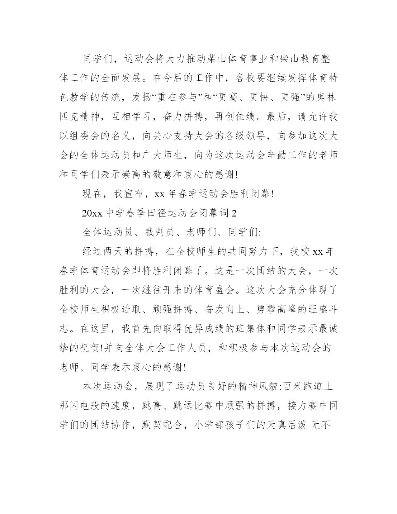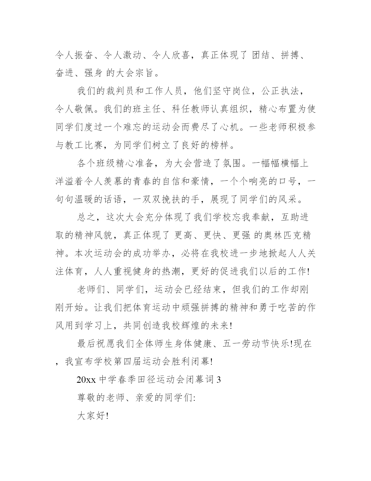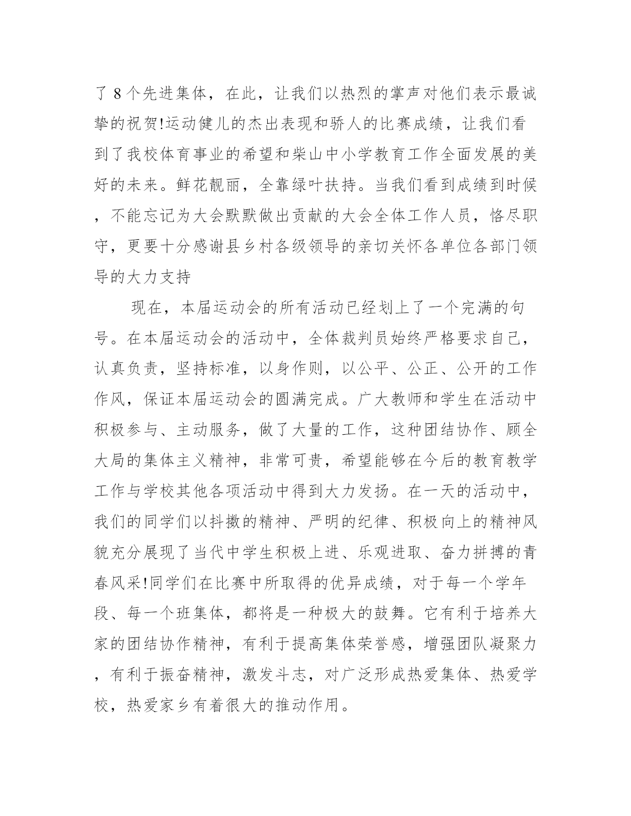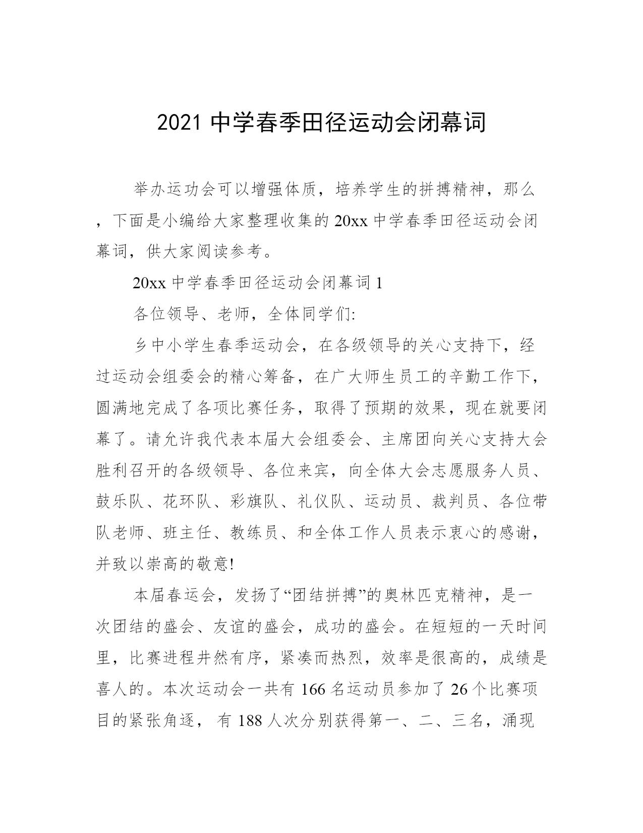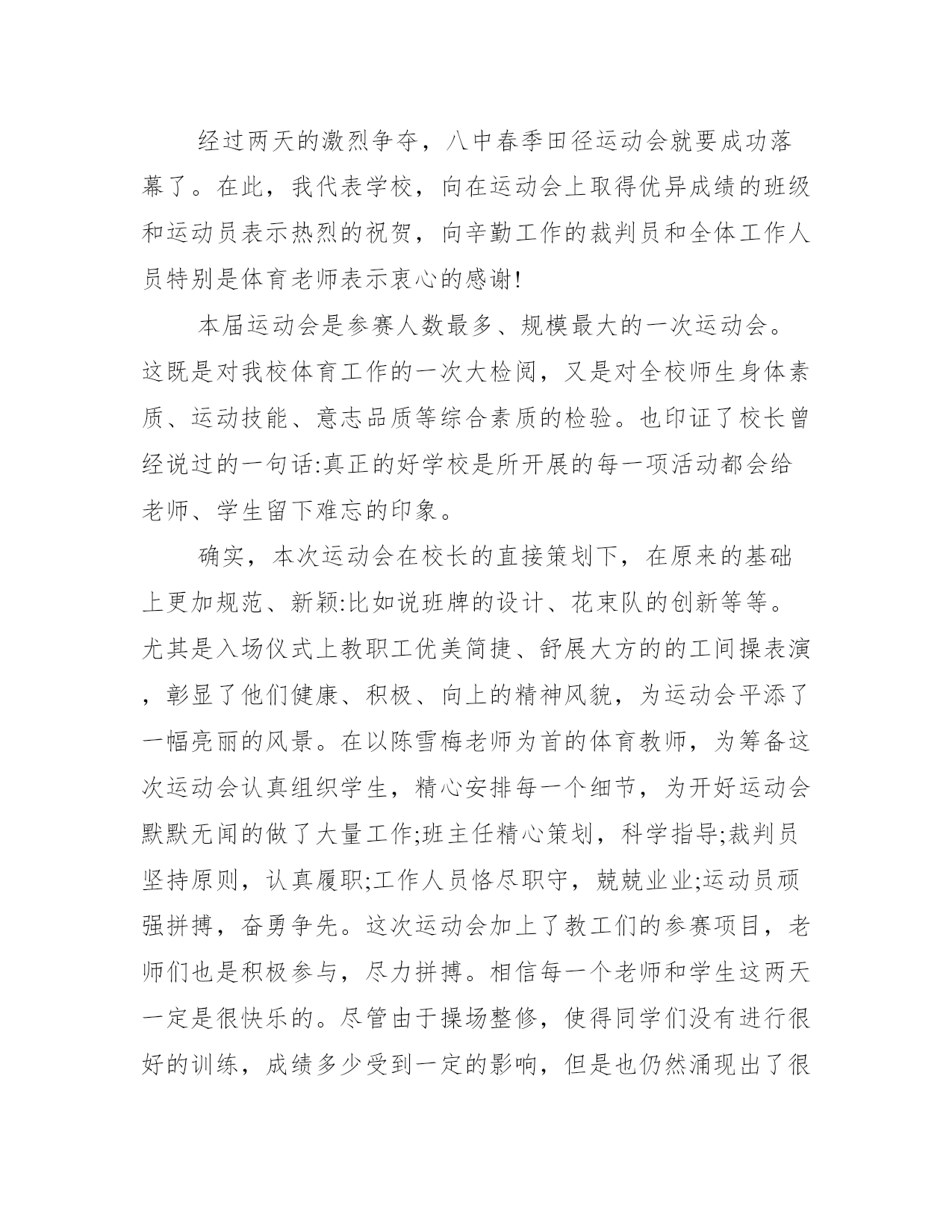 2021中学春季田径运动会闭幕词举办运功会可以增强体质,培养学生的拼搏精神,那么,下面是小编给大家整理收集的20xx中学春季田径运动会闭幕词,供大家阅读参考。20xx中学春季田径运动会闭幕词1各位领导、老师,全体同学们:乡中小学生春季运动会,在各级领导的关心支持下,经过运动会组委会的精心筹备,在广大师生员工的辛勤工作下,圆满地完成了各项比赛任务,取得了预期的效果,现在就要闭幕了。请允许我代表本届大会组委会、主席团向关心支持大会胜利召开的各级领导、各位来宾,向全体大会志愿服务人员、鼓乐队、花环队、彩旗队、礼仪队、运动员、裁判员、各位带队老师、班主任、教练员、和全体工作人员表示衷心的感谢,并致以崇高的敬意!本届春运会,发扬了“团结拼搏”的奥林匹克精神,是一次团结的盛会、友谊的盛会,成功的盛会。在短短的一天时间里,比赛进程井然有序,紧凑而热烈,效率是很高的,成绩是喜人的。本次运动会一共有166名运动员参加了26个比赛项目的紧张角逐,有188人次分别获得第一、二、三名,涌现了8个先进集体,在此,让我们以热烈的掌声对他们表示最诚挚的祝贺!运动健儿的杰出表现和骄人的比赛成绩,让我们看到了我校体育事业的希望和柴山中小学教育工作全面发展的美好的未来。鲜花靓丽,全靠绿叶扶持。当我们看到成绩到时候,不能忘记为大会默默做出贡献的大会全体工作人员,恪尽职守,更要十分感谢县乡村各级领导的亲切关怀各单位各部门领导的大力支持现在,本届运动会的所有活动已经划上了一个完满的句号。在本届运动会的活动中,全体裁判员始终严格要求自己,认真负责,坚持标准,以身作则,以公平、公正、公开的工作作风,保证本届运动会的圆满完成。广大教师和学生在活动中积极参与、主动服务,做了大量的工作,这种团结协作、顾全大局的集体主义精神,非常可贵,希望能够在今后的教育教学工作与学校其他各项活动中得到大力发扬。在一天的活动中,我们的同学们以抖擞的精神、严明的纪律、积极向上的精神风貌充分展现了当代中学生积极上进、乐观进取、奋力拼搏的青春风采!同学们在比赛中所取得的优异成绩,对于每一个学年段、每一个班集体,都将是一种极大的鼓舞。它有利于培养大家的团结协作精神,有利于提高集体荣誉感,增强团队凝聚力,有利于振奋精神,激发斗志,对广泛形成热爱集体、热爱学校,热爱家乡有着很大的推动作用。同学们,运动会将大力推动柴山体育事业和柴山教育整体工作的全面发展。在今后的工作中,各校要继续发挥体育特色教学的传统,发扬“重在参与”和“更高、更快、更强”的奥林匹克精神,互相学习,奋力拼搏,再创佳绩。最后,请允许我以组委会的名义,向关心支持大会的各级领导,向参加这次大会的全体运动员和广大师生,向为这次运动会辛勤工作的老师和同学们表示崇高的敬意和衷心的感谢!现在,我宣布,xx年春季运动会胜利闭幕!20xx中学春季田径运动会闭幕词2全体运动员、裁判员、老师们、同学们:经过两天的拼搏,在全校师生的共同努力下,我校xx年春季体育运动会即将胜利闭幕了。这是一次团结的大会,一次胜利的大会,一次继往开来的体育盛会。这次大会充分体现了全校师生积极进取、顽强拼搏、奋发向上、勇攀高峰的旺盛斗志。在这里,我首先向取得优异成绩的班集体和同学表示最诚挚的祝贺!并向全体大会工作人员,和积极参与本次运动会的老师、同学表示衷心的感谢!本次运动会,展现了运动员良好的精神风貌:百米跑道上那闪电般的速度,跳高、跳远比赛中顽强的拼搏,接力赛中同学们的团结协作,默契配合,小学部孩子们的天真活泼无不令人振奋、令人激动、令人欣喜,真正体现了团结、拼搏、奋进、强身的大会宗旨。我们的裁判员和工作人员,他们坚守岗位,公正执法,令人敬佩。我们的班主任、科任教师认真组织,精心布置为使同学们度过一个难忘的运动会而费尽了心机。一些老师积极参与教工比赛,为同学们树立了良好的榜样。各个班级精心准备,为大会营造了氛围。一幅幅横幅上洋溢着令人羡慕的青春的自信和豪情,一个个响亮的口号,一句句温暖的话语,一双双挽扶的手,展现了同学们的风采。总之,这次大会充分体现了我们学校忘我奉献,互助进取的精神风貌,真正体现了更高、更快、更强的奥林匹克精神。本次运动会的成功举办,必将在我校进一步地掀起人人关注体育,人人重视健身的热潮,更好的促进我们以后的工作!老师们、同学们,运动会已经结束,但我们的工作却刚刚开始。让我们把体育运动中顽强拼搏的精神和勇于吃苦的作风用到学习上,共同创造我校辉煌的未来!最后祝愿我们全体师生身体健康、五一劳动节快乐!现在,我宣布学校第四届运动会胜利闭幕!20xx中学春季田径运动会闭幕词3尊敬的老师、亲爱的同学们:大家好!经过两天的激烈争夺,八中春季田径运动会就要成功落幕了。在此,我代表学校,向在运动会上取得优异成绩的班级和运动员表示热烈的祝贺,向辛勤工作的裁判员和全体工作人员特别是体