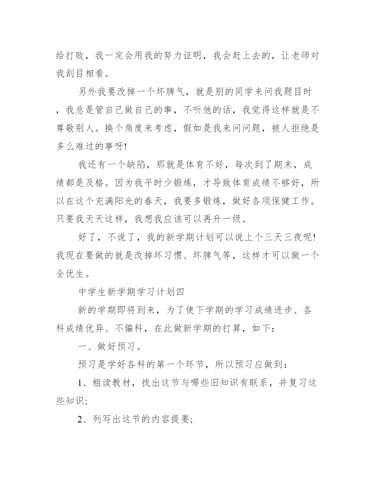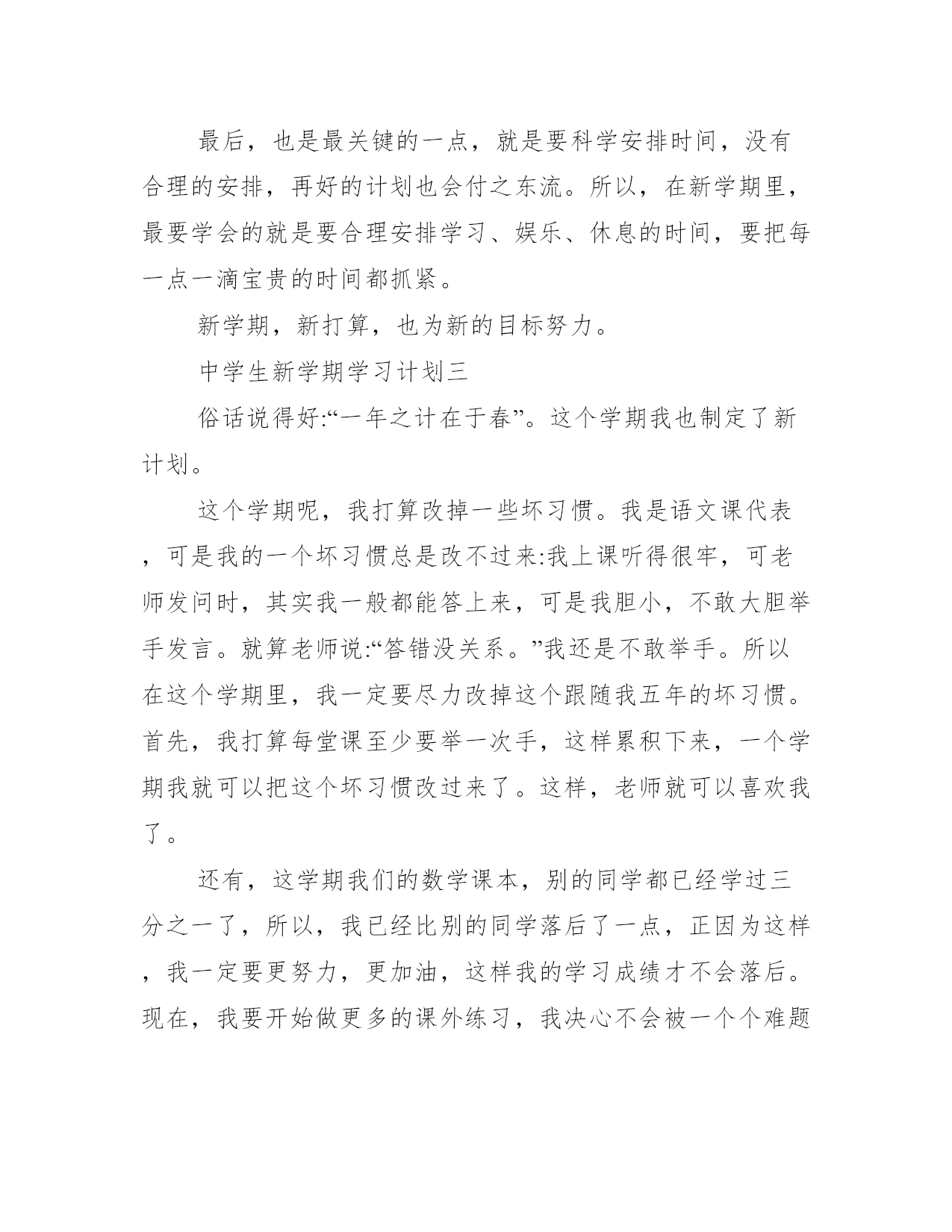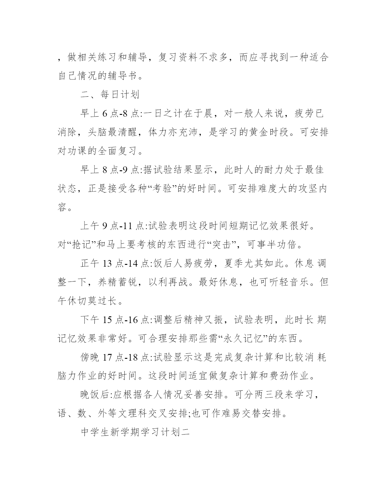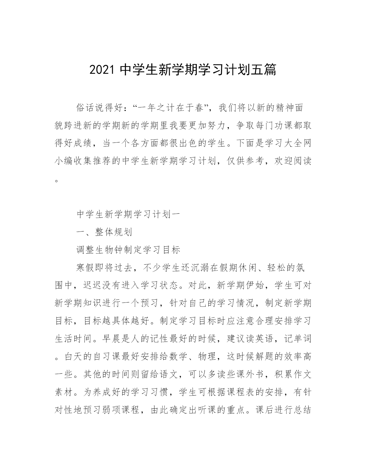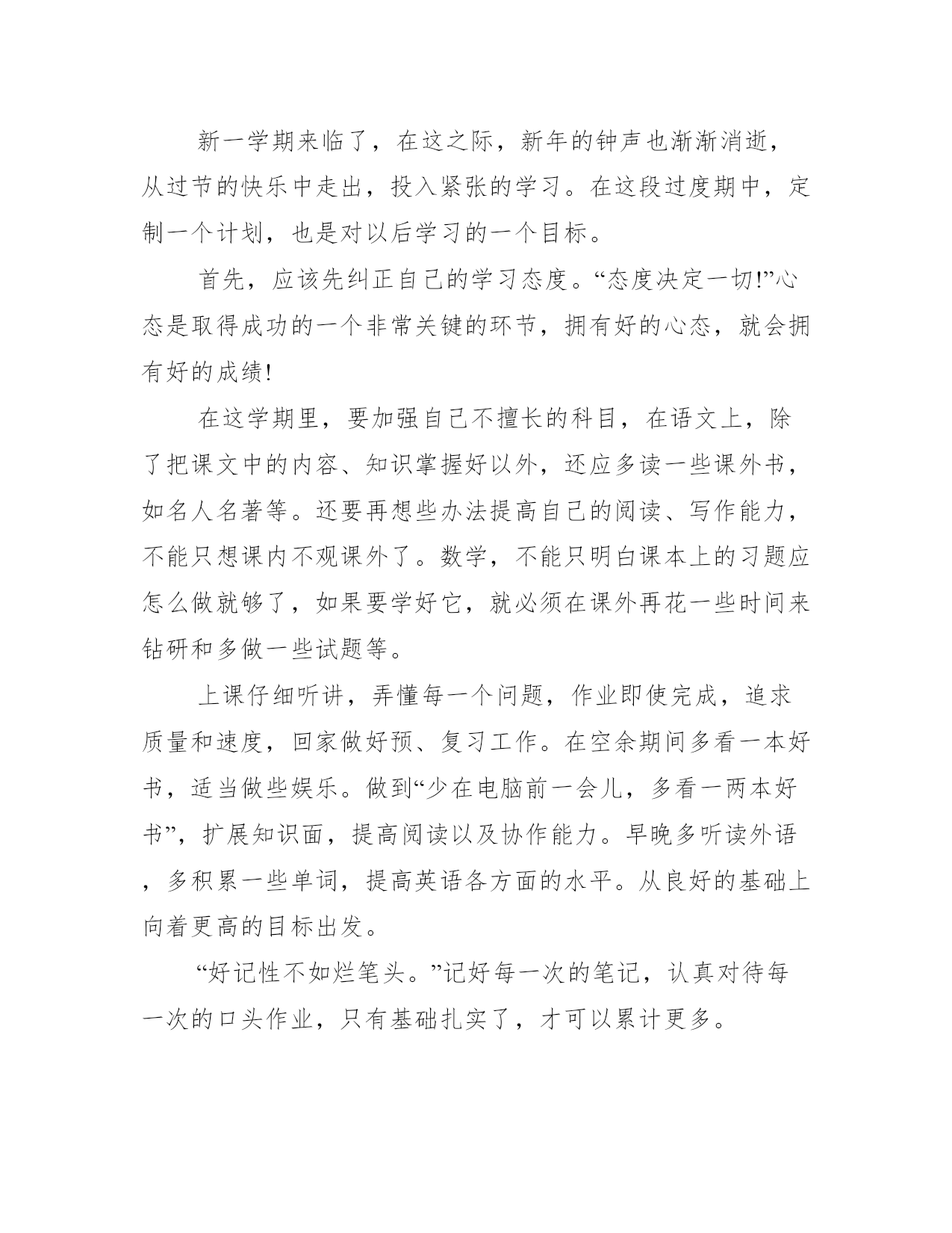 2021中学生新学期学习计划五篇俗话说得好:“一年之计在于春”,我们将以新的精神面貌跨进新的学期新的学期里我要更加努力,争取每门功课都取得好成绩,当一个各方面都很出色的学生。下面是学习大全网小编收集推荐的中学生新学期学习计划,仅供参考,欢迎阅读。中学生新学期学习计划一一、整体规划调整生物钟制定学习目标寒假即将过去,不少学生还沉溺在假期休闲、轻松的氛围中,迟迟没有进入学习状态。对此,新学期伊始,学生可对新学期知识进行一个预习,针对自己的学习情况,制定新学期目标,目标越具体越好。制定学习目标时应注意合理安排学习生活时间。早晨是人的记性最好的时候,建议读英语,记单词。白天的自习课最好安排给数学、物理,这时候解题的效率高一些。其他的时间则留给语文,可以多读些课外书,积累作文素材。为养成好的学习习惯,学生可根据课程表的安排,有针对性地预习弱项课程,由此确定出听课的重点。课后进行总结,做相关练习和辅导,复习资料不求多,而应寻找到一种适合自己情况的辅导书。二、每日计划早上6点-8点:一日之计在于晨,对一般人来说,疲劳已消除,头脑最清醒,体力亦充沛,是学习的黄金时段。可安排对功课的全面复习。早上8点-9点:据试验结果显示,此时人的耐力处于最佳状态,正是接受各种“考验”的好时间。可安排难度大的攻坚内容。上午9点-11点:试验表明这段时间短期记忆效果很好。对“抢记”和马上要考核的东西进行“突击”,可事半功倍。正午13点-14点:饭后人易疲劳,夏季尤其如此。休息调整一下,养精蓄锐,以利再战。最好休息,也可听轻音乐。但午休切莫过长。下午15点-16点:调整后精神又振,试验表明,此时长期记忆效果非常好。可合理安排那些需“永久记忆”的东西。傍晚17点-18点:试验显示这是完成复杂计算和比较消耗脑力作业的好时间。这段时间适宜做复杂计算和费劲作业。晚饭后:应根据各人情况妥善安排。可分两三段来学习,语、数、外等文理科交叉安排;也可作难易交替安排。中学生新学期学习计划二新一学期来临了,在这之际,新年的钟声也渐渐消逝,从过节的快乐中走出,投入紧张的学习。在这段过度期中,定制一个计划,也是对以后学习的一个目标。首先,应该先纠正自己的学习态度。“态度决定一切!”心态是取得成功的一个非常关键的环节,拥有好的心态,就会拥有好的成绩!在这学期里,要加强自己不擅长的科目,在语文上,除了把课文中的内容、知识掌握好以外,还应多读一些课外书,如名人名著等。还要再想些办法提高自己的阅读、写作能力,不能只想课内不观课外了。数学,不能只明白课本上的习题应怎么做就够了,如果要学好它,就必须在课外再花一些时间来钻研和多做一些试题等。上课仔细听讲,弄懂每一个问题,作业即使完成,追求质量和速度,回家做好预、复习工作。在空余期间多看一本好书,适当做些娱乐。做到“少在电脑前一会儿,多看一两本好书”,扩展知识面,提高阅读以及协作能力。早晚多听读外语,多积累一些单词,提高英语各方面的水平。从良好的基础上向着更高的目标出发。“好记性不如烂笔头。”记好每一次的笔记,认真对待每一次的口头作业,只有基础扎实了,才可以累计更多。最后,也是最关键的一点,就是要科学安排时间,没有合理的安排,再好的计划也会付之东流。所以,在新学期里,最要学会的就是要合理安排学习、娱乐、休息的时间,要把每一点一滴宝贵的时间都抓紧。新学期,新打算,也为新的目标努力。中学生新学期学习计划三俗话说得好:“一年之计在于春”。这个学期我也制定了新计划。这个学期呢,我打算改掉一些坏习惯。我是语文课代表,可是我的一个坏习惯总是改不过来:我上课听得很牢,可老师发问时,其实我一般都能答上来,可是我胆小,不敢大胆举手发言。就算老师说:“答错没关系。”我还是不敢举手。所以在这个学期里,我一定要尽力改掉这个跟随我五年的坏习惯。首先,我打算每堂课至少要举一次手,这样累积下来,一个学期我就可以把这个坏习惯改过来了。这样,老师就可以喜欢我了。还有,这学期我们的数学课本,别的同学都已经学过三分之一了,所以,我已经比别的同学落后了一点,正因为这样,我一定要更努力,更加油,这样我的学习成绩才不会落后。现在,我要开始做更多的课外练习,我决心不会被一个个难题给打败,我一定会用我的努力证明,我会赶上去的,让老师对我刮目相看。另外我要改掉一个坏脾气,就是别的同学来问我题目时,我总是管自己做自己的事,不听他的话,我觉得这样就是不尊敬别人。换个角度来考虑,假如是我来问问题,被人拒绝是多么难过的事呀!我还有一个缺陷,那就是体育不好,每次到了期末,成绩都是及格。因为我平时少锻炼,才导致体育成绩不够好,所以在这个充满阳光的春天,我要多锻炼,做好各项保健工作。只要我天天这样,我想我应该可以再升一级。好了,不说了,我的新学期计划可以说上个三天三夜呢!我现在要做的就是改掉坏习惯、坏脾气等,这样才