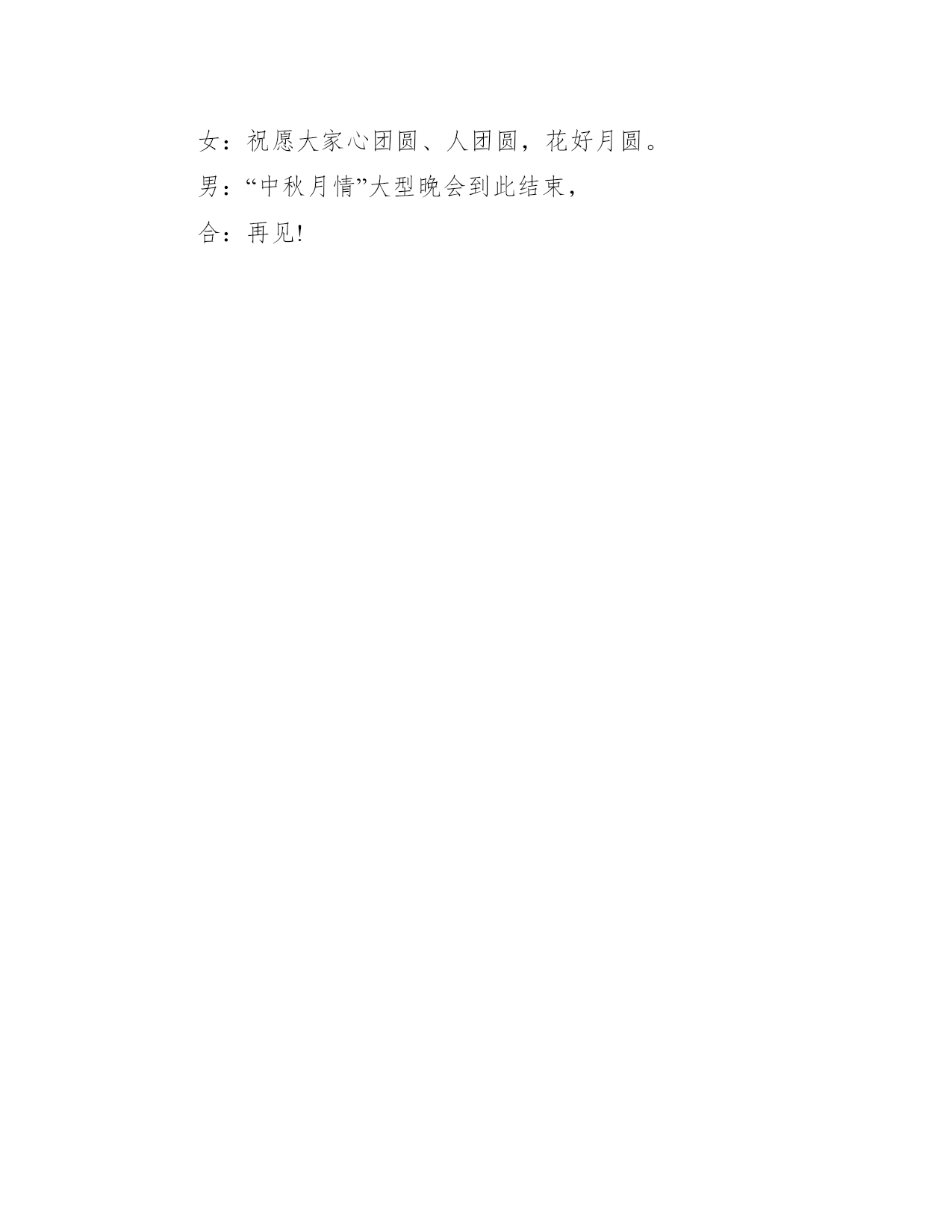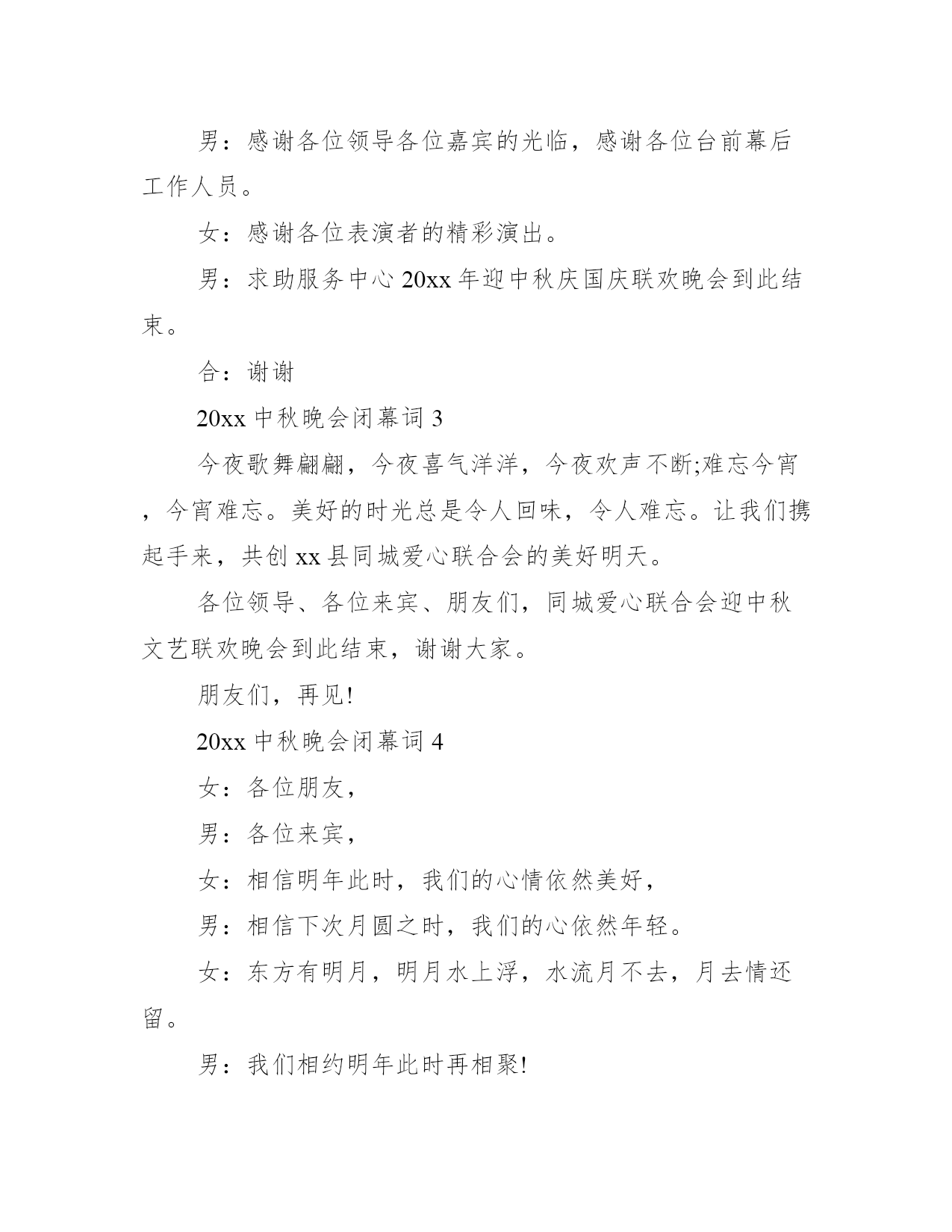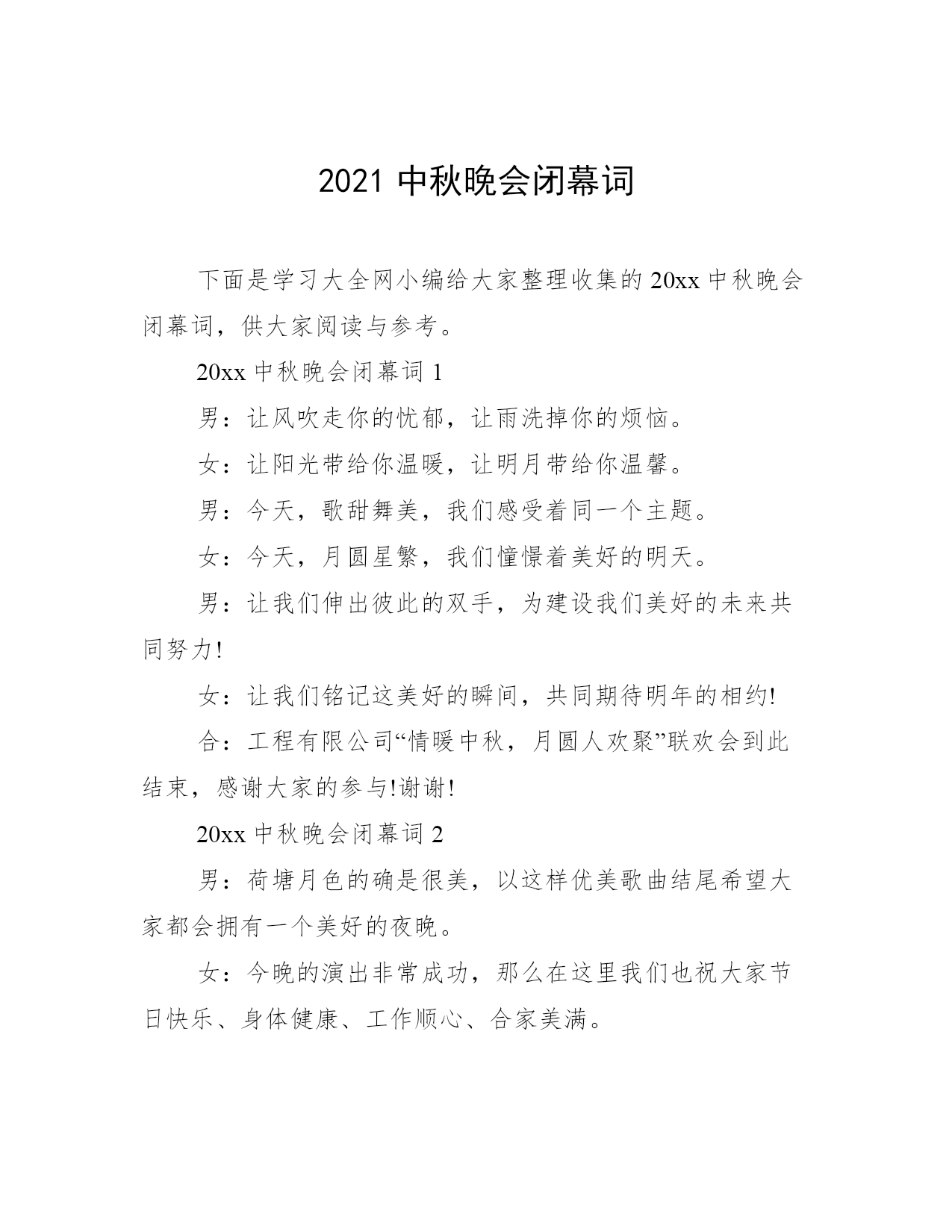 2021中秋晚会闭幕词下面是学习大全网小编给大家整理收集的20xx中秋晚会闭幕词,供大家阅读与参考。20xx中秋晚会闭幕词1男:让风吹走你的忧郁,让雨洗掉你的烦恼。女:让阳光带给你温暖,让明月带给你温馨。男:今天,歌甜舞美,我们感受着同一个主题。女:今天,月圆星繁,我们憧憬着美好的明天。男:让我们伸出彼此的双手,为建设我们美好的未来共同努力!女:让我们铭记这美好的瞬间,共同期待明年的相约!合:工程有限公司“情暖中秋,月圆人欢聚”联欢会到此结束,感谢大家的参与!谢谢!20xx中秋晚会闭幕词2男:荷塘月色的确是很美,以这样优美歌曲结尾希望大家都会拥有一个美好的夜晚。女:今晚的演出非常成功,那么在这里我们也祝大家节日快乐、身体健康、工作顺心、合家美满。男:感谢各位领导各位嘉宾的光临,感谢各位台前幕后工作人员。女:感谢各位表演者的精彩演出。男:求助服务中心20xx年迎中秋庆国庆联欢晚会到此结束。合:谢谢20xx中秋晚会闭幕词3今夜歌舞翩翩,今夜喜气洋洋,今夜欢声不断;难忘今宵,今宵难忘。美好的时光总是令人回味,令人难忘。让我们携起手来,共创xx县同城爱心联合会的美好明天。各位领导、各位来宾、朋友们,同城爱心联合会迎中秋文艺联欢晚会到此结束,谢谢大家。朋友们,再见!20xx中秋晚会闭幕词4女:各位朋友,男:各位来宾,女:相信明年此时,我们的心情依然美好,男:相信下次月圆之时,我们的心依然年轻。女:东方有明月,明月水上浮,水流月不去,月去情还留。男:我们相约明年此时再相聚!女:祝愿大家心团圆、人团圆,花好月圆。男:“中秋月情”大型晚会到此结束,合:再见!