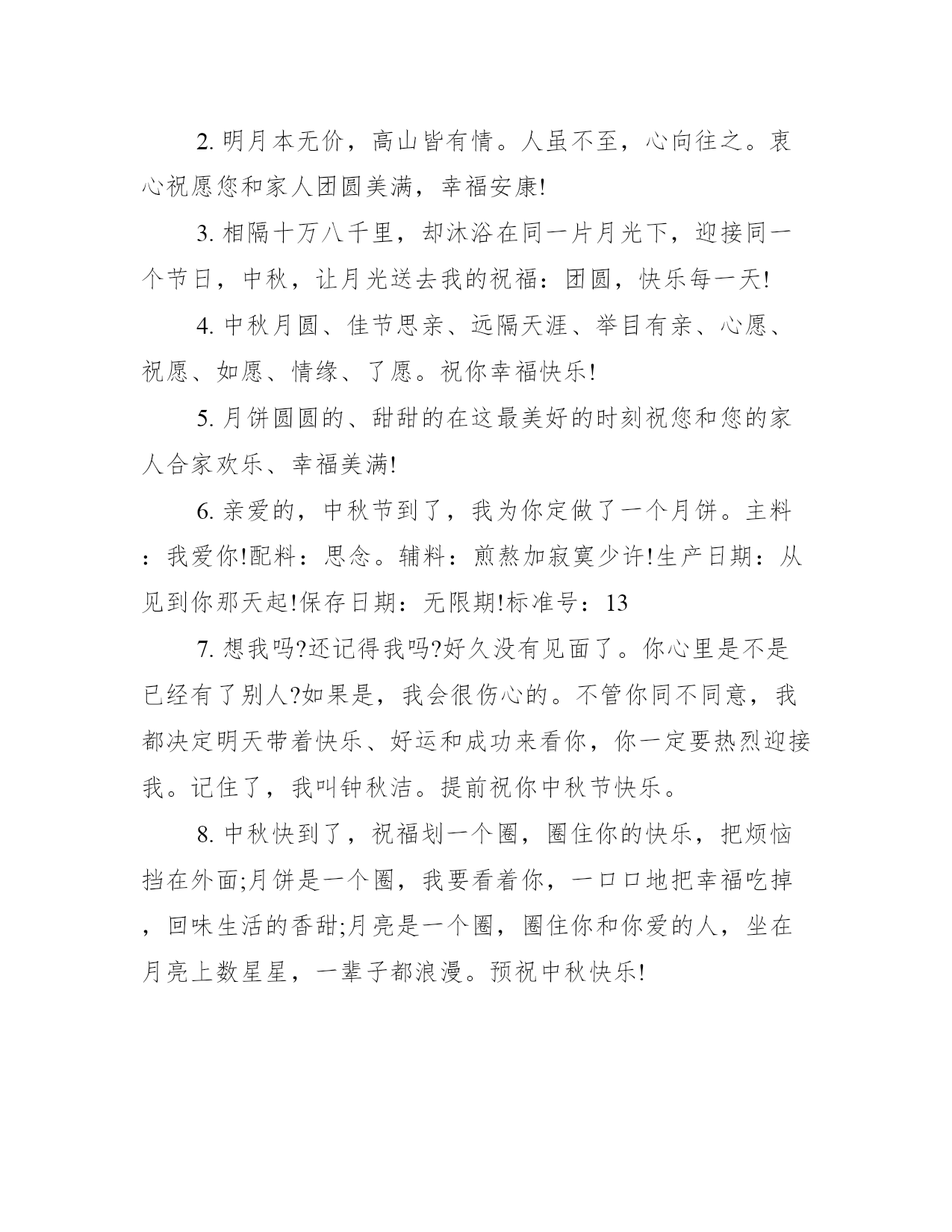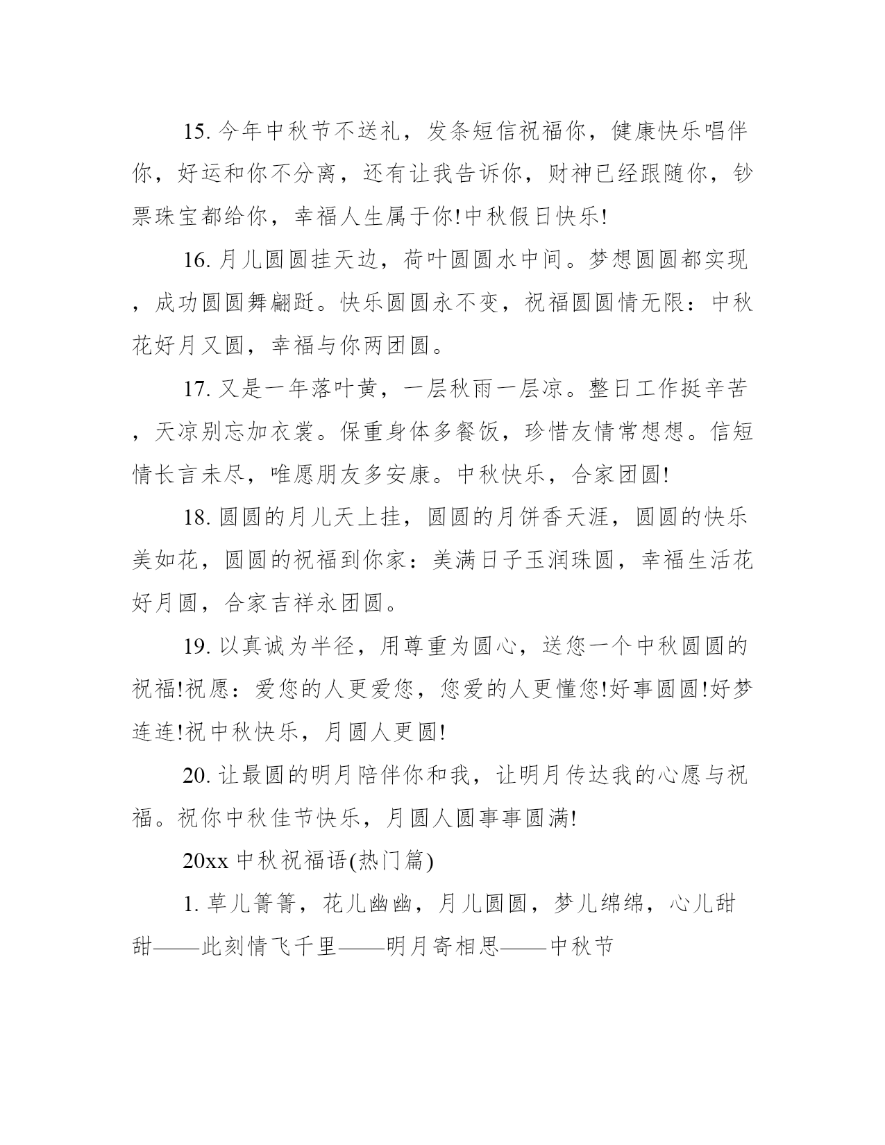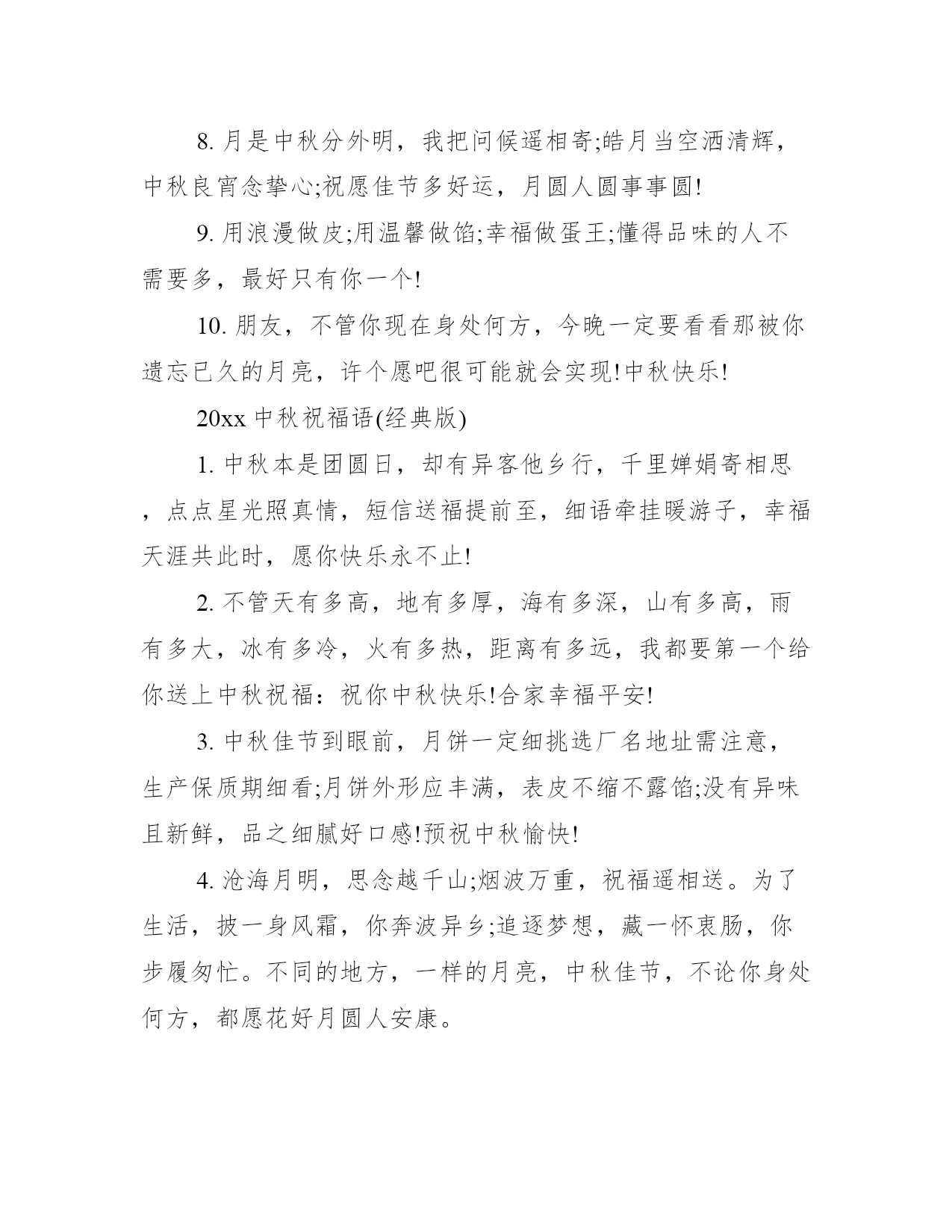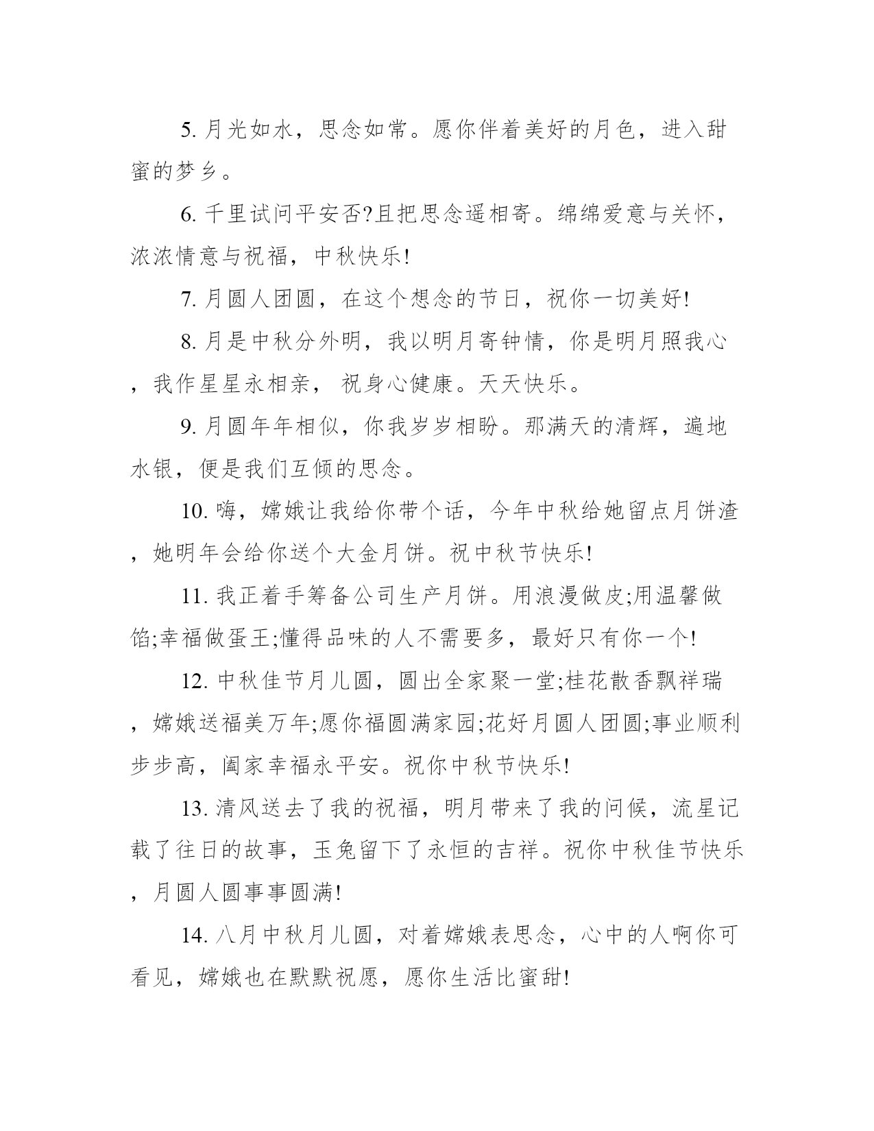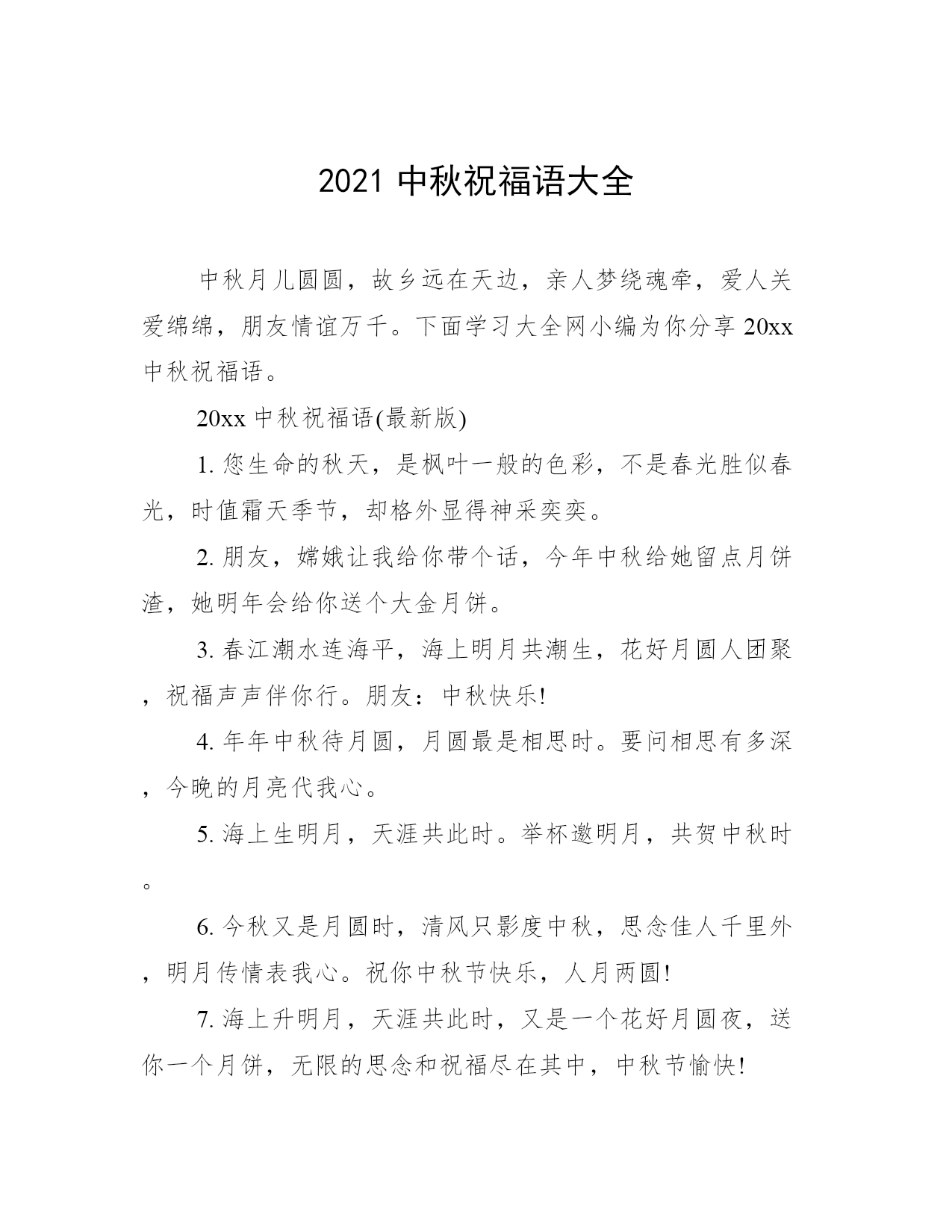 2021中秋祝福语大全中秋月儿圆圆,故乡远在天边,亲人梦绕魂牵,爱人关爱绵绵,朋友情谊万千。下面学习大全网小编为你分享20xx中秋祝福语。20xx中秋祝福语(最新版)1.您生命的秋天,是枫叶一般的色彩,不是春光胜似春光,时值霜天季节,却格外显得神采奕奕。2.朋友,嫦娥让我给你带个话,今年中秋给她留点月饼渣,她明年会给你送个大金月饼。3.春江潮水连海平,海上明月共潮生,花好月圆人团聚,祝福声声伴你行。朋友:中秋快乐!4.年年中秋待月圆,月圆最是相思时。要问相思有多深,今晚的月亮代我心。5.海上生明月,天涯共此时。举杯邀明月,共贺中秋时。6.今秋又是月圆时,清风只影度中秋,思念佳人千里外,明月传情表我心。祝你中秋节快乐,人月两圆!7.海上升明月,天涯共此时,又是一个花好月圆夜,送你一个月饼,无限的思念和祝福尽在其中,中秋节愉快!8.月是中秋分外明,我把问候遥相寄;皓月当空洒清辉,中秋良宵念挚心;祝愿佳节多好运,月圆人圆事事圆!9.用浪漫做皮;用温馨做馅;幸福做蛋王;懂得品味的人不需要多,最好只有你一个!10.朋友,不管你现在身处何方,今晚一定要看看那被你遗忘已久的月亮,许个愿吧很可能就会实现!中秋快乐!20xx中秋祝福语(经典版)1.中秋本是团圆日,却有异客他乡行,千里婵娟寄相思,点点星光照真情,短信送福提前至,细语牵挂暖游子,幸福天涯共此时,愿你快乐永不止!2.不管天有多高,地有多厚,海有多深,山有多高,雨有多大,冰有多冷,火有多热,距离有多远,我都要第一个给你送上中秋祝福:祝你中秋快乐!合家幸福平安!3.中秋佳节到眼前,月饼一定细挑选厂名地址需注意,生产保质期细看;月饼外形应丰满,表皮不缩不露馅;没有异味且新鲜,品之细腻好口感!预祝中秋愉快!4.沧海月明,思念越千山;烟波万重,祝福遥相送。为了生活,披一身风霜,你奔波异乡;追逐梦想,藏一怀衷肠,你步履匆忙。不同的地方,一样的月亮,中秋佳节,不论你身处何方,都愿花好月圆人安康。5.月光如水,思念如常。愿你伴着美好的月色,进入甜蜜的梦乡。6.千里试问平安否?且把思念遥相寄。绵绵爱意与关怀,浓浓情意与祝福,中秋快乐!7.月圆人团圆,在这个想念的节日,祝你一切美好!8.月是中秋分外明,我以明月寄钟情,你是明月照我心,我作星星永相亲,祝身心健康。天天快乐。9.月圆年年相似,你我岁岁相盼。那满天的清辉,遍地水银,便是我们互倾的思念。10.嗨,嫦娥让我给你带个话,今年中秋给她留点月饼渣,她明年会给你送个大金月饼。祝中秋节快乐!11.我正着手筹备公司生产月饼。用浪漫做皮;用温馨做馅;幸福做蛋王;懂得品味的人不需要多,最好只有你一个!12.中秋佳节月儿圆,圆出全家聚一堂;桂花散香飘祥瑞,嫦娥送福美万年;愿你福圆满家园;花好月圆人团圆;事业顺利步步高,阖家幸福永平安。祝你中秋节快乐!13.清风送去了我的祝福,明月带来了我的问候,流星记载了往日的故事,玉兔留下了永恒的吉祥。祝你中秋佳节快乐,月圆人圆事事圆满!14.八月中秋月儿圆,对着嫦娥表思念,心中的人啊你可看见,嫦娥也在默默祝愿,愿你生活比蜜甜!15.今年中秋节不送礼,发条短信祝福你,健康快乐唱伴你,好运和你不分离,还有让我告诉你,财神已经跟随你,钞票珠宝都给你,幸福人生属于你!中秋假日快乐!16.月儿圆圆挂天边,荷叶圆圆水中间。梦想圆圆都实现,成功圆圆舞翩跹。快乐圆圆永不变,祝福圆圆情无限:中秋花好月又圆,幸福与你两团圆。17.又是一年落叶黄,一层秋雨一层凉。整日工作挺辛苦,天凉别忘加衣裳。保重身体多餐饭,珍惜友情常想想。信短情长言未尽,唯愿朋友多安康。中秋快乐,合家团圆!18.圆圆的月儿天上挂,圆圆的月饼香天涯,圆圆的快乐美如花,圆圆的祝福到你家:美满日子玉润珠圆,幸福生活花好月圆,合家吉祥永团圆。19.以真诚为半径,用尊重为圆心,送您一个中秋圆圆的祝福!祝愿:爱您的人更爱您,您爱的人更懂您!好事圆圆!好梦连连!祝中秋快乐,月圆人更圆!20.让最圆的明月陪伴你和我,让明月传达我的心愿与祝福。祝你中秋佳节快乐,月圆人圆事事圆满!20xx中秋祝福语(热门篇)1.草儿箐箐,花儿幽幽,月儿圆圆,梦儿绵绵,心儿甜甜——此刻情飞千里——明月寄相思——中秋节2.明月本无价,高山皆有情。人虽不至,心向往之。衷心祝愿您和家人团圆美满,幸福安康!3.相隔十万八千里,却沐浴在同一片月光下,迎接同一个节日,中秋,让月光送去我的祝福:团圆,快乐每一天!4.中秋月圆、佳节思亲、远隔天涯、举目有亲、心愿、祝愿、如愿、情缘、了愿。祝你幸福快乐!5.月饼圆圆的、甜甜的在这最美好的时刻祝您和您的家人合家欢乐、幸福美满!6.亲爱的,中秋节到了,我为你定做了一个月饼。主料:我爱你!配料:思念。辅料:煎熬加寂寞少许!生产日期:从见到你那天起!保存日期:无限期!标准号:137.想我吗?