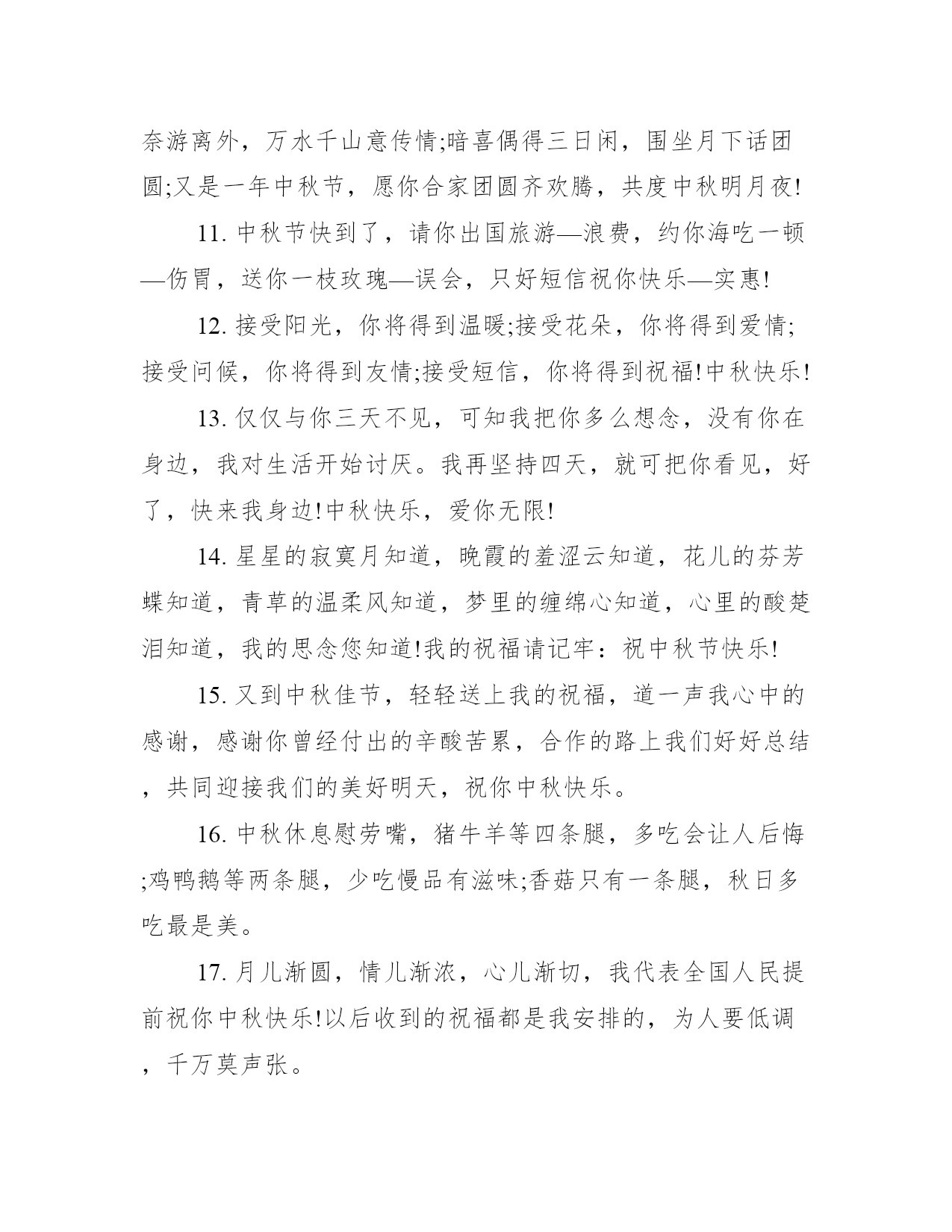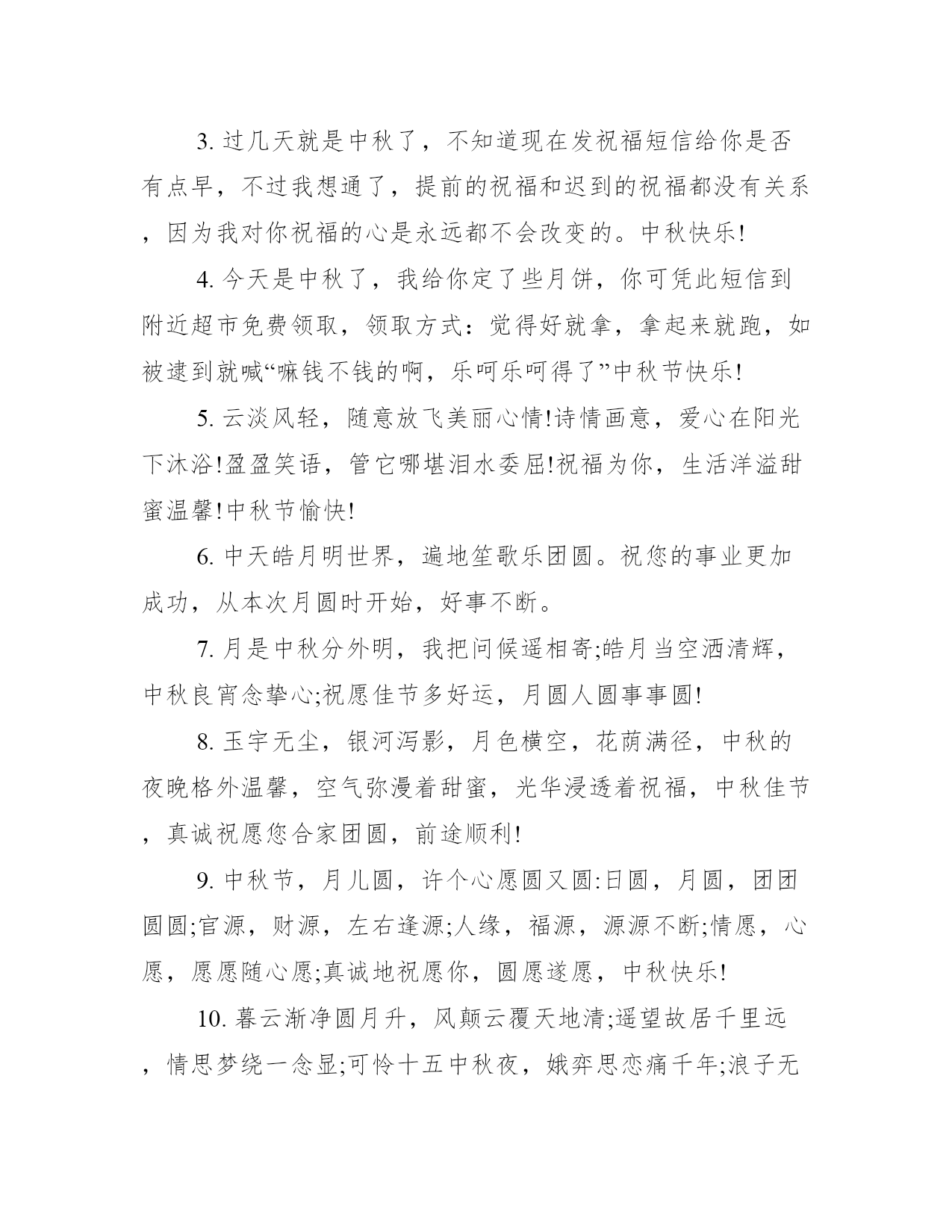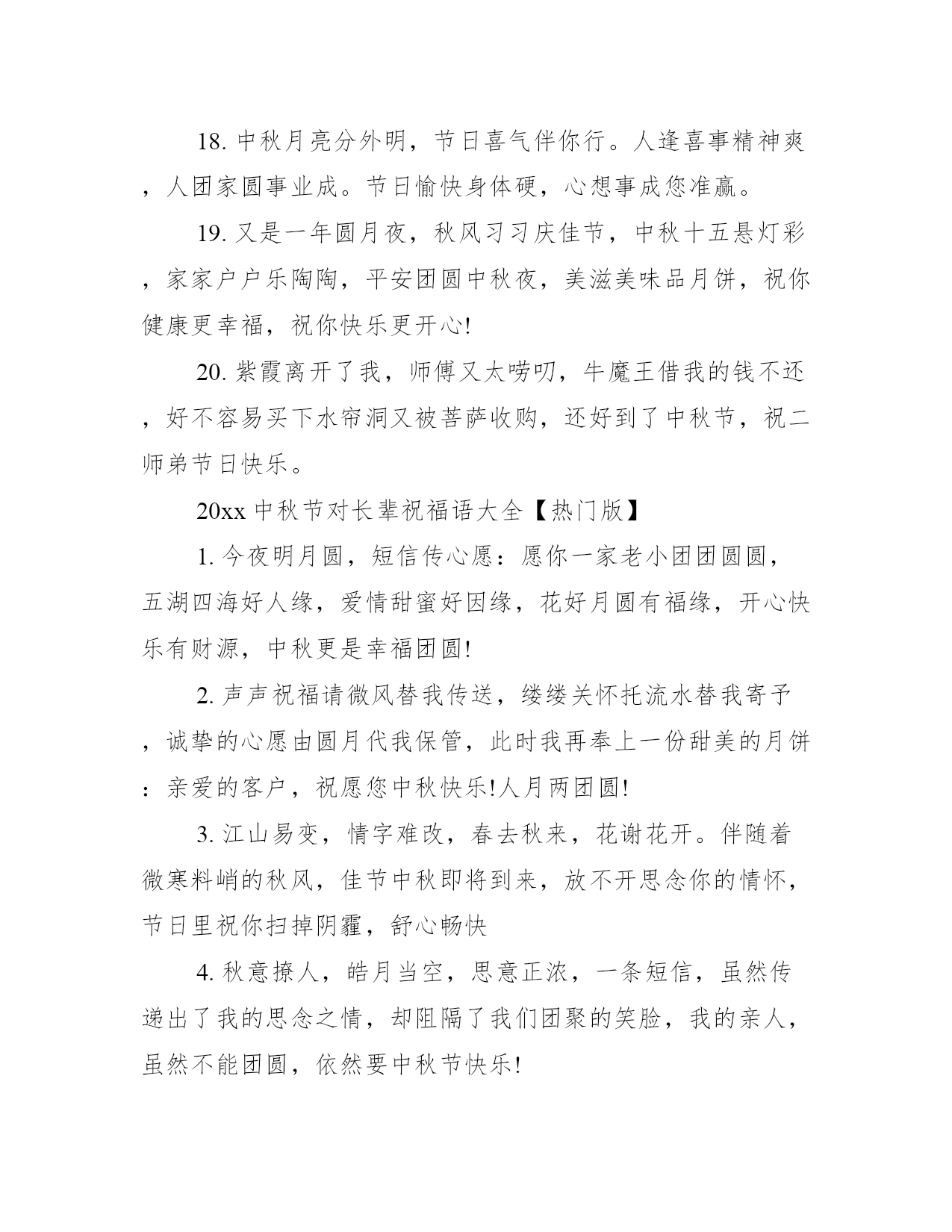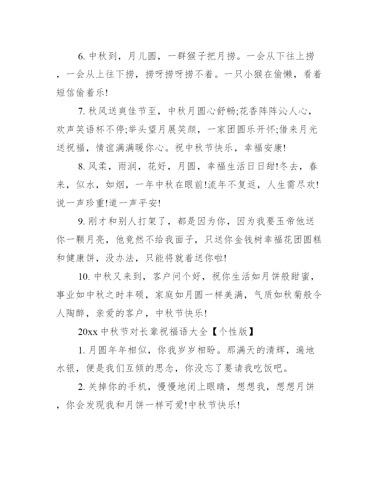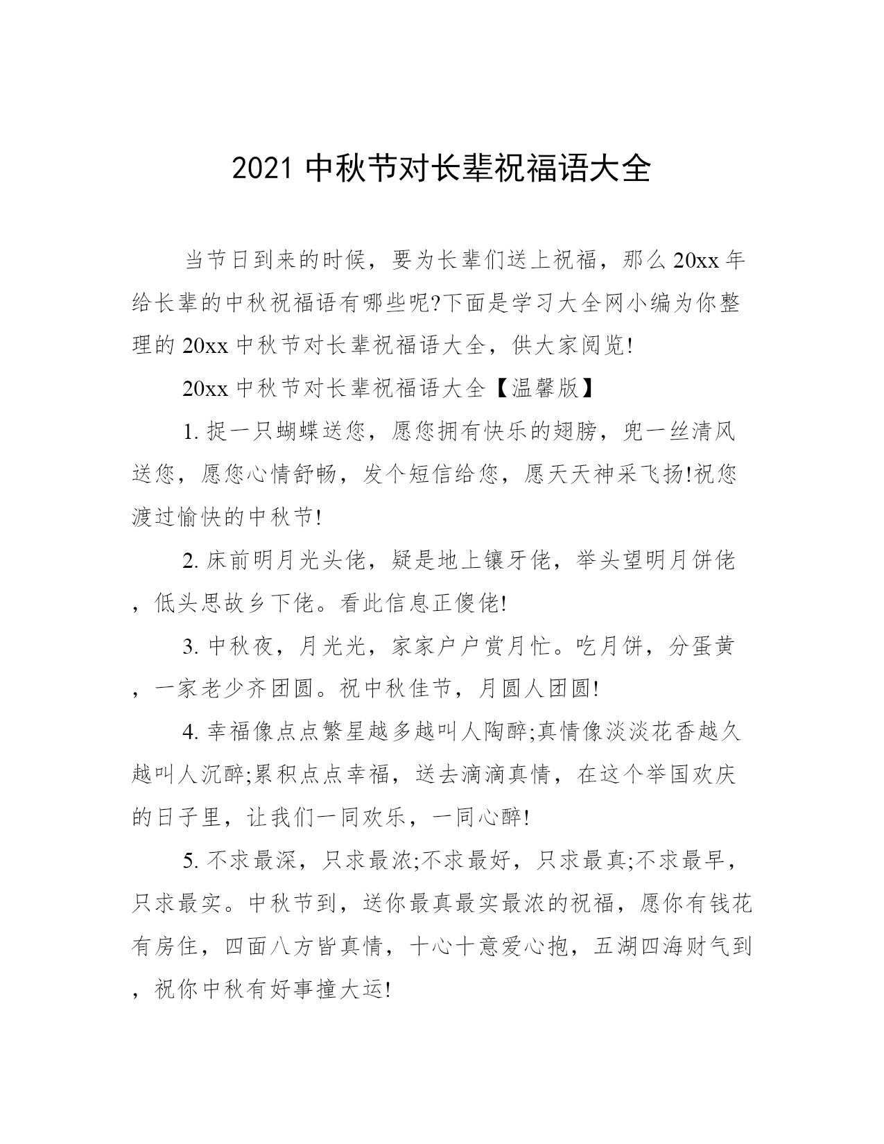 2021中秋节对长辈祝福语大全当节日到来的时候,要为长辈们送上祝福,那么20xx年给长辈的中秋祝福语有哪些呢?下面是学习大全网小编为你整理的20xx中秋节对长辈祝福语大全,供大家阅览!20xx中秋节对长辈祝福语大全【温馨版】1.捉一只蝴蝶送您,愿您拥有快乐的翅膀,兜一丝清风送您,愿您心情舒畅,发个短信给您,愿天天神采飞扬!祝您渡过愉快的中秋节!2.床前明月光头佬,疑是地上镶牙佬,举头望明月饼佬,低头思故乡下佬。看此信息正傻佬!3.中秋夜,月光光,家家户户赏月忙。吃月饼,分蛋黄,一家老少齐团圆。祝中秋佳节,月圆人团圆!4.幸福像点点繁星越多越叫人陶醉;真情像淡淡花香越久越叫人沉醉;累积点点幸福,送去滴滴真情,在这个举国欢庆的日子里,让我们一同欢乐,一同心醉!5.不求最深,只求最浓;不求最好,只求最真;不求最早,只求最实。中秋节到,送你最真最实最浓的祝福,愿你有钱花有房住,四面八方皆真情,十心十意爱心抱,五湖四海财气到,祝你中秋有好事撞大运!6.中秋到,月儿圆,一群猴子把月捞。一会从下往上捞,一会从上往下捞,捞呀捞呀捞不着。一只小猴在偷懒,看着短信偷着乐!7.秋风送爽佳节至,中秋月圆心舒畅;花香阵阵沁人心,欢声笑语杯不停;举头望月展笑颜,一家团圆乐开怀;借来月光送祝福,情谊满满暖你心。祝中秋节快乐,幸福安康!8.风柔,雨润,花好,月圆,幸福生活日日甜!冬去,春来,似水,如烟,一年中秋在眼前!流年不复返,人生需尽欢!说一声珍重!道一声平安!9.刚才和别人打架了,都是因为你,因为我要玉帝他送你一颗月亮,他竟然不给我面子,只送你金钱树幸福花团圆糕和健康饼,没办法,只能将就着送你啦!10.中秋又来到,客户问个好,祝你生活如月饼般甜蜜,事业如中秋之时丰硕,家庭如月圆一样美满,气质如秋菊般令人陶醉,亲爱的客户,中秋节快乐!20xx中秋节对长辈祝福语大全【个性版】1.月圆年年相似,你我岁岁相盼。那满天的清辉,遍地水银,便是我们互倾的思念,你没忘了要请我吃饭吧。2.关掉你的手机,慢慢地闭上眼睛,想想我,想想月饼,你会发现我和月饼一样可爱!中秋节快乐!3.过几天就是中秋了,不知道现在发祝福短信给你是否有点早,不过我想通了,提前的祝福和迟到的祝福都没有关系,因为我对你祝福的心是永远都不会改变的。中秋快乐!4.今天是中秋了,我给你定了些月饼,你可凭此短信到附近超市免费领取,领取方式:觉得好就拿,拿起来就跑,如被逮到就喊“嘛钱不钱的啊,乐呵乐呵得了”中秋节快乐!5.云淡风轻,随意放飞美丽心情!诗情画意,爱心在阳光下沐浴!盈盈笑语,管它哪堪泪水委屈!祝福为你,生活洋溢甜蜜温馨!中秋节愉快!6.中天皓月明世界,遍地笙歌乐团圆。祝您的事业更加成功,从本次月圆时开始,好事不断。7.月是中秋分外明,我把问候遥相寄;皓月当空洒清辉,中秋良宵念挚心;祝愿佳节多好运,月圆人圆事事圆!8.玉宇无尘,银河泻影,月色横空,花荫满径,中秋的夜晚格外温馨,空气弥漫着甜蜜,光华浸透着祝福,中秋佳节,真诚祝愿您合家团圆,前途顺利!9.中秋节,月儿圆,许个心愿圆又圆:日圆,月圆,团团圆圆;官源,财源,左右逢源;人缘,福源,源源不断;情愿,心愿,愿愿随心愿;真诚地祝愿你,圆愿遂愿,中秋快乐!10.暮云渐净圆月升,风颠云覆天地清;遥望故居千里远,情思梦绕一念显;可怜十五中秋夜,娥弈思恋痛千年;浪子无奈游离外,万水千山意传情;暗喜偶得三日闲,围坐月下话团圆;又是一年中秋节,愿你合家团圆齐欢腾,共度中秋明月夜!11.中秋节快到了,请你出国旅游—浪费,约你海吃一顿—伤胃,送你一枝玫瑰—误会,只好短信祝你快乐—实惠!12.接受阳光,你将得到温暖;接受花朵,你将得到爱情;接受问候,你将得到友情;接受短信,你将得到祝福!中秋快乐!13.仅仅与你三天不见,可知我把你多么想念,没有你在身边,我对生活开始讨厌。我再坚持四天,就可把你看见,好了,快来我身边!中秋快乐,爱你无限!14.星星的寂寞月知道,晚霞的羞涩云知道,花儿的芬芳蝶知道,青草的温柔风知道,梦里的缠绵心知道,心里的酸楚泪知道,我的思念您知道!我的祝福请记牢:祝中秋节快乐!15.又到中秋佳节,轻轻送上我的祝福,道一声我心中的感谢,感谢你曾经付出的辛酸苦累,合作的路上我们好好总结,共同迎接我们的美好明天,祝你中秋快乐。16.中秋休息慰劳嘴,猪牛羊等四条腿,多吃会让人后悔;鸡鸭鹅等两条腿,少吃慢品有滋味;香菇只有一条腿,秋日多吃最是美。17.月儿渐圆,情儿渐浓,心儿渐切,我代表全国人民提前祝你中秋快乐!以后收到的祝福都是我安排的,为人要低调,千万莫声张。18.中秋月亮分外明,节日喜气伴你行。人逢喜事精神爽,人团家圆事业成。节日愉快身体硬,心想事成您准赢。19.又是一年圆月夜,秋风习习庆佳节,中秋十五悬灯彩,家家户户乐陶陶,平安团圆中秋夜,美滋美味品月饼