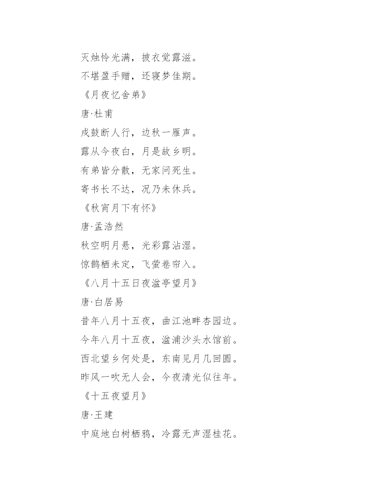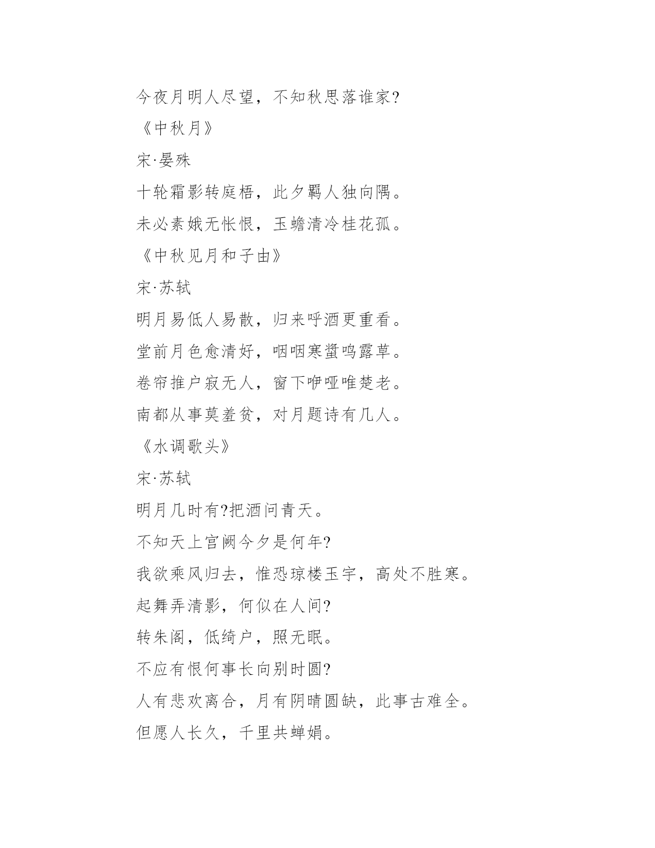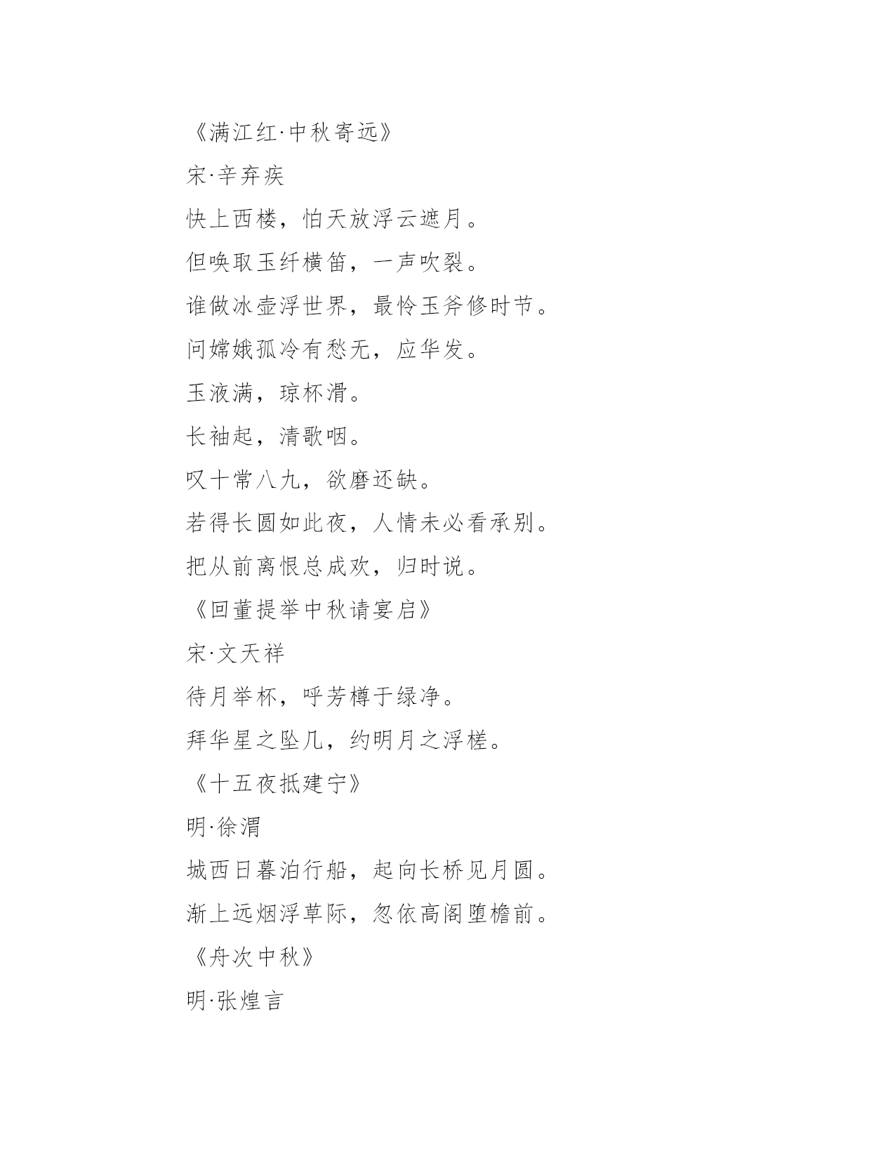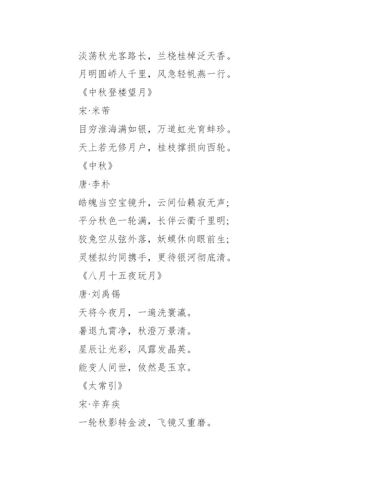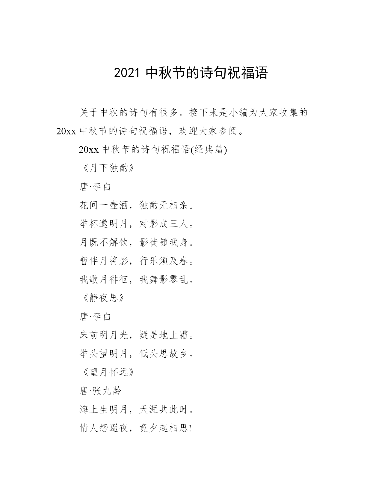 2021中秋节的诗句祝福语关于中秋的诗句有很多。接下来是小编为大家收集的20xx中秋节的诗句祝福语,欢迎大家参阅。20xx中秋节的诗句祝福语(经典篇)《月下独酌》唐·李白花间一壶酒,独酌无相亲。举杯邀明月,对影成三人。月既不解饮,影徒随我身。暂伴月将影,行乐须及春。我歌月徘徊,我舞影零乱。《静夜思》唐·李白床前明月光,疑是地上霜。举头望明月,低头思故乡。《望月怀远》唐·张九龄海上生明月,天涯共此时。情人怨遥夜,竟夕起相思!灭烛怜光满,披衣觉露滋。不堪盈手赠,还寝梦佳期。《月夜忆舍弟》唐·杜甫戍鼓断人行,边秋一雁声。露从今夜白,月是故乡明。有弟皆分散,无家问死生。寄书长不达,况乃未休兵。《秋宵月下有怀》唐·孟浩然秋空明月悬,光彩露沾湿。惊鹊栖未定,飞萤卷帘入。《八月十五日夜湓亭望月》唐·白居易昔年八月十五夜,曲江池畔杏园边。今年八月十五夜,湓浦沙头水馆前。西北望乡何处是,东南见月几回圆。昨风一吹无人会,今夜清光似往年。《十五夜望月》唐·王建中庭地白树栖鸦,冷露无声湿桂花。今夜月明人尽望,不知秋思落谁家?《中秋月》宋·晏殊十轮霜影转庭梧,此夕羁人独向隅。未必素娥无怅恨,玉蟾清冷桂花孤。《中秋见月和子由》宋·苏轼明月易低人易散,归来呼酒更重看。堂前月色愈清好,咽咽寒螀鸣露草。卷帘推户寂无人,窗下咿哑唯楚老。南都从事莫羞贫,对月题诗有几人。《水调歌头》宋·苏轼明月几时有?把酒问青天。不知天上宫阙今夕是何年?我欲乘风归去,惟恐琼楼玉宇,高处不胜寒。起舞弄清影,何似在人间?转朱阁,低绮户,照无眠。不应有恨何事长向别时圆?人有悲欢离合,月有阴晴圆缺,此事古难全。但愿人长久,千里共蝉娟。《满江红·中秋寄远》宋·辛弃疾快上西楼,怕天放浮云遮月。但唤取玉纤横笛,一声吹裂。谁做冰壶浮世界,最怜玉斧修时节。问嫦娥孤冷有愁无,应华发。玉液满,琼杯滑。长袖起,清歌咽。叹十常八九,欲磨还缺。若得长圆如此夜,人情未必看承别。把从前离恨总成欢,归时说。《回董提举中秋请宴启》宋·文天祥待月举杯,呼芳樽于绿净。拜华星之坠几,约明月之浮槎。《十五夜抵建宁》明·徐渭城西日暮泊行船,起向长桥见月圆。渐上远烟浮草际,忽依高阁堕檐前。《舟次中秋》明·张煌言淡荡秋光客路长,兰桡桂棹泛天香。月明圆峤人千里,风急轻帆燕一行。《中秋登楼望月》宋·米芾目穷淮海满如银,万道虹光育蚌珍。天上若无修月户,桂枝撑损向西轮。《中秋》唐·李朴皓魄当空宝镜升,云间仙籁寂无声;平分秋色一轮满,长伴云衢千里明;狡兔空从弦外落,妖蟆休向眼前生;灵槎拟约同携手,更待银河彻底清。《八月十五夜玩月》唐·刘禹锡天将今夜月,一遍洗寰瀛。暑退九霄净,秋澄万景清。星辰让光彩,风露发晶英。能变人间世,攸然是玉京。《太常引》宋·辛弃疾一轮秋影转金波,飞镜又重磨。把酒问姮娥:被白发欺人奈何!乘风好去,长空万里,直下看山河。斫去桂婆娑。人道是清光更多。20xx中秋节的诗句祝福语好句1.中秋夜,望皓月当空,却倍感失落和怅惘,心就像只无处靠岸的小舟,在无助中漂泊。2.我眼中的中秋节就像是一张请柬,每年的八月十五都邀请你去参加亲人朋友的聚餐。请柬的有效期是一辈子,永远不会作废。中秋节是一朵用亲情友谊灌溉的常开不败的花朵。它将花的清香撒到大江南北,举国上下。中秋节又像是一江的春水,流过每个人的心田,滋润每个人的心灵。3.中秋之夜,常常离开玩伴独自坐于月光之下,望着一轮晶莹剔透的满月,驰骋于自己构筑的梦幻世界里。4.侧头仰望圆圆的月亮,高高悬挂于深邃的苍穹。有凝重的云块,漂浮在周围,犹如远方在游子,写满相思的泪滴。那泯灭不了思念的素光,何以寄托心中那沾湿的云彩。5.中国人历来把家人团圆,亲友团聚,共享天伦之乐看得极其珍贵。都说每逢佳节倍思亲,何况是这象征团圆美满的中秋佳节呢。6.翻阅着消瘦的日历,如翻过那满是泪痕的记忆,月圆的中秋,挂着晶莹的银露,在日子的扉页上,滑进眼眸,溅起点点苍白的酸楚,又一个中秋,又一个不得不在月浪的沙滩上,伫望嫦娥守侯的美丽。7.适逢中秋之夜,我仰望天空,望见一轮圆月,天空中有层层清云,如烟似雾,弥蒙在月光下。月晕恰恰是这圆月与清云的红娘,牵于二者之间,淡淡的点上一圈,既不喧宾夺主,又有万般娇态。8.在这金秋送爽丹桂飘香,喜获丰收的季节,当人们还沉浸在举国欢腾的“国庆”氛围之时,又迎来了一年一度的中秋佳节,两节同辉,九州共庆!9.中秋节既是甜蜜蜜的,又是酸滋滋的。说甜蜜蜜是因为,可以享受可口的月饼;说是酸滋滋的是因为毕竟没有亲人在身边的日子是很孤单的。嘴里甜得很可心却有思乡的情绪在涌动。她让我更懂得亲情的珍贵,让我尝到了故乡的甜美及温暖。深刻地了解明明知道在身边却不懂得珍惜,失去了才发现它的重要。在萧瑟冷清的中秋节点燃了一把温暖的火,去了秋的凉意。10.八月桂花香啊!我放轻脚步落满梧桐。中秋的月饼圆了我尚待成