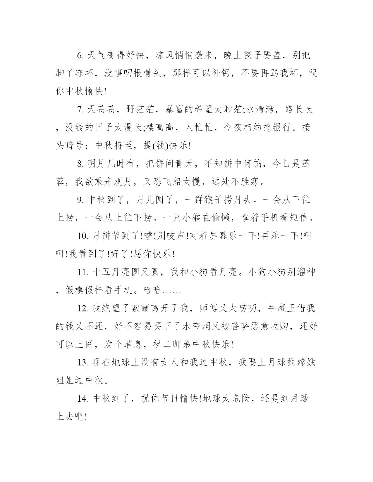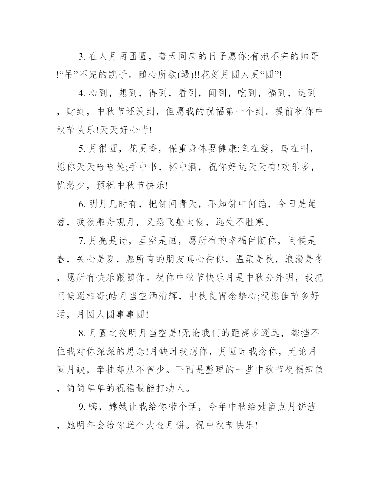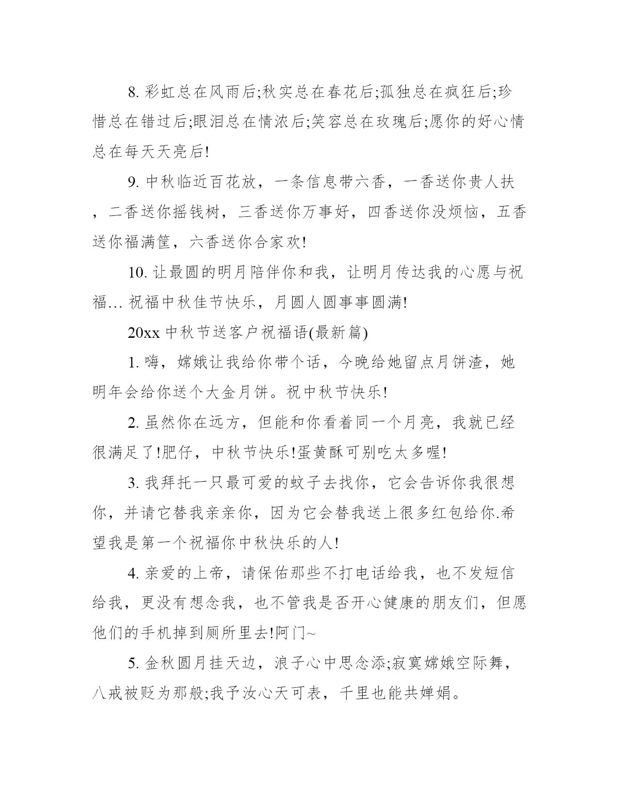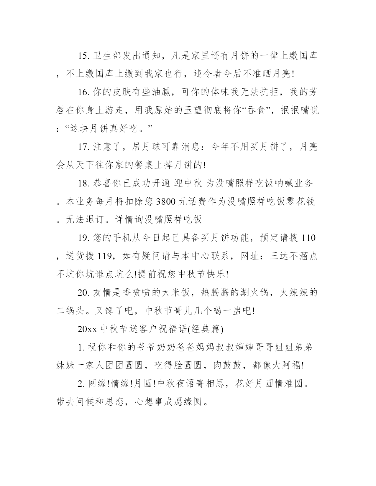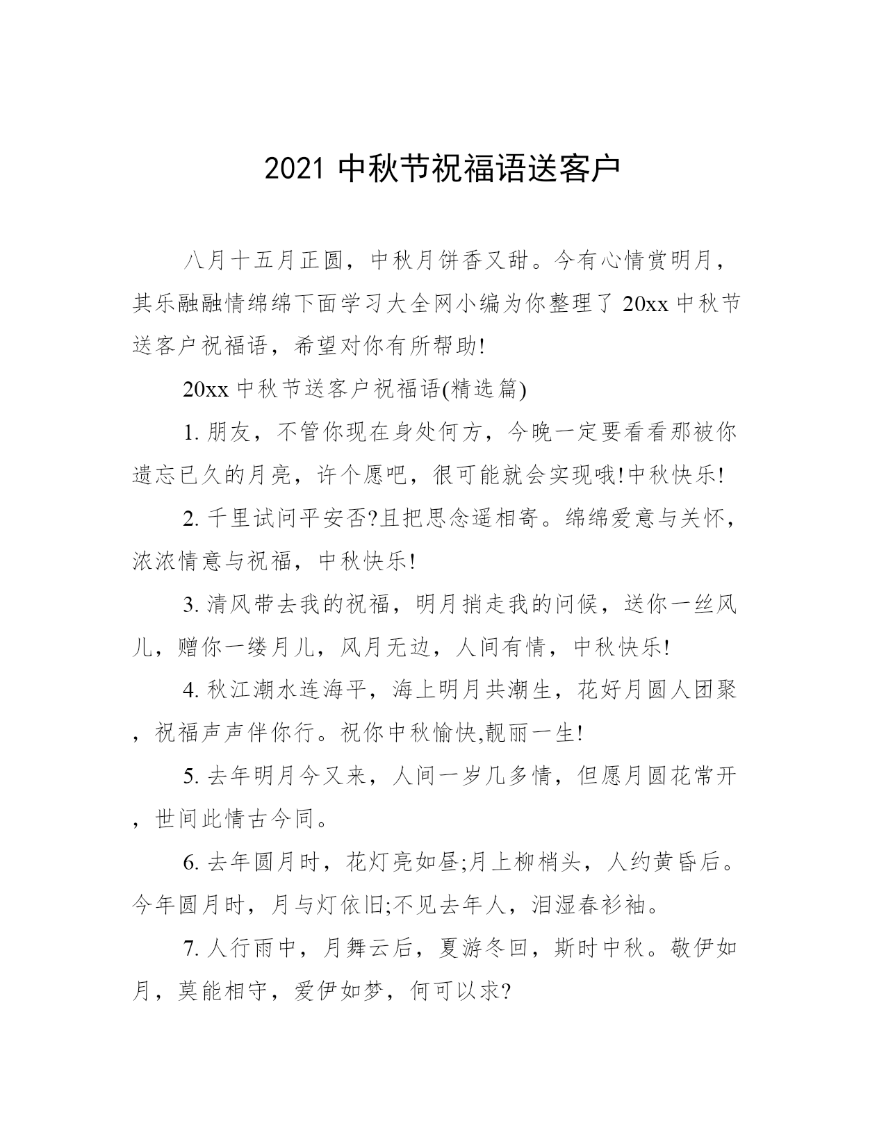 2021中秋节祝福语送客户八月十五月正圆,中秋月饼香又甜。今有心情赏明月,其乐融融情绵绵下面学习大全网小编为你整理了20xx中秋节送客户祝福语,希望对你有所帮助!20xx中秋节送客户祝福语(精选篇)1.朋友,不管你现在身处何方,今晚一定要看看那被你遗忘已久的月亮,许个愿吧,很可能就会实现哦!中秋快乐!2.千里试问平安否?且把思念遥相寄。绵绵爱意与关怀,浓浓情意与祝福,中秋快乐!3.清风带去我的祝福,明月捎走我的问候,送你一丝风儿,赠你一缕月儿,风月无边,人间有情,中秋快乐!4.秋江潮水连海平,海上明月共潮生,花好月圆人团聚,祝福声声伴你行。祝你中秋愉快,靓丽一生!5.去年明月今又来,人间一岁几多情,但愿月圆花常开,世间此情古今同。6.去年圆月时,花灯亮如昼;月上柳梢头,人约黄昏后。今年圆月时,月与灯依旧;不见去年人,泪湿春衫袖。7.人行雨中,月舞云后,夏游冬回,斯时中秋。敬伊如月,莫能相守,爱伊如梦,何可以求?8.彩虹总在风雨后;秋实总在春花后;孤独总在疯狂后;珍惜总在错过后;眼泪总在情浓后;笑容总在玫瑰后;愿你的好心情总在每天天亮后!9.中秋临近百花放,一条信息带六香,一香送你贵人扶,二香送你摇钱树,三香送你万事好,四香送你没烦恼,五香送你福满筐,六香送你合家欢!10.让最圆的明月陪伴你和我,让明月传达我的心愿与祝福…祝福中秋佳节快乐,月圆人圆事事圆满!20xx中秋节送客户祝福语(最新篇)1.嗨,嫦娥让我给你带个话,今晚给她留点月饼渣,她明年会给你送个大金月饼。祝中秋节快乐!2.虽然你在远方,但能和你看着同一个月亮,我就已经很满足了!肥仔,中秋节快乐!蛋黄酥可别吃太多喔!3.我拜托一只最可爱的蚊子去找你,它会告诉你我很想你,并请它替我亲亲你,因为它会替我送上很多红包给你.希望我是第一个祝福你中秋快乐的人!4.亲爱的上帝,请保佑那些不打电话给我,也不发短信给我,更没有想念我,也不管我是否开心健康的朋友们,但愿他们的手机掉到厕所里去!阿门~5.金秋圆月挂天边,浪子心中思念添;寂寞嫦娥空际舞,八戒被贬为那般;我予汝心天可表,千里也能共婵娟。6.天气变得好快,凉风悄悄袭来,晚上毯子要盖,别把脚丫冻坏,没事叨根骨头,那样可以补钙,不要再骂我坏,祝你中秋愉快!7.天苍苍,野茫茫,暴富的希望太渺茫;水湾湾,路长长,没钱的日子太漫长;楼高高,人忙忙,今夜相约抢银行。接头暗号:中秋将至,提(钱)快乐!8.明月几时有,把饼问青天,不知饼中何馅,今日是莲蓉,我欲乘舟观月,又恐飞船太慢,远处不胜寒。9.中秋到了,月儿圆了,一群猴子捞月去。一会从下往上捞,一会从上往下捞。一只小猴在偷懒,拿着手机看短信。10.月饼节到了!嘘!别吱声!对着屏幕乐一下!再乐一下!呵呵!我看到了!好了!愿你快乐!11.十五月亮圆又圆,我和小狗看月亮。小狗小狗别溜神,假模假样看手机。哈哈……12.我绝望了紫霞离开了我,师傅又太唠叨,牛魔王借我的钱又不还,好不容易买下了水帘洞又被菩萨恶意收购,还好可以上网,发个消息,祝二师弟中秋快乐!13.现在地球上没有女人和我过中秋,我要上月球找嫦娥姐姐过中秋。14.中秋到了,祝你节日愉快!地球太危险,还是到月球上去吧!15.卫生部发出通知,凡是家里还有月饼的一律上缴国库,不上缴国库上缴到我家也行,违令者今后不准晒月亮!16.你的皮肤有些油腻,可你的体味我无法抗拒,我的芳唇在你身上游走,用我原始的玉望彻底将你“吞食”,抿抿嘴说:“这块月饼真好吃。”17.注意了,居月球可靠消息:今年不用买月饼了,月亮会从天下往你家的餐桌上掉月饼的!18.恭喜你已成功开通迎中秋为没嘴照样吃饭呐喊业务。本业务每月将扣除您3800元话费作为没嘴照样吃饭零花钱。无法退订。详情询没嘴照样吃饭19.您的手机从今日起已具备买月饼功能,预定请拨110,送货拨119,如有疑问请与本中心联系,网址:三达不溜点不坑你坑谁点坑么!提前祝您中秋节快乐!20.友情是香喷喷的大米饭,热腾腾的涮火锅,火辣辣的二锅头。又馋了吧,中秋节哥儿几个喝一盅吧!20xx中秋节送客户祝福语(经典篇)1.祝你和你的爷爷奶奶爸爸妈妈叔叔婶婶哥哥姐姐弟弟妹妹一家人团团圆圆,吃得脸圆圆,肉鼓鼓,都像大阿福!2.网缘!情缘!月圆!中秋夜语寄相思,花好月圆情难圆。带去问候和思恋,心想事成愿缘圆。3.在人月两团圆,普天同庆的日子愿你:有泡不完的帅哥!“吊”不完的凯子。随心所欲(遇)!!花好月圆人更“圆”!4.心到,想到,得到,看到,闻到,吃到,福到,运到,财到,中秋节还没到,但愿我的祝福第一个到。提前祝你中秋节快乐!天天好心情!5.月很圆,花更香,保重身体要健康;鱼在游,鸟在叫,愿你天天哈哈笑;手中书,杯中酒,祝你好运天天有!欢乐多,忧愁少,预祝中秋节快乐!6.明月几时有,把饼问青天,不知饼中何馅,今日是莲蓉,我欲乘舟