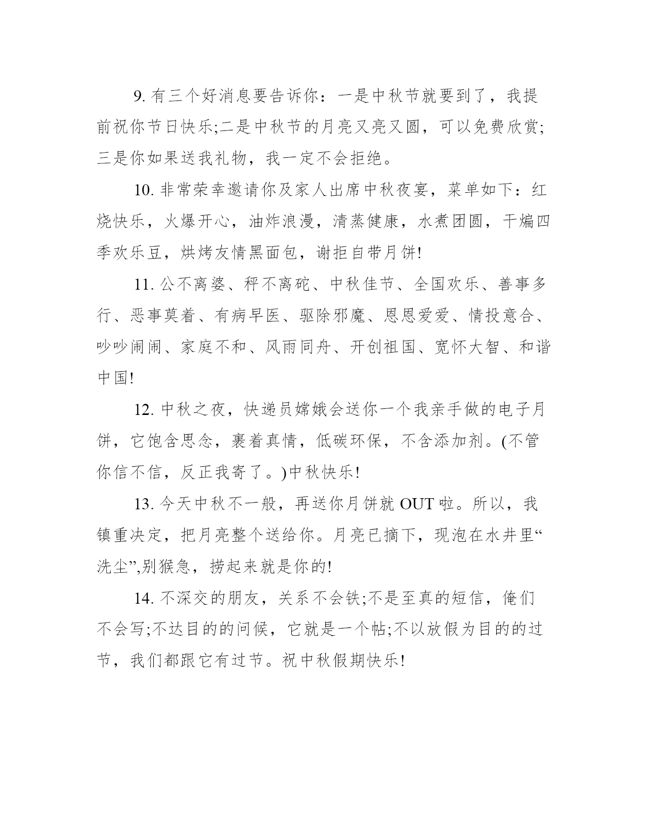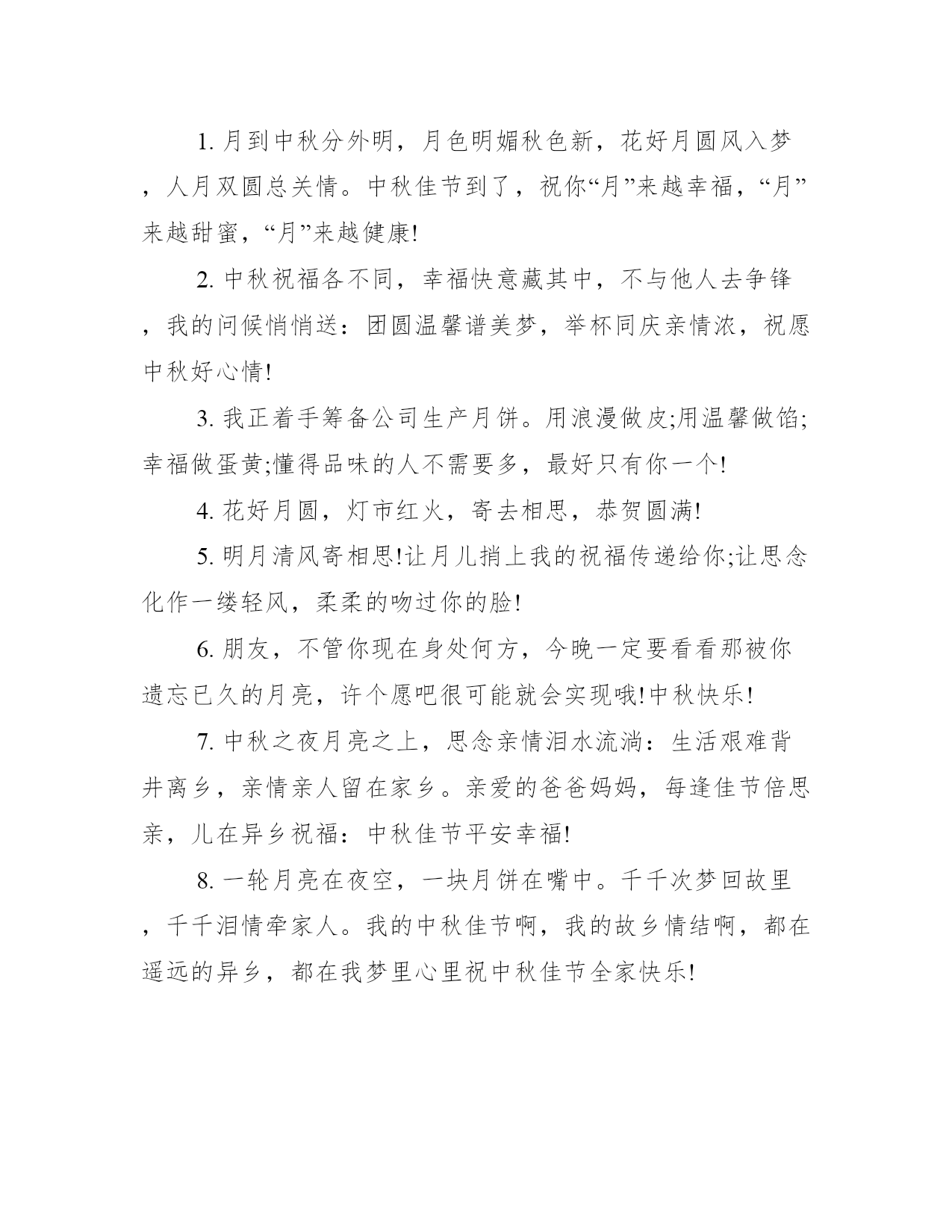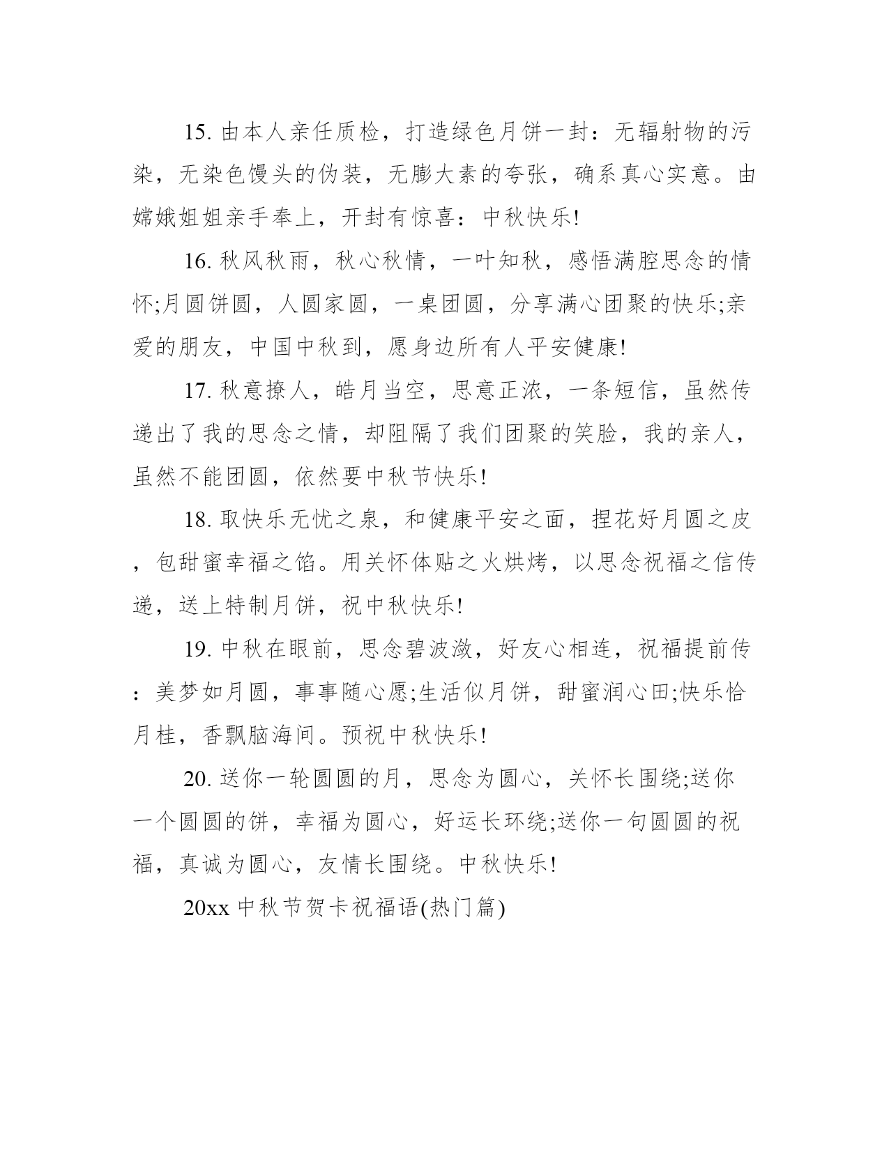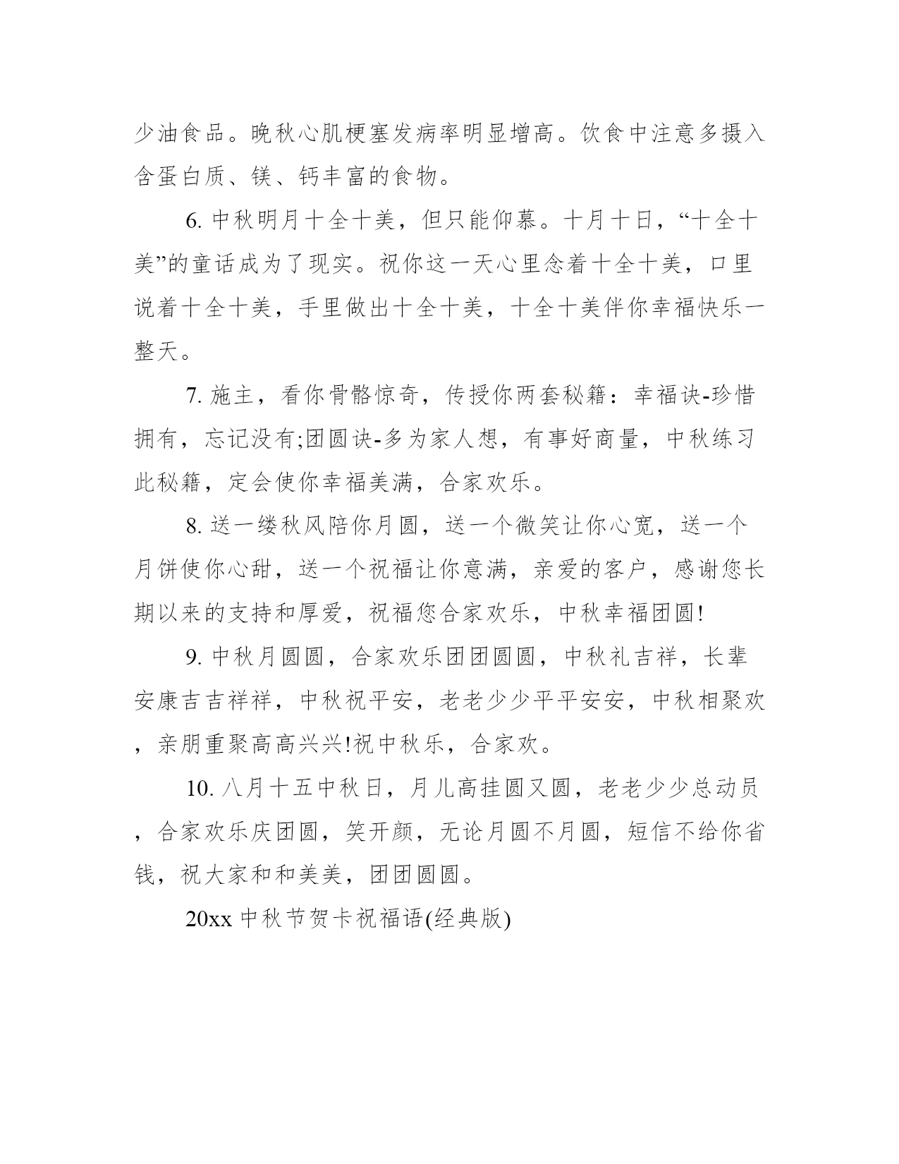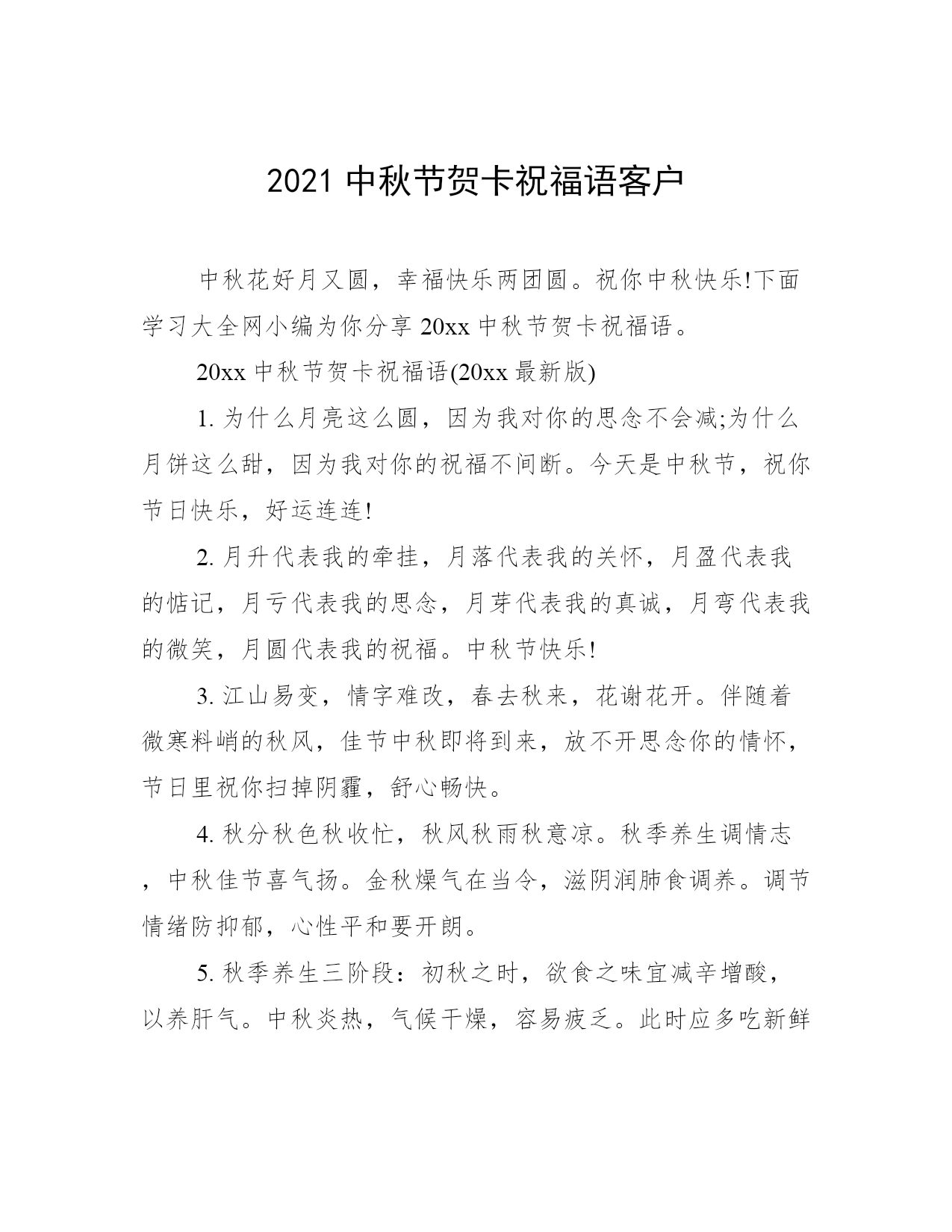 2021中秋节贺卡祝福语客户中秋花好月又圆,幸福快乐两团圆。祝你中秋快乐!下面学习大全网小编为你分享20xx中秋节贺卡祝福语。20xx中秋节贺卡祝福语(20xx最新版)1.为什么月亮这么圆,因为我对你的思念不会减;为什么月饼这么甜,因为我对你的祝福不间断。今天是中秋节,祝你节日快乐,好运连连!2.月升代表我的牵挂,月落代表我的关怀,月盈代表我的惦记,月亏代表我的思念,月芽代表我的真诚,月弯代表我的微笑,月圆代表我的祝福。中秋节快乐!3.江山易变,情字难改,春去秋来,花谢花开。伴随着微寒料峭的秋风,佳节中秋即将到来,放不开思念你的情怀,节日里祝你扫掉阴霾,舒心畅快。4.秋分秋色秋收忙,秋风秋雨秋意凉。秋季养生调情志,中秋佳节喜气扬。金秋燥气在当令,滋阴润肺食调养。调节情绪防抑郁,心性平和要开朗。5.秋季养生三阶段:初秋之时,欲食之味宜减辛增酸,以养肝气。中秋炎热,气候干燥,容易疲乏。此时应多吃新鲜少油食品。晚秋心肌梗塞发病率明显增高。饮食中注意多摄入含蛋白质、镁、钙丰富的食物。6.中秋明月十全十美,但只能仰慕。十月十日,“十全十美”的童话成为了现实。祝你这一天心里念着十全十美,口里说着十全十美,手里做出十全十美,十全十美伴你幸福快乐一整天。7.施主,看你骨骼惊奇,传授你两套秘籍:幸福诀-珍惜拥有,忘记没有;团圆诀-多为家人想,有事好商量,中秋练习此秘籍,定会使你幸福美满,合家欢乐。8.送一缕秋风陪你月圆,送一个微笑让你心宽,送一个月饼使你心甜,送一个祝福让你意满,亲爱的客户,感谢您长期以来的支持和厚爱,祝福您合家欢乐,中秋幸福团圆!9.中秋月圆圆,合家欢乐团团圆圆,中秋礼吉祥,长辈安康吉吉祥祥,中秋祝平安,老老少少平平安安,中秋相聚欢,亲朋重聚高高兴兴!祝中秋乐,合家欢。10.八月十五中秋日,月儿高挂圆又圆,老老少少总动员,合家欢乐庆团圆,笑开颜,无论月圆不月圆,短信不给你省钱,祝大家和和美美,团团圆圆。20xx中秋节贺卡祝福语(经典版)1.月到中秋分外明,月色明媚秋色新,花好月圆风入梦,人月双圆总关情。中秋佳节到了,祝你“月”来越幸福,“月”来越甜蜜,“月”来越健康!2.中秋祝福各不同,幸福快意藏其中,不与他人去争锋,我的问候悄悄送:团圆温馨谱美梦,举杯同庆亲情浓,祝愿中秋好心情!3.我正着手筹备公司生产月饼。用浪漫做皮;用温馨做馅;幸福做蛋黄;懂得品味的人不需要多,最好只有你一个!4.花好月圆,灯市红火,寄去相思,恭贺圆满!5.明月清风寄相思!让月儿捎上我的祝福传递给你;让思念化作一缕轻风,柔柔的吻过你的脸!6.朋友,不管你现在身处何方,今晚一定要看看那被你遗忘已久的月亮,许个愿吧很可能就会实现哦!中秋快乐!7.中秋之夜月亮之上,思念亲情泪水流淌:生活艰难背井离乡,亲情亲人留在家乡。亲爱的爸爸妈妈,每逢佳节倍思亲,儿在异乡祝福:中秋佳节平安幸福!8.一轮月亮在夜空,一块月饼在嘴中。千千次梦回故里,千千泪情牵家人。我的中秋佳节啊,我的故乡情结啊,都在遥远的异乡,都在我梦里心里祝中秋佳节全家快乐!9.有三个好消息要告诉你:一是中秋节就要到了,我提前祝你节日快乐;二是中秋节的月亮又亮又圆,可以免费欣赏;三是你如果送我礼物,我一定不会拒绝。10.非常荣幸邀请你及家人出席中秋夜宴,菜单如下:红烧快乐,火爆开心,油炸浪漫,清蒸健康,水煮团圆,干煸四季欢乐豆,烘烤友情黑面包,谢拒自带月饼!11.公不离婆、秤不离砣、中秋佳节、全国欢乐、善事多行、恶事莫着、有病早医、驱除邪魔、恩恩爱爱、情投意合、吵吵闹闹、家庭不和、风雨同舟、开创祖国、宽怀大智、和谐中国!12.中秋之夜,快递员嫦娥会送你一个我亲手做的电子月饼,它饱含思念,裹着真情,低碳环保,不含添加剂。(不管你信不信,反正我寄了。)中秋快乐!13.今天中秋不一般,再送你月饼就OUT啦。所以,我镇重决定,把月亮整个送给你。月亮已摘下,现泡在水井里“洗尘”,别猴急,捞起来就是你的!14.不深交的朋友,关系不会铁;不是至真的短信,俺们不会写;不达目的的问候,它就是一个帖;不以放假为目的的过节,我们都跟它有过节。祝中秋假期快乐!15.由本人亲任质检,打造绿色月饼一封:无辐射物的污染,无染色馒头的伪装,无膨大素的夸张,确系真心实意。由嫦娥姐姐亲手奉上,开封有惊喜:中秋快乐!16.秋风秋雨,秋心秋情,一叶知秋,感悟满腔思念的情怀;月圆饼圆,人圆家圆,一桌团圆,分享满心团聚的快乐;亲爱的朋友,中国中秋到,愿身边所有人平安健康!17.秋意撩人,皓月当空,思意正浓,一条短信,虽然传递出了我的思念之情,却阻隔了我们团聚的笑脸,我的亲人,虽然不能团圆,依然要中秋节快乐!18.取快乐无忧之泉,和健康平安之面,捏花好月圆之皮,包甜蜜幸福之馅。用关怀体贴之火烘烤,以思念祝福之信传递,送上特制月饼,祝中秋快乐!19.中秋