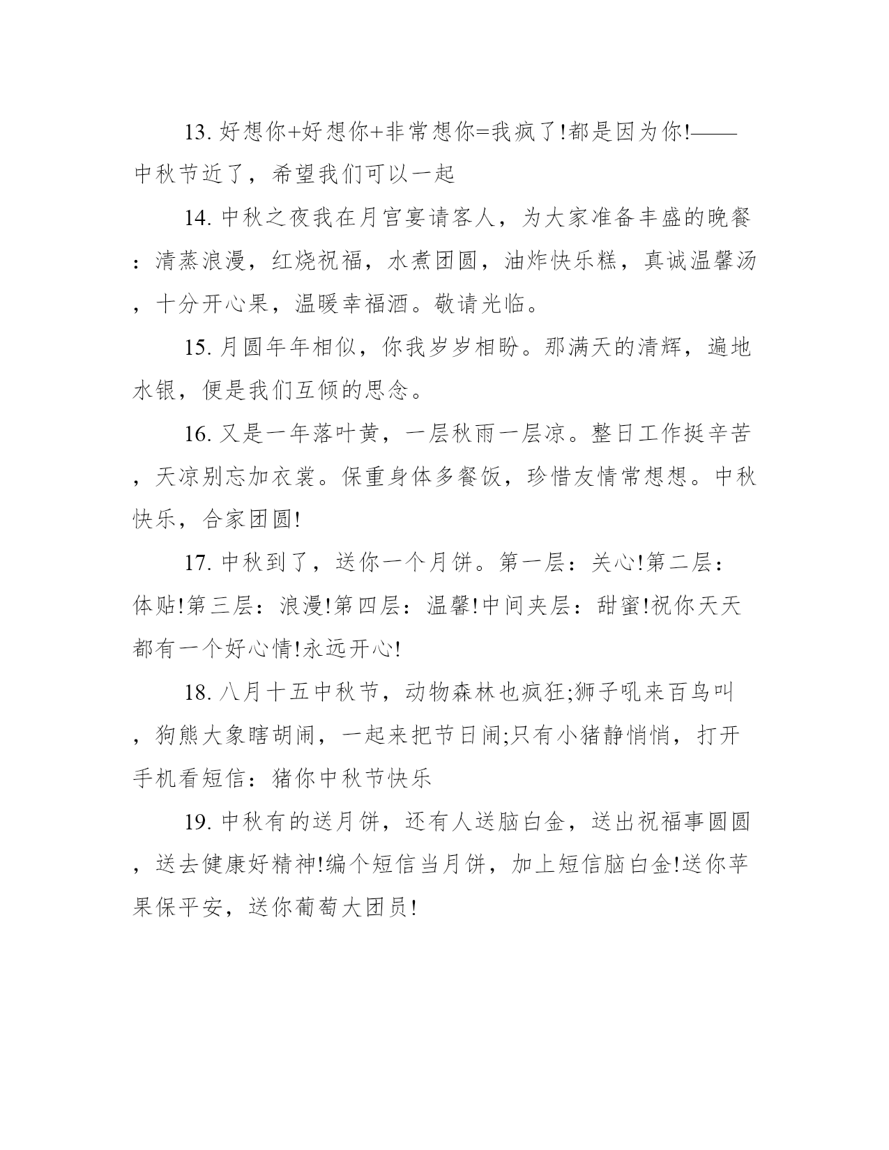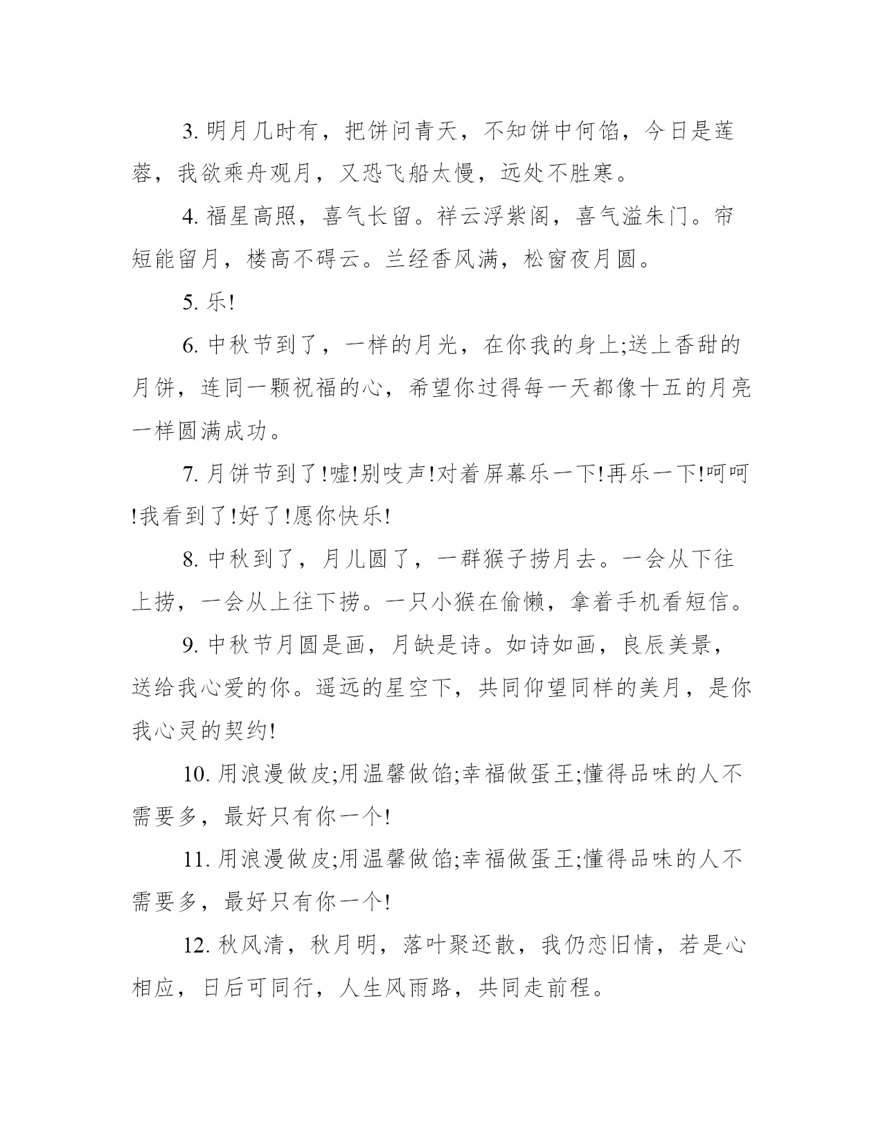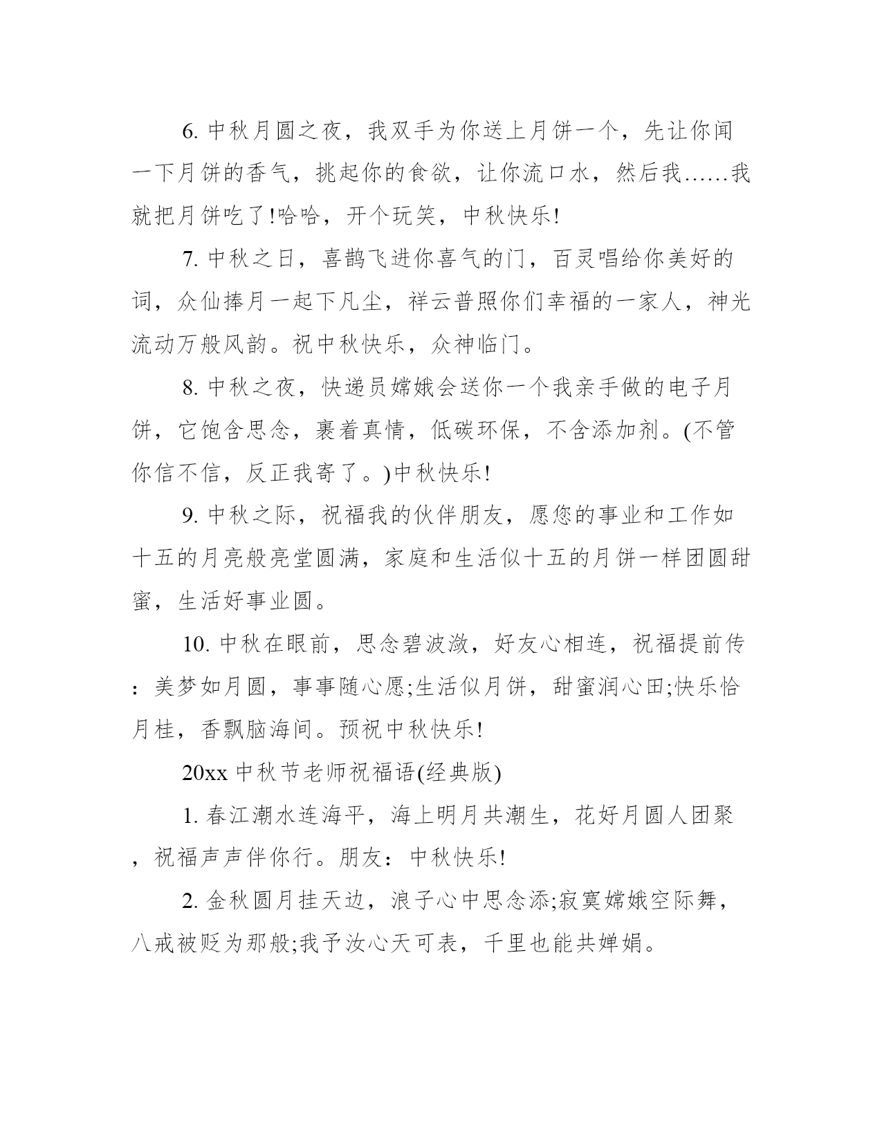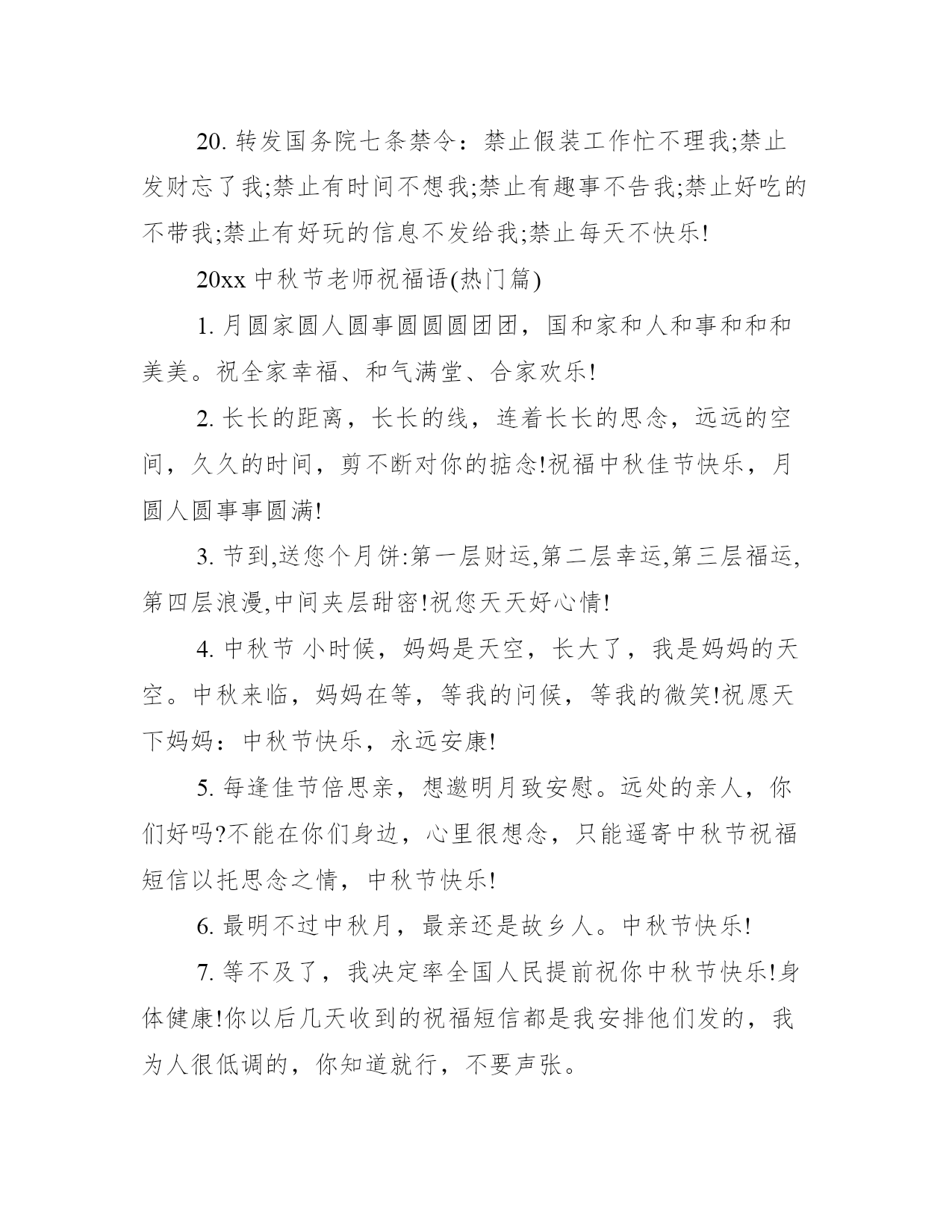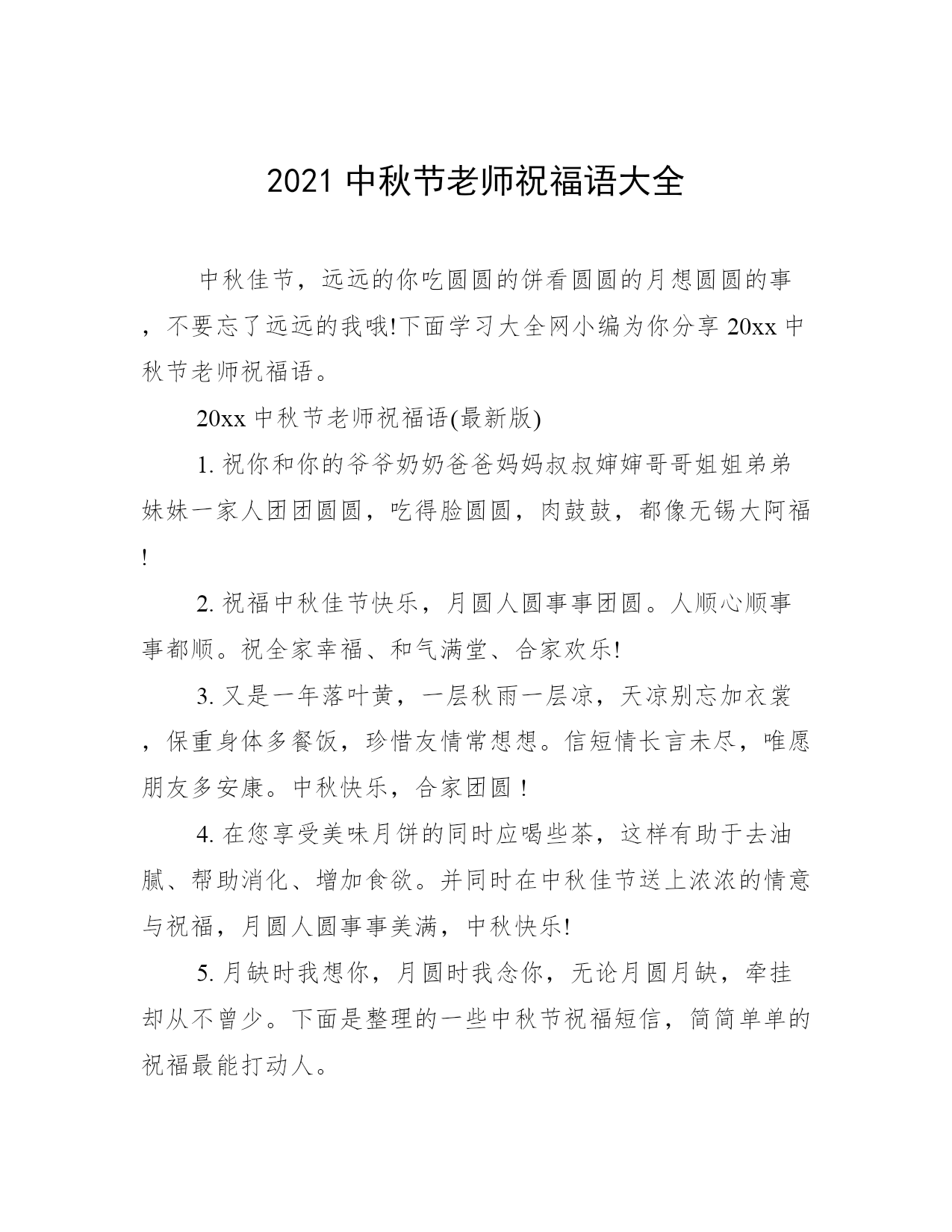 2021中秋节老师祝福语大全中秋佳节,远远的你吃圆圆的饼看圆圆的月想圆圆的事,不要忘了远远的我哦!下面学习大全网小编为你分享20xx中秋节老师祝福语。20xx中秋节老师祝福语(最新版)1.祝你和你的爷爷奶奶爸爸妈妈叔叔婶婶哥哥姐姐弟弟妹妹一家人团团圆圆,吃得脸圆圆,肉鼓鼓,都像无锡大阿福!2.祝福中秋佳节快乐,月圆人圆事事团圆。人顺心顺事事都顺。祝全家幸福、和气满堂、合家欢乐!3.又是一年落叶黄,一层秋雨一层凉,天凉别忘加衣裳,保重身体多餐饭,珍惜友情常想想。信短情长言未尽,唯愿朋友多安康。中秋快乐,合家团圆!4.在您享受美味月饼的同时应喝些茶,这样有助于去油腻、帮助消化、增加食欲。并同时在中秋佳节送上浓浓的情意与祝福,月圆人圆事事美满,中秋快乐!5.月缺时我想你,月圆时我念你,无论月圆月缺,牵挂却从不曾少。下面是整理的一些中秋节祝福短信,简简单单的祝福最能打动人。6.中秋月圆之夜,我双手为你送上月饼一个,先让你闻一下月饼的香气,挑起你的食欲,让你流口水,然后我……我就把月饼吃了!哈哈,开个玩笑,中秋快乐!7.中秋之日,喜鹊飞进你喜气的门,百灵唱给你美好的词,众仙捧月一起下凡尘,祥云普照你们幸福的一家人,神光流动万般风韵。祝中秋快乐,众神临门。8.中秋之夜,快递员嫦娥会送你一个我亲手做的电子月饼,它饱含思念,裹着真情,低碳环保,不含添加剂。(不管你信不信,反正我寄了。)中秋快乐!9.中秋之际,祝福我的伙伴朋友,愿您的事业和工作如十五的月亮般亮堂圆满,家庭和生活似十五的月饼一样团圆甜蜜,生活好事业圆。10.中秋在眼前,思念碧波潋,好友心相连,祝福提前传:美梦如月圆,事事随心愿;生活似月饼,甜蜜润心田;快乐恰月桂,香飘脑海间。预祝中秋快乐!20xx中秋节老师祝福语(经典版)1.春江潮水连海平,海上明月共潮生,花好月圆人团聚,祝福声声伴你行。朋友:中秋快乐!2.金秋圆月挂天边,浪子心中思念添;寂寞嫦娥空际舞,八戒被贬为那般;我予汝心天可表,千里也能共婵娟。3.明月几时有,把饼问青天,不知饼中何馅,今日是莲蓉,我欲乘舟观月,又恐飞船太慢,远处不胜寒。4.福星高照,喜气长留。祥云浮紫阁,喜气溢朱门。帘短能留月,楼高不碍云。兰经香风满,松窗夜月圆。5.乐!6.中秋节到了,一样的月光,在你我的身上;送上香甜的月饼,连同一颗祝福的心,希望你过得每一天都像十五的月亮一样圆满成功。7.月饼节到了!嘘!别吱声!对着屏幕乐一下!再乐一下!呵呵!我看到了!好了!愿你快乐!8.中秋到了,月儿圆了,一群猴子捞月去。一会从下往上捞,一会从上往下捞。一只小猴在偷懒,拿着手机看短信。9.中秋节月圆是画,月缺是诗。如诗如画,良辰美景,送给我心爱的你。遥远的星空下,共同仰望同样的美月,是你我心灵的契约!10.用浪漫做皮;用温馨做馅;幸福做蛋王;懂得品味的人不需要多,最好只有你一个!11.用浪漫做皮;用温馨做馅;幸福做蛋王;懂得品味的人不需要多,最好只有你一个!12.秋风清,秋月明,落叶聚还散,我仍恋旧情,若是心相应,日后可同行,人生风雨路,共同走前程。13.好想你+好想你+非常想你=我疯了!都是因为你!——中秋节近了,希望我们可以一起14.中秋之夜我在月宫宴请客人,为大家准备丰盛的晚餐:清蒸浪漫,红烧祝福,水煮团圆,油炸快乐糕,真诚温馨汤,十分开心果,温暖幸福酒。敬请光临。15.月圆年年相似,你我岁岁相盼。那满天的清辉,遍地水银,便是我们互倾的思念。16.又是一年落叶黄,一层秋雨一层凉。整日工作挺辛苦,天凉别忘加衣裳。保重身体多餐饭,珍惜友情常想想。中秋快乐,合家团圆!17.中秋到了,送你一个月饼。第一层:关心!第二层:体贴!第三层:浪漫!第四层:温馨!中间夹层:甜蜜!祝你天天都有一个好心情!永远开心!18.八月十五中秋节,动物森林也疯狂;狮子吼来百鸟叫,狗熊大象瞎胡闹,一起来把节日闹;只有小猪静悄悄,打开手机看短信:猪你中秋节快乐19.中秋有的送月饼,还有人送脑白金,送出祝福事圆圆,送去健康好精神!编个短信当月饼,加上短信脑白金!送你苹果保平安,送你葡萄大团员!20.转发国务院七条禁令:禁止假装工作忙不理我;禁止发财忘了我;禁止有时间不想我;禁止有趣事不告我;禁止好吃的不带我;禁止有好玩的信息不发给我;禁止每天不快乐!20xx中秋节老师祝福语(热门篇)1.月圆家圆人圆事圆圆圆团团,国和家和人和事和和和美美。祝全家幸福、和气满堂、合家欢乐!2.长长的距离,长长的线,连着长长的思念,远远的空间,久久的时间,剪不断对你的掂念!祝福中秋佳节快乐,月圆人圆事事圆满!3.节到,送您个月饼:第一层财运,第二层幸运,第三层福运,第四层浪漫,中间夹层甜密!祝您天天好心情!4.中秋节小时候,妈妈是天空,长大了,我是妈妈的天空。中秋来临,妈妈在等,等我的问候,等我的微笑!祝愿天下妈妈: