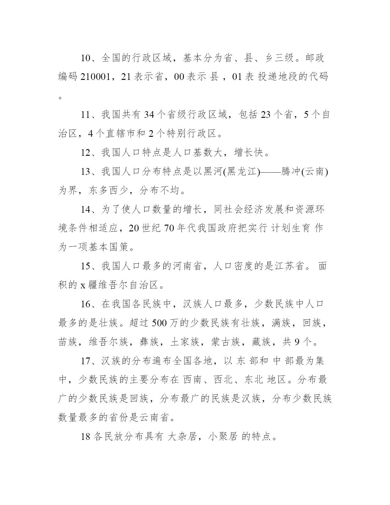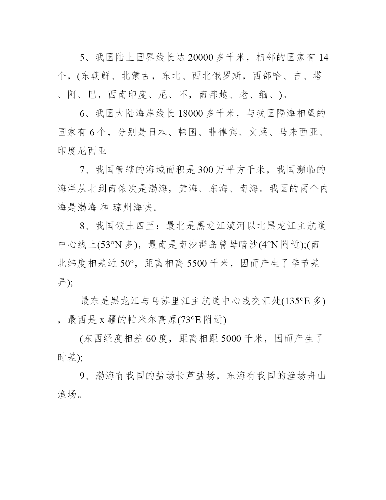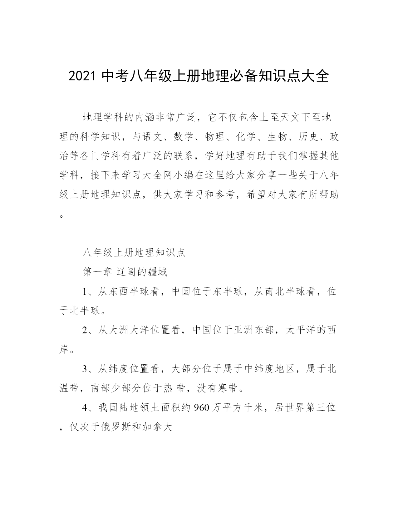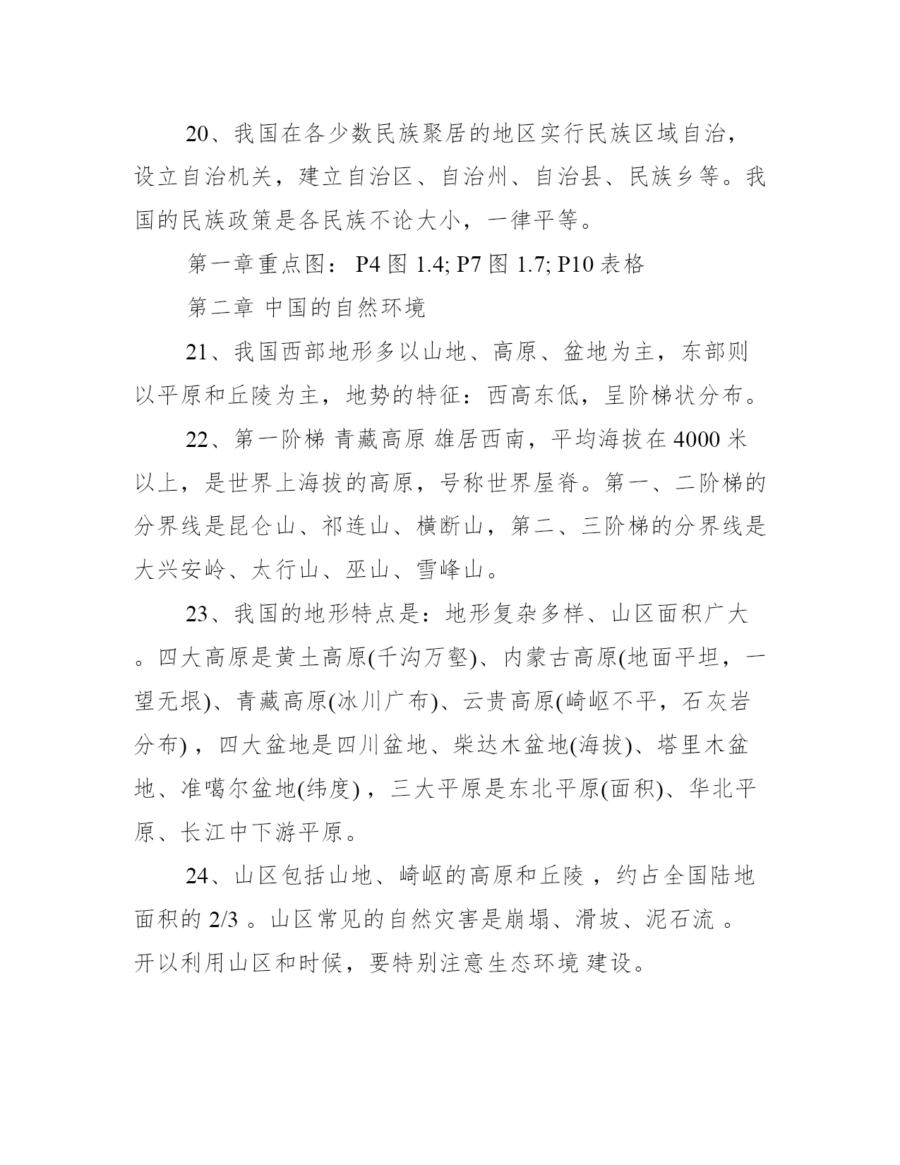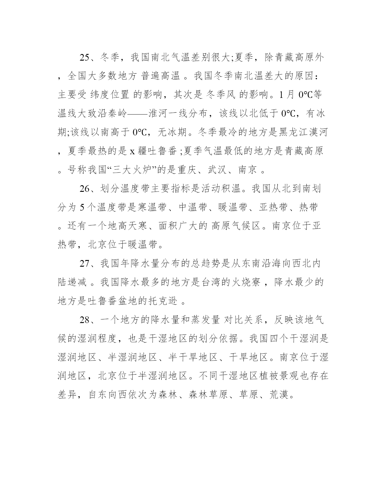 2021中考八年级上册地理必备知识点大全地理学科的内涵非常广泛,它不仅包含上至天文下至地理的科学知识,与语文、数学、物理、化学、生物、历史、政治等各门学科有着广泛的联系,学好地理有助于我们掌握其他学科,接下来学习大全网小编在这里给大家分享一些关于八年级上册地理知识点,供大家学习和参考,希望对大家有所帮助。八年级上册地理知识点第一章辽阔的疆域1、从东西半球看,中国位于东半球,从南北半球看,位于北半球。2、从大洲大洋位置看,中国位于亚洲东部,太平洋的西岸。3、从纬度位置看,大部分位于属于中纬度地区,属于北温带,南部少部分位于热带,没有寒带。4、我国陆地领土面积约960万平方千米,居世界第三位,仅次于俄罗斯和加拿大5、我国陆上国界线长达20000多千米,相邻的国家有14个,(东朝鲜、北蒙古,东北、西北俄罗斯,西部哈、吉、塔、阿、巴,西南印度、尼、不,南部越、老、缅、)。6、我国大陆海岸线长18000多千米,与我国隔海相望的国家有6个,分别是日本、韩国、菲律宾、文莱、马来西亚、印度尼西亚7、我国管辖的海域面积是300万平方千米,我国濒临的海洋从北到南依次是渤海,黄海、东海、南海。我国的两个内海是渤海和琼州海峡。8、我国领土四至:最北是黑龙江漠河以北黑龙江主航道中心线上(53°N多),最南是南沙群岛曾母暗沙(4°N附近);(南北纬度相差近50°,距离相离5500千米,因而产生了季节差异);最东是黑龙江与乌苏里江主航道中心线交汇处(135°E多),最西是x疆的帕米尔高原(73°E附近)(东西经度相差60度,距离相距5000千米,因而产生了时差);9、渤海有我国的盐场长芦盐场,东海有我国的渔场舟山渔场。10、全国的行政区域,基本分为省、县、乡三级。邮政编码210001,21表示省,00表示县,01表投递地段的代码。11、我国共有34个省级行政区域,包括23个省,5个自治区,4个直辖市和2个特别行政区。12、我国人口特点是人口基数大,增长快。13、我国人口分布特点是以黑河(黑龙江)——腾冲(云南)为界,东多西少,分布不均。14、为了使人口数量的增长,同社会经济发展和资源环境条件相适应,20世纪70年代我国政府把实行计划生育作为一项基本国策。15、我国人口最多的河南省,人口密度的是江苏省。面积的x疆维吾尔自治区。16、在我国各民族中,汉族人口最多,少数民族中人口最多的是壮族。超过500万的少数民族有壮族,满族,回族,苗族,维吾尔族,彝族,土家族,蒙古族,藏族,共9个。17、汉族的分布遍布全国各地,以东部和中部最为集中,少数民族的主要分布在西南、西北、东北地区。分布最广的少数民族是回族,分布最广的民族是汉族,分布少数民族数量最多的省份是云南省。18各民放分布具有大杂居,小聚居的特点。20、我国在各少数民族聚居的地区实行民族区域自治,设立自治机关,建立自治区、自治州、自治县、民族乡等。我国的民族政策是各民族不论大小,一律平等。第一章重点图:P4图1.4;P7图1.7;P10表格第二章中国的自然环境21、我国西部地形多以山地、高原、盆地为主,东部则以平原和丘陵为主,地势的特征:西高东低,呈阶梯状分布。22、第一阶梯青藏高原雄居西南,平均海拔在4000米以上,是世界上海拔的高原,号称世界屋脊。第一、二阶梯的分界线是昆仑山、祁连山、横断山,第二、三阶梯的分界线是大兴安岭、太行山、巫山、雪峰山。23、我国的地形特点是:地形复杂多样、山区面积广大。四大高原是黄土高原(千沟万壑)、内蒙古高原(地面平坦,一望无垠)、青藏高原(冰川广布)、云贵高原(崎岖不平,石灰岩分布),四大盆地是四川盆地、柴达木盆地(海拔)、塔里木盆地、准噶尔盆地(纬度),三大平原是东北平原(面积)、华北平原、长江中下游平原。24、山区包括山地、崎岖的高原和丘陵,约占全国陆地面积的2/3。山区常见的自然灾害是崩塌、滑坡、泥石流。开以利用山区和时候,要特别注意生态环境建设。25、冬季,我国南北气温差别很大;夏季,除青藏高原外,全国大多数地方普遍高温。我国冬季南北温差大的原因:主要受纬度位置的影响,其次是冬季风的影响。1月0℃等温线大致沿秦岭——淮河一线分布,该线以北低于0℃,有冰期;该线以南高于0℃,无冰期。冬季最冷的地方是黑龙江漠河,夏季最热的是x疆吐鲁番;夏季气温最低的地方是青藏高原。号称我国“三大火炉”的是重庆、武汉、南京。26、划分温度带主要指标是活动积温。我国从北到南划分为5个温度带是寒温带、中温带、暖温带、亚热带、热带。还有一个地高天寒、面积广大的高原气候区。南京位于亚热带,北京位于暖温带。27、我国年降水量分布的总趋势是从东南沿海向西北内陆递减。我国降水最多的地方是台湾的火烧寮,降水最少的地方是吐鲁番盆地的托克逊。28、一个地方的降水量和蒸发量对比关系,反映该地气候的湿润程度,也是