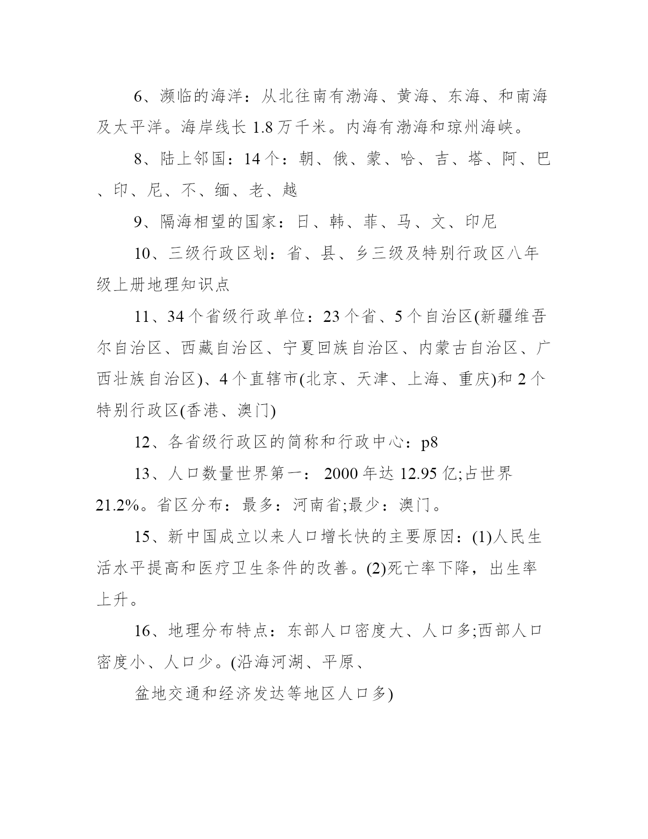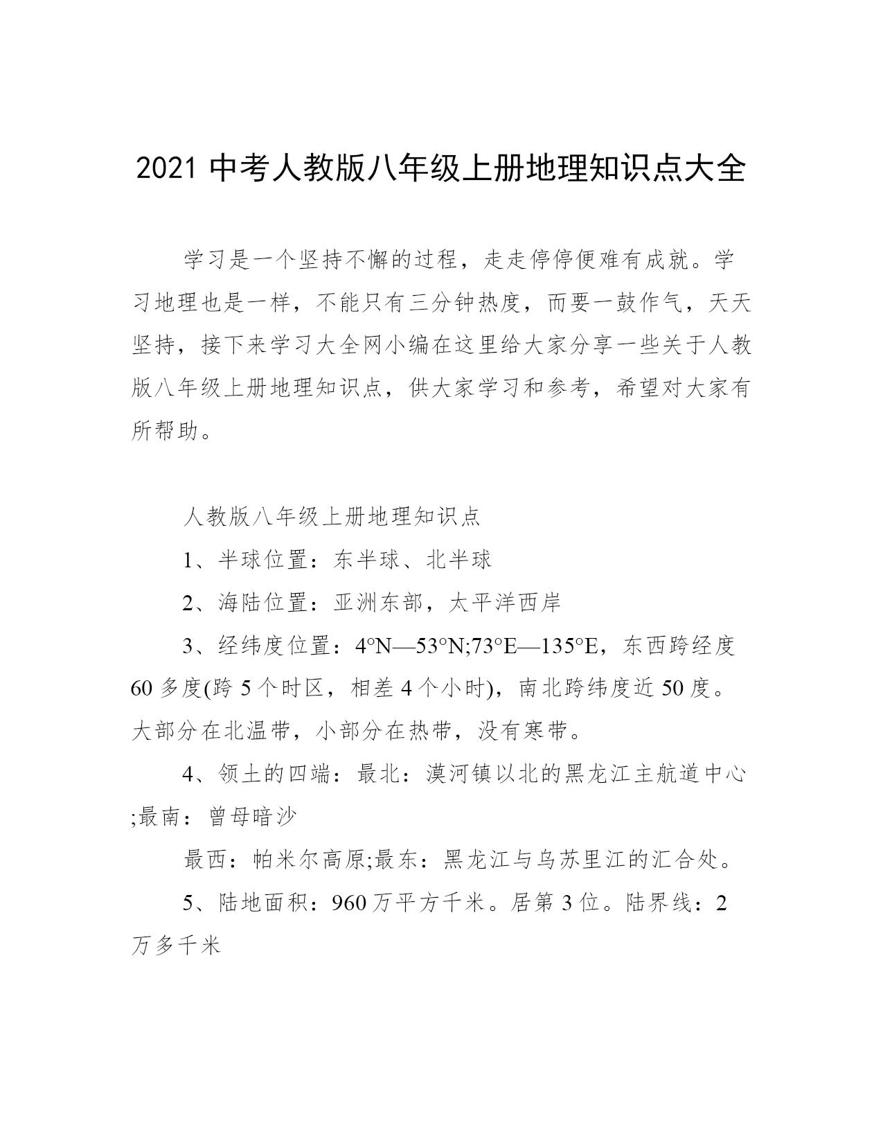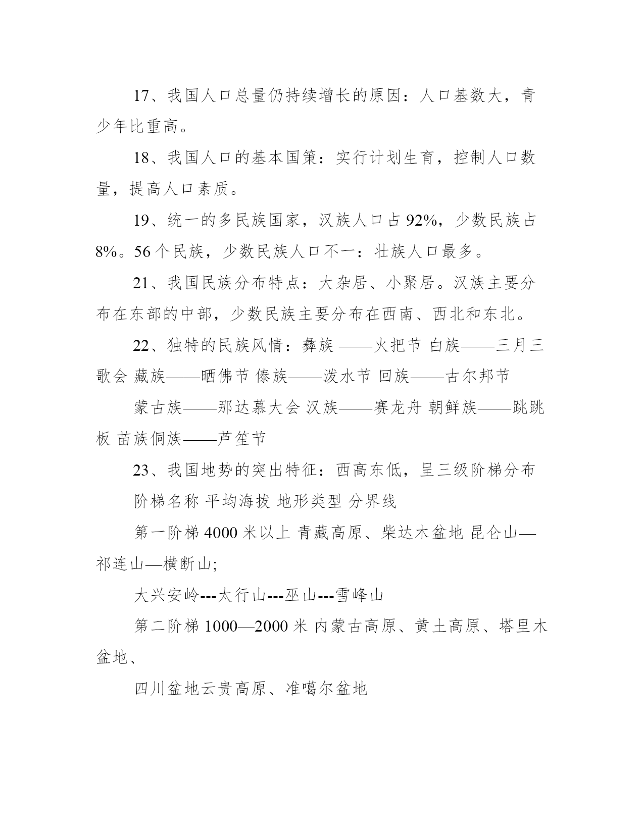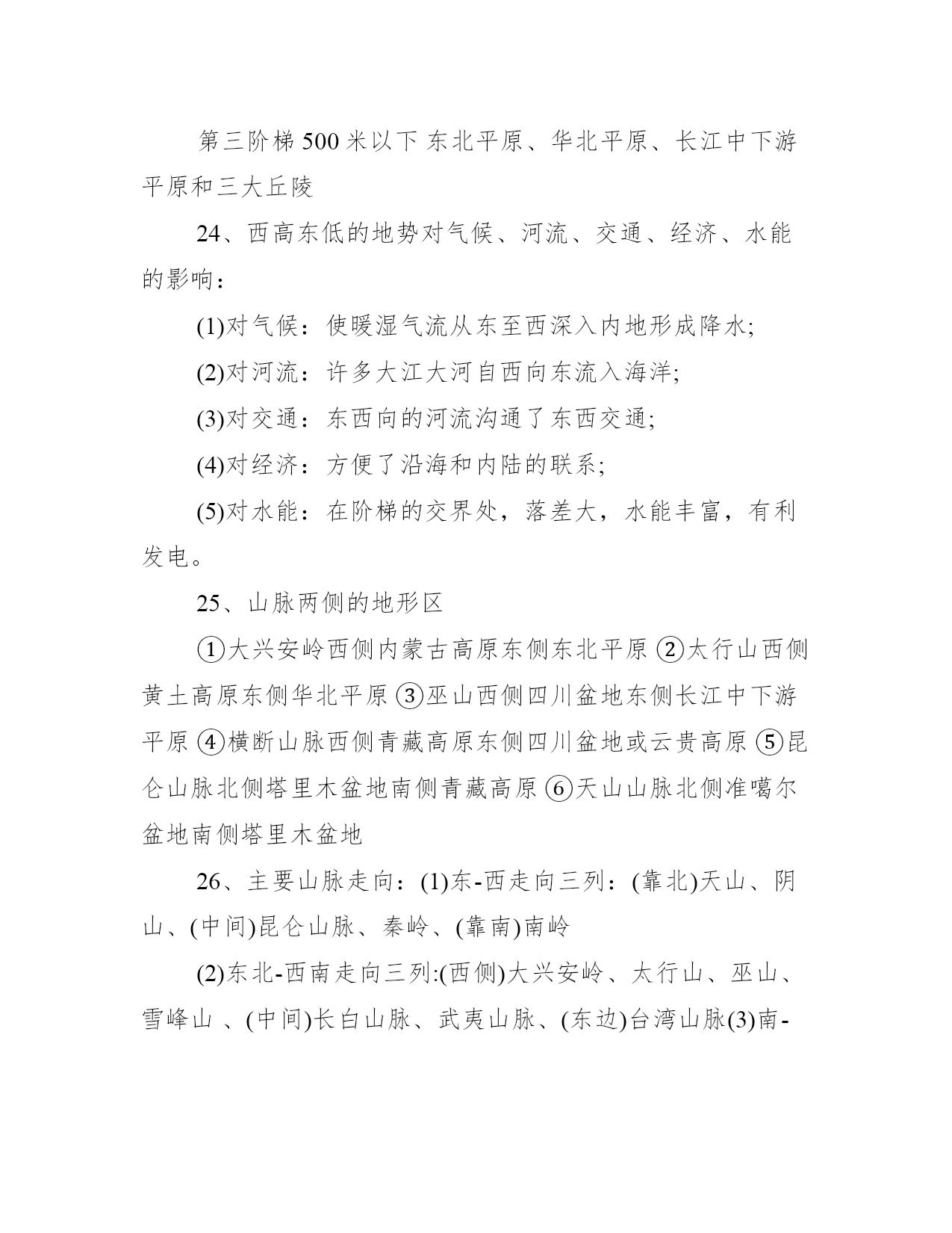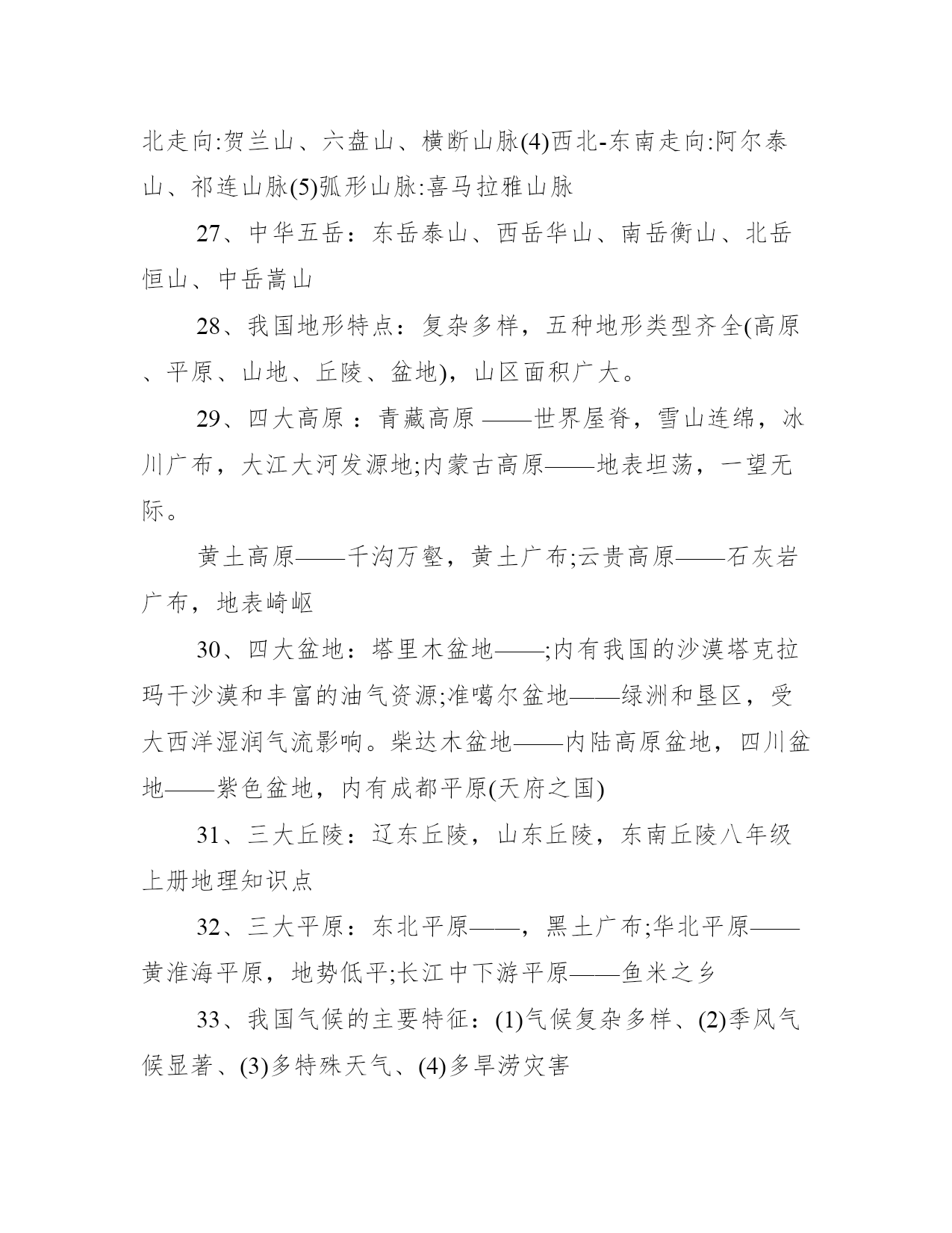 2021中考人教版八年级上册地理知识点大全学习是一个坚持不懈的过程,走走停停便难有成就。学习地理也是一样,不能只有三分钟热度,而要一鼓作气,天天坚持,接下来学习大全网小编在这里给大家分享一些关于人教版八年级上册地理知识点,供大家学习和参考,希望对大家有所帮助。人教版八年级上册地理知识点1、半球位置:东半球、北半球2、海陆位置:亚洲东部,太平洋西岸3、经纬度位置:4°N—53°N;73°E—135°E,东西跨经度60多度(跨5个时区,相差4个小时),南北跨纬度近50度。大部分在北温带,小部分在热带,没有寒带。4、领土的四端:最北:漠河镇以北的黑龙江主航道中心;最南:曾母暗沙最西:帕米尔高原;最东:黑龙江与乌苏里江的汇合处。5、陆地面积:960万平方千米。居第3位。陆界线:2万多千米6、濒临的海洋:从北往南有渤海、黄海、东海、和南海及太平洋。海岸线长1.8万千米。内海有渤海和琼州海峡。8、陆上邻国:14个:朝、俄、蒙、哈、吉、塔、阿、巴、印、尼、不、缅、老、越9、隔海相望的国家:日、韩、菲、马、文、印尼10、三级行政区划:省、县、乡三级及特别行政区八年级上册地理知识点11、34个省级行政单位:23个省、5个自治区(新疆维吾尔自治区、西藏自治区、宁夏回族自治区、内蒙古自治区、广西壮族自治区)、4个直辖市(北京、天津、上海、重庆)和2个特别行政区(香港、澳门)12、各省级行政区的简称和行政中心:p813、人口数量世界第一:2000年达12.95亿;占世界21.2%。省区分布:最多:河南省;最少:澳门。15、新中国成立以来人口增长快的主要原因:(1)人民生活水平提高和医疗卫生条件的改善。(2)死亡率下降,出生率上升。16、地理分布特点:东部人口密度大、人口多;西部人口密度小、人口少。(沿海河湖、平原、盆地交通和经济发达等地区人口多)17、我国人口总量仍持续增长的原因:人口基数大,青少年比重高。18、我国人口的基本国策:实行计划生育,控制人口数量,提高人口素质。19、统一的多民族国家,汉族人口占92%,少数民族占8%。56个民族,少数民族人口不一:壮族人口最多。21、我国民族分布特点:大杂居、小聚居。汉族主要分布在东部的中部,少数民族主要分布在西南、西北和东北。22、独特的民族风情:彝族——火把节白族——三月三歌会藏族——晒佛节傣族——泼水节回族——古尔邦节蒙古族——那达慕大会汉族——赛龙舟朝鲜族——跳跳板苗族侗族——芦笙节23、我国地势的突出特征:西高东低,呈三级阶梯分布阶梯名称平均海拔地形类型分界线第一阶梯4000米以上青藏高原、柴达木盆地昆仑山—祁连山—横断山;大兴安岭---太行山---巫山---雪峰山第二阶梯1000—2000米内蒙古高原、黄土高原、塔里木盆地、四川盆地云贵高原、准噶尔盆地第三阶梯500米以下东北平原、华北平原、长江中下游平原和三大丘陵24、西高东低的地势对气候、河流、交通、经济、水能的影响:(1)对气候:使暖湿气流从东至西深入内地形成降水;(2)对河流:许多大江大河自西向东流入海洋;(3)对交通:东西向的河流沟通了东西交通;(4)对经济:方便了沿海和内陆的联系;(5)对水能:在阶梯的交界处,落差大,水能丰富,有利发电。25、山脉两侧的地形区①大兴安岭西侧内蒙古高原东侧东北平原②太行山西侧黄土高原东侧华北平原③巫山西侧四川盆地东侧长江中下游平原④横断山脉西侧青藏高原东侧四川盆地或云贵高原⑤昆仑山脉北侧塔里木盆地南侧青藏高原⑥天山山脉北侧准噶尔盆地南侧塔里木盆地26、主要山脉走向:(1)东-西走向三列:(靠北)天山、阴山、(中间)昆仑山脉、秦岭、(靠南)南岭(2)东北-西南走向三列:(西侧)大兴安岭、太行山、巫山、雪峰山、(中间)长白山脉、武夷山脉、(东边)台湾山脉(3)南-北走向:贺兰山、六盘山、横断山脉(4)西北-东南走向:阿尔泰山、祁连山脉(5)弧形山脉:喜马拉雅山脉27、中华五岳:东岳泰山、西岳华山、南岳衡山、北岳恒山、中岳嵩山28、我国地形特点:复杂多样,五种地形类型齐全(高原、平原、山地、丘陵、盆地),山区面积广大。29、四大高原:青藏高原——世界屋脊,雪山连绵,冰川广布,大江大河发源地;内蒙古高原——地表坦荡,一望无际。黄土高原——千沟万壑,黄土广布;云贵高原——石灰岩广布,地表崎岖30、四大盆地:塔里木盆地——;内有我国的沙漠塔克拉玛干沙漠和丰富的油气资源;准噶尔盆地——绿洲和垦区,受大西洋湿润气流影响。柴达木盆地——内陆高原盆地,四川盆地——紫色盆地,内有成都平原(天府之国)31、三大丘陵:辽东丘陵,山东丘陵,东南丘陵八年级上册地理知识点32、三大平原:东北平原——,黑土广布;华北平原——黄淮海平原,地势低平;长江中下游平原——鱼米之乡33、我国气候的主要特征:(1)气候复杂多样、(2)季风气候显著
