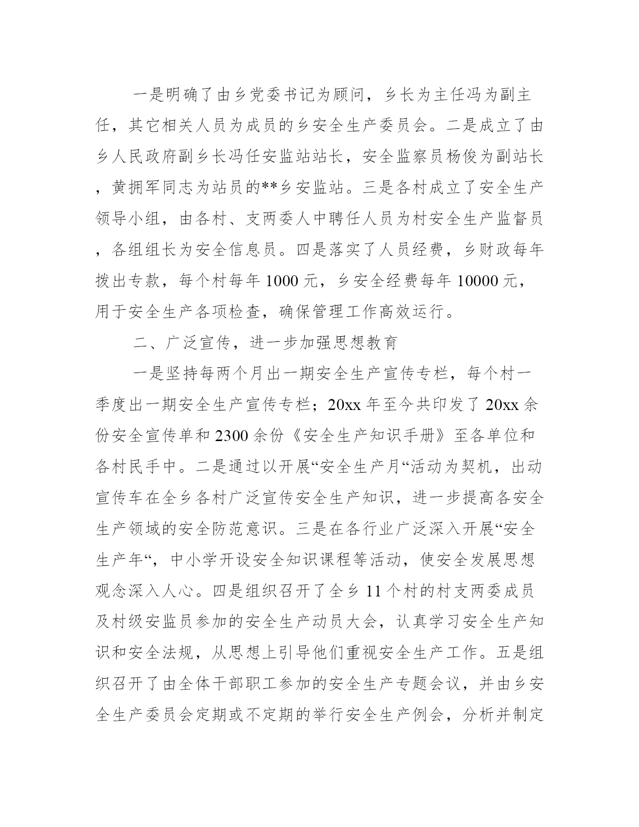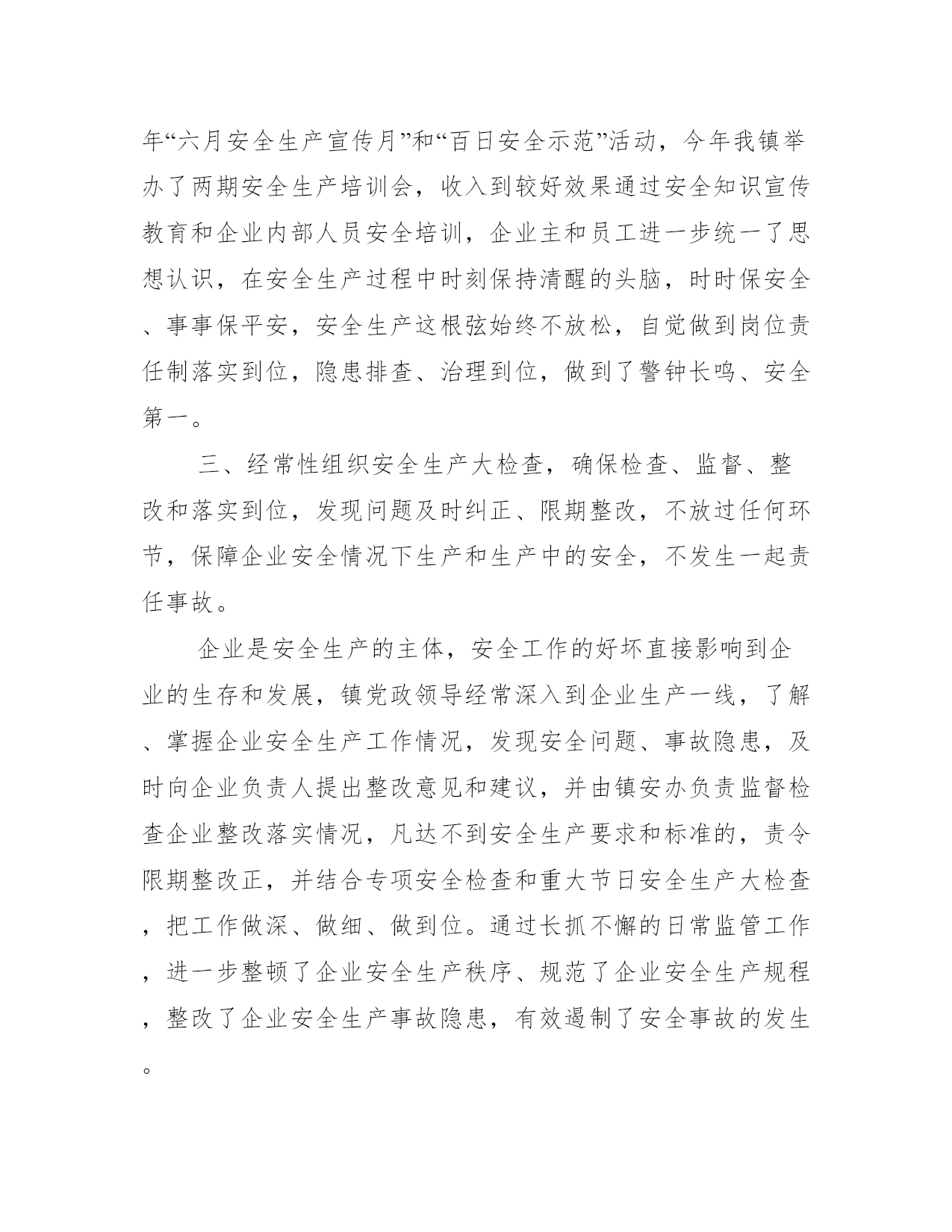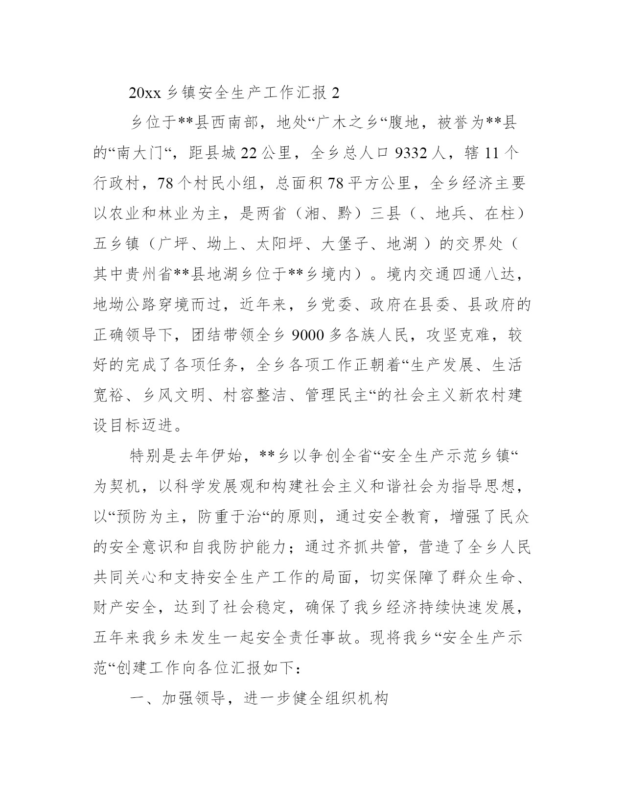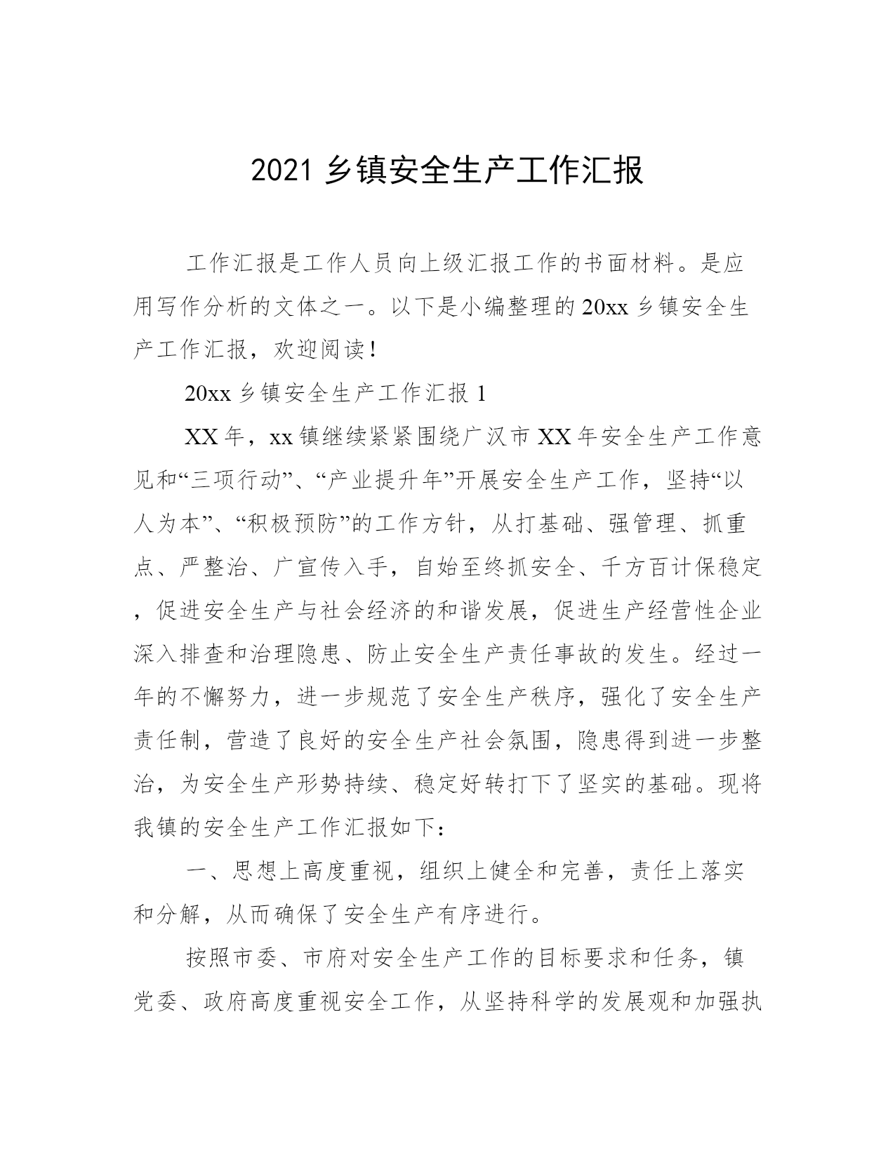 2021乡镇安全生产工作汇报工作汇报是工作人员向上级汇报工作的书面材料。是应用写作分析的文体之一。以下是小编整理的20xx乡镇安全生产工作汇报,欢迎阅读!20xx乡镇安全生产工作汇报1XX年,xx镇继续紧紧围绕广汉市XX年安全生产工作意见和“三项行动”、“产业提升年”开展安全生产工作,坚持“以人为本”、“积极预防”的工作方针,从打基础、强管理、抓重点、严整治、广宣传入手,自始至终抓安全、千方百计保稳定,促进安全生产与社会经济的和谐发展,促进生产经营性企业深入排查和治理隐患、防止安全生产责任事故的发生。经过一年的不懈努力,进一步规范了安全生产秩序,强化了安全生产责任制,营造了良好的安全生产社会氛围,隐患得到进一步整治,为安全生产形势持续、稳定好转打下了坚实的基础。现将我镇的安全生产工作汇报如下:一、思想上高度重视,组织上健全和完善,责任上落实和分解,从而确保了安全生产有序进行。按照市委、市府对安全生产工作的目标要求和任务,镇党委、政府高度重视安全工作,从坚持科学的发展观和加强执政能力建设的高度,切实加强安全生产工作的组织领导,把安全生产工作纳入党委重要议事日程,抓紧抓好。坚持每季度组织召开安全生产例会,分析、分析安全生产出现的新情况、新问题,做到有的放矢和针对性,安排部署检查、督促、整改和落实工作,不放松任何企业、任何环节。年初我们适时调整了我镇的安全生产工作领导小组,进一步完善了安全生产责任制,全面落实“一把手负责制”和“一岗双责”工作,本着明确职责,落实责任,突出重点、兼顾一般的原则,逐步建立安全工作长效监管机制,把事故隐患消灭在萌芽状态。年初我镇与各村、企事业单位、砂石业主全部签订了安全生产责任书,把安全工作的职责真正落到人、落实到实处,安全工作真正做到了层层抓、层层管、层层负责。二、加大安全生产法律、法规、条例的宣传力度,确保安全生产的法律、法规、条例深入到企业的方方面面。加强企业法人和员工的安全知识宣传教育和培训,今年上半年组织对全镇企业安全管理人员由市安监局进行了集中安全教育培训,培训人数达54人,将培训工作扩展到班、组,收到良好效果,从而强化企业法人和管理人员的安全生产意识、责任意识、职业健康安全意识、员工自我保护意识和维护自身合法权益意识,充分利用广播、标语、横幅、挂图、板报等形式,在企业中广泛深入地开展安全知识宣传教育,并结合每年“六月安全生产宣传月”和“百日安全示范”活动,今年我镇举办了两期安全生产培训会,收入到较好效果通过安全知识宣传教育和企业内部人员安全培训,企业主和员工进一步统一了思想认识,在安全生产过程中时刻保持清醒的头脑,时时保安全、事事保平安,安全生产这根弦始终不放松,自觉做到岗位责任制落实到位,隐患排查、治理到位,做到了警钟长鸣、安全第一。三、经常性组织安全生产大检查,确保检查、监督、整改和落实到位,发现问题及时纠正、限期整改,不放过任何环节,保障企业安全情况下生产和生产中的安全,不发生一起责任事故。企业是安全生产的主体,安全工作的好坏直接影响到企业的生存和发展,镇党政领导经常深入到企业生产一线,了解、掌握企业安全生产工作情况,发现安全问题、事故隐患,及时向企业负责人提出整改意见和建议,并由镇安办负责监督检查企业整改落实情况,凡达不到安全生产要求和标准的,责令限期整改正,并结合专项安全检查和重大节日安全生产大检查,把工作做深、做细、做到位。通过长抓不懈的日常监管工作,进一步整顿了企业安全生产秩序、规范了企业安全生产规程,整改了企业安全生产事故隐患,有效遏制了安全事故的发生。20xx乡镇安全生产工作汇报2乡位于**县西南部,地处“广木之乡“腹地,被誉为**县的“南大门“,距县城22公里,全乡总人口9332人,辖11个行政村,78个村民小组,总面积78平方公里,全乡经济主要以农业和林业为主,是两省(湘、黔)三县(、地兵、在柱)五乡镇(广坪、坳上、太阳坪、大堡子、地湖)的交界处(其中贵州省**县地湖乡位于**乡境内)。境内交通四通八达,地坳公路穿境而过,近年来,乡党委、政府在县委、县政府的正确领导下,团结带领全乡9000多各族人民,攻坚克难,较好的完成了各项任务,全乡各项工作正朝着“生产发展、生活宽裕、乡风文明、村容整洁、管理民主“的社会主义新农村建设目标迈进。特别是去年伊始,**乡以争创全省“安全生产示范乡镇“为契机,以科学发展观和构建社会主义和谐社会为指导思想,以“预防为主,防重于治“的原则,通过安全教育,增强了民众的安全意识和自我防护能力;通过齐抓共管,营造了全乡人民共同关心和支持安全生产工作的局面,切实保障了群众生命、财产安全,达到了社会稳定,确保了我乡经济持续快速发展,五年来我乡未发生一起安全责任事故。现将我乡“安全生产示范“创建工作向各位汇报如下:一、加强领导,进一步健全组织机构一是明确了