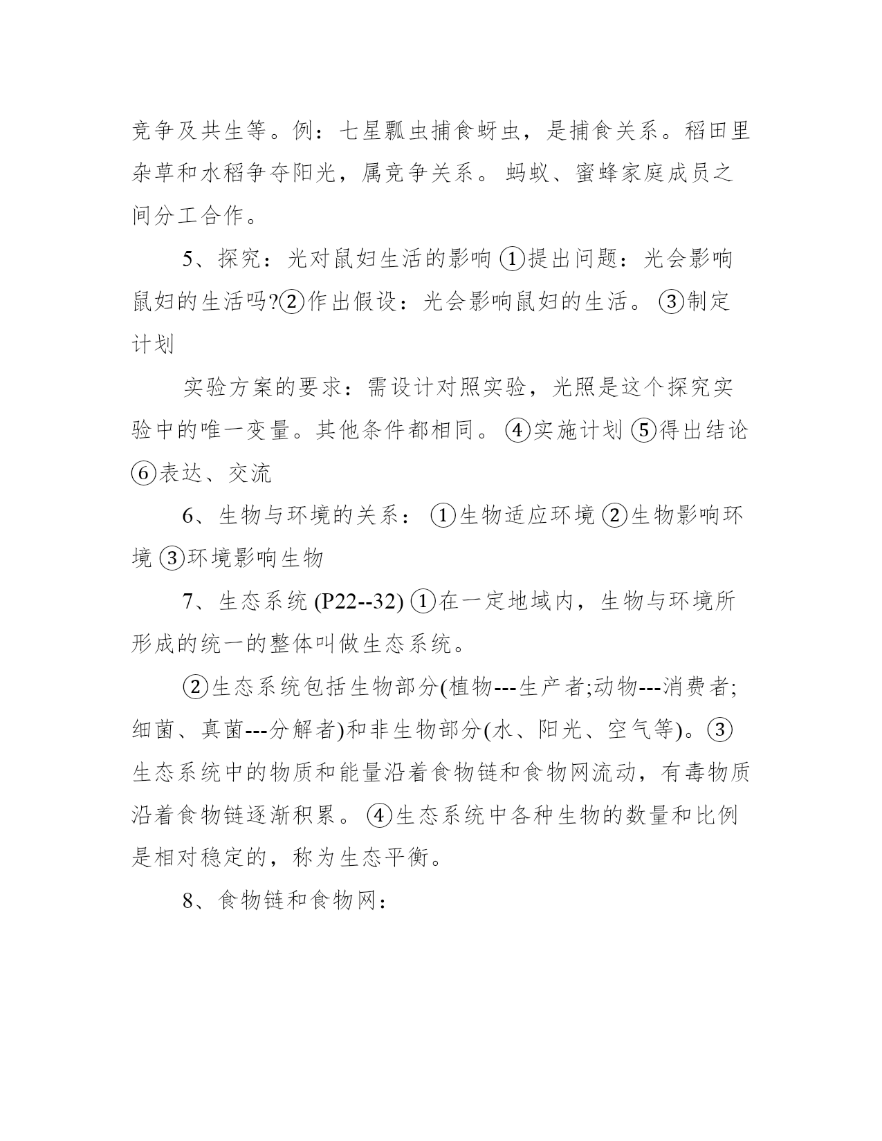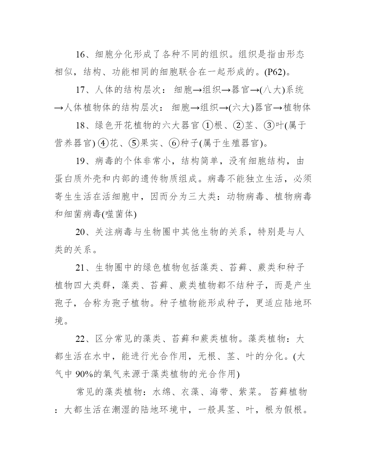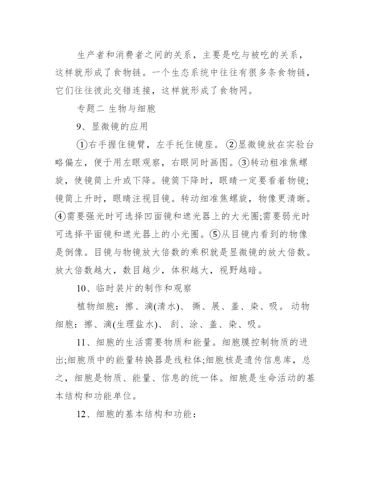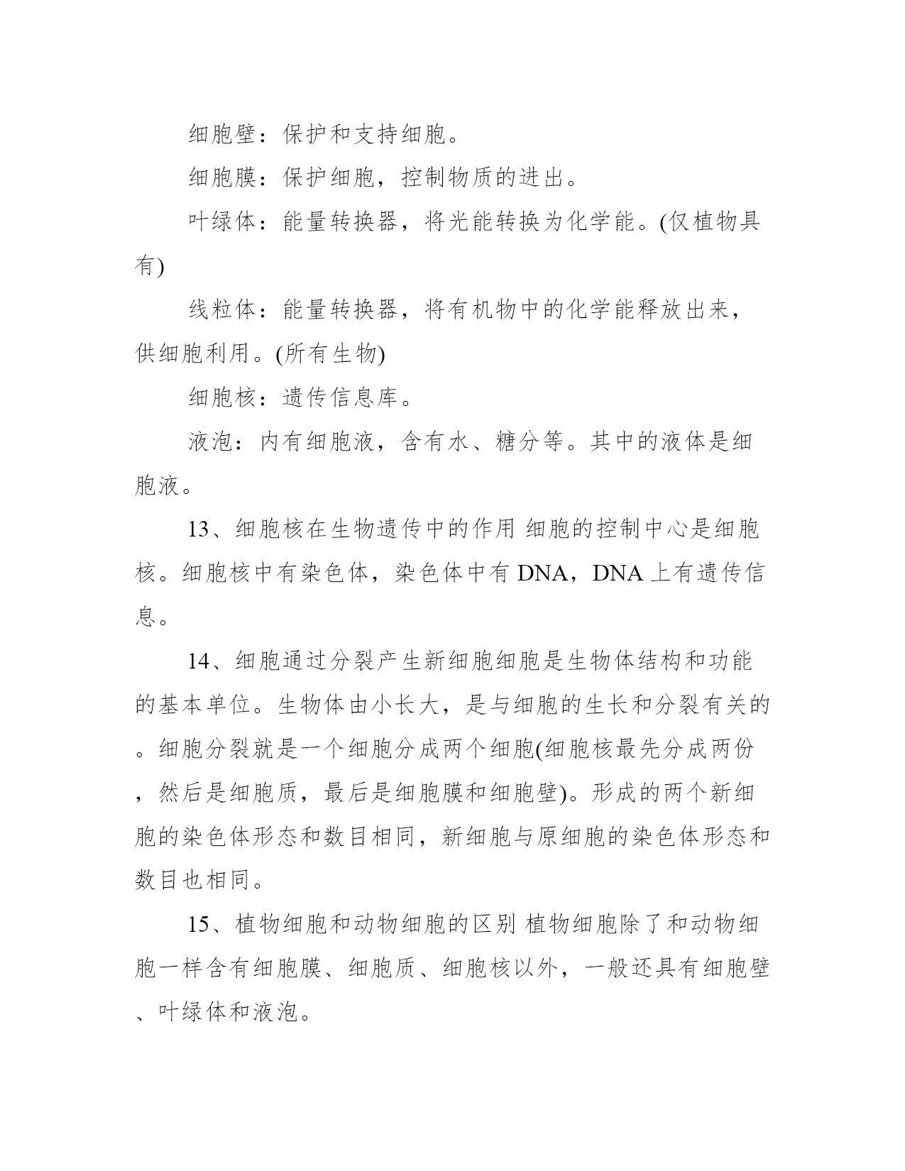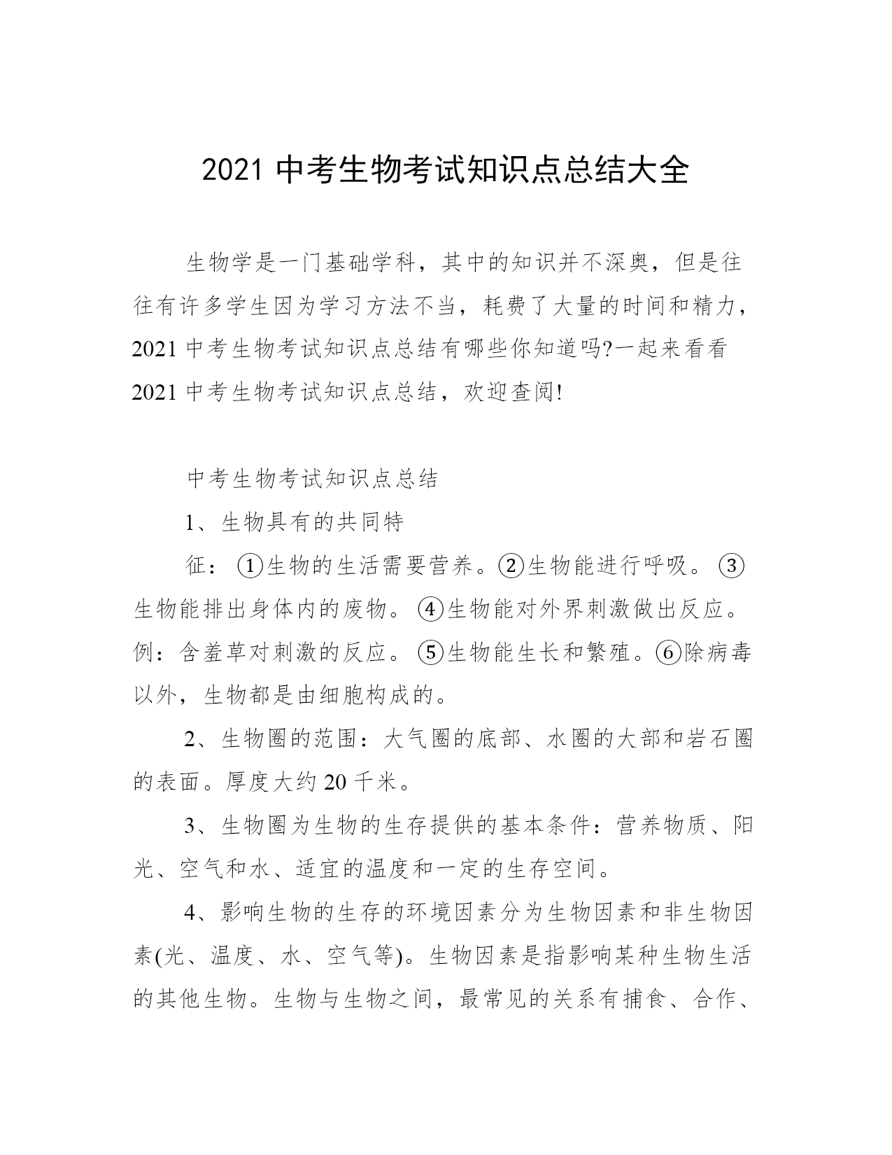 2021中考生物考试知识点总结大全生物学是一门基础学科,其中的知识并不深奥,但是往往有许多学生因为学习方法不当,耗费了大量的时间和精力,2021中考生物考试知识点总结有哪些你知道吗?一起来看看2021中考生物考试知识点总结,欢迎查阅!中考生物考试知识点总结1、生物具有的共同特征:①生物的生活需要营养。②生物能进行呼吸。③生物能排出身体内的废物。④生物能对外界刺激做出反应。例:含羞草对刺激的反应。⑤生物能生长和繁殖。⑥除病毒以外,生物都是由细胞构成的。2、生物圈的范围:大气圈的底部、水圈的大部和岩石圈的表面。厚度大约20千米。3、生物圈为生物的生存提供的基本条件:营养物质、阳光、空气和水、适宜的温度和一定的生存空间。4、影响生物的生存的环境因素分为生物因素和非生物因素(光、温度、水、空气等)。生物因素是指影响某种生物生活的其他生物。生物与生物之间,最常见的关系有捕食、合作、竞争及共生等。例:七星瓢虫捕食蚜虫,是捕食关系。稻田里杂草和水稻争夺阳光,属竞争关系。蚂蚁、蜜蜂家庭成员之间分工合作。5、探究:光对鼠妇生活的影响①提出问题:光会影响鼠妇的生活吗?②作出假设:光会影响鼠妇的生活。③制定计划实验方案的要求:需设计对照实验,光照是这个探究实验中的唯一变量。其他条件都相同。④实施计划⑤得出结论⑥表达、交流6、生物与环境的关系:①生物适应环境②生物影响环境③环境影响生物7、生态系统(P22--32)①在一定地域内,生物与环境所形成的统一的整体叫做生态系统。②生态系统包括生物部分(植物---生产者;动物---消费者;细菌、真菌---分解者)和非生物部分(水、阳光、空气等)。③生态系统中的物质和能量沿着食物链和食物网流动,有毒物质沿着食物链逐渐积累。④生态系统中各种生物的数量和比例是相对稳定的,称为生态平衡。8、食物链和食物网:生产者和消费者之间的关系,主要是吃与被吃的关系,这样就形成了食物链。一个生态系统中往往有很多条食物链,它们往往彼此交错连接,这样就形成了食物网。专题二生物与细胞9、显微镜的应用①右手握住镜臂,左手托住镜座。②显微镜放在实验台略偏左,便于用左眼观察,右眼同时画图。③转动粗准焦螺旋,使镜筒上升或下降。镜筒下降时,眼睛一定要看着物镜;镜筒上升时,眼睛注视目镜。转动细准焦螺旋,物像更清晰。④需要强光时可选择凹面镜和遮光器上的大光圈;需要弱光时可选择平面镜和遮光器上的小光圈。⑤从目镜内看到的物像是倒像。目镜与物镜放大倍数的乘积就是显微镜的放大倍数。放大倍数越大,数目越少,体积越大,视野越暗。10、临时装片的制作和观察植物细胞:擦、滴(清水)、撕、展、盖、染、吸。动物细胞:擦、滴(生理盐水)、刮、涂、盖、染、吸。11、细胞的生活需要物质和能量。细胞膜控制物质的进出;细胞质中的能量转换器是线粒体;细胞核是遗传信息库,总之,细胞是物质、能量、信息的统一体。细胞是生命活动的基本结构和功能单位。12、细胞的基本结构和功能:细胞壁:保护和支持细胞。细胞膜:保护细胞,控制物质的进出。叶绿体:能量转换器,将光能转换为化学能。(仅植物具有)线粒体:能量转换器,将有机物中的化学能释放出来,供细胞利用。(所有生物)细胞核:遗传信息库。液泡:内有细胞液,含有水、糖分等。其中的液体是细胞液。13、细胞核在生物遗传中的作用细胞的控制中心是细胞核。细胞核中有染色体,染色体中有DNA,DNA上有遗传信息。14、细胞通过分裂产生新细胞细胞是生物体结构和功能的基本单位。生物体由小长大,是与细胞的生长和分裂有关的。细胞分裂就是一个细胞分成两个细胞(细胞核最先分成两份,然后是细胞质,最后是细胞膜和细胞壁)。形成的两个新细胞的染色体形态和数目相同,新细胞与原细胞的染色体形态和数目也相同。15、植物细胞和动物细胞的区别植物细胞除了和动物细胞一样含有细胞膜、细胞质、细胞核以外,一般还具有细胞壁、叶绿体和液泡。16、细胞分化形成了各种不同的组织。组织是指由形态相似,结构、功能相同的细胞联合在一起形成的。(P62)。17、人体的结构层次:细胞→组织→器官→(八大)系统→人体植物体的结构层次:细胞→组织→(六大)器官→植物体18、绿色开花植物的六大器官①根、②茎、③叶(属于营养器官)④花、⑤果实、⑥种子(属于生殖器官)。19、病毒的个体非常小,结构简单,没有细胞结构,由蛋白质外壳和内部的遗传物质组成。病毒不能独立生活,必须寄生生活在活细胞中,因而分为三大类:动物病毒、植物病毒和细菌病毒(噬菌体)20、关注病毒与生物圈中其他生物的关系,特别是与人类的关系。21、生物圈中的绿色植物包括藻类、苔藓、蕨类和种子植物四大类群,藻类、苔藓、蕨类植物都不结种子,而是产生孢子,合称为孢子植物。种子植物能形成种子,更适应陆地环境。22、区分常见的藻类、苔藓和蕨类植物。藻类植物:大都生活在水中,