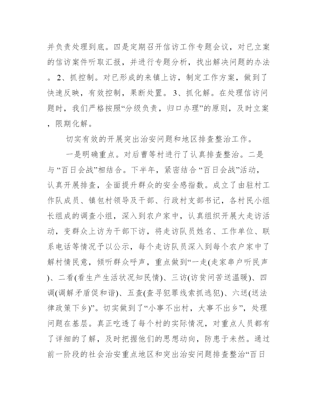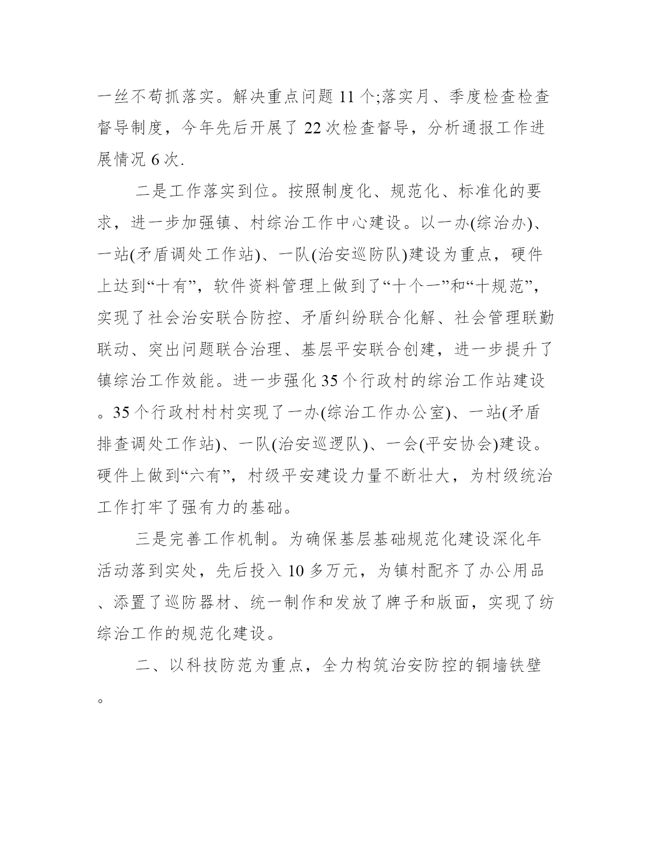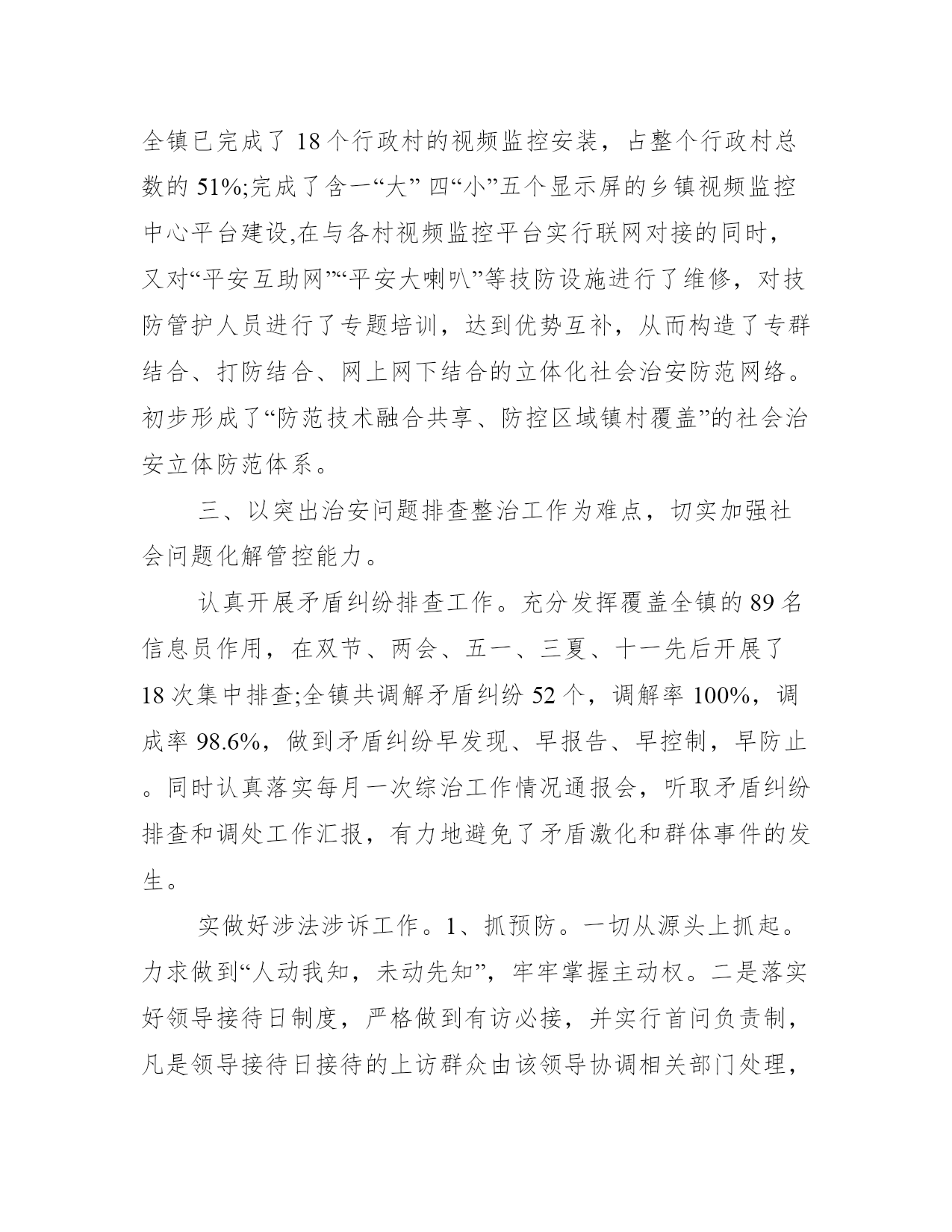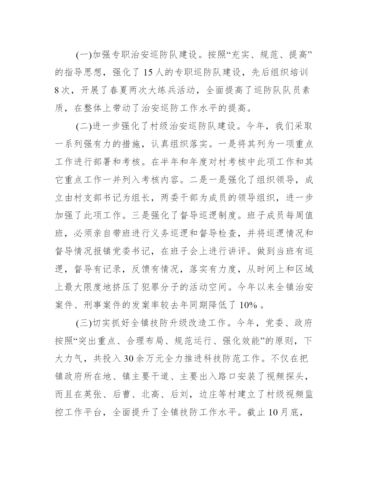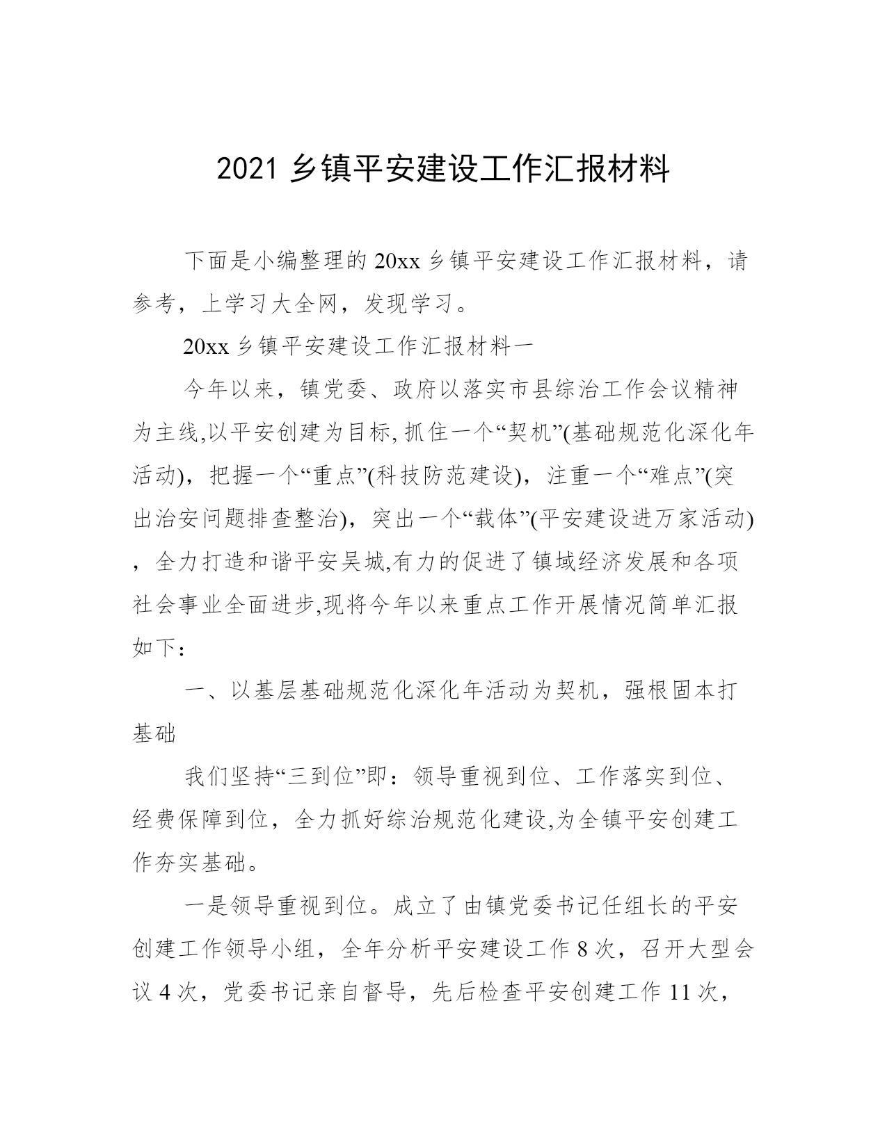 2021乡镇平安建设工作汇报材料下面是小编整理的20xx乡镇平安建设工作汇报材料,请参考,上学习大全网,发现学习。20xx乡镇平安建设工作汇报材料一今年以来,镇党委、政府以落实市县综治工作会议精神为主线,以平安创建为目标,抓住一个“契机”(基础规范化深化年活动),把握一个“重点”(科技防范建设),注重一个“难点”(突出治安问题排查整治),突出一个“载体”(平安建设进万家活动),全力打造和谐平安吴城,有力的促进了镇域经济发展和各项社会事业全面进步,现将今年以来重点工作开展情况简单汇报如下:一、以基层基础规范化深化年活动为契机,强根固本打基础我们坚持“三到位”即:领导重视到位、工作落实到位、经费保障到位,全力抓好综治规范化建设,为全镇平安创建工作夯实基础。一是领导重视到位。成立了由镇党委书记任组长的平安创建工作领导小组,全年分析平安建设工作8次,召开大型会议4次,党委书记亲自督导,先后检查平安创建工作11次,一丝不苟抓落实。解决重点问题11个;落实月、季度检查检查督导制度,今年先后开展了22次检查督导,分析通报工作进展情况6次.二是工作落实到位。按照制度化、规范化、标准化的要求,进一步加强镇、村综治工作中心建设。以一办(综治办)、一站(矛盾调处工作站)、一队(治安巡防队)建设为重点,硬件上达到“十有”,软件资料管理上做到了“十个一”和“十规范”,实现了社会治安联合防控、矛盾纠纷联合化解、社会管理联勤联动、突出问题联合治理、基层平安联合创建,进一步提升了镇综治工作效能。进一步强化35个行政村的综治工作站建设。35个行政村村村实现了一办(综治工作办公室)、一站(矛盾排查调处工作站)、一队(治安巡逻队)、一会(平安协会)建设。硬件上做到“六有”,村级平安建设力量不断壮大,为村级统治工作打牢了强有力的基础。三是完善工作机制。为确保基层基础规范化建设深化年活动落到实处,先后投入10多万元,为镇村配齐了办公用品、添置了巡防器材、统一制作和发放了牌子和版面,实现了纺综治工作的规范化建设。二、以科技防范为重点,全力构筑治安防控的铜墙铁壁。(一)加强专职治安巡防队建设。按照“充实、规范、提高”的指导思想,强化了15人的专职巡防队建设,先后组织培训8次,开展了春夏两次大练兵活动,全面提高了巡防队队员素质,在整体上带动了治安巡防工作水平的提高。(二)进一步强化了村级治安巡防队建设。今年,我们采取一系列强有力的措施,认真组织落实。一是将其列为一项重点工作进行部署和考核。在半年和年度对村考核中此项工作和其它重点工作一并列入考核内容。二是一是强化了组织领导,成立由村支部书记为组长,两委干部为成员的领导组织,进一步加强了此项工作。三是强化了督导巡逻制度。班子成员每周值班,必须亲自带班进行义务巡逻和督导检查,并将巡逻情况和督导情况报镇党委书记,在班子会上进行讲评。做到当班有巡逻,督导有记录,反馈有情况,落实有力度,从时间上和区域上最大限度地挤压了犯罪分子的活动空间。今年以来全镇治安案件、刑事案件的发案率较去年同期降低了10%。(三)切实抓好全镇技防升级改造工作。今年,党委、政府按照“突出重点、合理布局、规范运行、强化效能”的原则,下大力气,共投入30余万元全力推进科技防范工作。不仅在把镇政府所在地、镇主要干道、主要出入路口安装了视频探头,而且在英张、后曹、北高、后刘,边庄等村建立了村级视频监控工作平台,全面提升了全镇技防工作水平。截止10月底,全镇已完成了18个行政村的视频监控安装,占整个行政村总数的51%;完成了含一“大”四“小”五个显示屏的乡镇视频监控中心平台建设,在与各村视频监控平台实行联网对接的同时,又对“平安互助网”“平安大喇叭”等技防设施进行了维修,对技防管护人员进行了专题培训,达到优势互补,从而构造了专群结合、打防结合、网上网下结合的立体化社会治安防范网络。初步形成了“防范技术融合共享、防控区域镇村覆盖”的社会治安立体防范体系。三、以突出治安问题排查整治工作为难点,切实加强社会问题化解管控能力。认真开展矛盾纠纷排查工作。充分发挥覆盖全镇的89名信息员作用,在双节、两会、五一、三夏、十一先后开展了18次集中排查;全镇共调解矛盾纠纷52个,调解率100%,调成率98.6%,做到矛盾纠纷早发现、早报告、早控制,早防止。同时认真落实每月一次综治工作情况通报会,听取矛盾纠纷排查和调处工作汇报,有力地避免了矛盾激化和群体事件的发生。实做好涉法涉诉工作。1、抓预防。一切从源头上抓起。力求做到“人动我知,未动先知”,牢牢掌握主动权。二是落实好领导接待日制度,严格做到有访必接,并实行首问负责制,凡是领导接待日接待的上访群众由该领导协调相关部门处理,并负责处理到底。四是定期召开信访工作专题会议,对已立案的信访案件听取汇报,并进行专题分析,找出解决问题的办法。2、抓控制