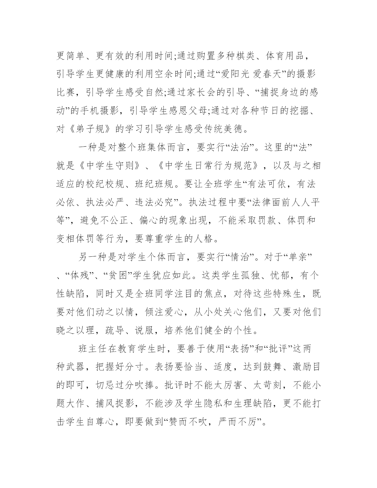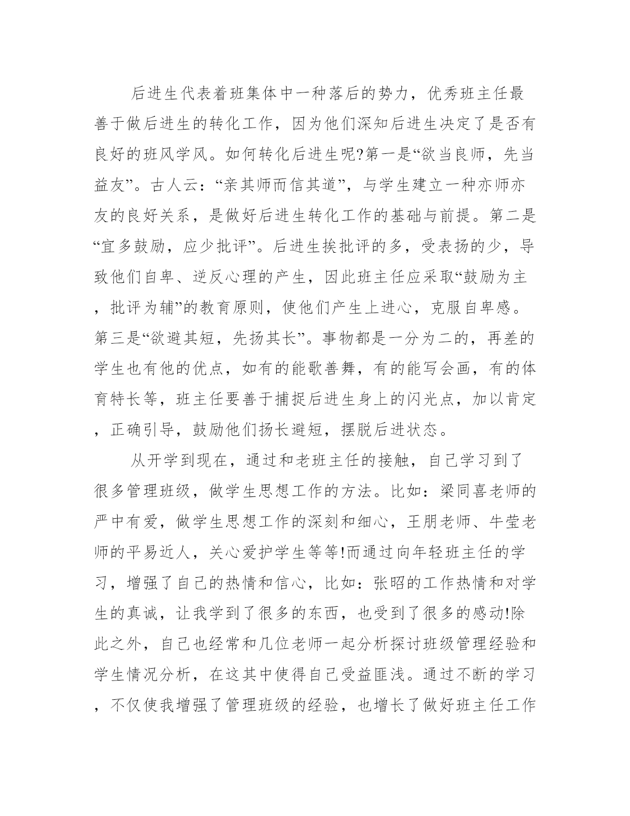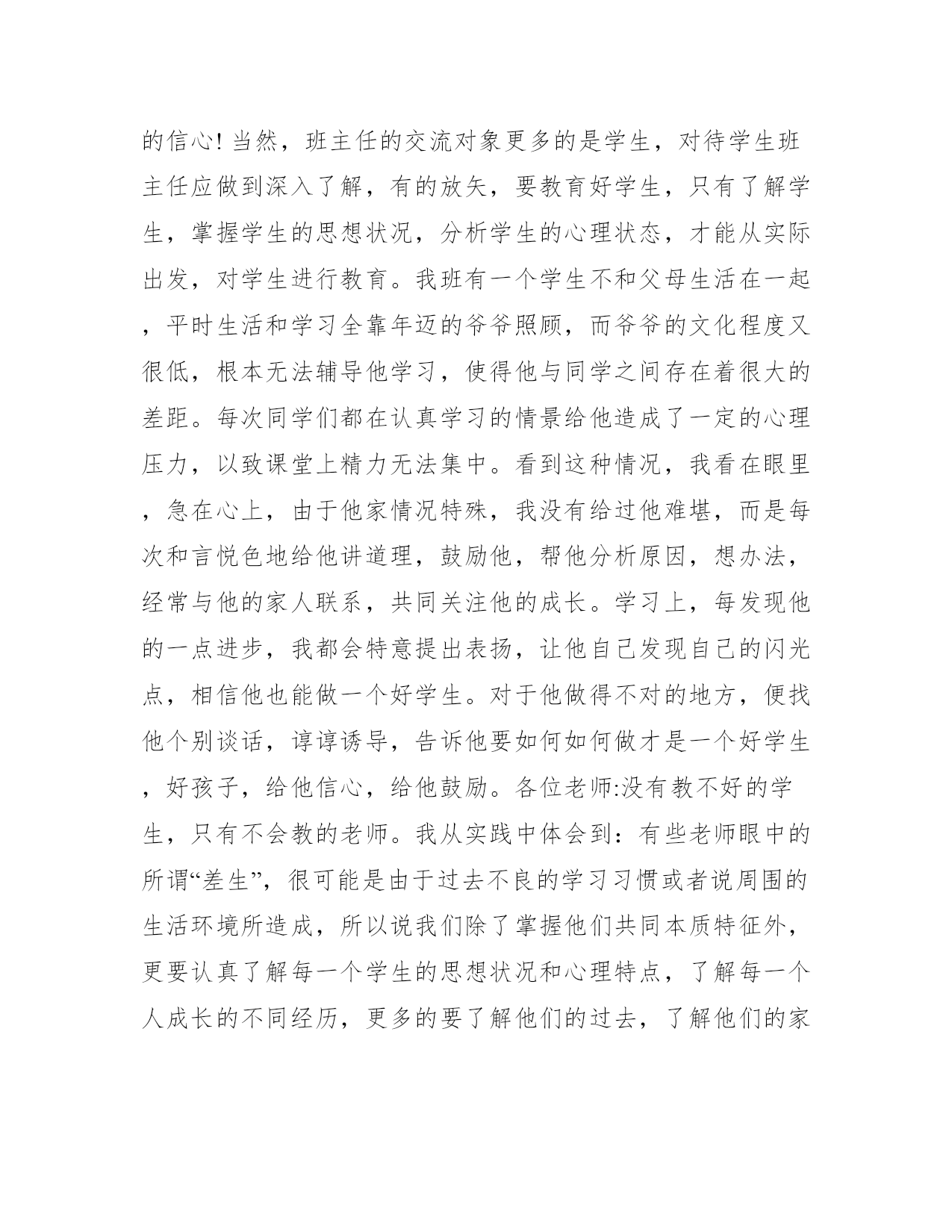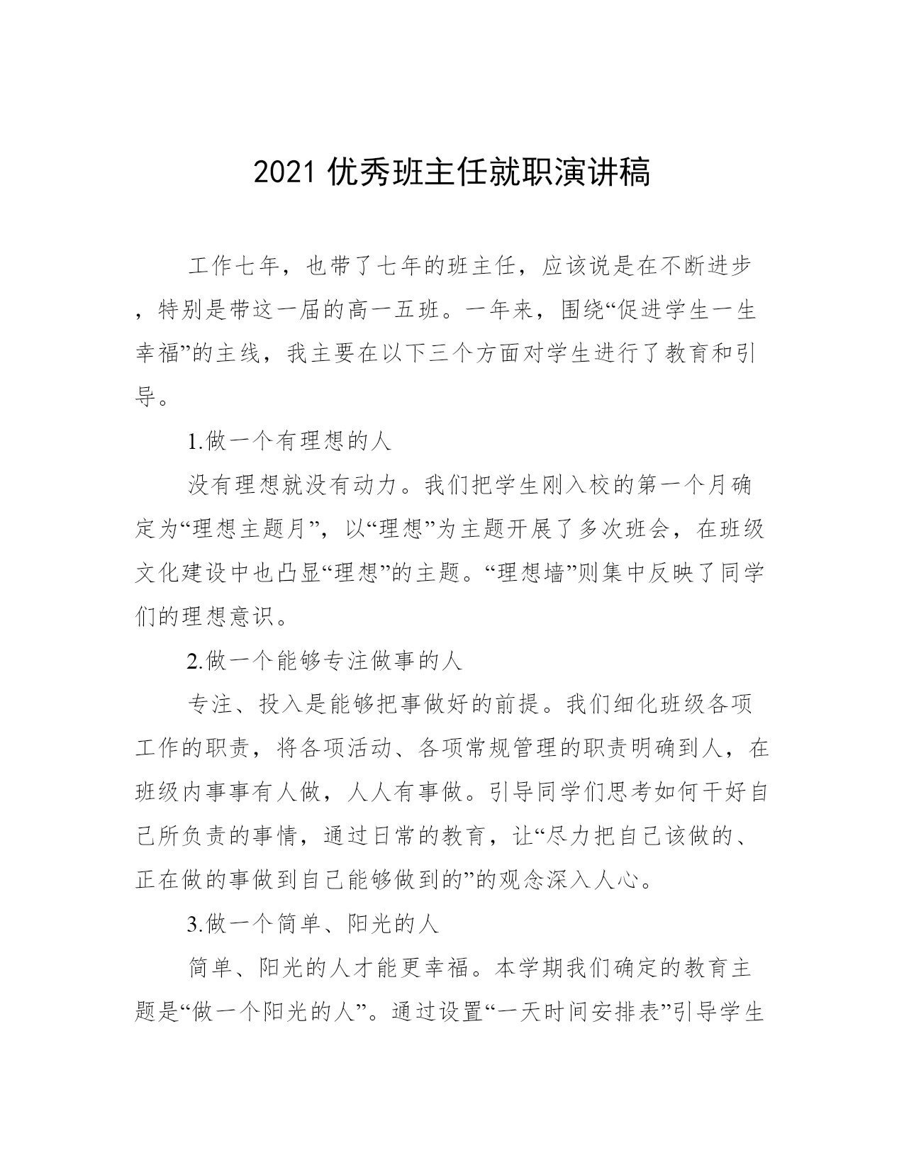 2021优秀班主任就职演讲稿工作七年,也带了七年的班主任,应该说是在不断进步,特别是带这一届的高一五班。一年来,围绕“促进学生一生幸福”的主线,我主要在以下三个方面对学生进行了教育和引导。1.做一个有理想的人没有理想就没有动力。我们把学生刚入校的第一个月确定为“理想主题月”,以“理想”为主题开展了多次班会,在班级文化建设中也凸显“理想”的主题。“理想墙”则集中反映了同学们的理想意识。2.做一个能够专注做事的人专注、投入是能够把事做好的前提。我们细化班级各项工作的职责,将各项活动、各项常规管理的职责明确到人,在班级内事事有人做,人人有事做。引导同学们思考如何干好自己所负责的事情,通过日常的教育,让“尽力把自己该做的、正在做的事做到自己能够做到的”的观念深入人心。3.做一个简单、阳光的人简单、阳光的人才能更幸福。本学期我们确定的教育主题是“做一个阳光的人”。通过设置“一天时间安排表”引导学生更简单、更有效的利用时间;通过购置多种棋类、体育用品,引导学生更健康的利用空余时间;通过“爱阳光爱春天”的摄影比赛,引导学生感受自然;通过家长会的引导、“捕捉身边的感动”的手机摄影,引导学生感恩父母;通过对各种节日的挖掘、对《弟子规》的学习引导学生感受传统美德。一种是对整个班集体而言,要实行“法治”。这里的“法”就是《中学生守则》、《中学生日常行为规范》,以及与之相适应的校纪校规、班纪班规。要让全班学生“有法可依,有法必依、执法必严、违法必究”。执法过程中要“法律面前人人平等”,避免不公正、偏心的现象出现,不能采取罚款、体罚和变相体罚等行为,要尊重学生的人格。另一种是对学生个体而言,要实行“情治”。对于“单亲”、“体残”、“贫困”学生犹应如此。这类学生孤独、忧郁,有个性缺陷,同时又是全班同学注目的焦点,对待这些特殊生,既要对他们动之以情,倾注爱心,从小处关心他们,又要对他们晓之以理,疏导、说服,培养他们健全的个性。班主任在教育学生时,要善于使用“表扬”和“批评”这两种武器,把握好分寸。表扬要恰当、适度,达到鼓舞、激励目的即可,切忌过分吹捧。批评时不能太厉害、太苛刻,不能小题大作、捕风捉影,不能涉及学生隐私和生理缺陷,更不能打击学生自尊心,即要做到“赞而不吹,严而不厉”。后进生代表着班集体中一种落后的势力,优秀班主任最善于做后进生的转化工作,因为他们深知后进生决定了是否有良好的班风学风。如何转化后进生呢?第一是“欲当良师,先当益友”。古人云:“亲其师而信其道”,与学生建立一种亦师亦友的良好关系,是做好后进生转化工作的基础与前提。第二是“宜多鼓励,应少批评”。后进生挨批评的多,受表扬的少,导致他们自卑、逆反心理的产生,因此班主任应采取“鼓励为主,批评为辅”的教育原则,使他们产生上进心,克服自卑感。第三是“欲避其短,先扬其长”。事物都是一分为二的,再差的学生也有他的优点,如有的能歌善舞,有的能写会画,有的体育特长等,班主任要善于捕捉后进生身上的闪光点,加以肯定,正确引导,鼓励他们扬长避短,摆脱后进状态。从开学到现在,通过和老班主任的接触,自己学习到了很多管理班级,做学生思想工作的方法。比如:梁同喜老师的严中有爱,做学生思想工作的深刻和细心,王朋老师、牛莹老师的平易近人,关心爱护学生等等!而通过向年轻班主任的学习,增强了自己的热情和信心,比如:张昭的工作热情和对学生的真诚,让我学到了很多的东西,也受到了很多的感动!除此之外,自己也经常和几位老师一起分析探讨班级管理经验和学生情况分析,在这其中使得自己受益匪浅。通过不断的学习,不仅使我增强了管理班级的经验,也增长了做好班主任工作的信心!当然,班主任的交流对象更多的是学生,对待学生班主任应做到深入了解,有的放矢,要教育好学生,只有了解学生,掌握学生的思想状况,分析学生的心理状态,才能从实际出发,对学生进行教育。我班有一个学生不和父母生活在一起,平时生活和学习全靠年迈的爷爷照顾,而爷爷的文化程度又很低,根本无法辅导他学习,使得他与同学之间存在着很大的差距。每次同学们都在认真学习的情景给他造成了一定的心理压力,以致课堂上精力无法集中。看到这种情况,我看在眼里,急在心上,由于他家情况特殊,我没有给过他难堪,而是每次和言悦色地给他讲道理,鼓励他,帮他分析原因,想办法,经常与他的家人联系,共同关注他的成长。学习上,每发现他的一点进步,我都会特意提出表扬,让他自己发现自己的闪光点,相信他也能做一个好学生。对于他做得不对的地方,便找他个别谈话,谆谆诱导,告诉他要如何如何做才是一个好学生,好孩子,给他信心,给他鼓励。各位老师:没有教不好的学生,只有不会教的老师。我从实践中体会到:有些老师眼中的所谓“差生”,很可能是由于过去不良的学习习惯或者说周围的生活环境所造成,所以说我们除了掌握他们共同本质特征外,更要认真了解每一个学生