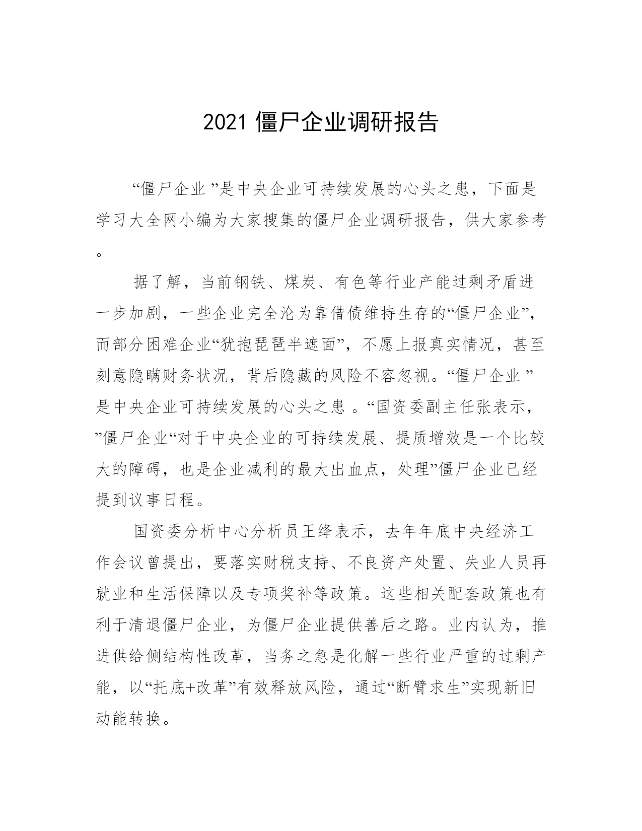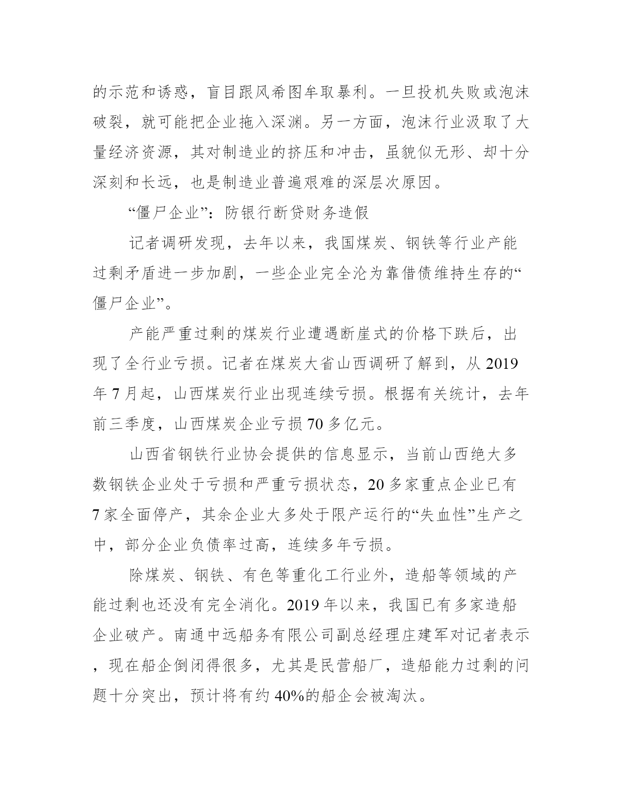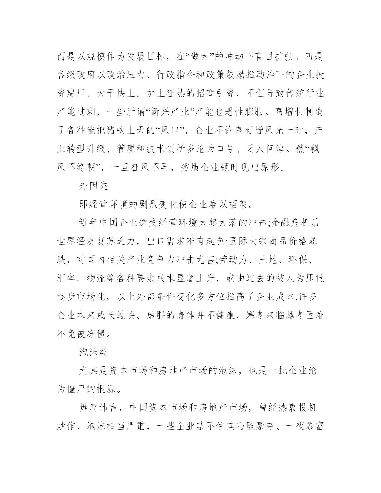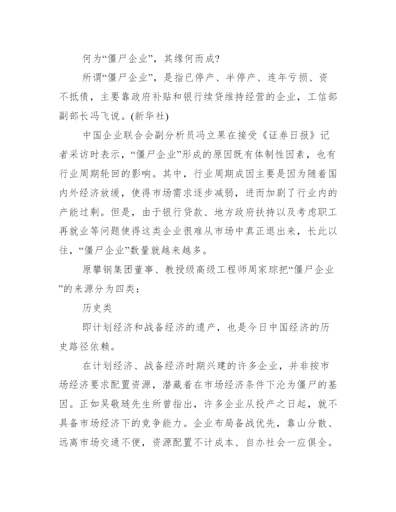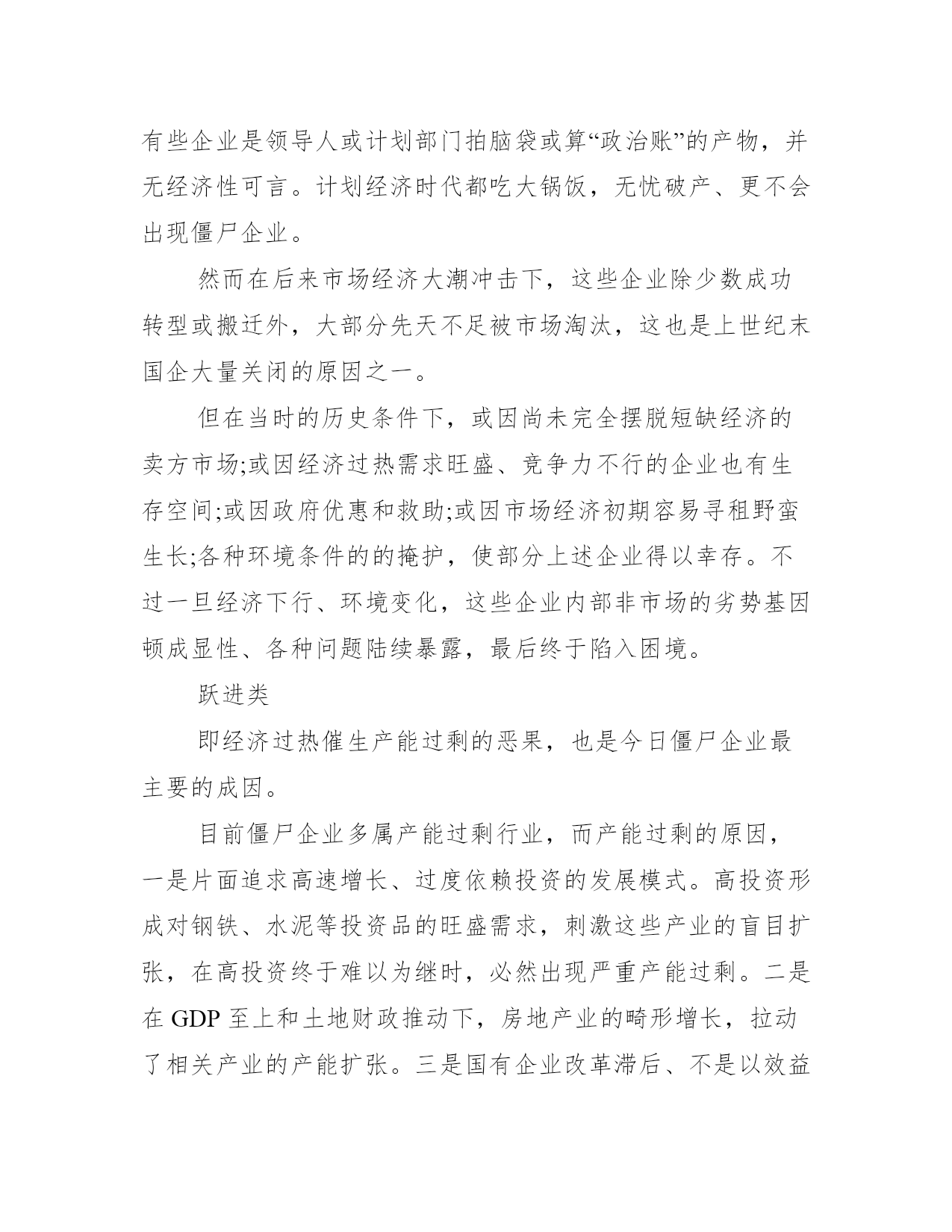 2021僵尸企业调研报告“僵尸企业”是中央企业可持续发展的心头之患,下面是学习大全网小编为大家搜集的僵尸企业调研报告,供大家参考。据了解,当前钢铁、煤炭、有色等行业产能过剩矛盾进一步加剧,一些企业完全沦为靠借债维持生存的“僵尸企业”,而部分困难企业“犹抱琵琶半遮面”,不愿上报真实情况,甚至刻意隐瞒财务状况,背后隐藏的风险不容忽视。“僵尸企业”是中央企业可持续发展的心头之患。“国资委副主任张表示,”僵尸企业“对于中央企业的可持续发展、提质增效是一个比较大的障碍,也是企业减利的最大出血点,处理”僵尸企业已经提到议事日程。国资委分析中心分析员王绛表示,去年年底中央经济工作会议曾提出,要落实财税支持、不良资产处置、失业人员再就业和生活保障以及专项奖补等政策。这些相关配套政策也有利于清退僵尸企业,为僵尸企业提供善后之路。业内认为,推进供给侧结构性改革,当务之急是化解一些行业严重的过剩产能,以“托底+改革”有效释放风险,通过“断臂求生”实现新旧动能转换。何为“僵尸企业”,其缘何而成?所谓“僵尸企业”,是指已停产、半停产、连年亏损、资不抵债,主要靠政府补贴和银行续贷维持经营的企业,工信部副部长冯飞说。(新华社)中国企业联合会副分析员冯立果在接受《证券日报》记者采访时表示,“僵尸企业”形成的原因既有体制性因素,也有行业周期轮回的影响。其中,行业周期成因主要是因为随着国内外经济放缓,使得市场需求逐步减弱,进而加剧了行业内的产能过剩。但是,由于银行贷款、地方政府扶持以及考虑职工再就业等问题使得这类企业很难从市场中真正退出来,长此以往,“僵尸企业”数量就越来越多。原攀钢集团董事、教授级高级工程师周家琮把“僵尸企业”的来源分为四类:历史类即计划经济和战备经济的遗产,也是今日中国经济的历史路径依赖。在计划经济、战备经济时期兴建的许多企业,并非按市场经济要求配置资源,潜藏着在市场经济条件下沦为僵尸的基因。正如吴敬琏先生所曾指出,许多企业从投产之日起,就不具备市场经济下的竞争能力。企业布局备战优先,靠山分散、远离市场交通不便,资源配置不计成本、自办社会一应俱全。有些企业是领导人或计划部门拍脑袋或算“政治账”的产物,并无经济性可言。计划经济时代都吃大锅饭,无忧破产、更不会出现僵尸企业。然而在后来市场经济大潮冲击下,这些企业除少数成功转型或搬迁外,大部分先天不足被市场淘汰,这也是上世纪末国企大量关闭的原因之一。但在当时的历史条件下,或因尚未完全摆脱短缺经济的卖方市场;或因经济过热需求旺盛、竞争力不行的企业也有生存空间;或因政府优惠和救助;或因市场经济初期容易寻租野蛮生长;各种环境条件的的掩护,使部分上述企业得以幸存。不过一旦经济下行、环境变化,这些企业内部非市场的劣势基因顿成显性、各种问题陆续暴露,最后终于陷入困境。跃进类即经济过热催生产能过剩的恶果,也是今日僵尸企业最主要的成因。目前僵尸企业多属产能过剩行业,而产能过剩的原因,一是片面追求高速增长、过度依赖投资的发展模式。高投资形成对钢铁、水泥等投资品的旺盛需求,刺激这些产业的盲目扩张,在高投资终于难以为继时,必然出现严重产能过剩。二是在GDP至上和土地财政推动下,房地产业的畸形增长,拉动了相关产业的产能扩张。三是国有企业改革滞后、不是以效益而是以规模作为发展目标,在“做大”的冲动下盲目扩张。四是各级政府以政治压力、行政指令和政策鼓励推动治下的企业投资建厂、大干快上。加上狂热的招商引资,不但导致传统行业产能过剩,一些所谓“新兴产业”产能也恶性膨胀。高增长制造了各种能把猪吹上天的“风口”,企业不论良莠皆风光一时,产业转型升级、管理和技术创新多沦为口号、乏人问津。然“飘风不终朝”,一旦狂风不再,劣质企业顿时现出原形。外因类即经营环境的剧烈变化使企业难以招架。近年中国企业饱受经营环境大起大落的冲击;金融危机后世界经济复苏乏力,出口需求难有起色;国际大宗商品价格暴跌,对国内相关产业竞争力冲击尤甚;劳动力、土地、环保、汇率、物流等各种要素成本显著上升,或由过去的被人为压低逐步市场化,以上外部条件变化多方位推高了企业成本;许多企业本来成长过快、虚胖的身体并不健康,寒冬来临越冬困难不免被冻僵。泡沫类尤其是资本市场和房地产市场的泡沫,也是一批企业沦为僵尸的根源。毋庸讳言,中国资本市场和房地产市场,曾经热衷投机炒作、泡沫相当严重,一些企业禁不住其巧取豪夺、一夜暴富的示范和诱惑,盲目跟风希图牟取暴利。一旦投机失败或泡沫破裂,就可能把企业拖入深渊。另一方面,泡沫行业汲取了大量经济资源,其对制造业的挤压和冲击,虽貌似无形、却十分深刻和长远,也是制造业普遍艰难的深层次原因。“僵尸企业”:防银行断贷财务造假记者调研发现,去年以来,我国煤炭、钢铁等行业产能过剩矛盾进一步加剧,一些企业完全沦为靠借债维持生存的“僵尸企业”。产能严重过剩的煤炭