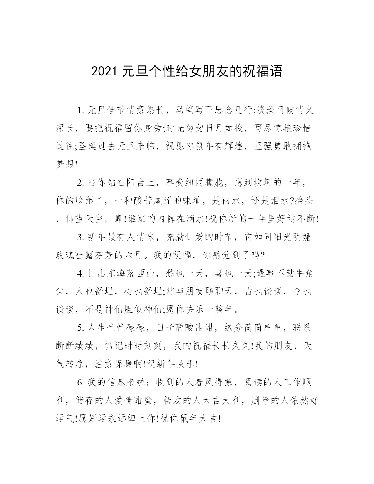 2021元旦个性给女朋友的祝福语1.元旦佳节情意悠长,动笔写下思念几行;淡淡问候情义深长,要把祝福留你身旁;时光匆匆日月如梭,写尽惊艳珍惜过往;圣诞过去元旦来临,祝愿你鼠年有辉煌,坚强勇敢拥抱梦想!2.当你站在阳台上,享受细雨朦胧,想到坎坷的一年,你的脸湿了,一种酸苦咸涩的味道,是雨水,还是泪水?抬头,仰望天空,靠!谁家的内裤在滴水!祝你新的一年里好运不断!3.新年最有人情味,充满仁爱的时节,它如同阳光明媚玫瑰吐露芬芳的六月。我的祝福,你感觉到了吗?4.日出东海落西山,愁也一天,喜也一天;遇事不钻牛角尖,人也舒坦,心也舒坦;常与朋友聊聊天,古也谈谈,今也谈谈,不是神仙胜似神仙;愿你快乐一整年。5.人生忙忙碌碌,日子酸酸甜甜,缘分简简单单,联系断断续续,惦记时时刻刻,我的祝福长长久久!我的朋友,天气转凉,注意保暖啊!祝新年快乐!6.我的信息来啦:收到的人春风得意,阅读的人工作顺利,储存的人爱情甜蜜,转发的人大吉大利,删除的人依然好运气!愿好运永远缠上你!祝你鼠年大吉!