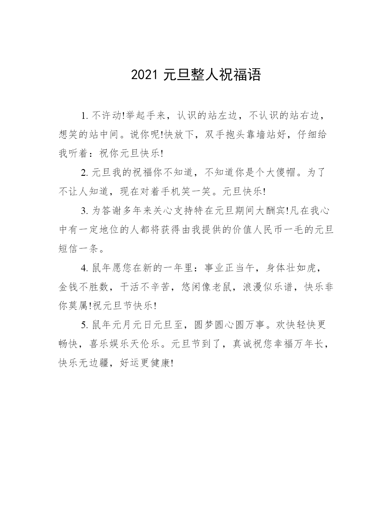 2021元旦整人祝福语1.不许动!举起手来,认识的站左边,不认识的站右边,想笑的站中间。说你呢!快放下,双手抱头靠墙站好,仔细给我听着:祝你元旦快乐!2.元旦我的祝福你不知道,不知道你是个大傻帽。为了不让人知道,现在对着手机笑一笑。元旦快乐!3.为答谢多年来关心支持特在元旦期间大酬宾!凡在我心中有一定地位的人都将获得由我提供的价值人民币一毛的元旦短信一条。4.鼠年愿您在新的一年里:事业正当午,身体壮如虎,金钱不胜数,干活不辛苦,悠闲像老鼠,浪漫似乐谱,快乐非你莫属!祝元旦节快乐!5.鼠年元月元日元旦至,圆梦圆心圆万事。欢快轻快更畅快,喜乐娱乐天伦乐。元旦节到了,真诚祝您幸福万年长,快乐无边疆,好运更健康!