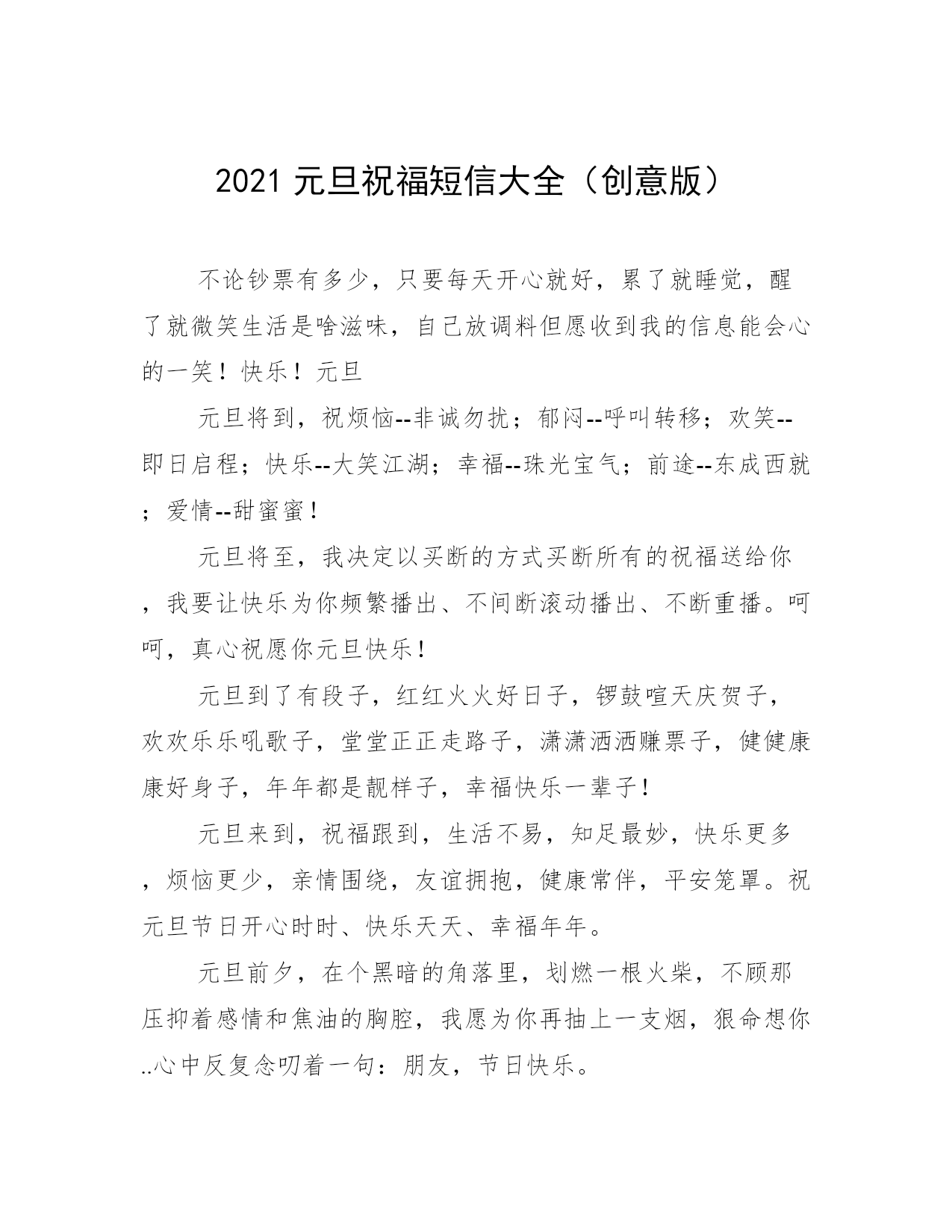 2021元旦祝福短信大全(创意版)不论钞票有多少,只要每天开心就好,累了就睡觉,醒了就微笑生活是啥滋味,自己放调料但愿收到我的信息能会心的一笑!快乐!元旦元旦将到,祝烦恼--非诚勿扰;郁闷--呼叫转移;欢笑--即日启程;快乐--大笑江湖;幸福--珠光宝气;前途--东成西就;爱情--甜蜜蜜!元旦将至,我决定以买断的方式买断所有的祝福送给你,我要让快乐为你频繁播出、不间断滚动播出、不断重播。呵呵,真心祝愿你元旦快乐!元旦到了有段子,红红火火好日子,锣鼓喧天庆贺子,欢欢乐乐吼歌子,堂堂正正走路子,潇潇洒洒赚票子,健健康康好身子,年年都是靓样子,幸福快乐一辈子!元旦来到,祝福跟到,生活不易,知足最妙,快乐更多,烦恼更少,亲情围绕,友谊拥抱,健康常伴,平安笼罩。祝元旦节日开心时时、快乐天天、幸福年年。元旦前夕,在个黑暗的角落里,划燃一根火柴,不顾那压抑着感情和焦油的胸腔,我愿为你再抽上一支烟,狠命想你..心中反复念叨着一句:朋友,节日快乐。元旦送你四尾鱼:一尾娃娃鱼,添福又添喜;一尾比目鱼,爱情甜蜜蜜;一尾美人鱼,心情好美丽;一尾金龙鱼,生活更神气。发祝福,讨口彩,年年有余哦!元旦的夜空格外亮堂,我将祝福伴随着焰火一同绽放。绿色烟花亮起,祝你健康;红色烟花亮起,祝你快乐;蓝色烟花亮起,祝你一生幸福无边!