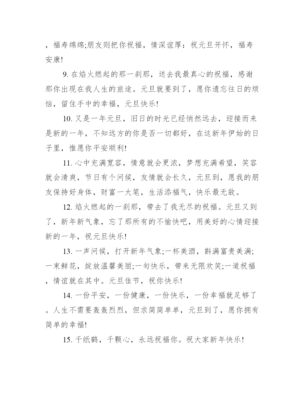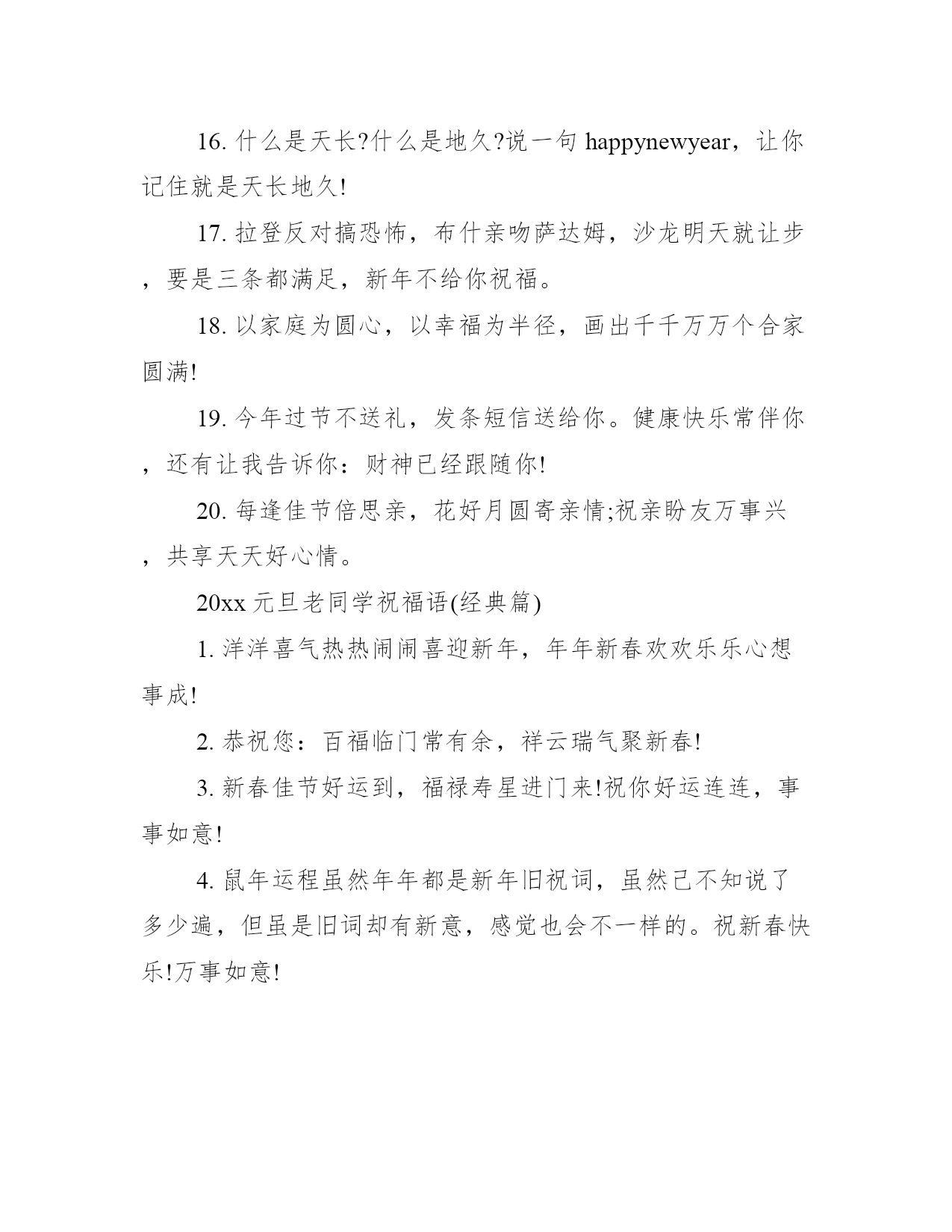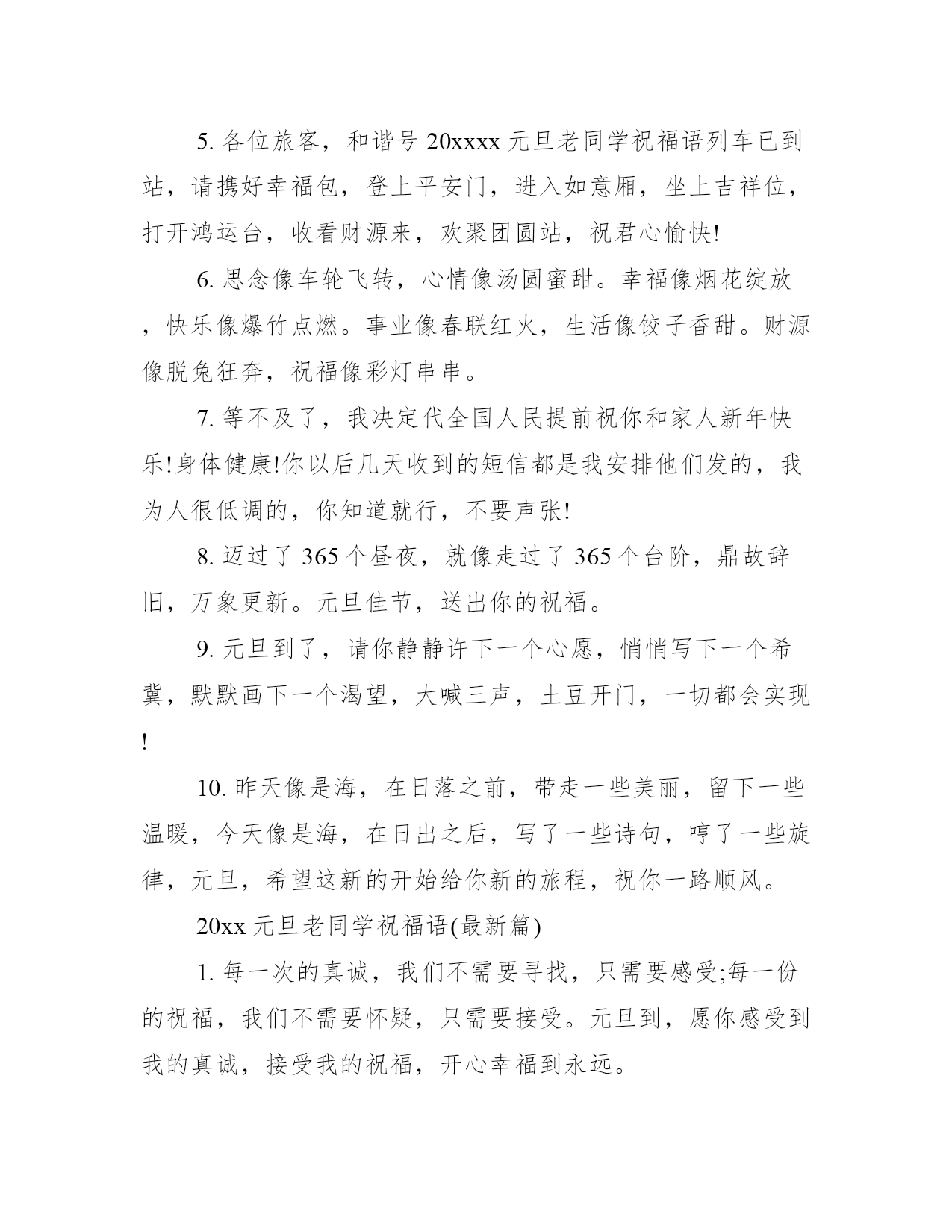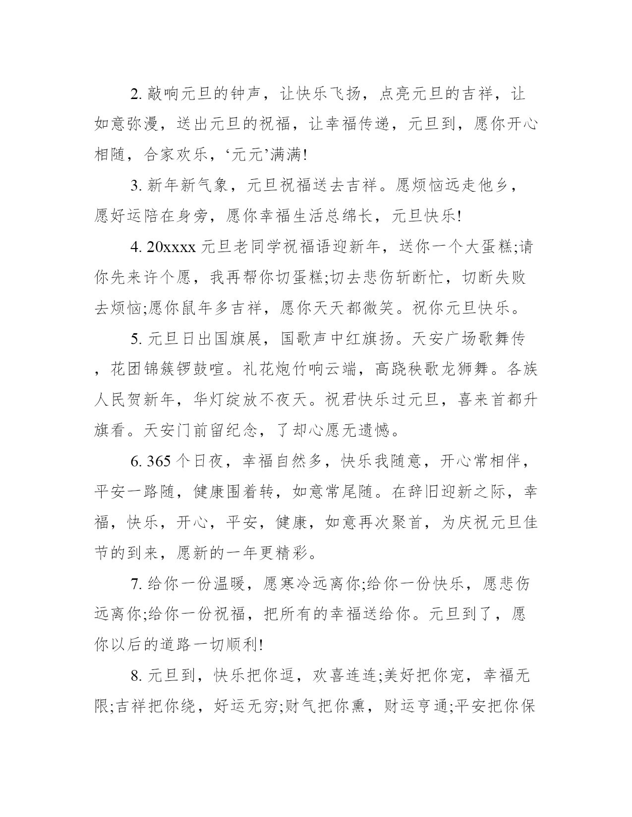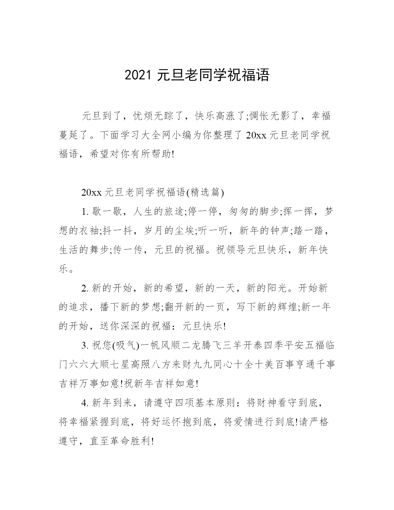 2021元旦老同学祝福语元旦到了,忧烦无踪了,快乐高涨了;惆怅无影了,幸福蔓延了。下面学习大全网小编为你整理了20xx元旦老同学祝福语,希望对你有所帮助!20xx元旦老同学祝福语(精选篇)1.歇一歇,人生的旅途;停一停,匆匆的脚步;挥一挥,梦想的衣袖;抖一抖,岁月的尘埃;听一听,新年的钟声;踏一踏,生活的舞步;传一传,元旦的祝福。祝领导元旦快乐,新年快乐。2.新的开始,新的希望,新的一天,新的阳光。开始新的追求,播下新的梦想;翻开新的一页,写下新的辉煌;新一年的开始,送你深深的祝福:元旦快乐!3.祝您(吸气)一帆风顺二龙腾飞三羊开泰四季平安五福临门六六大顺七星高照八方来财九九同心十全十美百事亨通千事吉祥万事如意!祝新年吉祥如意!4.新年到来,请遵守四项基本原则:将财神看守到底,将幸福紧握到底,将好运怀抱到底,将爱情进行到底!请严格遵守,直至革命胜利!5.各位旅客,和谐号20xxxx元旦老同学祝福语列车已到站,请携好幸福包,登上平安门,进入如意厢,坐上吉祥位,打开鸿运台,收看财源来,欢聚团圆站,祝君心愉快!6.思念像车轮飞转,心情像汤圆蜜甜。幸福像烟花绽放,快乐像爆竹点燃。事业像春联红火,生活像饺子香甜。财源像脱兔狂奔,祝福像彩灯串串。7.等不及了,我决定代全国人民提前祝你和家人新年快乐!身体健康!你以后几天收到的短信都是我安排他们发的,我为人很低调的,你知道就行,不要声张!8.迈过了365个昼夜,就像走过了365个台阶,鼎故辞旧,万象更新。元旦佳节,送出你的祝福。9.元旦到了,请你静静许下一个心愿,悄悄写下一个希冀,默默画下一个渴望,大喊三声,土豆开门,一切都会实现!10.昨天像是海,在日落之前,带走一些美丽,留下一些温暖,今天像是海,在日出之后,写了一些诗句,哼了一些旋律,元旦,希望这新的开始给你新的旅程,祝你一路顺风。20xx元旦老同学祝福语(最新篇)1.每一次的真诚,我们不需要寻找,只需要感受;每一份的祝福,我们不需要怀疑,只需要接受。元旦到,愿你感受到我的真诚,接受我的祝福,开心幸福到永远。2.敲响元旦的钟声,让快乐飞扬,点亮元旦的吉祥,让如意弥漫,送出元旦的祝福,让幸福传递,元旦到,愿你开心相随,合家欢乐,‘元元’满满!3.新年新气象,元旦祝福送去吉祥。愿烦恼远走他乡,愿好运陪在身旁,愿你幸福生活总绵长,元旦快乐!4.20xxxx元旦老同学祝福语迎新年,送你一个大蛋糕;请你先来许个愿,我再帮你切蛋糕;切去悲伤斩断忙,切断失败去烦恼;愿你鼠年多吉祥,愿你天天都微笑。祝你元旦快乐。5.元旦日出国旗展,国歌声中红旗扬。天安广场歌舞传,花团锦簇锣鼓喧。礼花炮竹响云端,高跷秧歌龙狮舞。各族人民贺新年,华灯绽放不夜天。祝君快乐过元旦,喜来首都升旗看。天安门前留纪念,了却心愿无遗憾。6.365个日夜,幸福自然多,快乐我随意,开心常相伴,平安一路随,健康围着转,如意常尾随。在辞旧迎新之际,幸福,快乐,开心,平安,健康,如意再次聚首,为庆祝元旦佳节的到来,愿新的一年更精彩。7.给你一份温暖,愿寒冷远离你;给你一份快乐,愿悲伤远离你;给你一份祝福,把所有的幸福送给你。元旦到了,愿你以后的道路一切顺利!8.元旦到,快乐把你逗,欢喜连连;美好把你宠,幸福无限;吉祥把你绕,好运无穷;财气把你熏,财运亨通;平安把你保,福寿绵绵;朋友则把你祝福,情深谊厚:祝元旦开怀,福寿安康!9.在焰火燃起的那一刹那,送去我最真心的祝福,感谢那你出现在我人生的旅途。元旦就要到了,愿你遗忘往日的烦恼,留住手中的幸福,元旦快乐!10.又是一年元旦,旧日的时光已经悄然远去,迎接而来是新的一年,不知远方的你是否一切都好,在这新年伊始的日子里,惟愿你平安顺利!11.心中充满宽容,情意就会更浓,梦想充满希望,笑容就会清爽,节日有个问候,友情就会长久,元旦到,愿我的朋友保持好身体,财富一大笔,生活添福气,快乐最无敌。12.焰火燃起的一刹那,带去了我无尽的祝福。元旦又到了,新年新气象,忘了那所有的不愉快吧,用美好的心情迎接新的一年,祝元旦快乐!13.一声问候,打开新年气象;一杯美酒,斟满富贵美满;一束鲜花,绽放温馨美丽;一句快乐,带来无限欢笑;一道祝福,情谊就在其中。元旦佳节,祝你快乐!14.一份平安,一份健康,一份快乐,一份幸福就足够了。人生不需要轰轰烈烈,但求简简单单,元旦到了,愿你拥有简单的幸福!15.千纸鹤,千颗心,永远祝福你。祝大家新年快乐!16.什么是天长?什么是地久?说一句happynewyear,让你记住就是天长地久!17.拉登反对搞恐怖,布什亲吻萨达姆,沙龙明天就让步,要是三条都满足,新年不给你祝福。18.以家庭为圆心,以幸福为半径,画出千千万万个合家圆满!19.今年过节不送礼,发条短信送给你。健康快乐常伴你,还有让我告诉你:财神已经跟随你!20.每逢佳节倍思