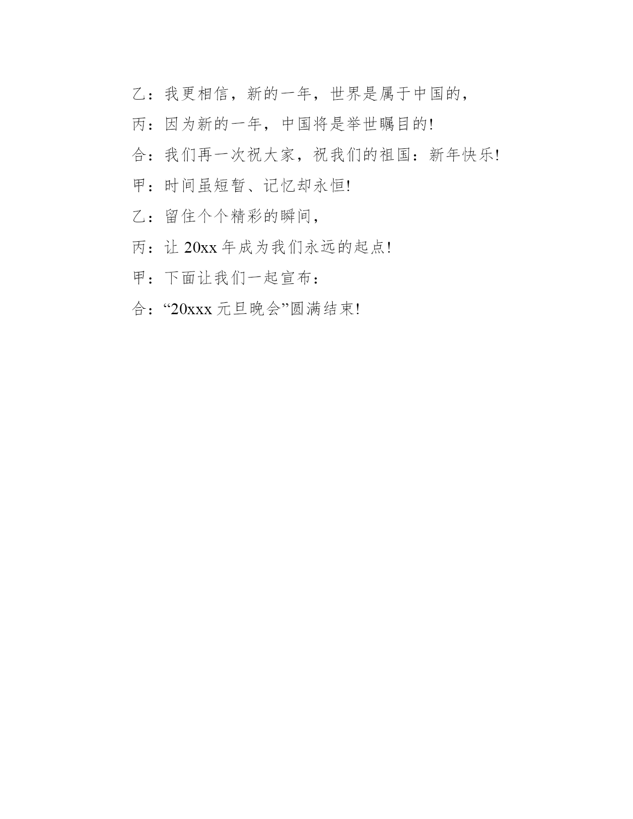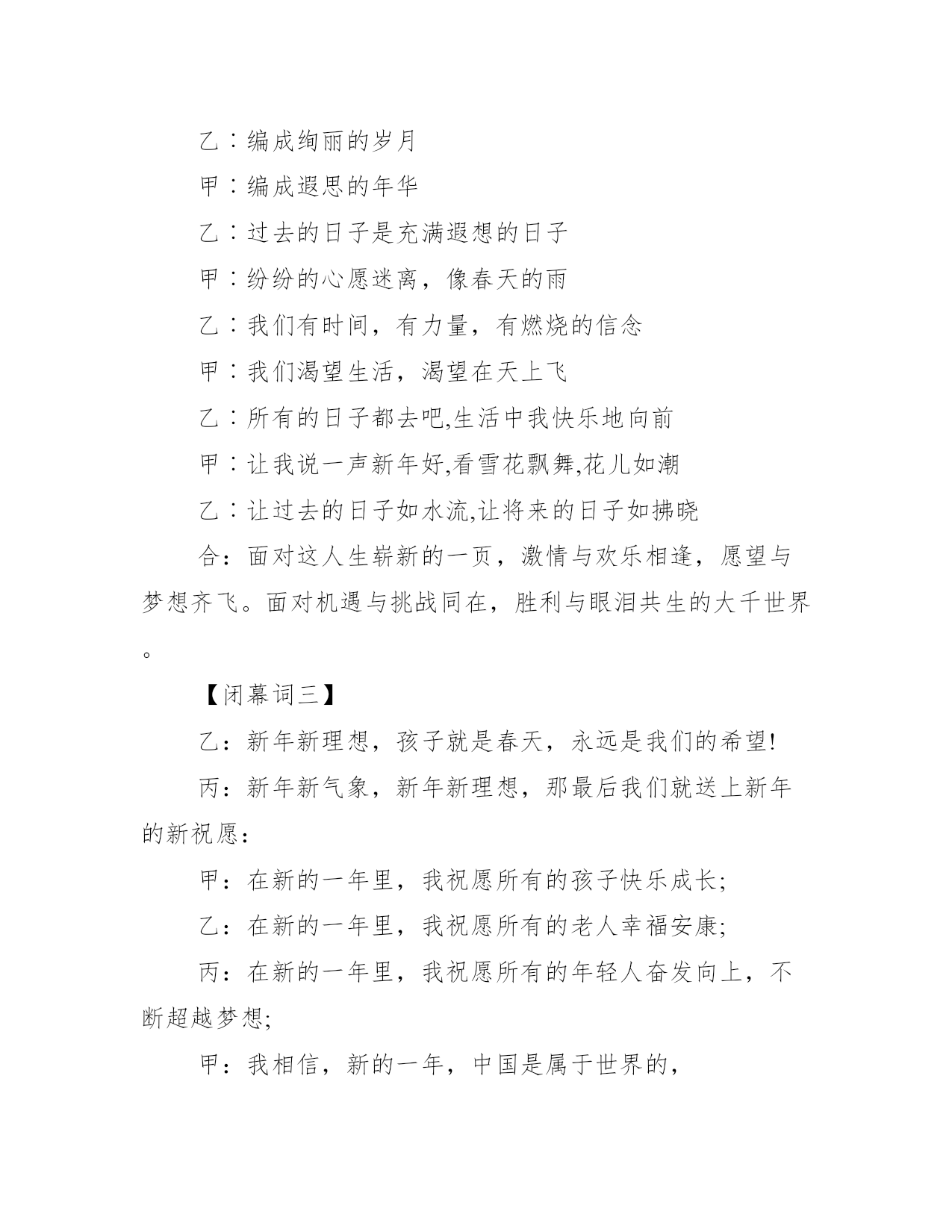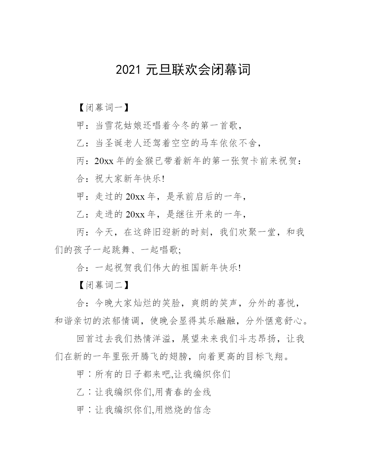 2021元旦联欢会闭幕词【闭幕词一】甲:当雪花姑娘还唱着今冬的第一首歌,乙:当圣诞老人还驾着空空的马车依依不舍,丙:20xx年的金猴已带着新年的第一张贺卡前来祝贺:合:祝大家新年快乐!甲:走过的20xx年,是承前启后的一年,乙:走进的20xx年,是继往开来的一年,丙:今天,在这辞旧迎新的时刻,我们欢聚一堂,和我们的孩子一起跳舞、一起唱歌;合:一起祝贺我们伟大的祖国新年快乐!【闭幕词二】合:今晚大家灿烂的笑脸,爽朗的笑声,分外的喜悦,和谐亲切的浓郁情调,使晚会显得其乐融融,分外惬意舒心。回首过去我们热情洋溢,展望未来我们斗志昂扬,让我们在新的一年里张开腾飞的翅膀,向着更高的目标飞翔。甲︰所有的日子都来吧,让我编织你们乙︰让我编织你们,用青春的金线甲︰让我编织你们,用燃烧的信念乙︰编成绚丽的岁月甲︰编成遐思的年华乙︰过去的日子是充满遐想的日子甲︰纷纷的心愿迷离,像春天的雨乙︰我们有时间,有力量,有燃烧的信念甲︰我们渴望生活,渴望在天上飞乙︰所有的日子都去吧,生活中我快乐地向前甲︰让我说一声新年好,看雪花飘舞,花儿如潮乙︰让过去的日子如水流,让将来的日子如拂晓合:面对这人生崭新的一页,激情与欢乐相逢,愿望与梦想齐飞。面对机遇与挑战同在,胜利与眼泪共生的大千世界。【闭幕词三】乙:新年新理想,孩子就是春天,永远是我们的希望!丙:新年新气象,新年新理想,那最后我们就送上新年的新祝愿:甲:在新的一年里,我祝愿所有的孩子快乐成长;乙:在新的一年里,我祝愿所有的老人幸福安康;丙:在新的一年里,我祝愿所有的年轻人奋发向上,不断超越梦想;甲:我相信,新的一年,中国是属于世界的,乙:我更相信,新的一年,世界是属于中国的,丙:因为新的一年,中国将是举世瞩目的!合:我们再一次祝大家,祝我们的祖国:新年快乐!甲:时间虽短暂、记忆却永恒!乙:留住个个精彩的瞬间,丙:让20xx年成为我们永远的起点!甲:下面让我们一起宣布:合:“20xxx元旦晚会”圆满结束!