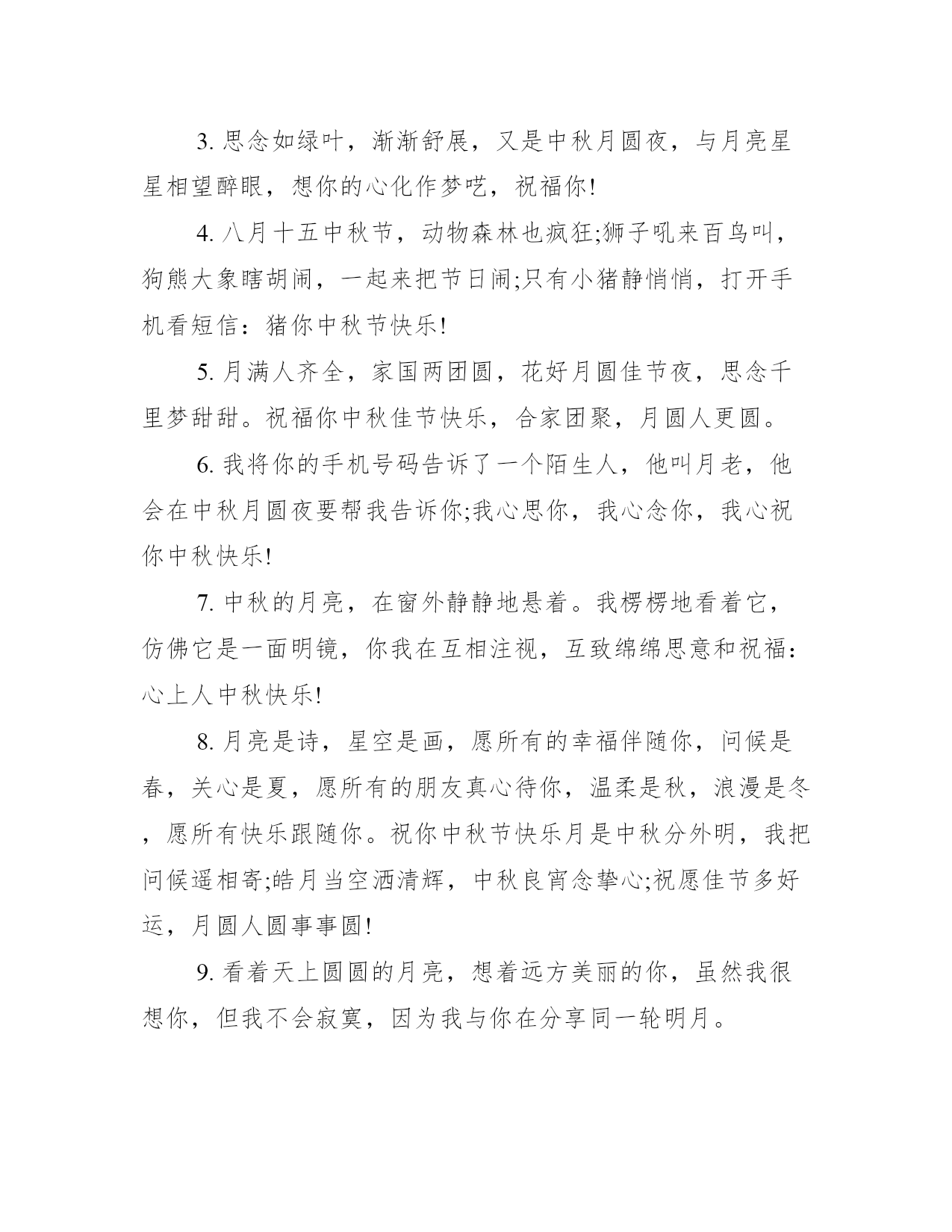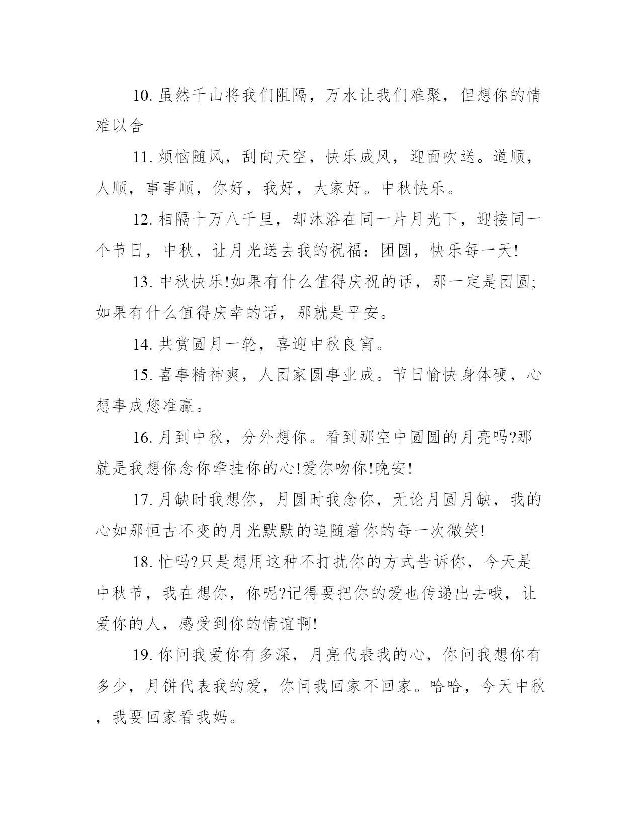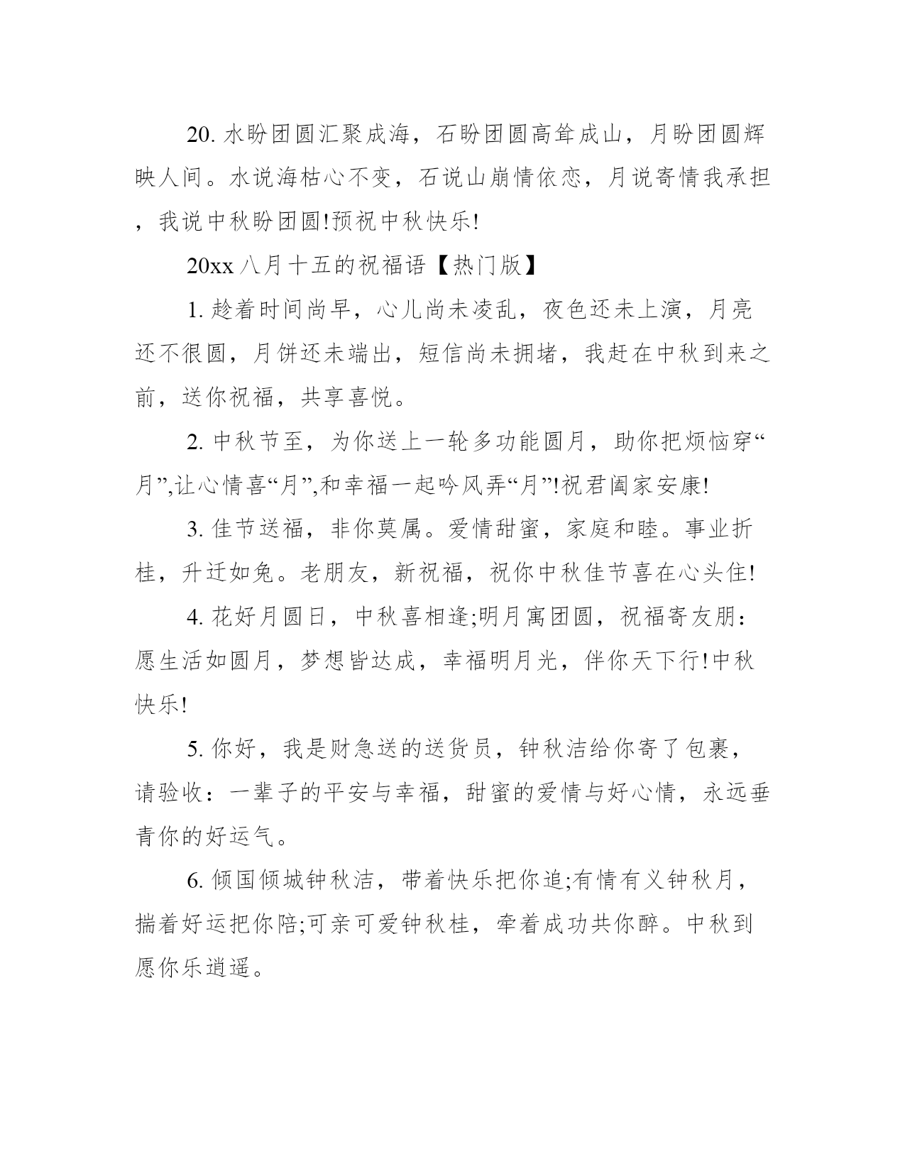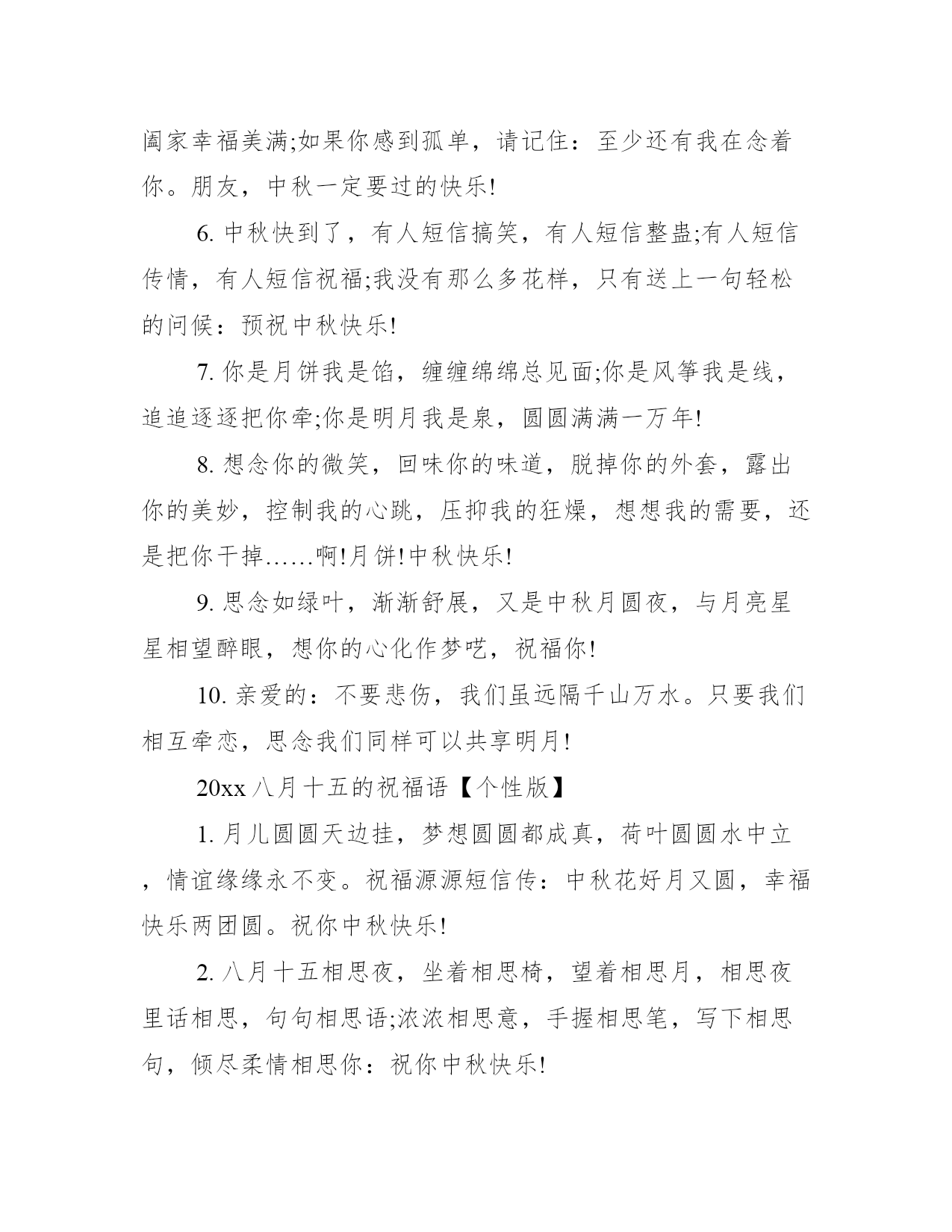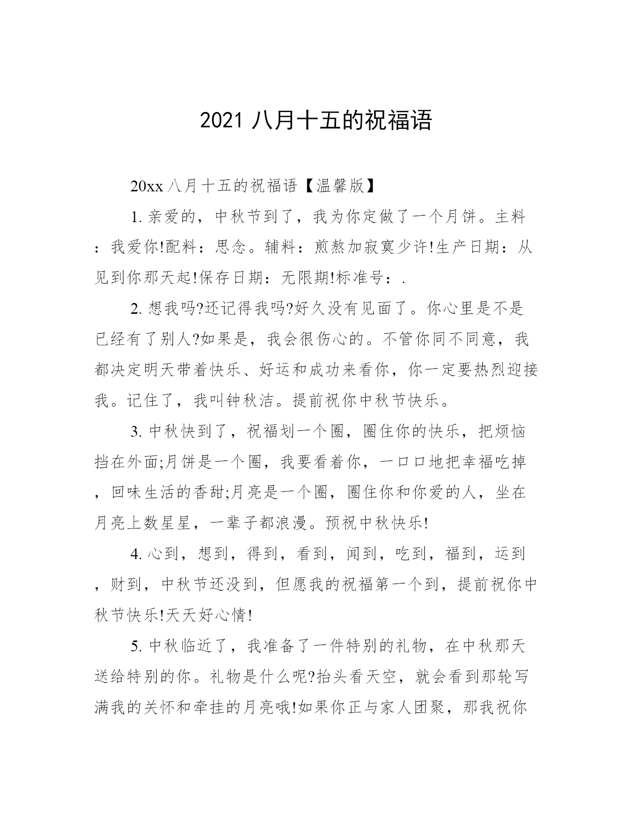 2021八月十五的祝福语20xx八月十五的祝福语【温馨版】1.亲爱的,中秋节到了,我为你定做了一个月饼。主料:我爱你!配料:思念。辅料:煎熬加寂寞少许!生产日期:从见到你那天起!保存日期:无限期!标准号:.2.想我吗?还记得我吗?好久没有见面了。你心里是不是已经有了别人?如果是,我会很伤心的。不管你同不同意,我都决定明天带着快乐、好运和成功来看你,你一定要热烈迎接我。记住了,我叫钟秋洁。提前祝你中秋节快乐。3.中秋快到了,祝福划一个圈,圈住你的快乐,把烦恼挡在外面;月饼是一个圈,我要看着你,一口口地把幸福吃掉,回味生活的香甜;月亮是一个圈,圈住你和你爱的人,坐在月亮上数星星,一辈子都浪漫。预祝中秋快乐!4.心到,想到,得到,看到,闻到,吃到,福到,运到,财到,中秋节还没到,但愿我的祝福第一个到,提前祝你中秋节快乐!天天好心情!5.中秋临近了,我准备了一件特别的礼物,在中秋那天送给特别的你。礼物是什么呢?抬头看天空,就会看到那轮写满我的关怀和牵挂的月亮哦!如果你正与家人团聚,那我祝你阖家幸福美满;如果你感到孤单,请记住:至少还有我在念着你。朋友,中秋一定要过的快乐!6.中秋快到了,有人短信搞笑,有人短信整蛊;有人短信传情,有人短信祝福;我没有那么多花样,只有送上一句轻松的问候:预祝中秋快乐!7.你是月饼我是馅,缠缠绵绵总见面;你是风筝我是线,追追逐逐把你牵;你是明月我是泉,圆圆满满一万年!8.想念你的微笑,回味你的味道,脱掉你的外套,露出你的美妙,控制我的心跳,压抑我的狂燥,想想我的需要,还是把你干掉……啊!月饼!中秋快乐!9.思念如绿叶,渐渐舒展,又是中秋月圆夜,与月亮星星相望醉眼,想你的心化作梦呓,祝福你!10.亲爱的:不要悲伤,我们虽远隔千山万水。只要我们相互牵恋,思念我们同样可以共享明月!20xx八月十五的祝福语【个性版】1.月儿圆圆天边挂,梦想圆圆都成真,荷叶圆圆水中立,情谊缘缘永不变。祝福源源短信传:中秋花好月又圆,幸福快乐两团圆。祝你中秋快乐!2.八月十五相思夜,坐着相思椅,望着相思月,相思夜里话相思,句句相思语;浓浓相思意,手握相思笔,写下相思句,倾尽柔情相思你:祝你中秋快乐!3.思念如绿叶,渐渐舒展,又是中秋月圆夜,与月亮星星相望醉眼,想你的心化作梦呓,祝福你!4.八月十五中秋节,动物森林也疯狂;狮子吼来百鸟叫,狗熊大象瞎胡闹,一起来把节日闹;只有小猪静悄悄,打开手机看短信:猪你中秋节快乐!5.月满人齐全,家国两团圆,花好月圆佳节夜,思念千里梦甜甜。祝福你中秋佳节快乐,合家团聚,月圆人更圆。6.我将你的手机号码告诉了一个陌生人,他叫月老,他会在中秋月圆夜要帮我告诉你;我心思你,我心念你,我心祝你中秋快乐!7.中秋的月亮,在窗外静静地悬着。我楞楞地看着它,仿佛它是一面明镜,你我在互相注视,互致绵绵思意和祝福:心上人中秋快乐!8.月亮是诗,星空是画,愿所有的幸福伴随你,问候是春,关心是夏,愿所有的朋友真心待你,温柔是秋,浪漫是冬,愿所有快乐跟随你。祝你中秋节快乐月是中秋分外明,我把问候遥相寄;皓月当空洒清辉,中秋良宵念挚心;祝愿佳节多好运,月圆人圆事事圆!9.看着天上圆圆的月亮,想着远方美丽的你,虽然我很想你,但我不会寂寞,因为我与你在分享同一轮明月。10.虽然千山将我们阻隔,万水让我们难聚,但想你的情难以舍11.烦恼随风,刮向天空,快乐成风,迎面吹送。道顺,人顺,事事顺,你好,我好,大家好。中秋快乐。12.相隔十万八千里,却沐浴在同一片月光下,迎接同一个节日,中秋,让月光送去我的祝福:团圆,快乐每一天!13.中秋快乐!如果有什么值得庆祝的话,那一定是团圆;如果有什么值得庆幸的话,那就是平安。14.共赏圆月一轮,喜迎中秋良宵。15.喜事精神爽,人团家圆事业成。节日愉快身体硬,心想事成您准赢。16.月到中秋,分外想你。看到那空中圆圆的月亮吗?那就是我想你念你牵挂你的心!爱你吻你!晚安!17.月缺时我想你,月圆时我念你,无论月圆月缺,我的心如那恒古不变的月光默默的追随着你的每一次微笑!18.忙吗?只是想用这种不打扰你的方式告诉你,今天是中秋节,我在想你,你呢?记得要把你的爱也传递出去哦,让爱你的人,感受到你的情谊啊!19.你问我爱你有多深,月亮代表我的心,你问我想你有多少,月饼代表我的爱,你问我回家不回家。哈哈,今天中秋,我要回家看我妈。20.水盼团圆汇聚成海,石盼团圆高耸成山,月盼团圆辉映人间。水说海枯心不变,石说山崩情依恋,月说寄情我承担,我说中秋盼团圆!预祝中秋快乐!20xx八月十五的祝福语【热门版】1.趁着时间尚早,心儿尚未凌乱,夜色还未上演,月亮还不很圆,月饼还未端出,短信尚未拥堵,我赶在中秋到来之前,送你祝福,共享喜悦。2.中秋节至,为你送上一轮多功能圆月,助你把烦恼穿“月”,让心情喜“月”,和幸福一起吟风