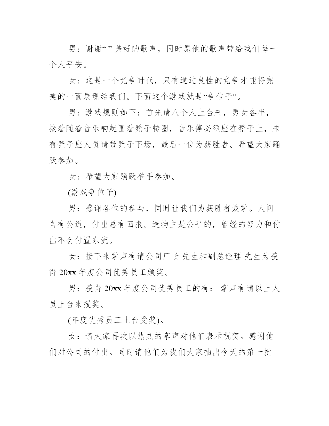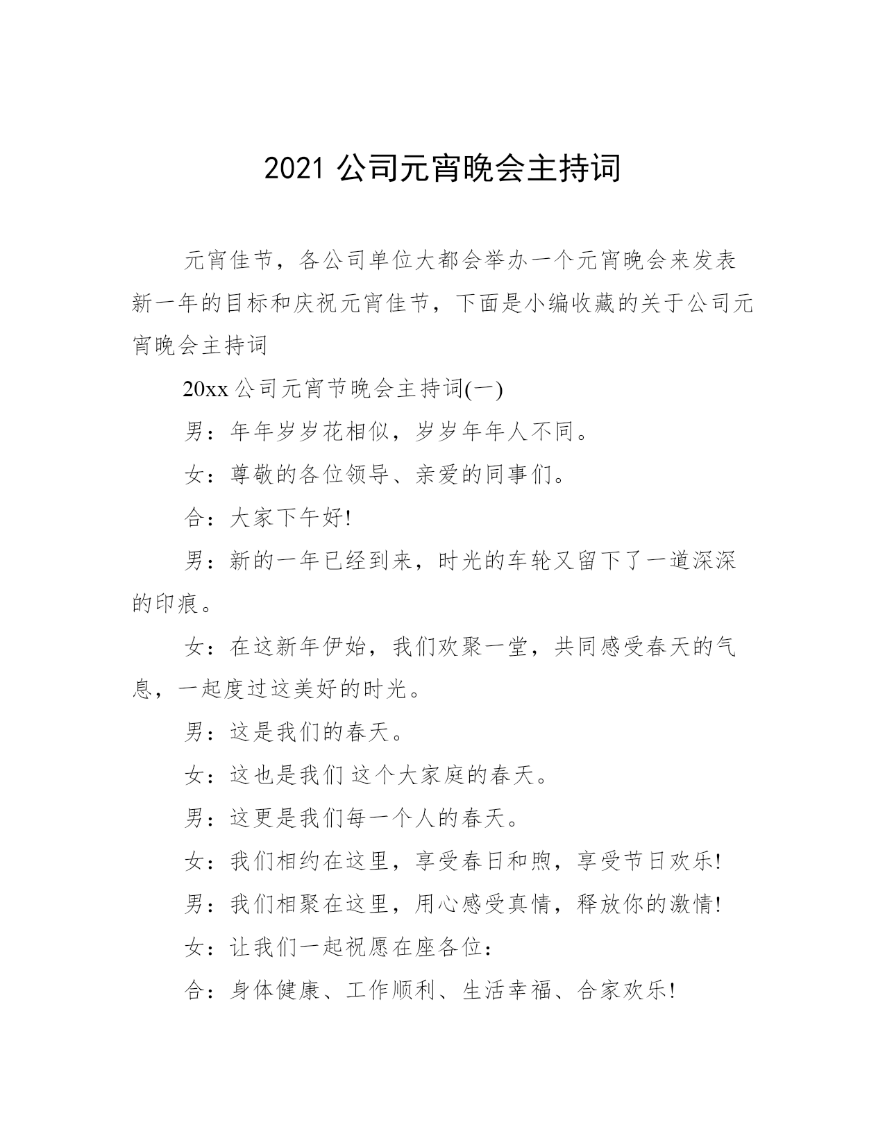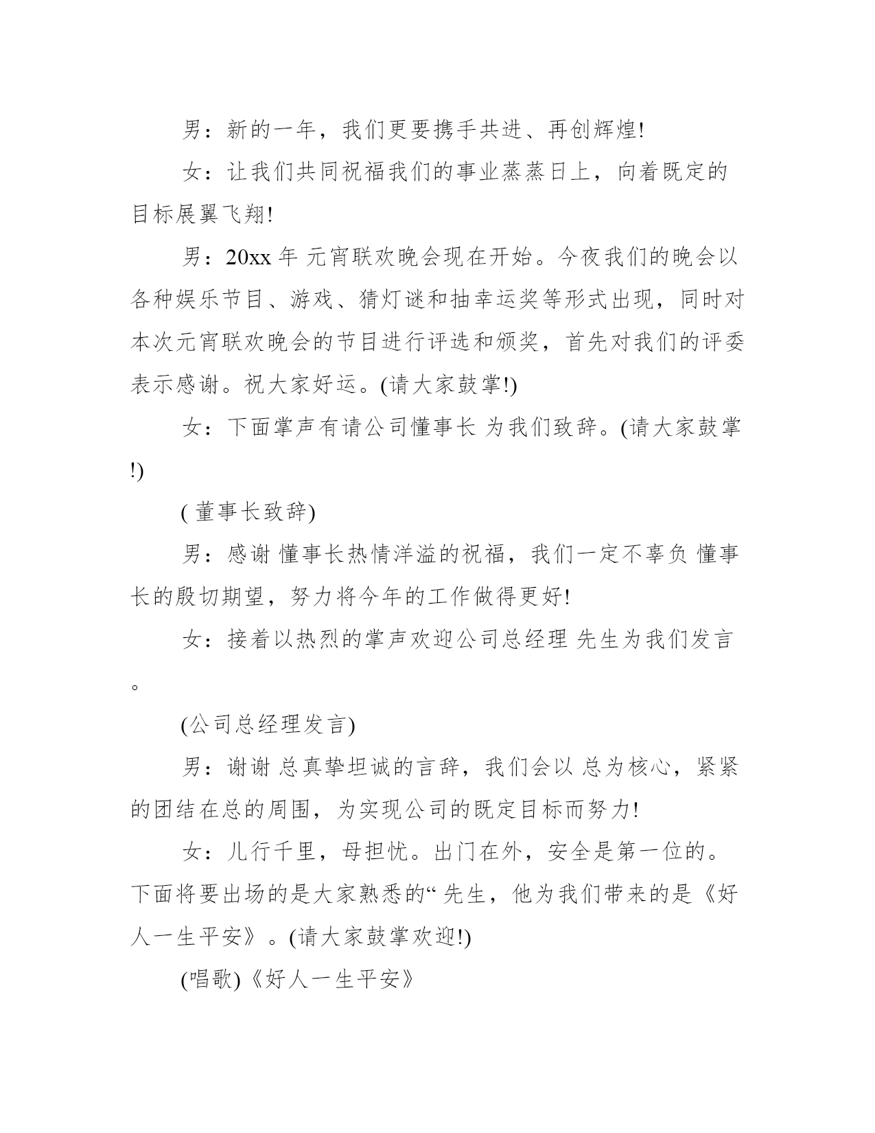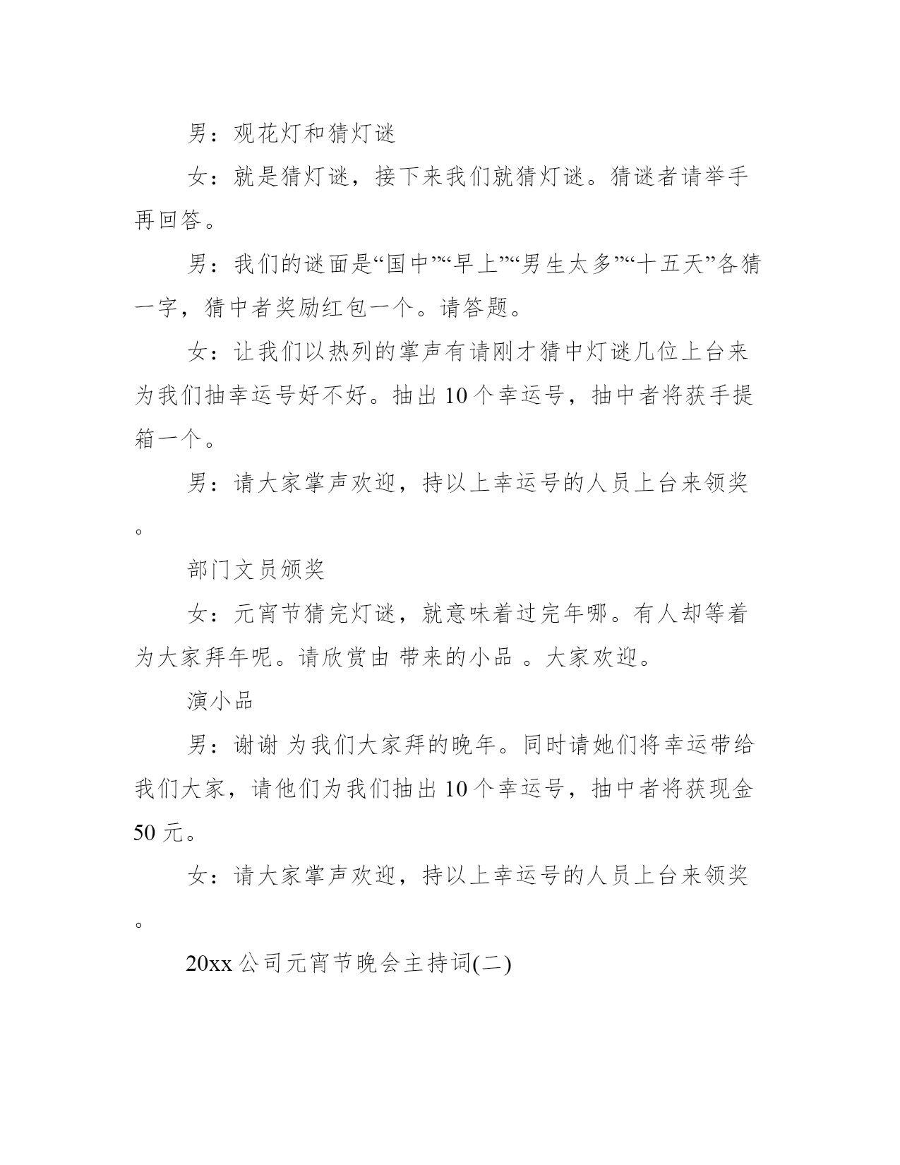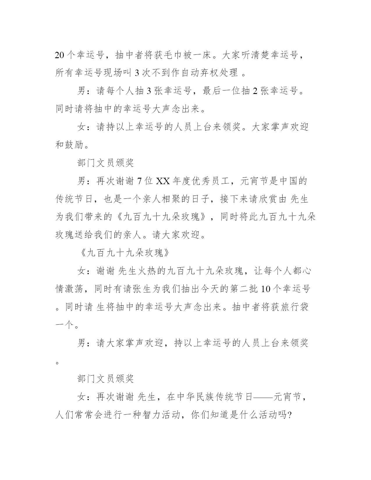 2021公司元宵晚会主持词元宵佳节,各公司单位大都会举办一个元宵晚会来发表新一年的目标和庆祝元宵佳节,下面是小编收藏的关于公司元宵晚会主持词20xx公司元宵节晚会主持词(一)男:年年岁岁花相似,岁岁年年人不同。女:尊敬的各位领导、亲爱的同事们。合:大家下午好!男:新的一年已经到来,时光的车轮又留下了一道深深的印痕。女:在这新年伊始,我们欢聚一堂,共同感受春天的气息,一起度过这美好的时光。男:这是我们的春天。女:这也是我们这个大家庭的春天。男:这更是我们每一个人的春天。女:我们相约在这里,享受春日和煦,享受节日欢乐!男:我们相聚在这里,用心感受真情,释放你的激情!女:让我们一起祝愿在座各位:合:身体健康、工作顺利、生活幸福、合家欢乐!男:新的一年,我们更要携手共进、再创辉煌!女:让我们共同祝福我们的事业蒸蒸日上,向着既定的目标展翼飞翔!男:20xx年元宵联欢晚会现在开始。今夜我们的晚会以各种娱乐节目、游戏、猜灯谜和抽幸运奖等形式出现,同时对本次元宵联欢晚会的节目进行评选和颁奖,首先对我们的评委表示感谢。祝大家好运。(请大家鼓掌!)女:下面掌声有请公司懂事长为我们致辞。(请大家鼓掌!)(董事长致辞)男:感谢懂事长热情洋溢的祝福,我们一定不辜负懂事长的殷切期望,努力将今年的工作做得更好!女:接着以热烈的掌声欢迎公司总经理先生为我们发言。(公司总经理发言)男:谢谢总真挚坦诚的言辞,我们会以总为核心,紧紧的团结在总的周围,为实现公司的既定目标而努力!女:儿行千里,母担忧。出门在外,安全是第一位的。下面将要出场的是大家熟悉的“先生,他为我们带来的是《好人一生平安》。(请大家鼓掌欢迎!)(唱歌)《好人一生平安》男:谢谢“”美好的歌声,同时愿他的歌声带给我们每一个人平安。女:这是一个竞争时代,只有通过良性的竞争才能将完美的一面展现给我们。下面这个游戏就是“争位子”。男:游戏规则如下:首先请八个人上台来,男女各半,接着随着音乐响起围着凳子转圈,音乐停必须座在凳子上,未有凳子座人员请带凳子下场,最后一位为获胜者。希望大家踊跃参加。女:希望大家踊跃举手参加。(游戏争位子)男:感谢各位的参与,同时让我们为获胜者鼓掌。人间自有公道,付出总有回报。造物主是公平的,曾经的努力和付出不会付置东流。女:接下来掌声有请公司厂长先生和副总经理先生为获得20xx年度公司优秀员工颁奖。男:获得20xx年度公司优秀员工的有:掌声有请以上人员上台来授奖。(年度优秀员工上台受奖)。女:请大家再次以热烈的掌声对他们表示祝贺。感谢他们对公司的付出。同时请他们为我们大家抽出今天的第一批20个幸运号,抽中者将获毛巾被一床。大家听清楚幸运号,所有幸运号现场叫3次不到作自动弃权处理。男:请每个人抽3张幸运号,最后一位抽2张幸运号。同时请将抽中的幸运号大声念出来。女:请持以上幸运号的人员上台来领奖。大家掌声欢迎和鼓励。部门文员颁奖男:再次谢谢7位XX年度优秀员工,元宵节是中国的传统节日,也是一个亲人相聚的日子,接下来请欣赏由先生为我们带来的《九百九十九朵玫瑰》,同时将此九百九十九朵玫瑰送给我们的亲人。请大家欢迎。《九百九十九朵玫瑰》女:谢谢先生火热的九百九十九朵玫瑰,让每个人都心情激荡,同时有请张生为我们抽出今天的第二批10个幸运号。同时请生将抽中的幸运号大声念出来。抽中者将获旅行袋一个。男:请大家掌声欢迎,持以上幸运号的人员上台来领奖。部门文员颁奖女:再次谢谢先生,在中华民族传统节日——元宵节,人们常常会进行一种智力活动,你们知道是什么活动吗?男:观花灯和猜灯谜女:就是猜灯谜,接下来我们就猜灯谜。猜谜者请举手再回答。男:我们的谜面是“国中”“早上”“男生太多”“十五天”各猜一字,猜中者奖励红包一个。请答题。女:让我们以热列的掌声有请刚才猜中灯谜几位上台来为我们抽幸运号好不好。抽出10个幸运号,抽中者将获手提箱一个。男:请大家掌声欢迎,持以上幸运号的人员上台来领奖。部门文员颁奖女:元宵节猜完灯谜,就意味着过完年哪。有人却等着为大家拜年呢。请欣赏由带来的小品。大家欢迎。演小品男:谢谢为我们大家拜的晚年。同时请她们将幸运带给我们大家,请他们为我们抽出10个幸运号,抽中者将获现金50元。女:请大家掌声欢迎,持以上幸运号的人员上台来领奖。20xx公司元宵节晚会主持词(二)男:今天是中国传统的元宵佳节,我们全局职工家属欢聚一堂,载歌载舞共庆这盛世佳节。在节目开始之际,让我们以最热烈的掌声请出我们的易泽茂局长向晚会的全体来宾致辞,掌声有请!男:尊敬的各位领导、各位来宾。女:全局职工、家属、离退休的同志们。合:大家晚上好!男:春光明盛世;女:金牛闹元宵。男:在这个吉灯高照团圆的日子,我们欢聚一堂、载歌载舞女:在这个万盏花灯美丽的夜晚,我们激情满怀、心潮澎湃男:首先请允许我们两位节目主持人代表这次的活动