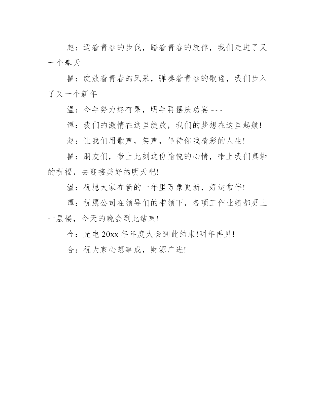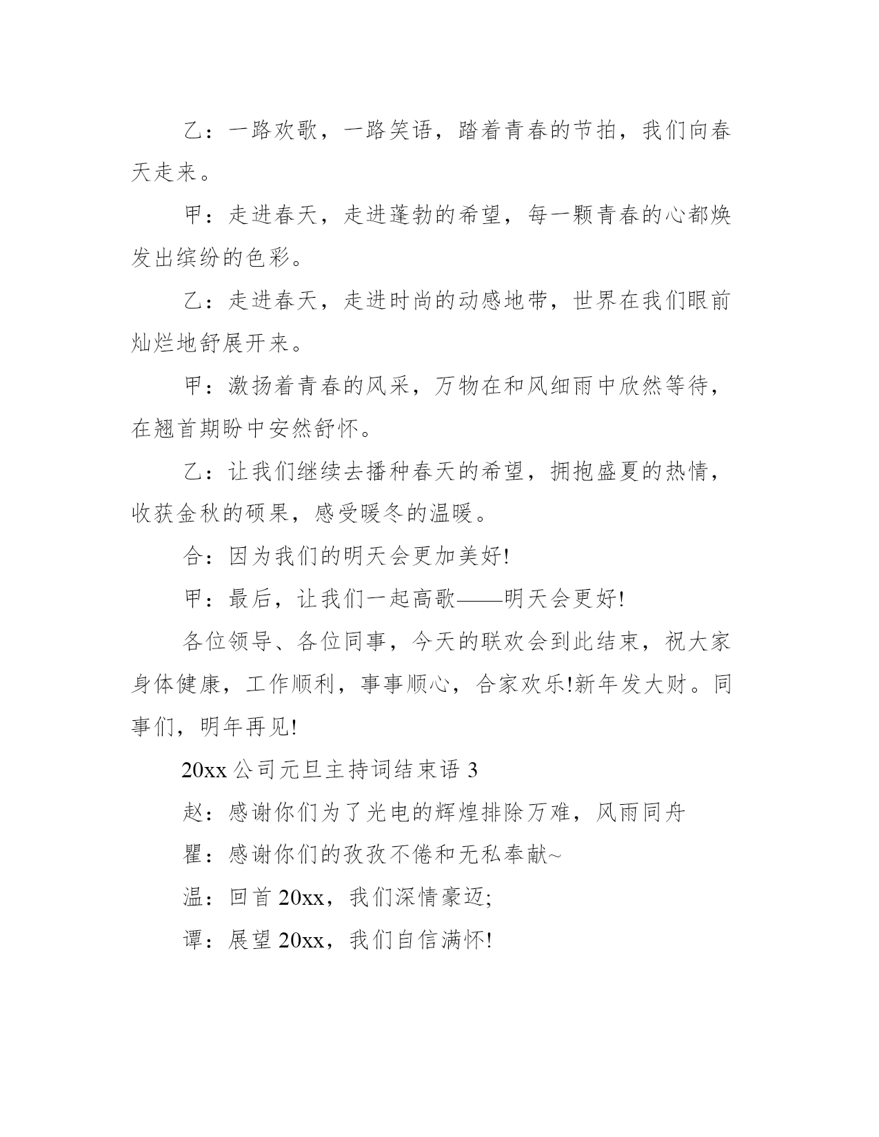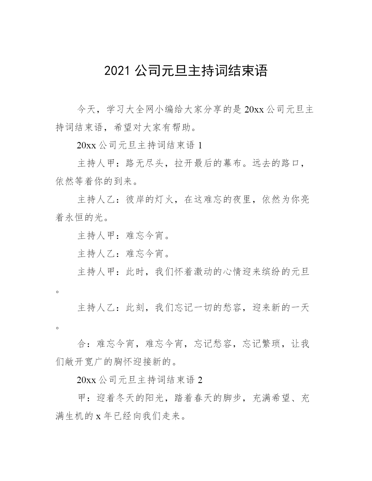 2021公司元旦主持词结束语今天,学习大全网小编给大家分享的是20xx公司元旦主持词结束语,希望对大家有帮助。20xx公司元旦主持词结束语1主持人甲:路无尽头,拉开最后的幕布。远去的路口,依然等着你的到来。主持人乙:彼岸的灯火,在这难忘的夜里,依然为你亮着永恒的光。主持人甲:难忘今宵。主持人乙:难忘今宵。主持人甲:此时,我们怀着激动的心情迎来缤纷的元旦。主持人乙:此刻,我们忘记一切的愁容,迎来新的一天。合:难忘今宵,难忘今宵,忘记愁容,忘记繁琐,让我们敞开宽广的胸怀迎接新的。20xx公司元旦主持词结束语2甲:迎着冬天的阳光,踏着春天的脚步,充满希望、充满生机的x年已经向我们走来。乙:一路欢歌,一路笑语,踏着青春的节拍,我们向春天走来。甲:走进春天,走进蓬勃的希望,每一颗青春的心都焕发出缤纷的色彩。乙:走进春天,走进时尚的动感地带,世界在我们眼前灿烂地舒展开来。甲:激扬着青春的风采,万物在和风细雨中欣然等待,在翘首期盼中安然舒怀。乙:让我们继续去播种春天的希望,拥抱盛夏的热情,收获金秋的硕果,感受暖冬的温暖。合:因为我们的明天会更加美好!甲:最后,让我们一起高歌——明天会更好!各位领导、各位同事,今天的联欢会到此结束,祝大家身体健康,工作顺利,事事顺心,合家欢乐!新年发大财。同事们,明年再见!20xx公司元旦主持词结束语3赵:感谢你们为了光电的辉煌排除万难,风雨同舟瞿:感谢你们的孜孜不倦和无私奉献~温:回首20xx,我们深情豪迈;谭:展望20xx,我们自信满怀!赵:迈着青春的步伐,踏着青春的旋律,我们走进了又一个春天瞿:绽放着青春的风采,弹奏着青春的歌谣,我们步入了又一个新年温:今年努力终有果,明年再摆庆功宴~~~谭:我们的激情在这里绽放,我们的梦想在这里起航!赵:让我们用歌声,笑声,等待你我精彩的人生!瞿:朋友们,带上此刻这份愉悦的心情,带上我们真挚的祝福,去迎接美好的明天吧!温:祝愿大家在新的一年里万象更新,好运常伴!谭:祝愿公司在领导们的带领下,各项工作业绩都更上一层楼,今天的晚会到此结束!合:光电20xx年年度大会到此结束!明年再见!合:祝大家心想事成,财源广进!