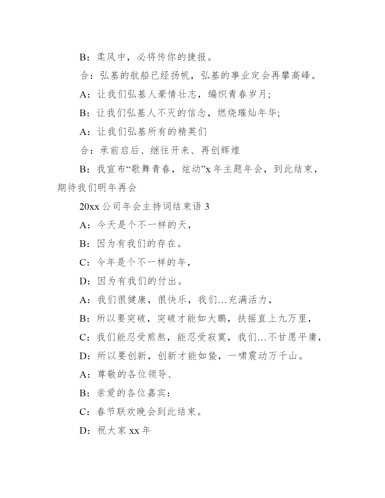 2021公司年会主持词结束语晚会的结束语起到了画龙点睛之意,那么,下面是小编给大家整理收集的20xx公司年会主持词结束语,供大家阅读参考。20xx公司年会主持词结束语1(许)新年难忘,难忘新年!主持词大全(张)新的一年孕育着新的希望,新的征程将谱写新的辉煌。(许)新的一年,我们的航船已经起锚(张)明天,不管经历怎样的风浪,我们到达理想彼岸的信心不变。(许)愿新年的钟声带给我们吉祥如意(张)愿xx年的祥瑞带给我们幸福平安(许)最后,祝大家新年快乐,万事如意!(合)北京*20xx年春节联欢晚会到此结束!明年见!(挥手)20xx公司年会主持词结束语2A:阳光中,我会为你祝福;B:月光下,我会为你祈祷;A:细雨中,必定有你的收获;B:柔风中,必将传你的捷报。合:弘基的航船已经扬帆,弘基的事业定会再攀高峰。A:让我们弘基人豪情壮志,编织青春岁月;B:让我们弘基人不灭的信念,燃烧璀灿年华;A:让我们弘基所有的精英们合:承前启后、继往开来、再创辉煌B:我宣布“歌舞青春,炫动”x年主题年会,到此结束,期待我们明年再会20xx公司年会主持词结束语3A:今天是个不一样的天,B:因为有我们的存在。C:今年是个不一样的年,D:因为有我们的付出。A:我们很健康,很快乐,我们…充满活力,B:所以要突破,突破才能如大鹏,扶摇直上九万里,C:我们能忍受煎熬,能忍受寂寞,我们…不甘愿平庸,D:所以要创新,创新才能如蛰,一啸震动万千山。A:尊敬的各位领导、B:亲爱的各位嘉宾:C:春节联欢晚会到此结束。D:祝大家xx年合:生意、身体、事业、家庭:棒棒棒!!让我们明年再见!