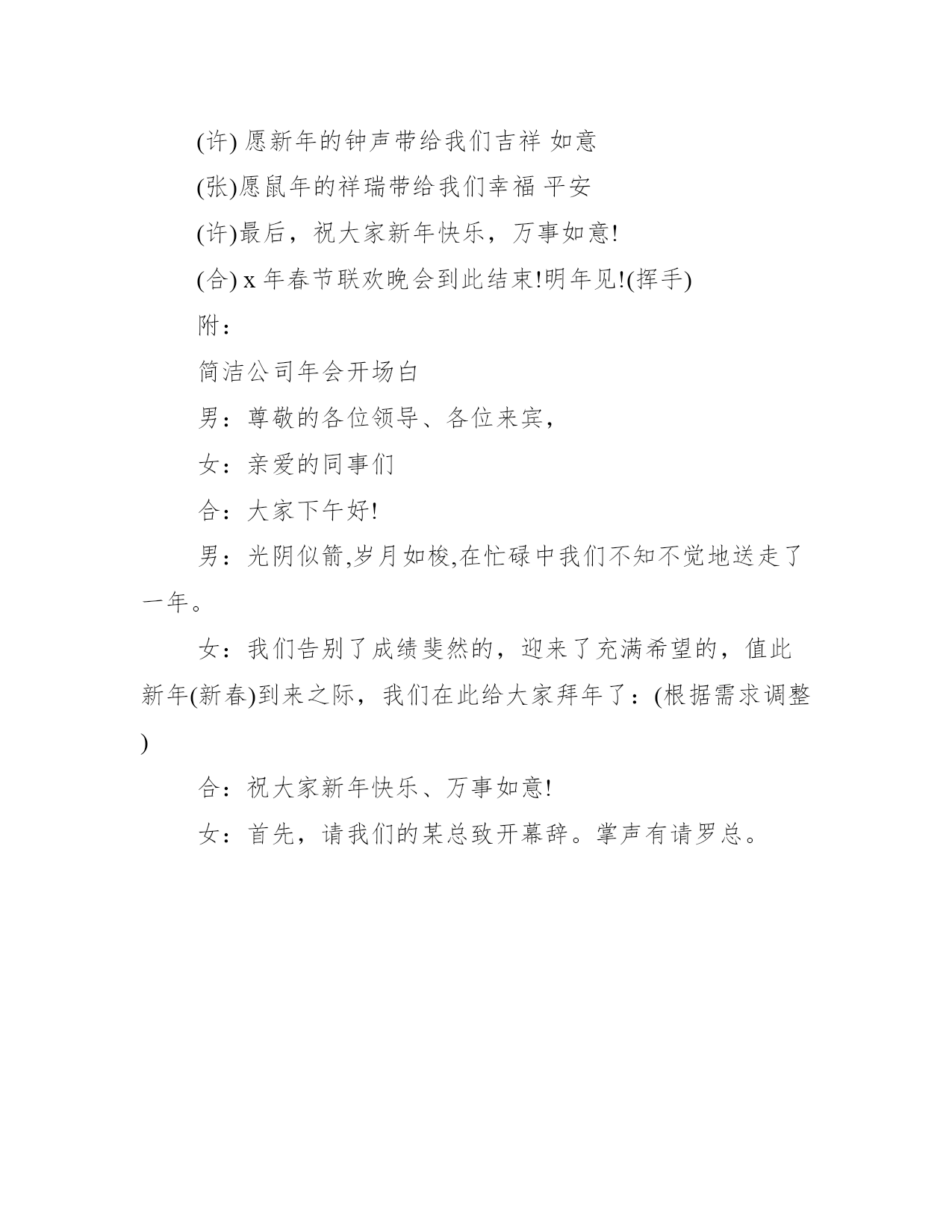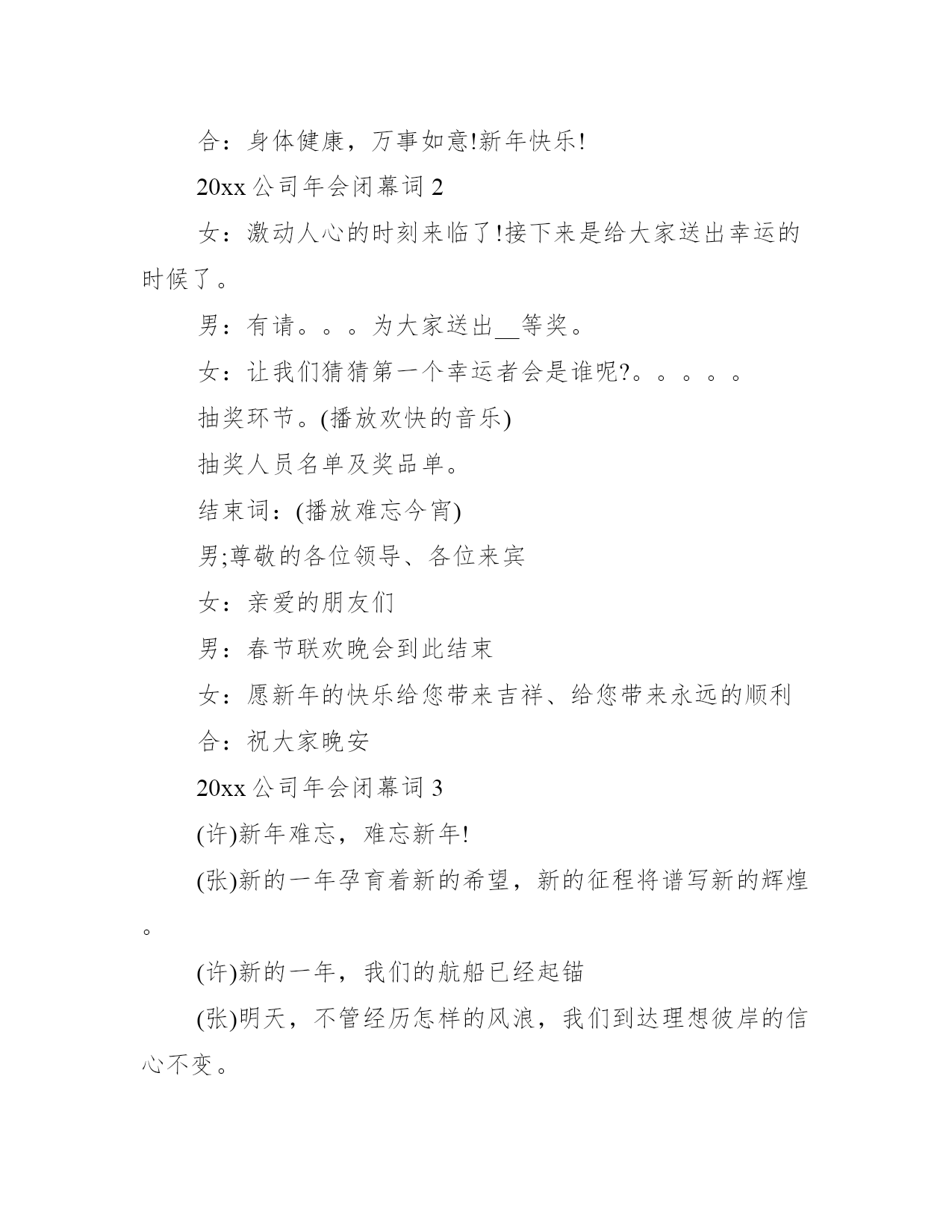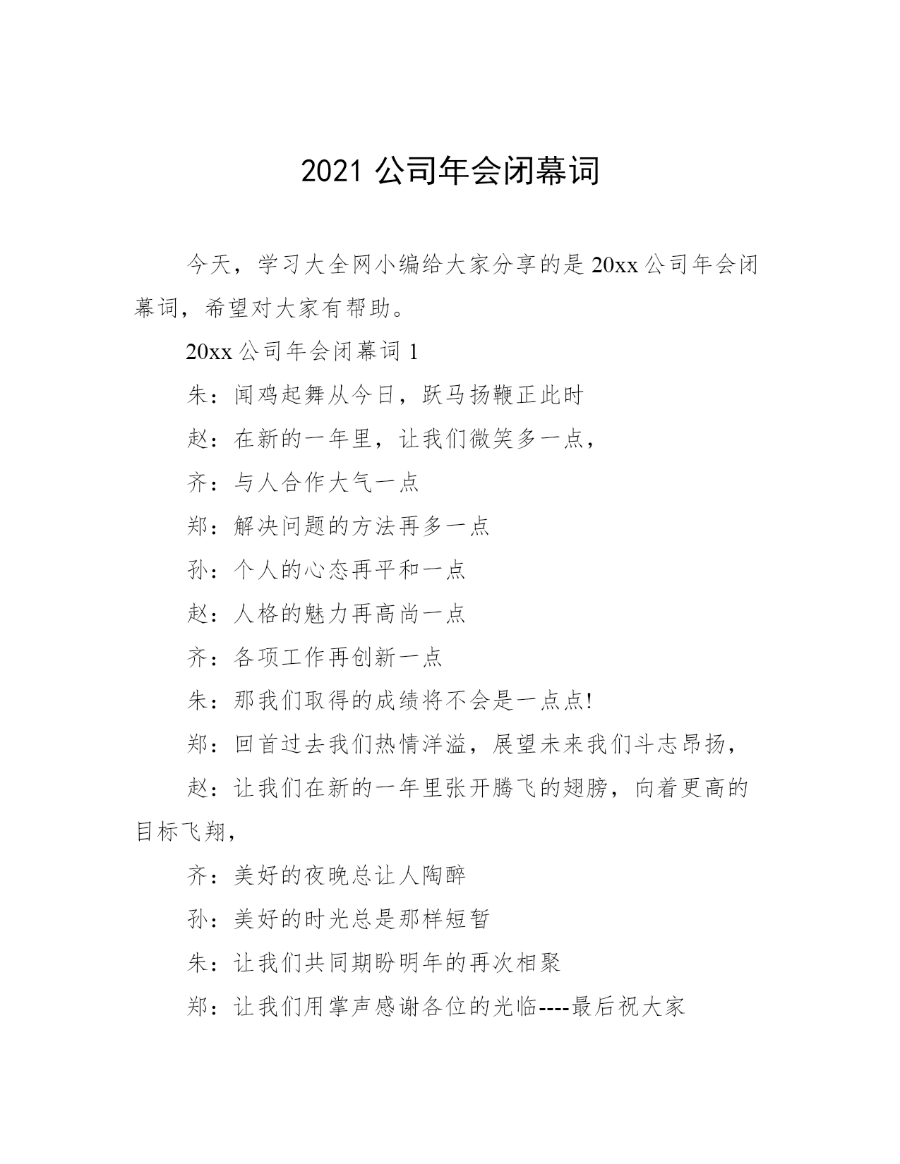 2021公司年会闭幕词今天,学习大全网小编给大家分享的是20xx公司年会闭幕词,希望对大家有帮助。20xx公司年会闭幕词1朱:闻鸡起舞从今日,跃马扬鞭正此时赵:在新的一年里,让我们微笑多一点,齐:与人合作大气一点郑:解决问题的方法再多一点孙:个人的心态再平和一点赵:人格的魅力再高尚一点齐:各项工作再创新一点朱:那我们取得的成绩将不会是一点点!郑:回首过去我们热情洋溢,展望未来我们斗志昂扬,赵:让我们在新的一年里张开腾飞的翅膀,向着更高的目标飞翔,齐:美好的夜晚总让人陶醉孙:美好的时光总是那样短暂朱:让我们共同期盼明年的再次相聚郑:让我们用掌声感谢各位的光临----最后祝大家合:身体健康,万事如意!新年快乐!20xx公司年会闭幕词2女:激动人心的时刻来临了!接下来是给大家送出幸运的时候了。男:有请。。。为大家送出__等奖。女:让我们猜猜第一个幸运者会是谁呢?。。。。。抽奖环节。(播放欢快的音乐)抽奖人员名单及奖品单。结束词:(播放难忘今宵)男;尊敬的各位领导、各位来宾女:亲爱的朋友们男:春节联欢晚会到此结束女:愿新年的快乐给您带来吉祥、给您带来永远的顺利合:祝大家晚安20xx公司年会闭幕词3(许)新年难忘,难忘新年!(张)新的一年孕育着新的希望,新的征程将谱写新的辉煌。(许)新的一年,我们的航船已经起锚(张)明天,不管经历怎样的风浪,我们到达理想彼岸的信心不变。(许)愿新年的钟声带给我们吉祥如意(张)愿鼠年的祥瑞带给我们幸福平安(许)最后,祝大家新年快乐,万事如意!(合)x年春节联欢晚会到此结束!明年见!(挥手)附:简洁公司年会开场白男:尊敬的各位领导、各位来宾,女:亲爱的同事们合:大家下午好!男:光阴似箭,岁月如梭,在忙碌中我们不知不觉地送走了一年。女:我们告别了成绩斐然的,迎来了充满希望的,值此新年(新春)到来之际,我们在此给大家拜年了:(根据需求调整)合:祝大家新年快乐、万事如意!女:首先,请我们的某总致开幕辞。掌声有请罗总。