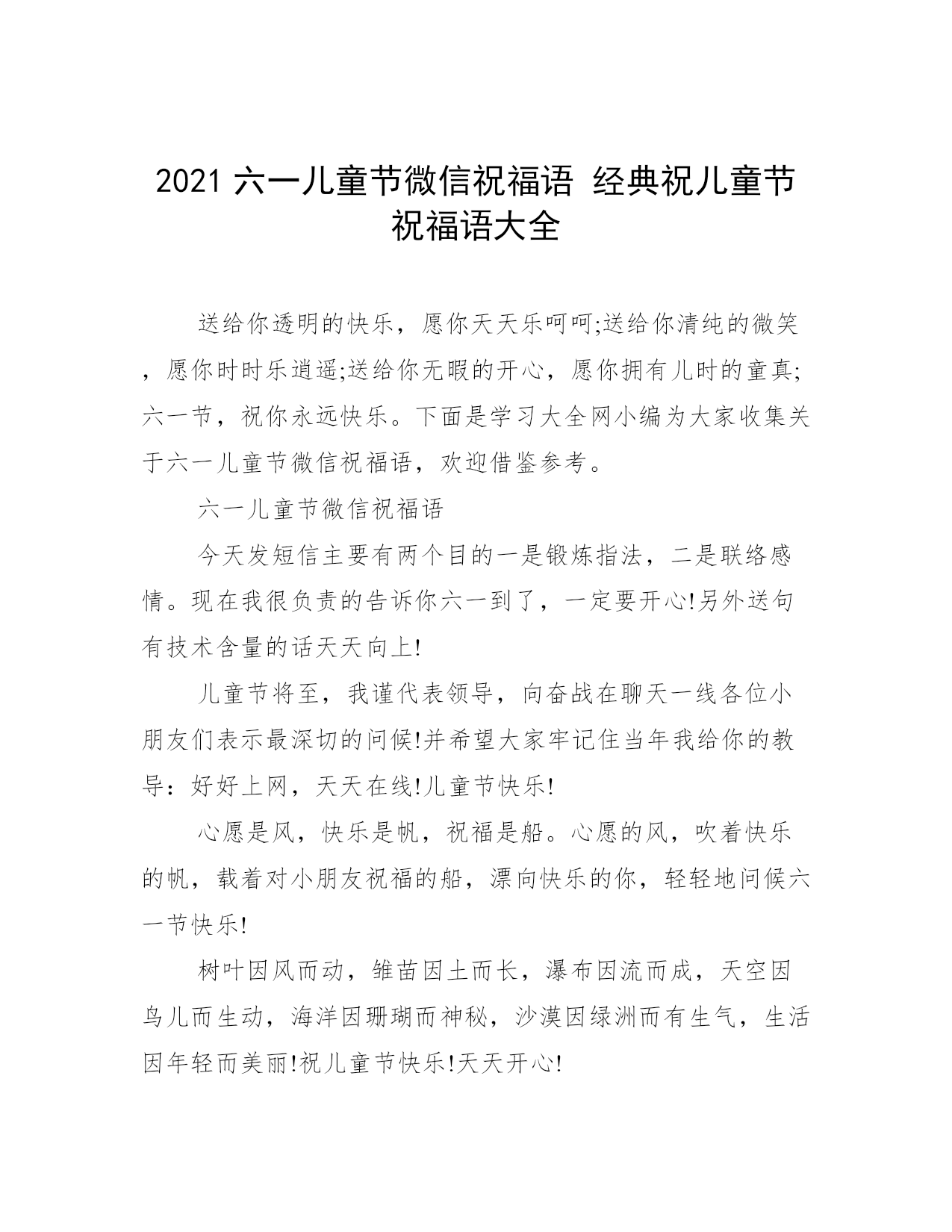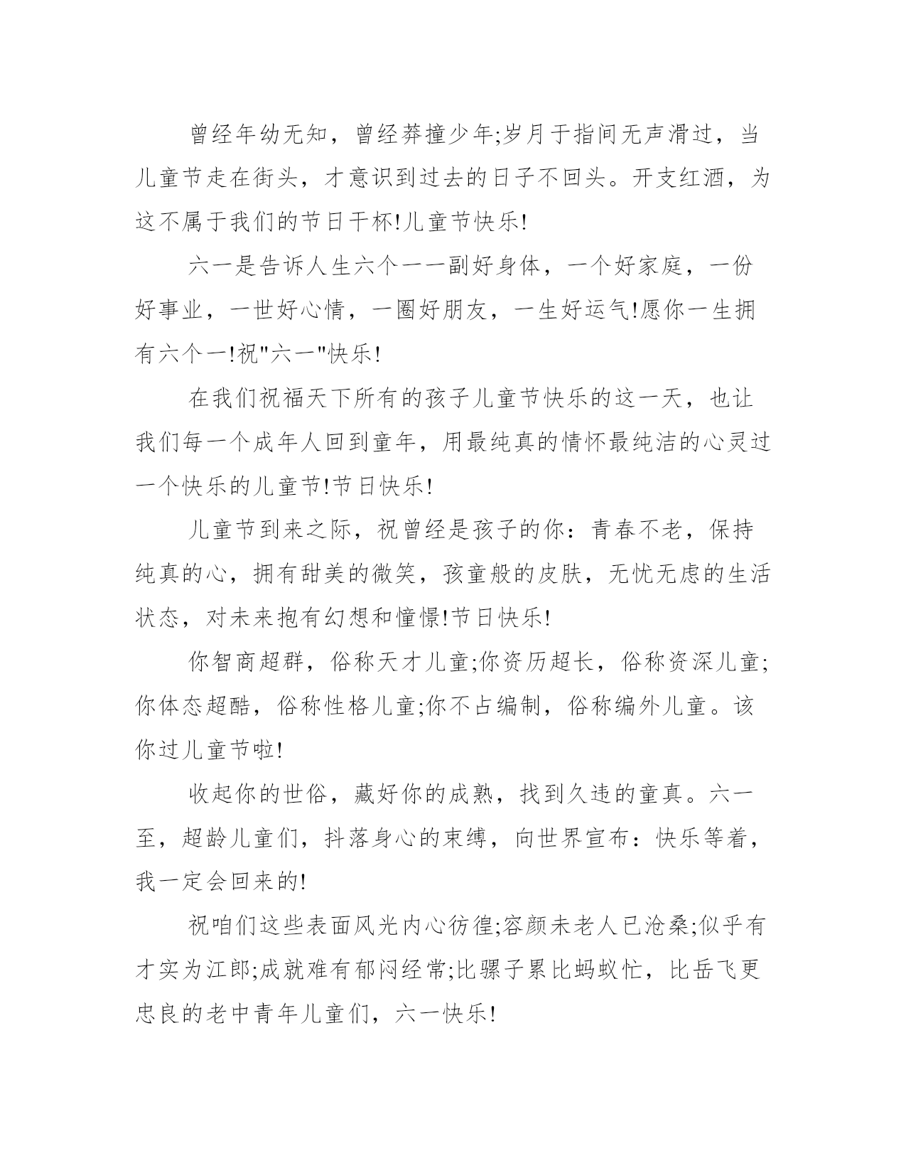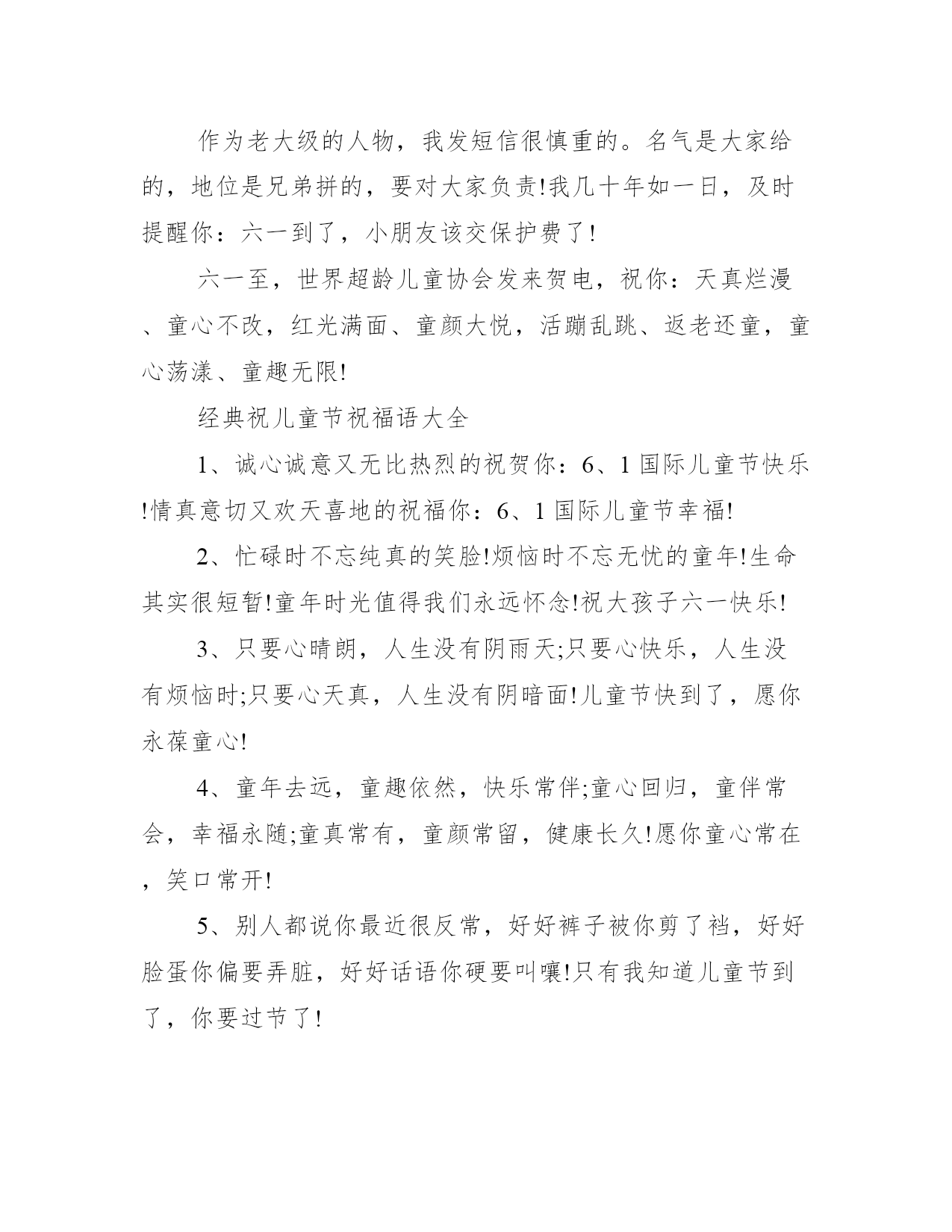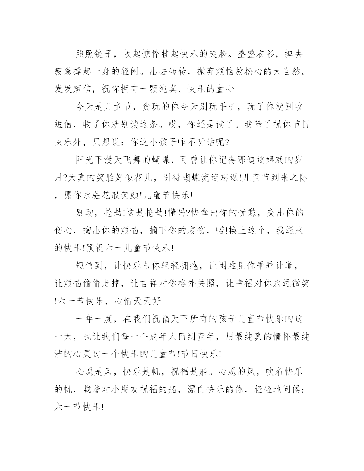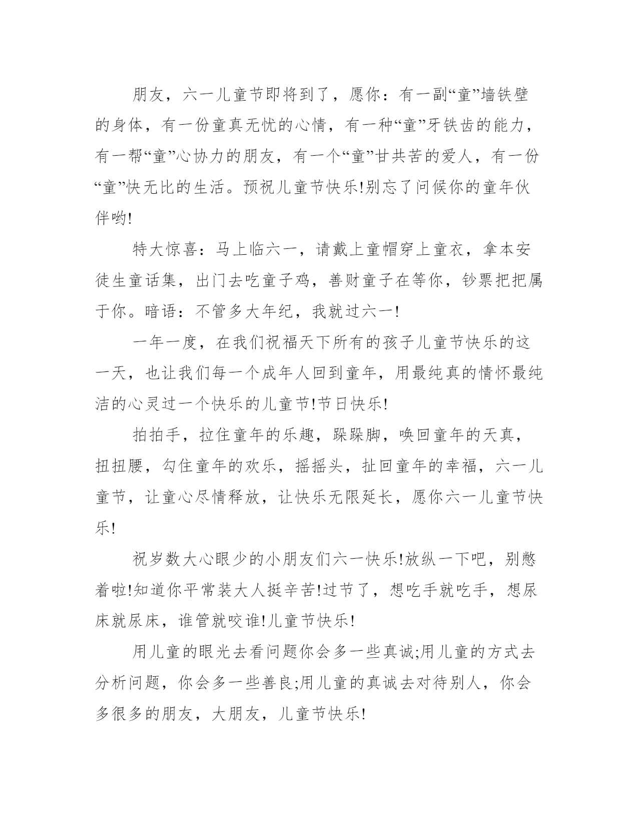 2021六一儿童节微信祝福语经典祝儿童节祝福语大全送给你透明的快乐,愿你天天乐呵呵;送给你清纯的微笑,愿你时时乐逍遥;送给你无暇的开心,愿你拥有儿时的童真;六一节,祝你永远快乐。下面是学习大全网小编为大家收集关于六一儿童节微信祝福语,欢迎借鉴参考。六一儿童节微信祝福语今天发短信主要有两个目的一是锻炼指法,二是联络感情。现在我很负责的告诉你六一到了,一定要开心!另外送句有技术含量的话天天向上!儿童节将至,我谨代表领导,向奋战在聊天一线各位小朋友们表示最深切的问候!并希望大家牢记住当年我给你的教导:好好上网,天天在线!儿童节快乐!心愿是风,快乐是帆,祝福是船。心愿的风,吹着快乐的帆,载着对小朋友祝福的船,漂向快乐的你,轻轻地问候六一节快乐!树叶因风而动,雏苗因土而长,瀑布因流而成,天空因鸟儿而生动,海洋因珊瑚而神秘,沙漠因绿洲而有生气,生活因年轻而美丽!祝儿童节快乐!天天开心!朋友,六一儿童节即将到了,愿你:有一副“童”墙铁壁的身体,有一份童真无忧的心情,有一种“童”牙铁齿的能力,有一帮“童”心协力的朋友,有一个“童”甘共苦的爱人,有一份“童”快无比的生活。预祝儿童节快乐!别忘了问候你的童年伙伴哟!特大惊喜:马上临六一,请戴上童帽穿上童衣,拿本安徒生童话集,出门去吃童子鸡,善财童子在等你,钞票把把属于你。暗语:不管多大年纪,我就过六一!一年一度,在我们祝福天下所有的孩子儿童节快乐的这一天,也让我们每一个成年人回到童年,用最纯真的情怀最纯洁的心灵过一个快乐的儿童节!节日快乐!拍拍手,拉住童年的乐趣,跺跺脚,唤回童年的天真,扭扭腰,勾住童年的欢乐,摇摇头,扯回童年的幸福,六一儿童节,让童心尽情释放,让快乐无限延长,愿你六一儿童节快乐!祝岁数大心眼少的小朋友们六一快乐!放纵一下吧,别憋着啦!知道你平常装大人挺辛苦!过节了,想吃手就吃手,想尿床就尿床,谁管就咬谁!儿童节快乐!用儿童的眼光去看问题你会多一些真诚;用儿童的方式去分析问题,你会多一些善良;用儿童的真诚去对待别人,你会多很多的朋友,大朋友,儿童节快乐!照照镜子,收起憔悴挂起快乐的笑脸。整整衣衫,掸去疲惫撑起一身的轻闲。出去转转,抛弃烦恼放松心的大自然。发发短信,祝你拥有一颗纯真、快乐的童心今天是儿童节,贪玩的你今天别玩手机,玩了你就别收短信,收了你就别读这条。哎,你还是读了。我除了祝你节日快乐外,只想说:你这小孩子咋不听话呢?阳光下漫天飞舞的蝴蝶,可曾让你记得那追逐嬉戏的岁月?天真的笑脸好似花儿,引得蝴蝶流连忘返!儿童节到来之际,愿你永驻花般笑颜!儿童节快乐!别动,抢劫!这是抢劫!懂吗?快拿出你的忧愁,交出你的伤心,掏出你的烦恼,摘下你的哀伤,喏!换上这个,我送来的快乐!预祝六一儿童节快乐!短信到,让快乐与你轻轻拥抱,让困难见你乖乖让道,让烦恼偷偷走掉,让吉祥对你格外关照,让幸福对你永远微笑!六一节快乐,心情天天好一年一度,在我们祝福天下所有的孩子儿童节快乐的这一天,也让我们每一个成年人回到童年,用最纯真的情怀最纯洁的心灵过一个快乐的儿童节!节日快乐!心愿是风,快乐是帆,祝福是船。心愿的风,吹着快乐的帆,载着对小朋友祝福的船,漂向快乐的你,轻轻地问候:六一节快乐!曾经年幼无知,曾经莽撞少年;岁月于指间无声滑过,当儿童节走在街头,才意识到过去的日子不回头。开支红酒,为这不属于我们的节日干杯!儿童节快乐!六一是告诉人生六个一一副好身体,一个好家庭,一份好事业,一世好心情,一圈好朋友,一生好运气!愿你一生拥有六个一!祝"六一"快乐!在我们祝福天下所有的孩子儿童节快乐的这一天,也让我们每一个成年人回到童年,用最纯真的情怀最纯洁的心灵过一个快乐的儿童节!节日快乐!儿童节到来之际,祝曾经是孩子的你:青春不老,保持纯真的心,拥有甜美的微笑,孩童般的皮肤,无忧无虑的生活状态,对未来抱有幻想和憧憬!节日快乐!你智商超群,俗称天才儿童;你资历超长,俗称资深儿童;你体态超酷,俗称性格儿童;你不占编制,俗称编外儿童。该你过儿童节啦!收起你的世俗,藏好你的成熟,找到久违的童真。六一至,超龄儿童们,抖落身心的束缚,向世界宣布:快乐等着,我一定会回来的!祝咱们这些表面风光内心彷徨;容颜未老人已沧桑;似乎有才实为江郎;成就难有郁闷经常;比骡子累比蚂蚁忙,比岳飞更忠良的老中青年儿童们,六一快乐!作为老大级的人物,我发短信很慎重的。名气是大家给的,地位是兄弟拼的,要对大家负责!我几十年如一日,及时提醒你:六一到了,小朋友该交保护费了!六一至,世界超龄儿童协会发来贺电,祝你:天真烂漫、童心不改,红光满面、童颜大悦,活蹦乱跳、返老还童,童心荡漾、童趣无限!经典祝儿童节祝福语大全1、诚心诚意又无比热烈的祝贺你:6、1国际儿童节快乐!情真意切又欢天喜地的祝福你:6、1国际儿童节幸福!2、忙碌时不忘纯真的笑脸!烦恼时不忘无忧