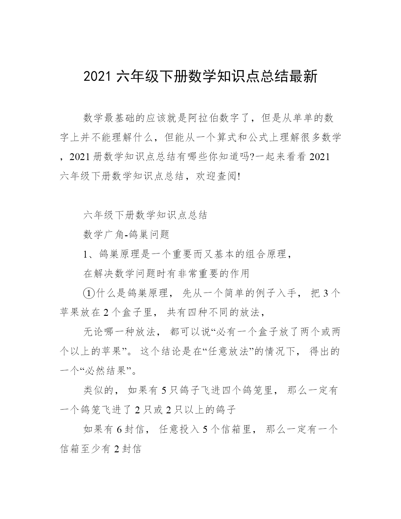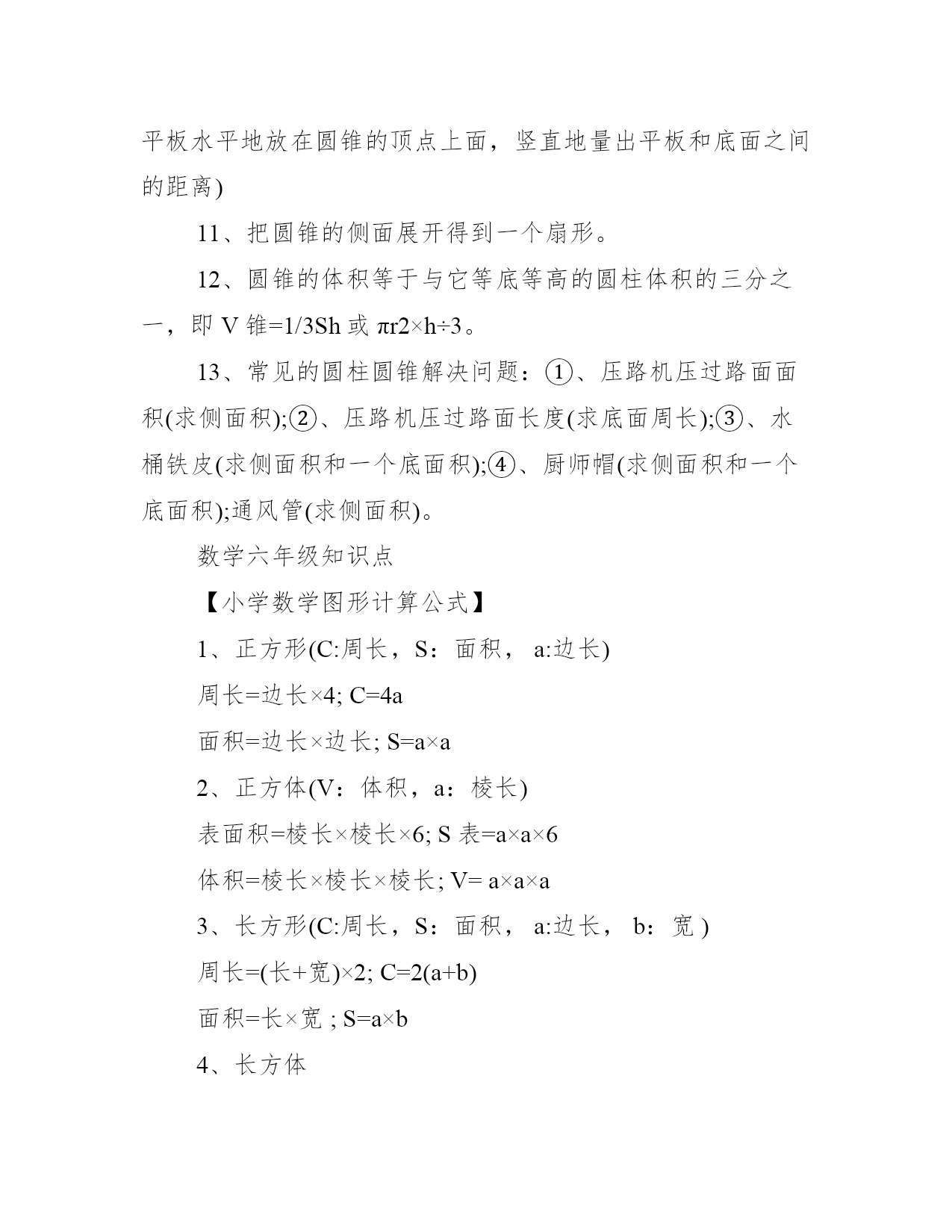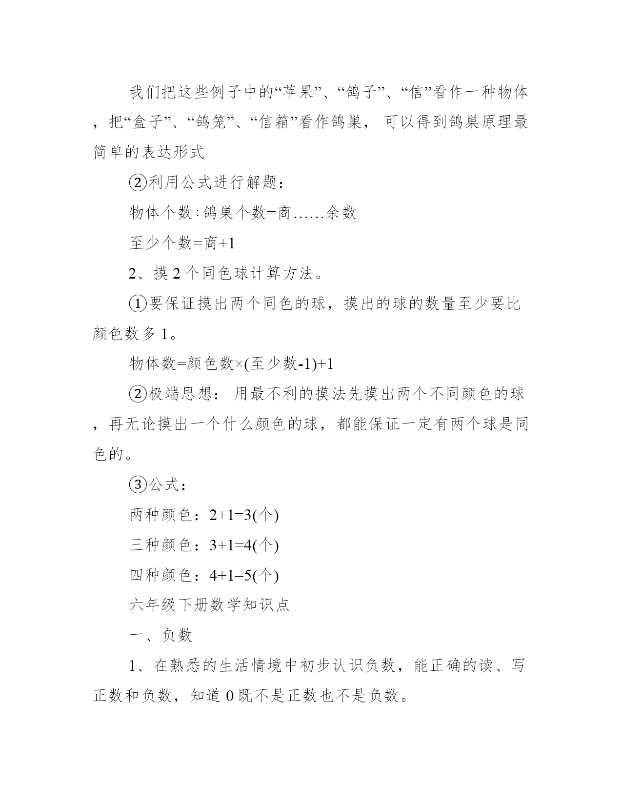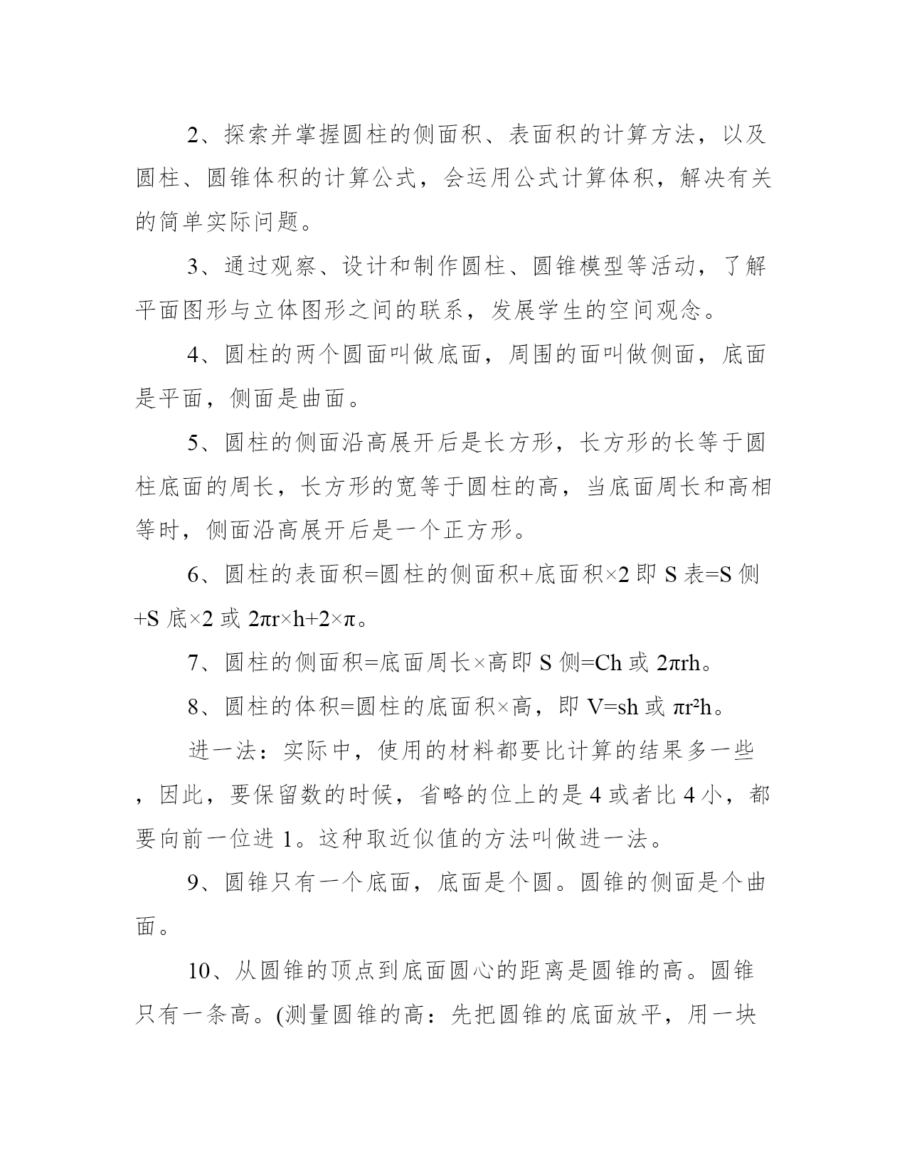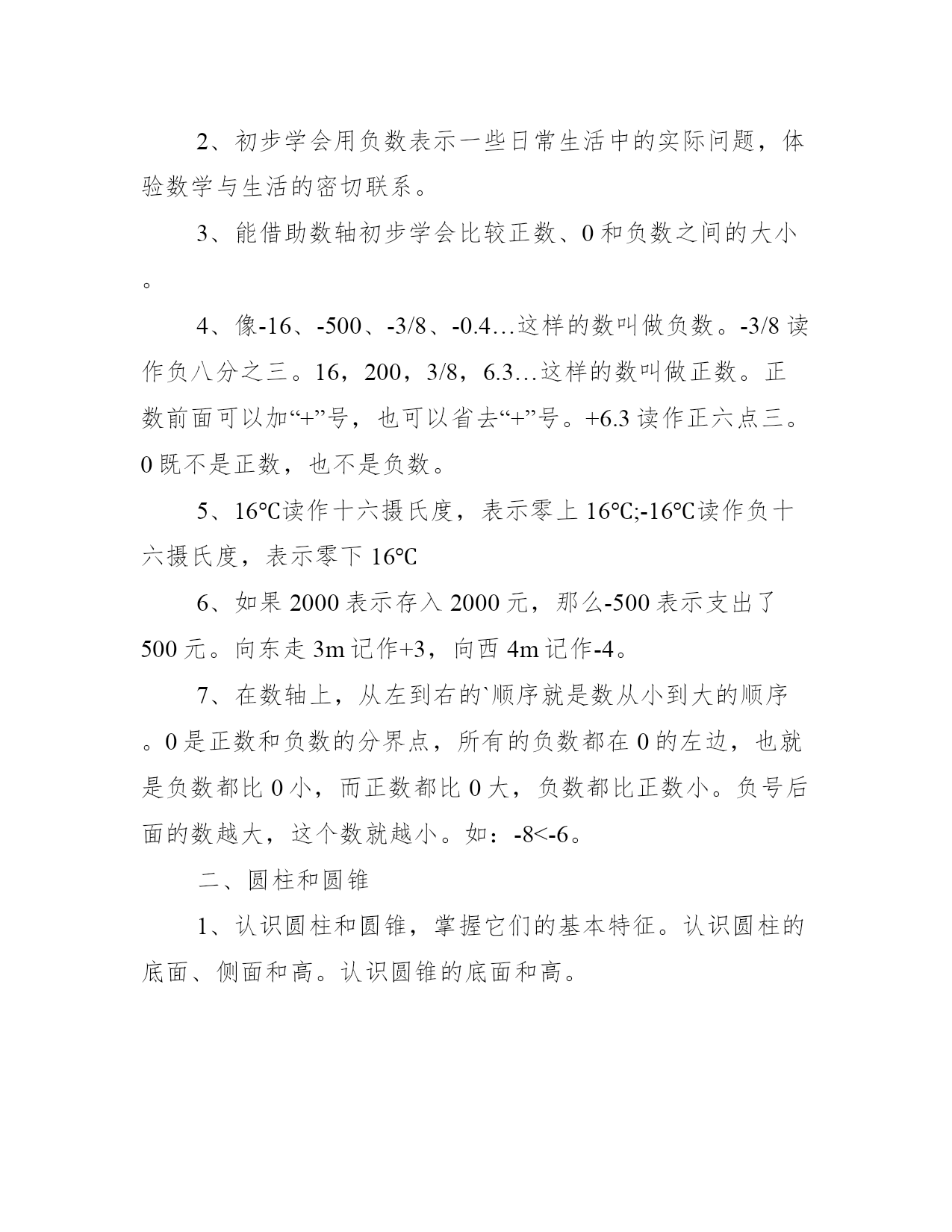 2021六年级下册数学知识点总结最新数学最基础的应该就是阿拉伯数字了,但是从单单的数字上并不能理解什么,但能从一个算式和公式上理解很多数学,2021册数学知识点总结有哪些你知道吗?一起来看看2021六年级下册数学知识点总结,欢迎查阅!六年级下册数学知识点总结数学广角-鸽巢问题1、鸽巣原理是一个重要而又基本的组合原理,在解决数学问题时有非常重要的作用①什么是鸽巣原理,先从一个简单的例子入手,把3个苹果放在2个盒子里,共有四种不同的放法,无论哪一种放法,都可以说“必有一个盒子放了两个或两个以上的苹果”。这个结论是在“任意放法”的情况下,得出的一个“必然结果”。类似的,如果有5只鸽子飞进四个鸽笼里,那么一定有一个鸽笼飞进了2只或2只以上的鸽子如果有6封信,任意投入5个信箱里,那么一定有一个信箱至少有2封信我们把这些例子中的“苹果”、“鸽子”、“信”看作一种物体,把“盒子”、“鸽笼”、“信箱”看作鸽巣,可以得到鸽巣原理最简单的表达形式②利用公式进行解题:物体个数÷鸽巣个数=商……余数至少个数=商+12、摸2个同色球计算方法。①要保证摸出两个同色的球,摸出的球的数量至少要比颜色数多1。物体数=颜色数×(至少数-1)+1②极端思想:用最不利的摸法先摸出两个不同颜色的球,再无论摸出一个什么颜色的球,都能保证一定有两个球是同色的。③公式:两种颜色:2+1=3(个)三种颜色:3+1=4(个)四种颜色:4+1=5(个)六年级下册数学知识点一、负数1、在熟悉的生活情境中初步认识负数,能正确的读、写正数和负数,知道0既不是正数也不是负数。2、初步学会用负数表示一些日常生活中的实际问题,体验数学与生活的密切联系。3、能借助数轴初步学会比较正数、0和负数之间的大小。4、像-16、-500、-3/8、-0.4…这样的数叫做负数。-3/8读作负八分之三。16,200,3/8,6.3…这样的数叫做正数。正数前面可以加“+”号,也可以省去“+”号。+6.3读作正六点三。0既不是正数,也不是负数。5、16℃读作十六摄氏度,表示零上16℃;-16℃读作负十六摄氏度,表示零下16℃6、如果2000表示存入2000元,那么-500表示支出了500元。向东走3m记作+3,向西4m记作-4。7、在数轴上,从左到右的`顺序就是数从小到大的顺序。0是正数和负数的分界点,所有的负数都在0的左边,也就是负数都比0小,而正数都比0大,负数都比正数小。负号后面的数越大,这个数就越小。如:-8<-6。二、圆柱和圆锥1、认识圆柱和圆锥,掌握它们的基本特征。认识圆柱的底面、侧面和高。认识圆锥的底面和高。2、探索并掌握圆柱的侧面积、表面积的计算方法,以及圆柱、圆锥体积的计算公式,会运用公式计算体积,解决有关的简单实际问题。3、通过观察、设计和制作圆柱、圆锥模型等活动,了解平面图形与立体图形之间的联系,发展学生的空间观念。4、圆柱的两个圆面叫做底面,周围的面叫做侧面,底面是平面,侧面是曲面。5、圆柱的侧面沿高展开后是长方形,长方形的长等于圆柱底面的周长,长方形的宽等于圆柱的高,当底面周长和高相等时,侧面沿高展开后是一个正方形。6、圆柱的表面积=圆柱的侧面积+底面积×2即S表=S侧+S底×2或2πr×h+2×π。7、圆柱的侧面积=底面周长×高即S侧=Ch或2πrh。8、圆柱的体积=圆柱的底面积×高,即V=sh或πr²h。进一法:实际中,使用的材料都要比计算的结果多一些,因此,要保留数的时候,省略的位上的是4或者比4小,都要向前一位进1。这种取近似值的方法叫做进一法。9、圆锥只有一个底面,底面是个圆。圆锥的侧面是个曲面。10、从圆锥的顶点到底面圆心的距离是圆锥的高。圆锥只有一条高。(测量圆锥的高:先把圆锥的底面放平,用一块平板水平地放在圆锥的顶点上面,竖直地量出平板和底面之间的距离)11、把圆锥的侧面展开得到一个扇形。12、圆锥的体积等于与它等底等高的圆柱体积的三分之一,即V锥=1/3Sh或πr2×h÷3。13、常见的圆柱圆锥解决问题:①、压路机压过路面面积(求侧面积);②、压路机压过路面长度(求底面周长);③、水桶铁皮(求侧面积和一个底面积);④、厨师帽(求侧面积和一个底面积);通风管(求侧面积)。数学六年级知识点【小学数学图形计算公式】1、正方形(C:周长,S:面积,a:边长)周长=边长×4;C=4a面积=边长×边长;S=a×a2、正方体(V:体积,a:棱长)表面积=棱长×棱长×6;S表=a×a×6体积=棱长×棱长×棱长;V=a×a×a3、长方形(C:周长,S:面积,a:边长,b:宽)周长=(长+宽)×2;C=2(a+b)面积=长×宽;S=a×b4、长方体(V:体积,S:面积,a:长,b:宽,h:高)(1)表面积=(长×宽+长×高+宽×高)×2;S=2(ab+ah+bh)(2)体积=长×宽×高;