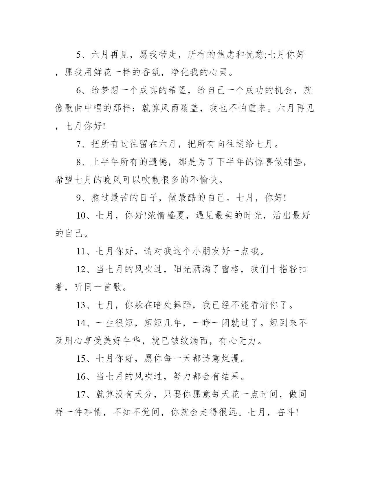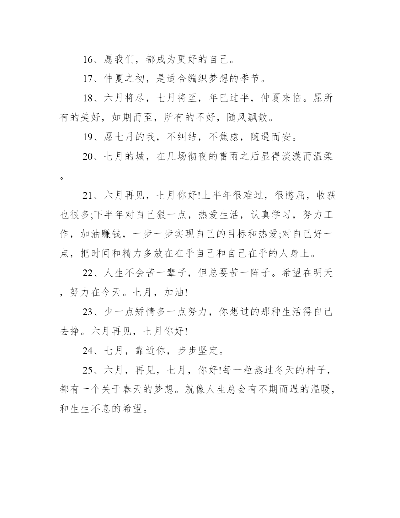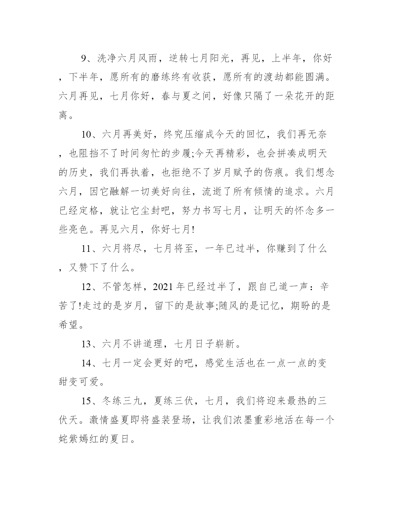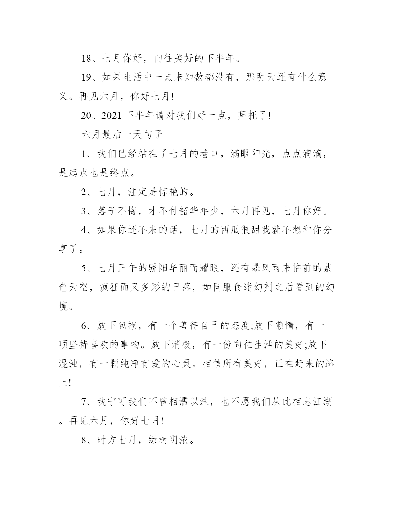 2021六月最后一天说说_六月最后一天的祝福语不知不觉中,来到了六月的最后一天,意味着又半年的时间过去了,相信大家有很多感慨,一起写一写六月最后一天的说说吧!下面是学习大全网小编给大家带来的2021六月最后一天说说_六月最后一天的祝福语,以供大家参考,我们一起来看看吧!六月最后一天说说1、西瓜汁,吊带背心,噶几噶几转的风扇,清凉带着点闷热,蓝天拽着厚厚的棉花糖,是七月。2、六月,闭关,戒剧戒博戒奶茶。六月你好,七月再见。3、火红的七月,汇集着火的色彩;深情厚意的七月,抒写着兵的情怀;热情奔放的七月,洋溢着青春的气息。4、在七月,对于亲情,别耽搁;对于友情,别淡漠;对于爱情,别辜负。好好珍惜,维系好每一份真情,别辜负每一颗真心。5、六月再见,愿我带走,所有的焦虑和忧愁;七月你好,愿我用鲜花一样的香氛,净化我的心灵。6、给梦想一个成真的希望,给自己一个成功的机会,就像歌曲中唱的那样:就算风雨覆盖,我也不怕重来。六月再见,七月你好!7、把所有过往留在六月,把所有向往送给七月。8、上半年所有的遗憾,都是为了下半年的惊喜做铺垫,希望七月的晚风可以吹散很多的不愉快。9、熬过最苦的日子,做最酷的自己。七月,你好!10、七月,你好!浓情盛夏,遇见最美的时光,活出最好的自己。11、七月你好,请对我这个小朋友好一点哦。12、当七月的风吹过,阳光洒满了窗格,我们十指轻扣着,听同一首歌。13、七月,你躲在暗处舞蹈,我已经不能看清你了。14、一生很短,短短几年,一睁一闭就过了。短到来不及用心享受美好年华,就已皱纹满面,有心无力。15、七月你好,愿你每一天都诗意烂漫。16、当七月的风吹过,努力都会有结果。17、就算没有天分,只要你愿意每天花一点时间,做同样一件事情,不知不觉间,你就会走得很远。七月,奋斗!18、七月你好,向往美好的下半年。19、如果生活中一点未知数都没有,那明天还有什么意义。再见六月,你好七月!20、2021下半年请对我们好一点,拜托了!六月最后一天句子1、我们已经站在了七月的巷口,满眼阳光,点点滴滴,是起点也是终点。2、七月,注定是惊艳的。3、落子不悔,才不付韶华年少,六月再见,七月你好。4、如果你还不来的话,七月的西瓜很甜我就不想和你分享了。5、七月正午的骄阳华丽而耀眼,还有暴风雨来临前的紫色天空,疯狂而又多彩的日落,如同服食迷幻剂之后看到的幻境。6、放下包袱,有一个善待自己的态度;放下懒惰,有一项坚持喜欢的事物。放下消极,有一份向往生活的美好;放下混浊,有一颗纯净有爱的心灵。相信所有美好,正在赶来的路上!7、我宁可我们不曾相濡以沫,也不愿我们从此相忘江湖。再见六月,你好七月!8、时方七月,绿树阴浓。9、洗净六月风雨,逆转七月阳光,再见,上半年,你好,下半年,愿所有的磨练终有收获,愿所有的渡劫都能圆满。六月再见,七月你好,春与夏之间,好像只隔了一朵花开的距离。10、六月再美好,终究压缩成今天的回忆,我们再无奈,也阻挡不了时间匆忙的步履;今天再精彩,也会拼凑成明天的历史,我们再执着,也拒绝不了岁月赋予的伤痕。我们想念六月,因它融解一切美好向往,流逝了所有倾情的追求。六月已经定格,就让它尘封吧,努力书写七月,让明天的怀念多一些亮色。再见六月,你好七月!11、六月将尽,七月将至,一年已过半,你赚到了什么,又赞下了什么。12、不管怎样,2021年已经过半了,跟自己道一声:辛苦了!走过的是岁月,留下的是故事;随风的是记忆,期盼的是希望。13、六月不讲道理,七月日子崭新。14、七月一定会更好的吧,感觉生活也在一点一点的变甜变可爱。15、冬练三九,夏练三伏,七月,我们将迎来最热的三伏天。激情盛夏即将盛装登场,让我们浓墨重彩地活在每一个姹紫嫣红的夏日。16、愿我们,都成为更好的自己。17、仲夏之初,是适合编织梦想的季节。18、六月将尽,七月将至,年已过半,仲夏来临。愿所有的美好,如期而至,所有的不好,随风飘散。19、愿七月的我,不纠结,不焦虑,随遇而安。20、七月的城,在几场彻夜的雷雨之后显得淡漠而温柔。21、六月再见,七月你好!上半年很难过,很憋屈,收获也很多;下半年对自己狠一点,热爱生活,认真学习,努力工作,加油赚钱,一步一步实现自己的目标和热爱;对自己好一点,把时间和精力多放在在乎自己和自己在乎的人身上。22、人生不会苦一辈子,但总要苦一阵子。希望在明天,努力在今天。七月,加油!23、少一点矫情多一点努力,你想过的那种生活得自己去挣。六月再见,七月你好!24、七月,靠近你,步步坚定。25、六月,再见,七月,你好!每一粒熬过冬天的种子,都有一个关于春天的梦想。就像人生总会有不期而遇的温暖,和生生不息的希望。26、人只有一颗心,要学会剔除记忆的垃圾,有些事记在心里,于事无补,只会乱了心性,不如忘记,路再难,也要向前,就算身心疲惫,也不能后退。你好,