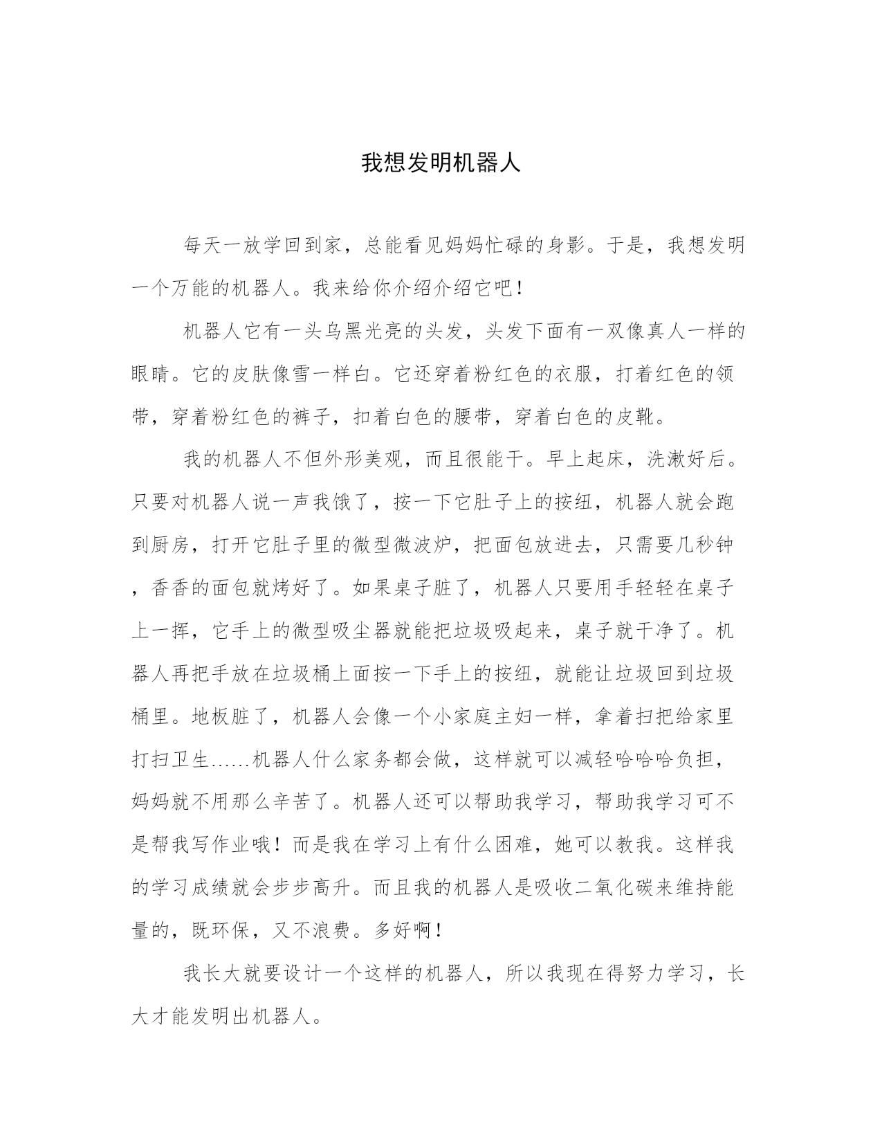 我想发明机器人每天一放学回到家,总能看见妈妈忙碌的身影。于是,我想发明一个万能的机器人。我来给你介绍介绍它吧!机器人它有一头乌黑光亮的头发,头发下面有一双像真人一样的眼睛。它的皮肤像雪一样白。它还穿着粉红色的衣服,打着红色的领带,穿着粉红色的裤子,扣着白色的腰带,穿着白色的皮靴。我的机器人不但外形美观,而且很能干。早上起床,洗漱好后。只要对机器人说一声我饿了,按一下它肚子上的按纽,机器人就会跑到厨房,打开它肚子里的微型微波炉,把面包放进去,只需要几秒钟,香香的面包就烤好了。如果桌子脏了,机器人只要用手轻轻在桌子上一挥,它手上的微型吸尘器就能把垃圾吸起来,桌子就干净了。机器人再把手放在垃圾桶上面按一下手上的按纽,就能让垃圾回到垃圾桶里。地板脏了,机器人会像一个小家庭主妇一样,拿着扫把给家里打扫卫生……机器人什么家务都会做,这样就可以减轻哈哈哈负担,妈妈就不用那么辛苦了。机器人还可以帮助我学习,帮助我学习可不是帮我写作业哦!而是我在学习上有什么困难,她可以教我。这样我的学习成绩就会步步高升。而且我的机器人是吸收二氧化碳来维持能量的,既环保,又不浪费。多好啊!我长大就要设计一个这样的机器人,所以我现在得努力学习,长大才能发明出机器人。