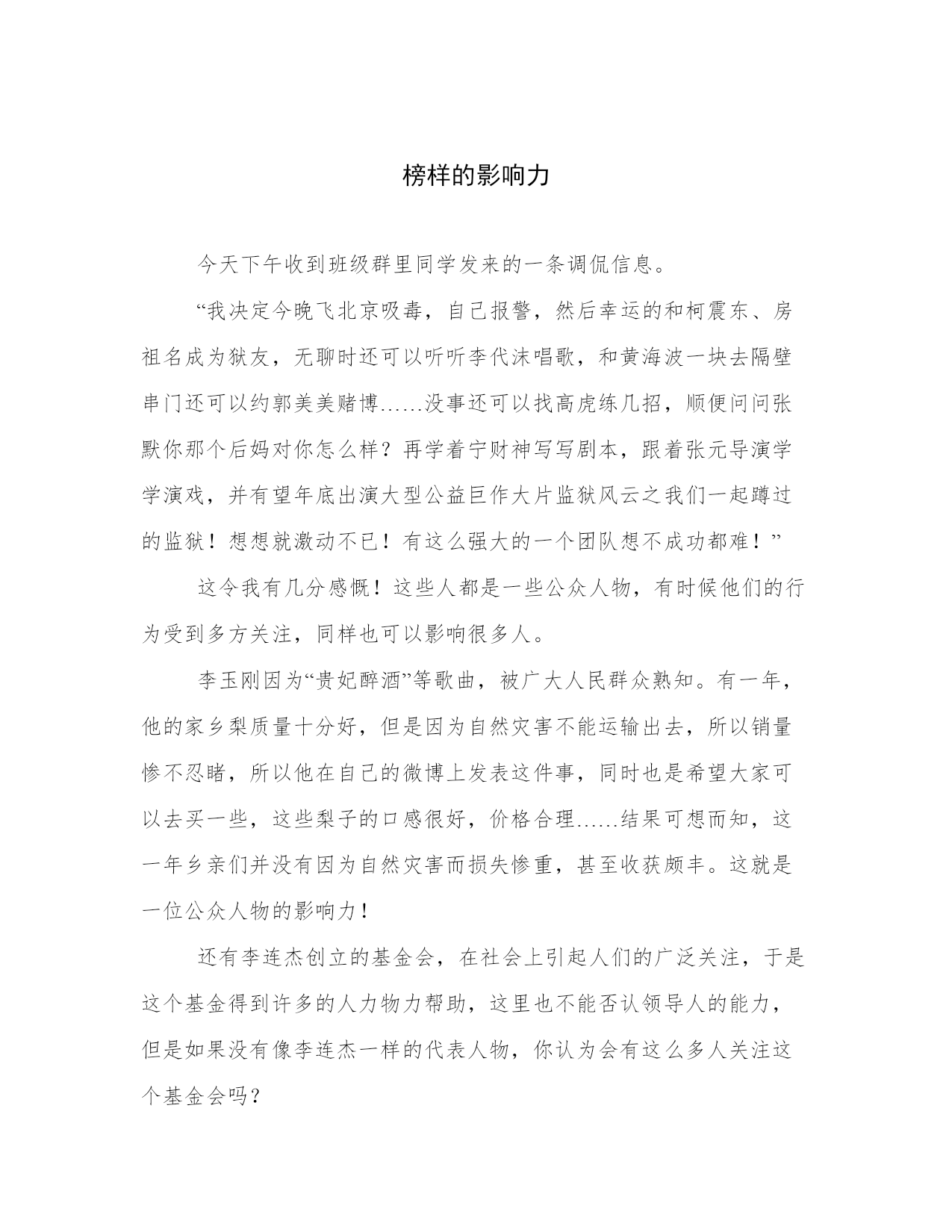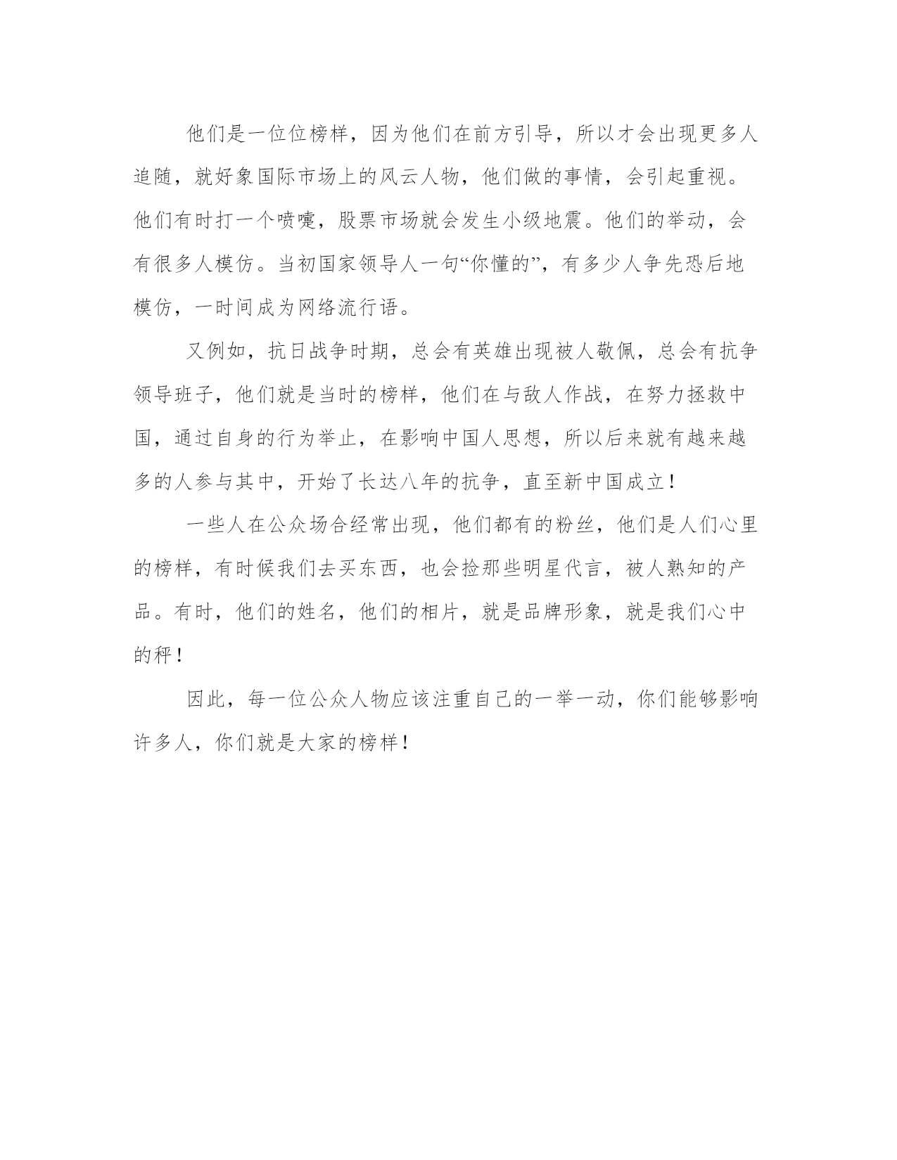 榜样的影响力今天下午收到班级群里同学发来的一条调侃信息。“我决定今晚飞北京吸毒,自己报警,然后幸运的和柯震东、房祖名成为狱友,无聊时还可以听听李代沫唱歌,和黄海波一块去隔壁串门还可以约郭美美赌博……没事还可以找高虎练几招,顺便问问张默你那个后妈对你怎么样?再学着宁财神写写剧本,跟着张元导演学学演戏,并有望年底出演大型公益巨作大片监狱风云之我们一起蹲过的监狱!想想就激动不已!有这么强大的一个团队想不成功都难!”这令我有几分感慨!这些人都是一些公众人物,有时候他们的行为受到多方关注,同样也可以影响很多人。李玉刚因为“贵妃醉酒”等歌曲,被广大人民群众熟知。有一年,他的家乡梨质量十分好,但是因为自然灾害不能运输出去,所以销量惨不忍睹,所以他在自己的微博上发表这件事,同时也是希望大家可以去买一些,这些梨子的口感很好,价格合理……结果可想而知,这一年乡亲们并没有因为自然灾害而损失惨重,甚至收获颇丰。这就是一位公众人物的影响力!还有李连杰创立的基金会,在社会上引起人们的广泛关注,于是这个基金得到许多的人力物力帮助,这里也不能否认领导人的能力,但是如果没有像李连杰一样的代表人物,你认为会有这么多人关注这个基金会吗?他们是一位位榜样,因为他们在前方引导,所以才会出现更多人追随,就好象国际市场上的风云人物,他们做的事情,会引起重视。他们有时打一个喷嚏,股票市场就会发生小级地震。他们的举动,会有很多人模仿。当初国家领导人一句“你懂的”,有多少人争先恐后地模仿,一时间成为网络流行语。又例如,抗日战争时期,总会有英雄出现被人敬佩,总会有抗争领导班子,他们就是当时的榜样,他们在与敌人作战,在努力拯救中国,通过自身的行为举止,在影响中国人思想,所以后来就有越来越多的人参与其中,开始了长达八年的抗争,直至新中国成立!一些人在公众场合经常出现,他们都有的粉丝,他们是人们心里的榜样,有时候我们去买东西,也会捡那些明星代言,被人熟知的产品。有时,他们的姓名,他们的相片,就是品牌形象,就是我们心中的秤!因此,每一位公众人物应该注重自己的一举一动,你们能够影响许多人,你们就是大家的榜样!