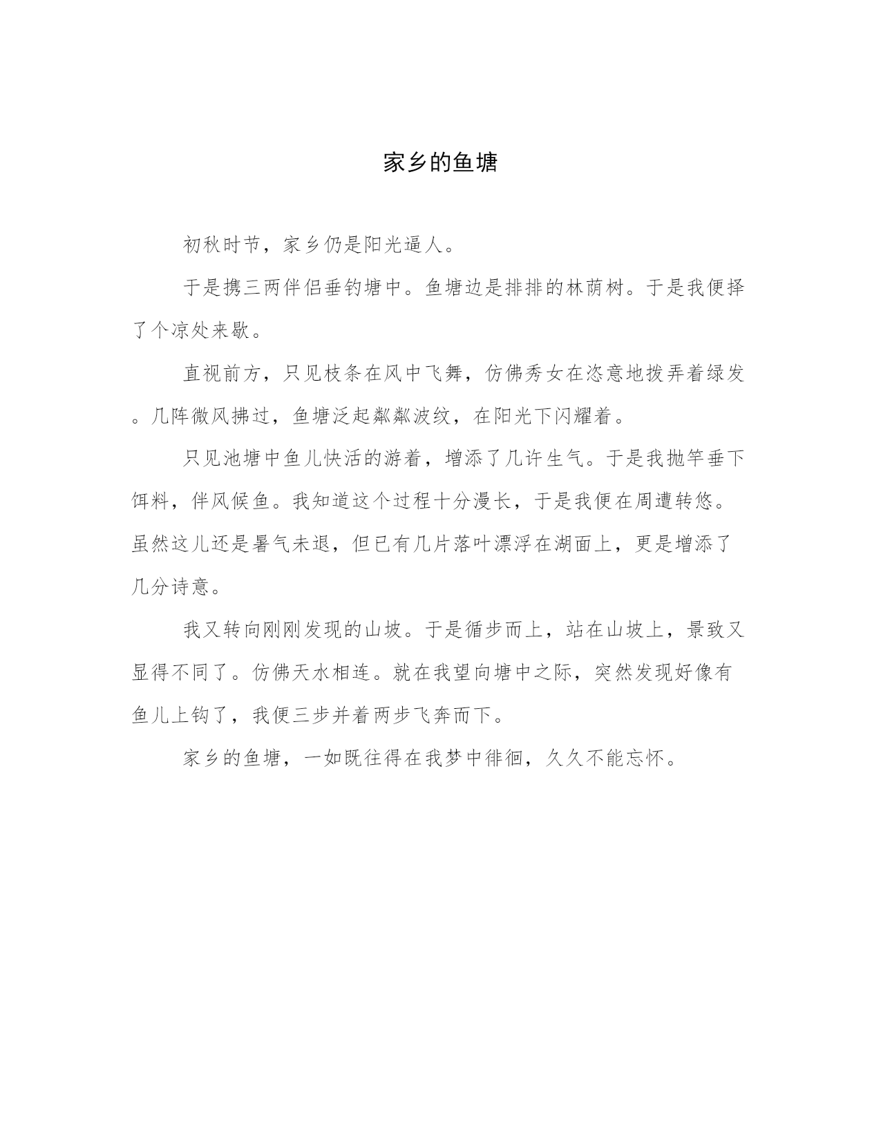 家乡的鱼塘初秋时节,家乡仍是阳光逼人。于是携三两伴侣垂钓塘中。鱼塘边是排排的林荫树。于是我便择了个凉处来歇。直视前方,只见枝条在风中飞舞,仿佛秀女在恣意地拨弄着绿发。几阵微风拂过,鱼塘泛起粼粼波纹,在阳光下闪耀着。只见池塘中鱼儿快活的游着,增添了几许生气。于是我抛竿垂下饵料,伴风候鱼。我知道这个过程十分漫长,于是我便在周遭转悠。虽然这儿还是暑气未退,但已有几片落叶漂浮在湖面上,更是增添了几分诗意。我又转向刚刚发现的山坡。于是循步而上,站在山坡上,景致又显得不同了。仿佛天水相连。就在我望向塘中之际,突然发现好像有鱼儿上钩了,我便三步并着两步飞奔而下。家乡的鱼塘,一如既往得在我梦中徘徊,久久不能忘怀。
