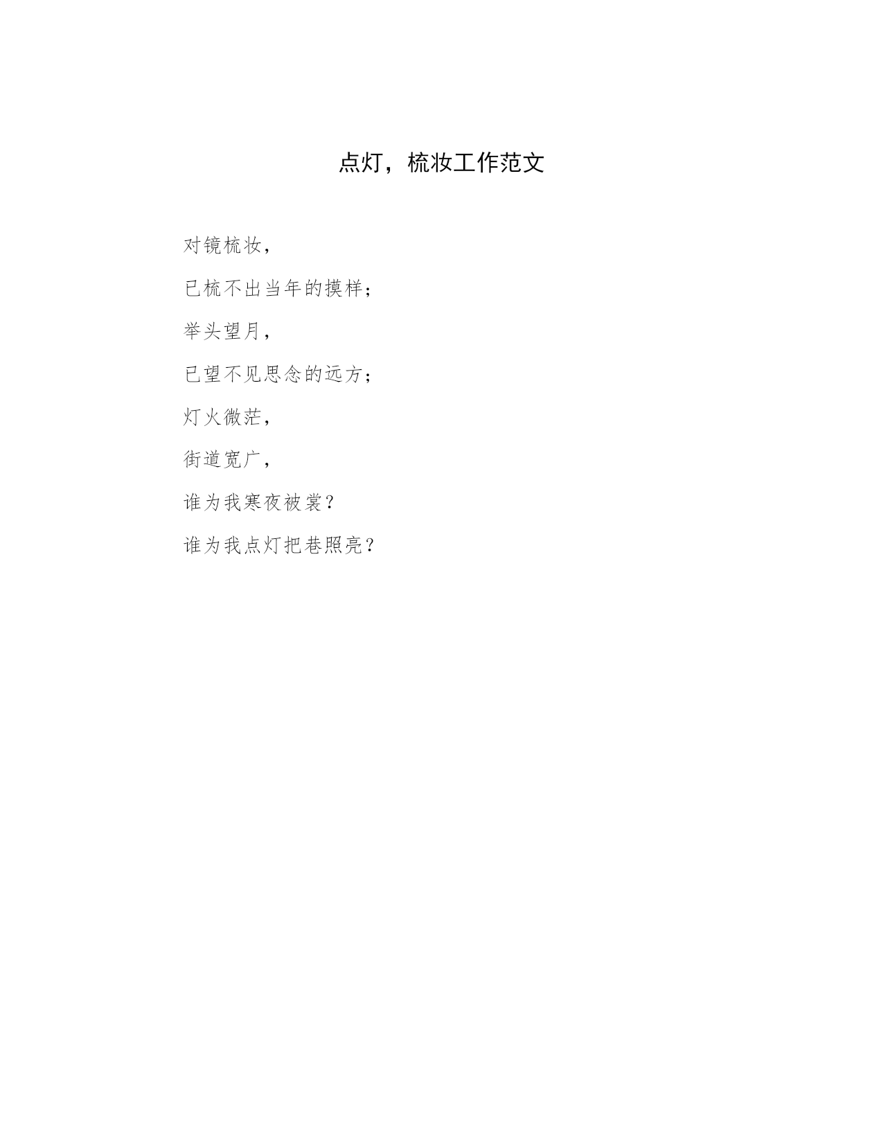 点灯,梳妆工作范文对镜梳妆,已梳不出当年的摸样;举头望月,已望不见思念的远方;灯火微茫,街道宽广,谁为我寒夜被裳?谁为我点灯把巷照亮?