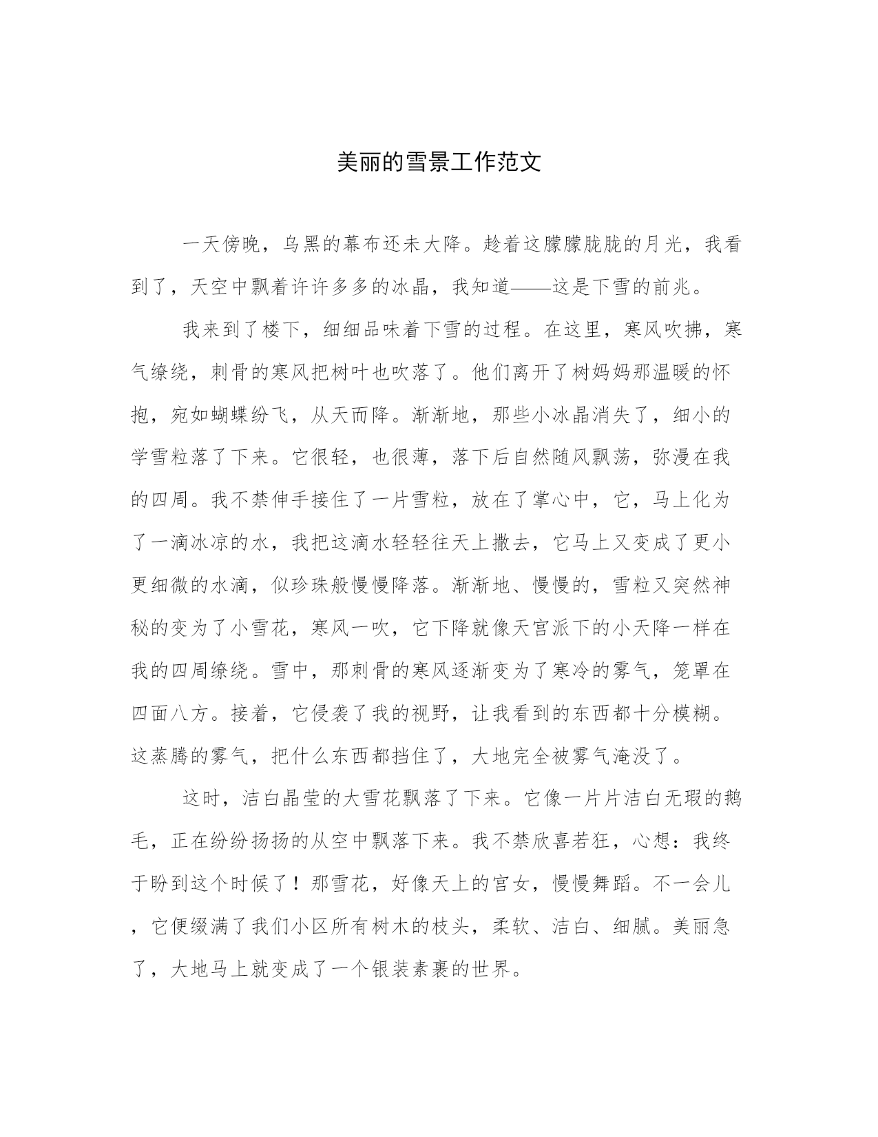 美丽的雪景工作范文一天傍晚,乌黑的幕布还未大降。趁着这朦朦胧胧的月光,我看到了,天空中飘着许许多多的冰晶,我知道——这是下雪的前兆。我来到了楼下,细细品味着下雪的过程。在这里,寒风吹拂,寒气缭绕,刺骨的寒风把树叶也吹落了。他们离开了树妈妈那温暖的怀抱,宛如蝴蝶纷飞,从天而降。渐渐地,那些小冰晶消失了,细小的学雪粒落了下来。它很轻,也很薄,落下后自然随风飘荡,弥漫在我的四周。我不禁伸手接住了一片雪粒,放在了掌心中,它,马上化为了一滴冰凉的水,我把这滴水轻轻往天上撒去,它马上又变成了更小更细微的水滴,似珍珠般慢慢降落。渐渐地、慢慢的,雪粒又突然神秘的变为了小雪花,寒风一吹,它下降就像天宫派下的小天降一样在我的四周缭绕。雪中,那刺骨的寒风逐渐变为了寒冷的雾气,笼罩在四面八方。接着,它侵袭了我的视野,让我看到的东西都十分模糊。这蒸腾的雾气,把什么东西都挡住了,大地完全被雾气淹没了。这时,洁白晶莹的大雪花飘落了下来。它像一片片洁白无瑕的鹅毛,正在纷纷扬扬的从空中飘落下来。我不禁欣喜若狂,心想:我终于盼到这个时候了!那雪花,好像天上的宫女,慢慢舞蹈。不一会儿,它便缀满了我们小区所有树木的枝头,柔软、洁白、细腻。美丽急了,大地马上就变成了一个银装素裹的世界。第二天清早,鹅毛般的雪花伴随着猛烈的寒风一同飘荡。但是,昨晚下的雪早已化为了冰,在阳光的照射下,光彩耀人。我们在冰上玩耍,嬉戏,欢笑声此起彼伏,不绝于耳,飘在空中,久久也不能散去……啊!下雪真美,真棒!