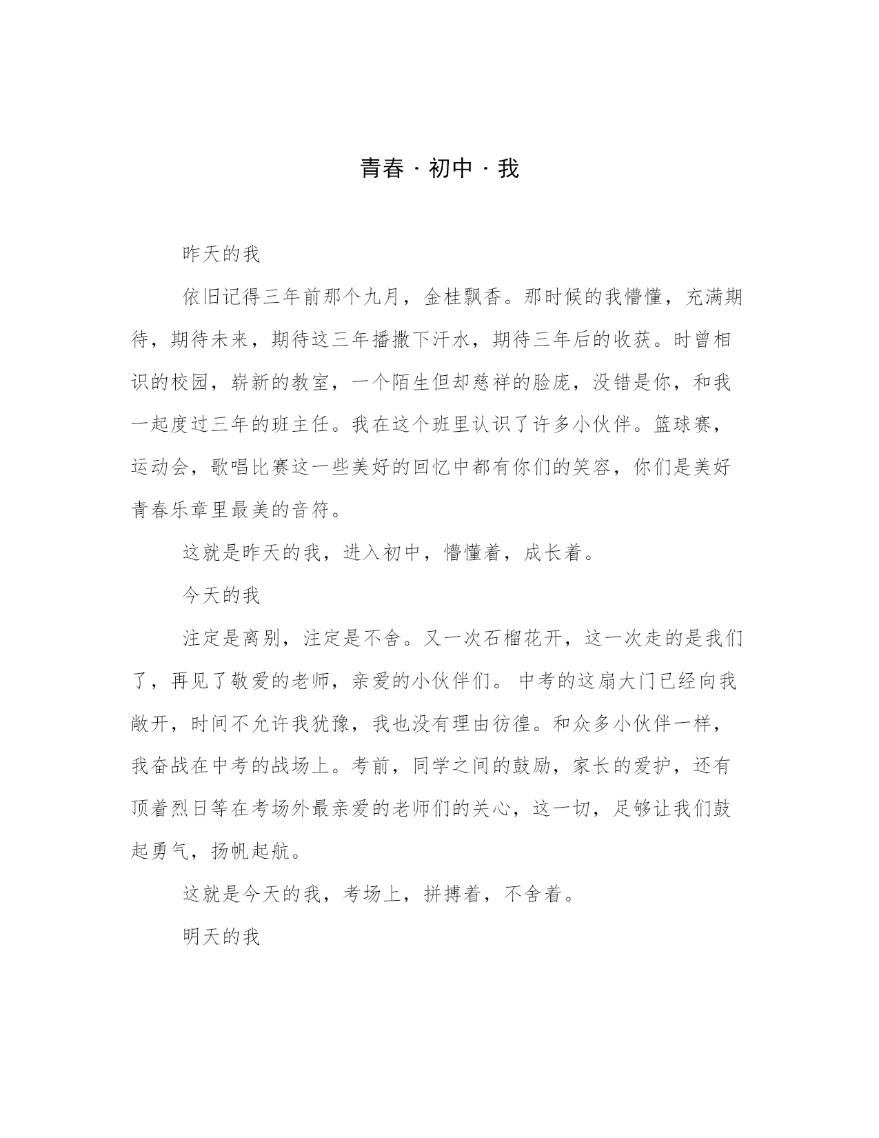 青春・初中・我昨天的我依旧记得三年前那个九月,金桂飘香。那时候的我懵懂,充满期待,期待未来,期待这三年播撒下汗水,期待三年后的收获。时曾相识的校园,崭新的教室,一个陌生但却慈祥的脸庞,没错是你,和我一起度过三年的班主任。我在这个班里认识了许多小伙伴。篮球赛,运动会,歌唱比赛这一些美好的回忆中都有你们的笑容,你们是美好青春乐章里最美的音符。这就是昨天的我,进入初中,懵懂着,成长着。今天的我注定是离别,注定是不舍。又一次石榴花开,这一次走的是我们了,再见了敬爱的老师,亲爱的小伙伴们。中考的这扇大门已经向我敞开,时间不允许我犹豫,我也没有理由彷徨。和众多小伙伴一样,我奋战在中考的战场上。考前,同学之间的鼓励,家长的爱护,还有顶着烈日等在考场外最亲爱的老师们的关心,这一切,足够让我们鼓起勇气,扬帆起航。这就是今天的我,考场上,拼搏着,不舍着。明天的我跨过中考着扇大门,迎接我的是一个崭新的世界,我将到更远的地方去求学。没有以前熟悉的面孔,所以我也要学坚强。我已经准备好了,未来的大门,我期待你的打开。这就是明天的我,在远方,期待着,坚强着。