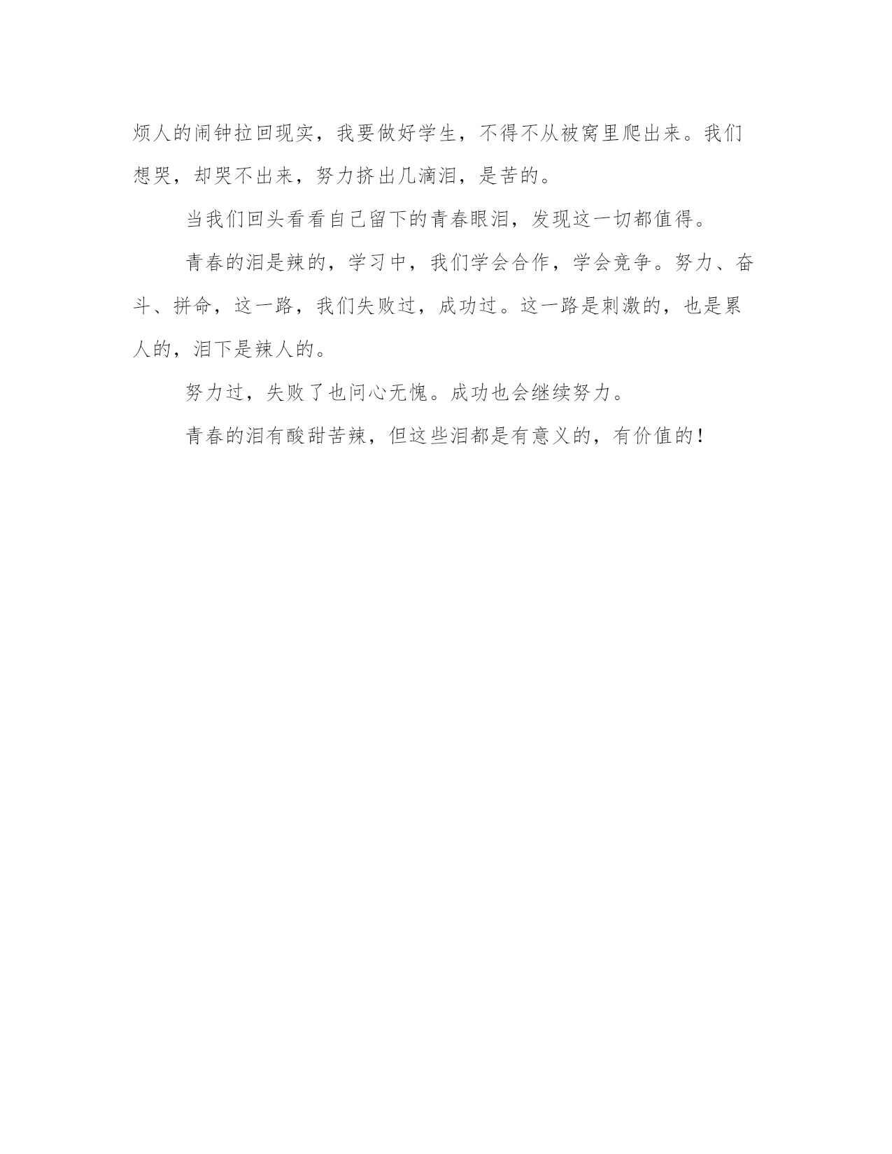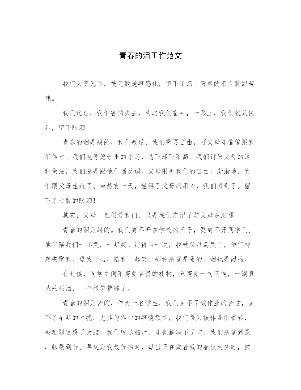 青春的泪工作范文我们天真无邪,被无数是事感化,留下了泪。青春的泪有酸甜苦辣。我们迷茫,我们害怕失去,为之我们奋斗,一路上,我们收获快乐,留下眼泪。青春的泪是酸的,我们叛逆,我们需要自由,可父母却偏偏跟我们作对。我们就像笼子里的小鸟,想飞却飞不高。我们讨厌父母的这种做法,我们总是跟他们唱反调。父母限制我们的自由。渐渐地,我们跟父母生疏了。突然有一天,懂得了父母的用心,我们感到了。留下了心酸的眼泪!其实,父母一直很爱我们,只是我们忘记了与父母多沟通青春的泪是甜的。我们离不开在学校的日子,更离不开同学们。他们陪我们一起哭,一起笑。记得有一次,我被父母骂哭了,他们特定安慰我。逗我开心,陪我一起笑,那种感觉是甜的,泪也是甜的。有时候,同学之间不需要名贵的礼物,只需要一句问候,一滴真诚的眼泪,一个微笑就够了。青春的泪是苦的,作为一名学生,我们免不了做作业的苦恼,免不了早起的困扰。尤其为作业的事情烦恼,我们每天被作业围着转,被难题迷惑了大脑,我们绞尽脑汁,却也解决不了它,我们感觉到累,韩厥到苦。早起是我最苦的时,每当正在做着我的春秋大梦时,被烦人的闹钟拉回现实,我要做好学生,不得不从被窝里爬出来。我们想哭,却哭不出来,努力挤出几滴泪,是苦的。当我们回头看看自己留下的青春眼泪,发现这一切都值得。青春的泪是辣的,学习中,我们学会合作,学会竞争。努力、奋斗、拼命,这一路,我们失败过,成功过。这一路是刺激的,也是累人的,泪下是辣人的。努力过,失败了也问心无愧。成功也会继续努力。青春的泪有酸甜苦辣,但这些泪都是有意义的,有价值的!