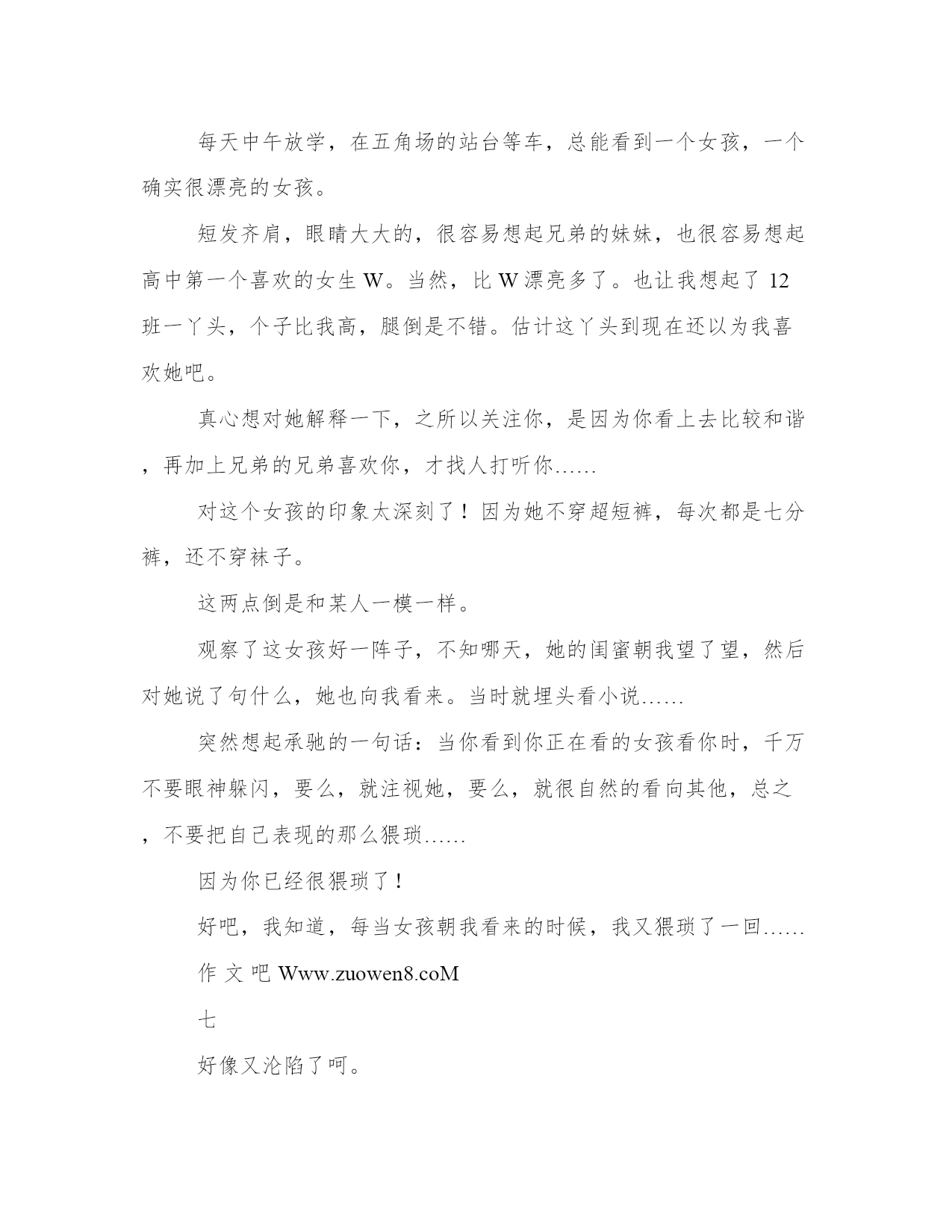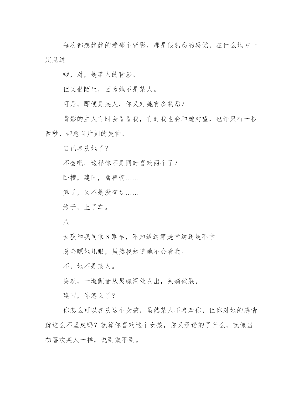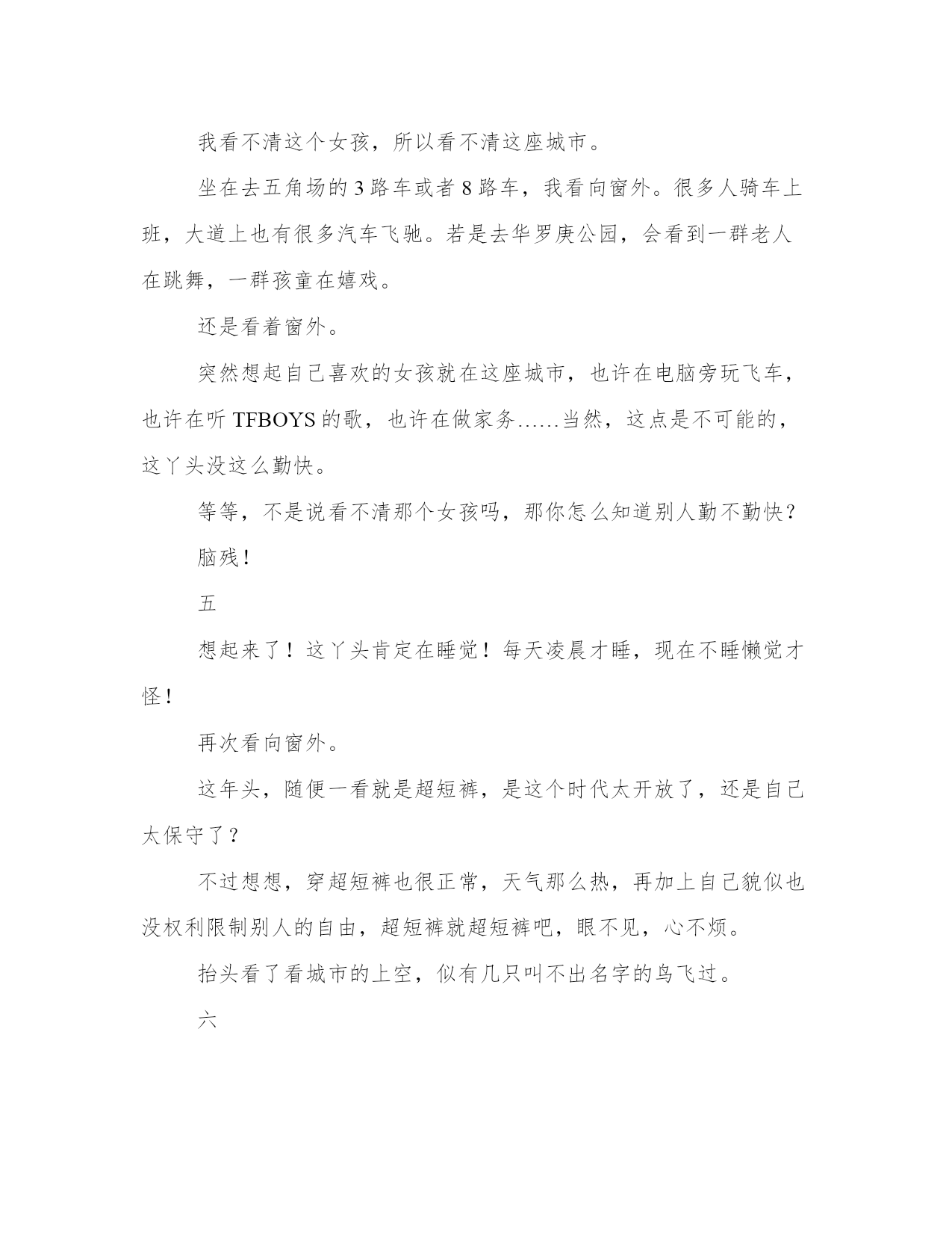 一座空城工作范文一如果,一切繁华皆可淡去;如果,风与火没有交集;如果,没有俗名的枷锁;如果,天选者不是一个特定名词;如果,我还是那个只追逐动画的男孩,那么——二仙路尽头谁为峰,一见无始道成空。看了几篇九州缥缈录,再次看遮天。那个叶性少年,不,应该是叶性青年,再次回到北斗星域,却是物是人非。好兄弟死的死伤的伤,不知去向;曾经的恋人向兄弟痛下杀手,这些足以让人疯狂。于是,圣体回归,纵横天下,带领蛮族讨伐无上圣地王家,设下杀阵坑杀敌手,建立天庭,名震大陆。可是,当他再次遇到安妙依时,佳人已快斩道,而她斩道就必须忘了他,忘了曾经。辰东那段写得很伤感,想哭却又哭不出来。当他寻找秦瑶时,那个第一个和他发生关系的女子早已因修炼走火入魔而死。那段很压抑。终于,由于又发现了羽化神朝的遗迹,再次探寻,并击杀狠人大帝传承者华云飞,却知道了又一个秘密;曾经的恋人李小曼想要杀他,被他击败,却告诉他自己最好的兄弟是坏的,也才发现李小曼被鳄祖附身,才失去心智。在佳人跳下祭坛之后,那个王者堕入了深渊……他甚至不想再去想现在的红颜姬紫月,不再去想猴子,李黑水,齐罗……他迷失了……只想回家……金色的大门关上时,才想起那个叫姬紫月的女孩……千辛万苦回到地球,可是父母已经去世,昔日的恋人的女儿都有16岁。物是人非……他在那个城市漫无目的地游荡……三每天早上醒来就是看小说,知道会迷失自己,却依然要看,因为我不知道那一个多小时干什么。终于,到时间了,刷牙洗脸,然后上路,继续看书。罗村去金坛少说是40分钟的路程。路上,只有三件事,看小说,睡觉,发呆。哦,不,还有一件事,看看车里有没有好看的妹子,再注意一下形象,接着……睡觉。路上的时间很快过去,终于,穿过算是树林的东西,到了龙山桥底,下了车。站在了这座城市的土地上。四我看不清这座城市。因为这座城市里有我喜欢的女孩。我看不清这个女孩,所以看不清这座城市。坐在去五角场的3路车或者8路车,我看向窗外。很多人骑车上班,大道上也有很多汽车飞驰。若是去华罗庚公园,会看到一群老人在跳舞,一群孩童在嬉戏。还是看着窗外。突然想起自己喜欢的女孩就在这座城市,也许在电脑旁玩飞车,也许在听TFBOYS的歌,也许在做家务……当然,这点是不可能的,这丫头没这么勤快。等等,不是说看不清那个女孩吗,那你怎么知道别人勤不勤快?脑残!五想起来了!这丫头肯定在睡觉!每天凌晨才睡,现在不睡懒觉才怪!再次看向窗外。这年头,随便一看就是超短裤,是这个时代太开放了,还是自己太保守了?不过想想,穿超短裤也很正常,天气那么热,再加上自己貌似也没权利限制别人的自由,超短裤就超短裤吧,眼不见,心不烦。抬头看了看城市的上空,似有几只叫不出名字的鸟飞过。六每天中午放学,在五角场的站台等车,总能看到一个女孩,一个确实很漂亮的女孩。短发齐肩,眼睛大大的,很容易想起兄弟的妹妹,也很容易想起高中第一个喜欢的女生W。当然,比W漂亮多了。也让我想起了12班一丫头,个子比我高,腿倒是不错。估计这丫头到现在还以为我喜欢她吧。真心想对她解释一下,之所以关注你,是因为你看上去比较和谐,再加上兄弟的兄弟喜欢你,才找人打听你……对这个女孩的印象太深刻了!因为她不穿超短裤,每次都是七分裤,还不穿袜子。这两点倒是和某人一模一样。观察了这女孩好一阵子,不知哪天,她的闺蜜朝我望了望,然后对她说了句什么,她也向我看来。当时就埋头看小说……突然想起承驰的一句话:当你看到你正在看的女孩看你时,千万不要眼神躲闪,要么,就注视她,要么,就很自然的看向其他,总之,不要把自己表现的那么猥琐……因为你已经很猥琐了!好吧,我知道,每当女孩朝我看来的时候,我又猥琐了一回……作文吧Www.zuowen8.coM七好像又沦陷了呵。每次都想静静的看那个背影,那是很熟悉的感觉,在什么地方一定见过……哦,对,是某人的背影。但又很陌生,因为她不是某人。可是,即便是某人,你又对她有多熟悉?背影的主人有时会看看我,有时我也会和她对望,也许只有一秒两秒,却总有片刻的失神。自己喜欢她了?不会吧,这样你不是同时喜欢两个了?卧槽,建国,禽兽啊……算了,又不是没有过……终于,上了车。八女孩和我同乘8路车,不知道这算是幸运还是不幸……总会瞟她几眼,虽然我知道她不会看我。不,她不是某人。突然,一道颤音从灵魂深处发出,头痛欲裂。建国,你怎么了?你怎么可以喜欢这个女孩,虽然某人不喜欢你,但你对她的感情就这么不坚定吗?就算你喜欢这个女孩,你又承诺的了什么,就像当初喜欢某人一样,说到做不到。有什么用?几番纠结之后,下了车。很注意形象的穿过马路,无论车里的女孩会不会看我。然后很落魄的走进闹市。九七八月份的太阳,最是毒辣。那种温度仿佛置身火炉,可以融化掉四肢和头颅,甚至灵魂。每次走过一家水果店,都会听到小苹果。你是我的小呀小苹果/怎么爱你都不嫌多……之后,我便继续走,在这