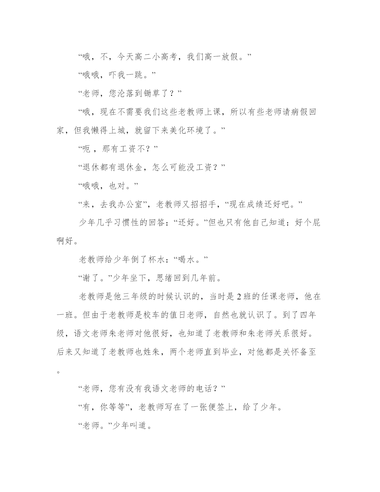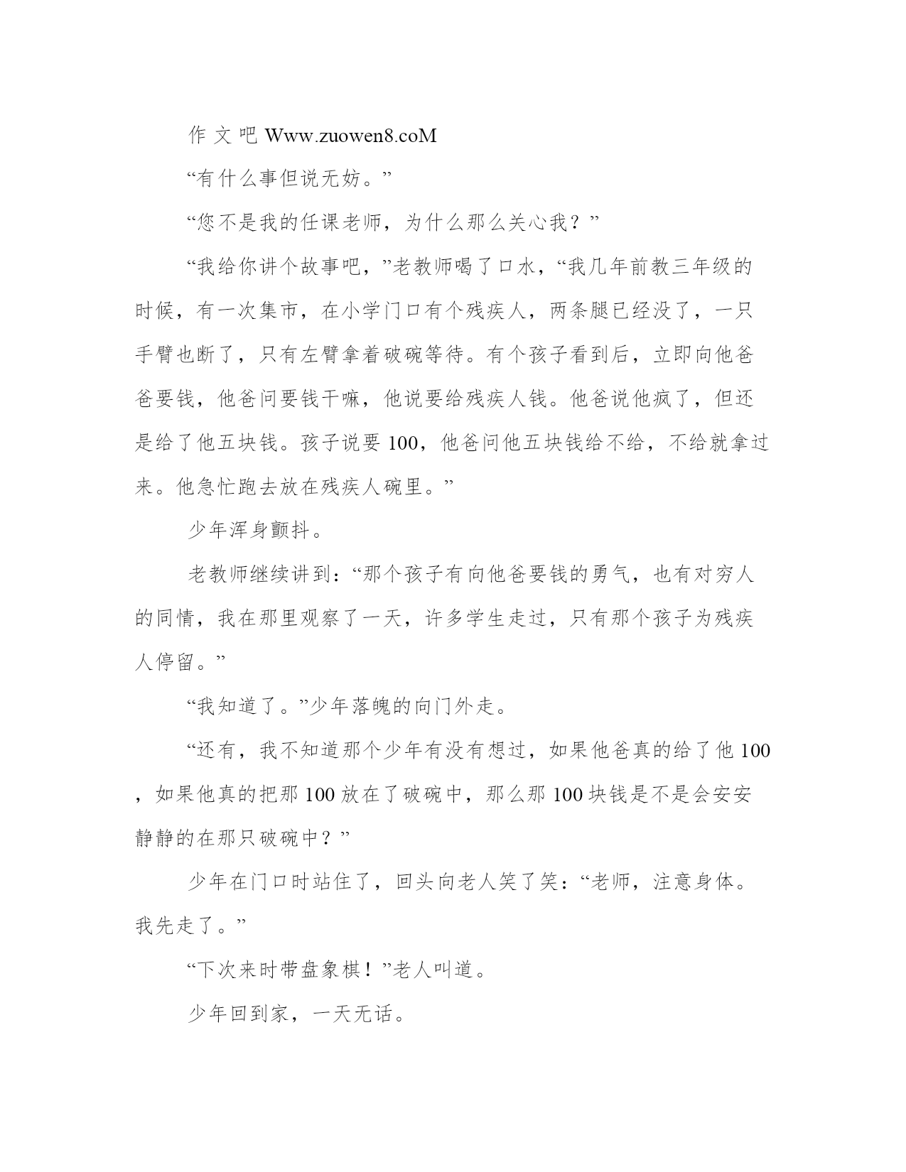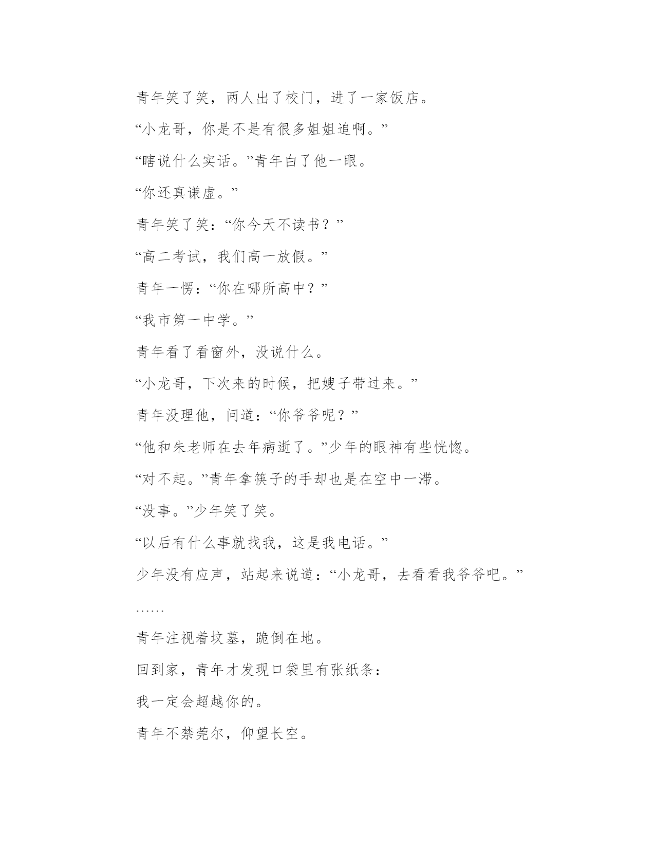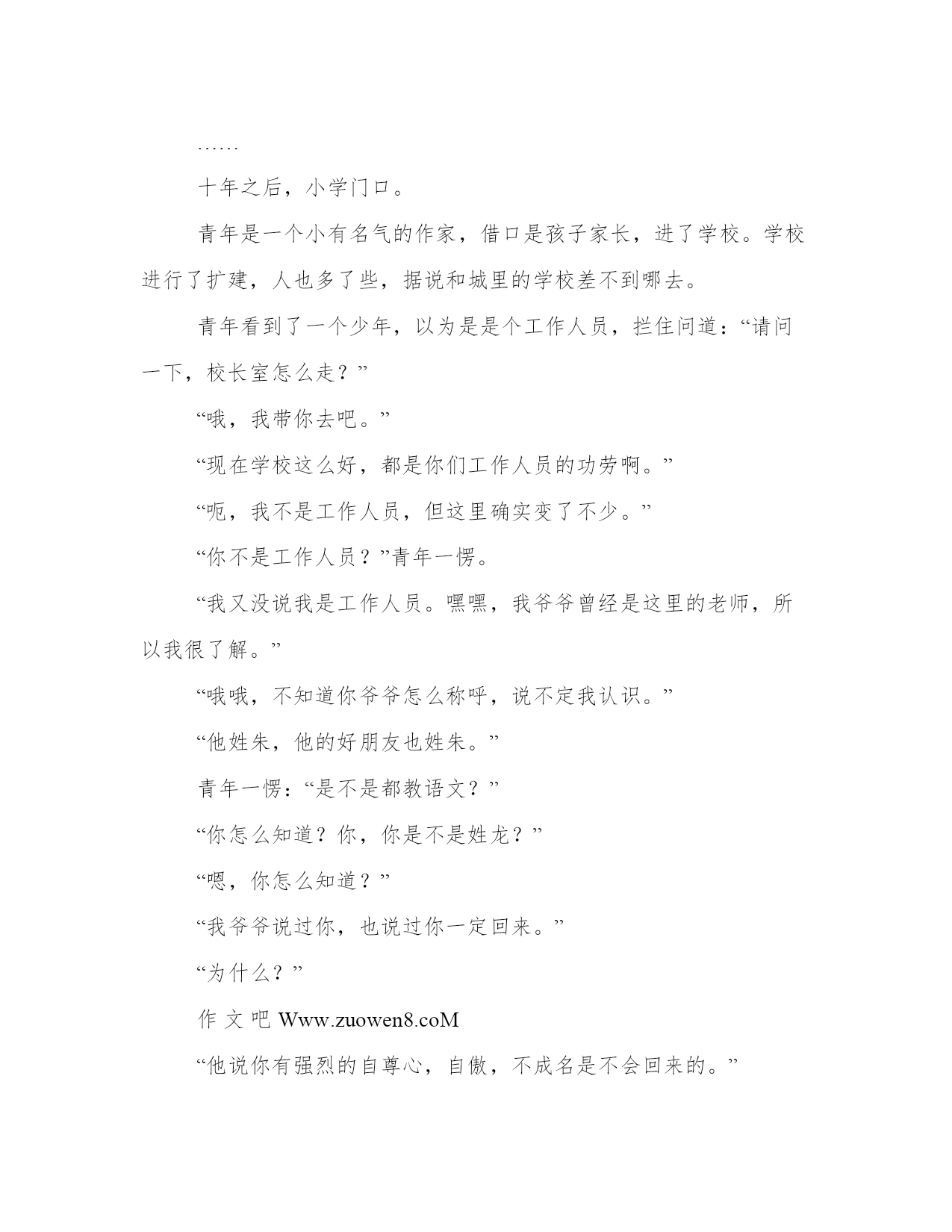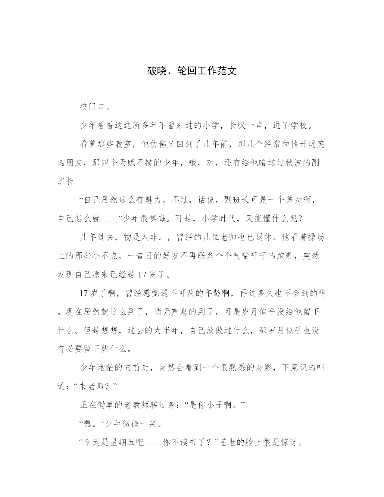 破晓、轮回工作范文校门口。少年看看这这所多年不曾来过的小学,长叹一声,进了学校。看着那些教室,他仿佛又回到了几年前,那几个经常和他开玩笑的朋友,那四个天赋不错的少年,哦,对,还有给他暗送过秋波的副班长………“自己居然这么有魅力,不过,话说,副班长可是一个美女啊,自己怎么就……”少年很懊悔。可是,小学时代,又能懂什么呢?几年过去,物是人非。,曾经的几位老师也已退休。他看着操场上的那些小不点,一昔日的好友不再联系个个气喘吁吁的跑着,突然发现自己原来已经是17岁了。17岁了啊,曾经感觉遥不可及的年龄啊,再过多久也不会到的啊。现在居然就这么到了,悄无声息的到了,可是岁月似乎没给他留下什么。但是想想,过去的大半年,自己没做过什么,那岁月似乎也没有必要留下些什么。少年迷茫的向前走,突然会看到一个很熟悉的身影,下意识的叫道:“朱老师?”正在锄草的老教师转过身:“是你小子啊。”“嗯。”少年微微一笑。“今天是星期五吧……你不读书了?”苍老的脸上很是惊讶。“哦,不,今天高二小高考,我们高一放假。”“哦哦,吓我一跳。”“老师,您沦落到锄草了?”“哦,现在不需要我们这些老教师上课,所以有些老师请病假回家,但我懒得上城,就留下来美化环境了。”“呃,那有工资不?”“退休都有退休金,怎么可能没工资?”“哦哦,也对。”“来,去我办公室”,老教师又招招手,“现在成绩还好吧。”少年几乎习惯性的回答:“还好。”但也只有他自己知道:好个屁啊好。老教师给少年倒了杯水:“喝水。”“谢了。”少年坐下,思绪回到几年前。老教师是他三年级的时候认识的,当时是2班的任课老师,他在一班。但由于老教师是校车的值日老师,自然也就认识了。到了四年级,语文老师朱老师对他很好,也知道了老教师和朱老师关系很好。后来又知道了老教师也姓朱,两个老师直到毕业,对他都是关怀备至。“老师,您有没有我语文老师的电话?”“有,你等等”,老教师写在了一张便签上,给了少年。“老师。”少年叫道。作文吧Www.zuowen8.coM“有什么事但说无妨。”“您不是我的任课老师,为什么那么关心我?”“我给你讲个故事吧,”老教师喝了口水,“我几年前教三年级的时候,有一次集市,在小学门口有个残疾人,两条腿已经没了,一只手臂也断了,只有左臂拿着破碗等待。有个孩子看到后,立即向他爸爸要钱,他爸问要钱干嘛,他说要给残疾人钱。他爸说他疯了,但还是给了他五块钱。孩子说要100,他爸问他五块钱给不给,不给就拿过来。他急忙跑去放在残疾人碗里。”少年浑身颤抖。老教师继续讲到:“那个孩子有向他爸要钱的勇气,也有对穷人的同情,我在那里观察了一天,许多学生走过,只有那个孩子为残疾人停留。”“我知道了。”少年落魄的向门外走。“还有,我不知道那个少年有没有想过,如果他爸真的给了他100,如果他真的把那100放在了破碗中,那么那100块钱是不是会安安静静的在那只破碗中?”少年在门口时站住了,回头向老人笑了笑:“老师,注意身体。我先走了。”“下次来时带盘象棋!”老人叫道。少年回到家,一天无话。……十年之后,小学门口。青年是一个小有名气的作家,借口是孩子家长,进了学校。学校进行了扩建,人也多了些,据说和城里的学校差不到哪去。青年看到了一个少年,以为是是个工作人员,拦住问道:“请问一下,校长室怎么走?”“哦,我带你去吧。”“现在学校这么好,都是你们工作人员的功劳啊。”“呃,我不是工作人员,但这里确实变了不少。”“你不是工作人员?”青年一愣。“我又没说我是工作人员。嘿嘿,我爷爷曾经是这里的老师,所以我很了解。”“哦哦,不知道你爷爷怎么称呼,说不定我认识。”“他姓朱,他的好朋友也姓朱。”青年一愣:“是不是都教语文?”“你怎么知道?你,你是不是姓龙?”“嗯,你怎么知道?”“我爷爷说过你,也说过你一定回来。”“为什么?”作文吧Www.zuowen8.coM“他说你有强烈的自尊心,自傲,不成名是不会回来的。”青年笑了笑,两人出了校门,进了一家饭店。“小龙哥,你是不是有很多姐姐追啊。”“瞎说什么实话。”青年白了他一眼。“你还真谦虚。”青年笑了笑:“你今天不读书?”“高二考试,我们高一放假。”青年一愣:“你在哪所高中?”“我市第一中学。”青年看了看窗外,没说什么。“小龙哥,下次来的时候,把嫂子带过来。”青年没理他,问道:“你爷爷呢?”“他和朱老师在去年病逝了。”少年的眼神有些恍惚。“对不起。”青年拿筷子的手却也是在空中一滞。“没事。”少年笑了笑。“以后有什么事就找我,这是我电话。”少年没有应声,站起来说道:“小龙哥,去看看我爷爷吧。”……青年注视着坟墓,跪倒在地。回到家,青年才发现口袋里有张纸条:我一定会超越你的。青年不禁莞尔,仰望长空。青年打开了电脑,他的老师不希望他哭泣,他就只能继续在梦想之路上前行。