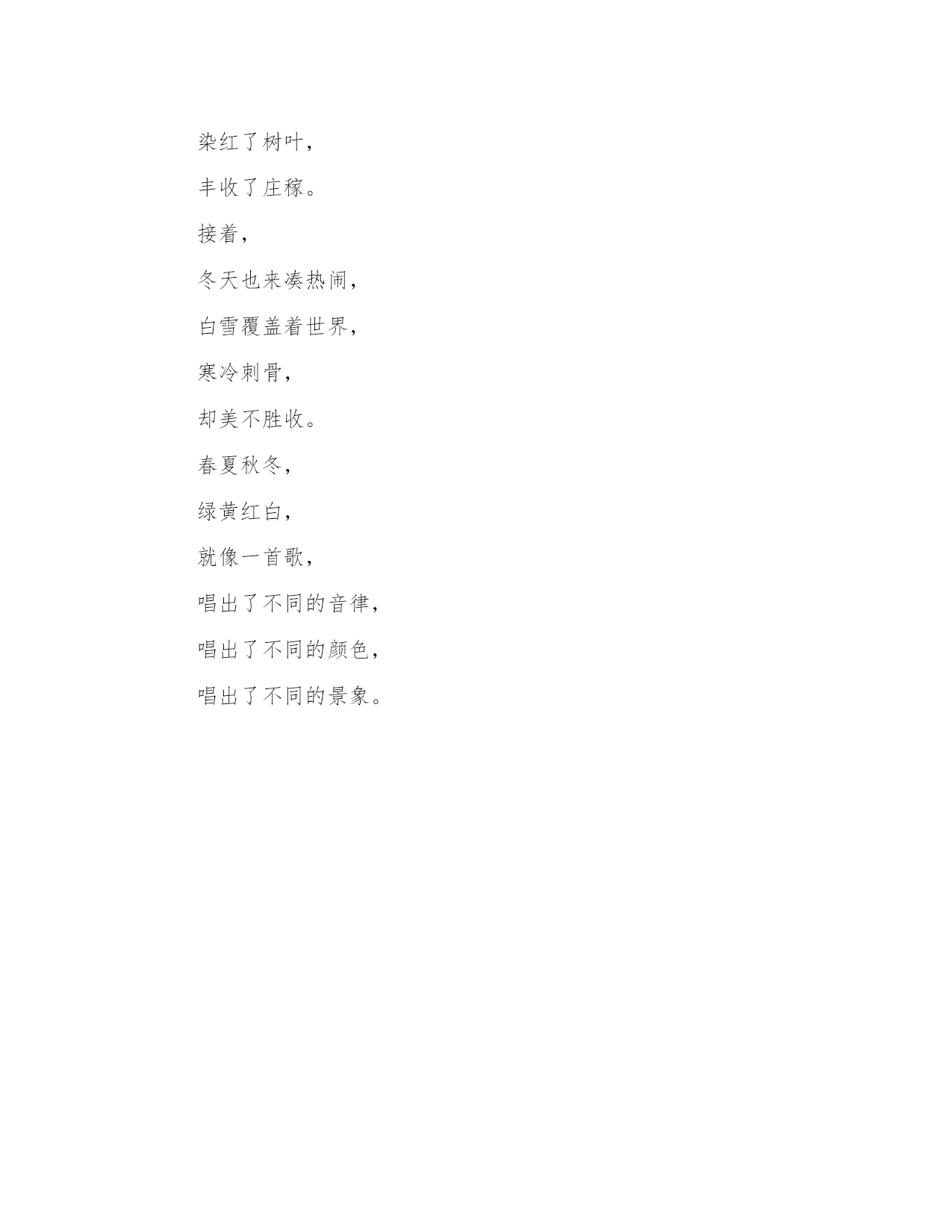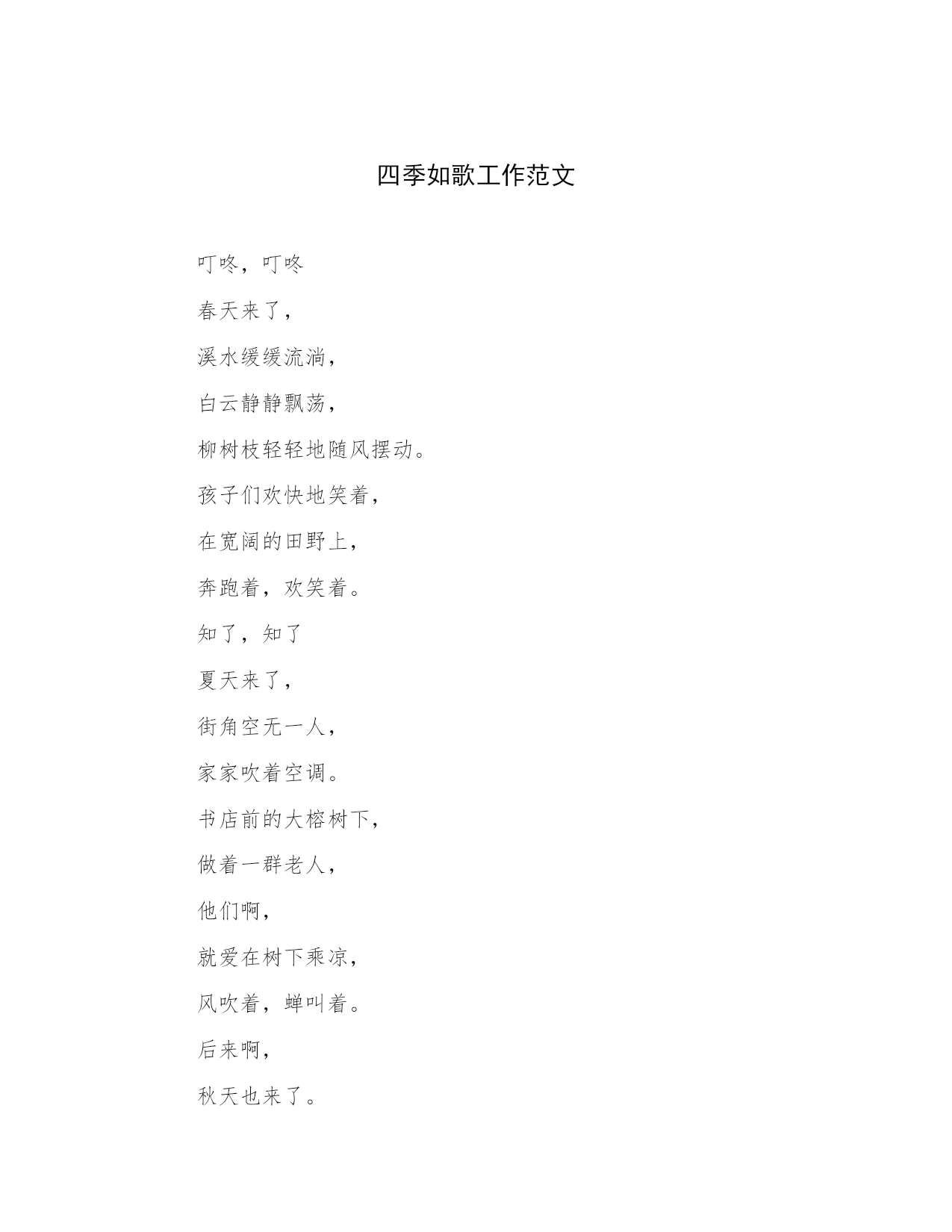 四季如歌工作范文叮咚,叮咚春天来了,溪水缓缓流淌,白云静静飘荡,柳树枝轻轻地随风摆动。孩子们欢快地笑着,在宽阔的田野上,奔跑着,欢笑着。知了,知了夏天来了,街角空无一人,家家吹着空调。书店前的大榕树下,做着一群老人,他们啊,就爱在树下乘凉,风吹着,蝉叫着。后来啊,秋天也来了。染红了树叶,丰收了庄稼。接着,冬天也来凑热闹,白雪覆盖着世界,寒冷刺骨,却美不胜收。春夏秋冬,绿黄红白,就像一首歌,唱出了不同的音律,唱出了不同的颜色,唱出了不同的景象。