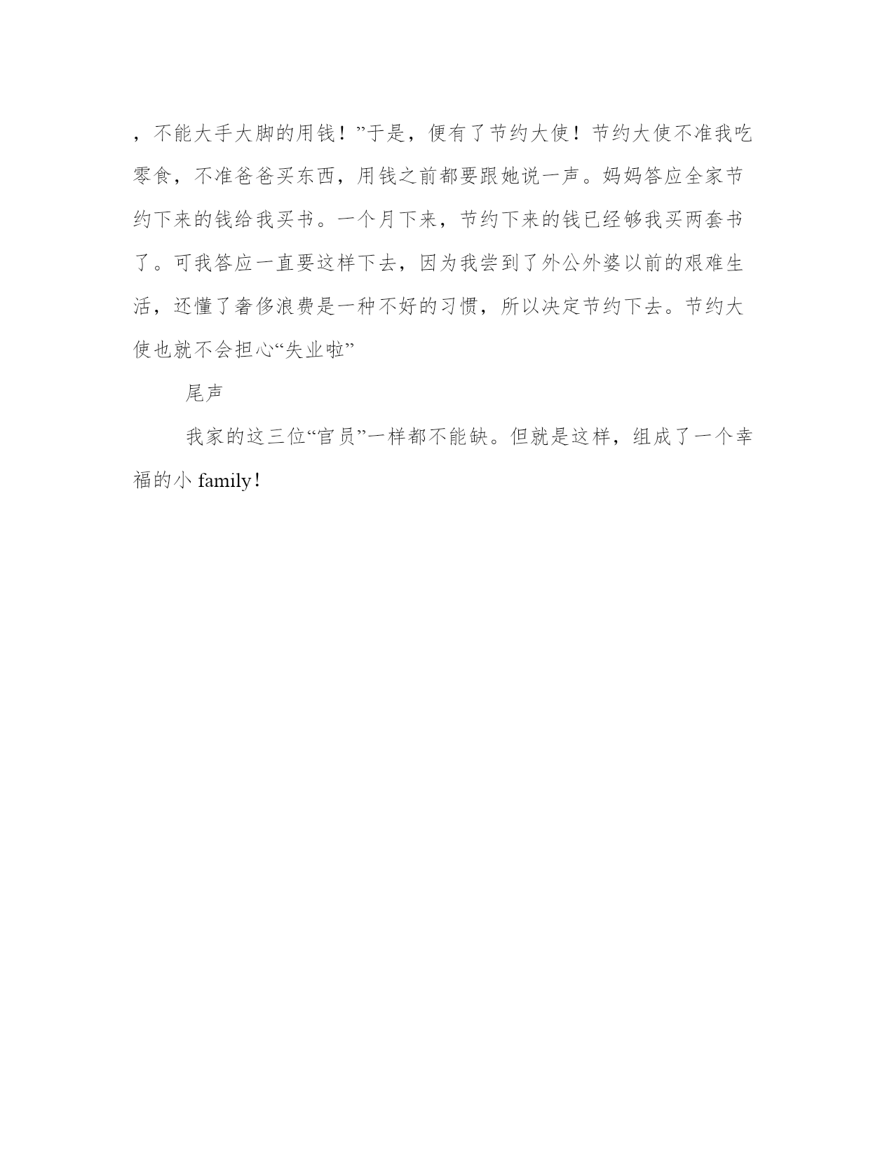 我家的三大“官员”我家有三大“官员”,有“节约大使”,有“卫生局长”,有“观察大吏”这三大官员!接下来,我就带你去我家看一下这三大“官员”吧!观察大吏——爸爸就先说说爸爸吧,爸爸是一个观察小兵。天天傍晚出去逛街,看看什么地方买菜,哪家的菜好些,那家的菜差些,那家的菜是大棚里种的,那家的菜是自家种的。所以爸爸天天得到很好的锻炼,因此非常的瘦,我和妈妈好几次都想让爸爸不当“观察大吏”,让爸爸当别的,可几次都没成功。卫生局长——我我是“卫生局长”。我的任务是看哈哈哈菜洗的干不干净,爸爸的米淘的干不干净。可正是因为家里人在吃饭时都吃到了饭菜里的沙子,便有了我——卫生局长!(给点掌声行不?)暑假里,爸爸哈哈哈米和菜早早地就洗了,然后就交给作业写完没事干的我!我则是很耐心的找米和菜里的沙子。菜就在水里漂一下,再一厘米一厘米的看;米呢,我就捉一小把,仔细的翻着看,再把“核实”过的米放到另一个碗里。之后,就等着妈妈烧饭啦!节约大使——妈妈我呢,一直想买一套查理九世和全套猫武士,可妈妈说:“我完全可以给你买一套,但是这次你要用节约的钱来买,好让你知道节约,不能大手大脚的用钱!”于是,便有了节约大使!节约大使不准我吃零食,不准爸爸买东西,用钱之前都要跟她说一声。妈妈答应全家节约下来的钱给我买书。一个月下来,节约下来的钱已经够我买两套书了。可我答应一直要这样下去,因为我尝到了外公外婆以前的艰难生活,还懂了奢侈浪费是一种不好的习惯,所以决定节约下去。节约大使也就不会担心“失业啦”尾声我家的这三位“官员”一样都不能缺。但就是这样,组成了一个幸福的小family!