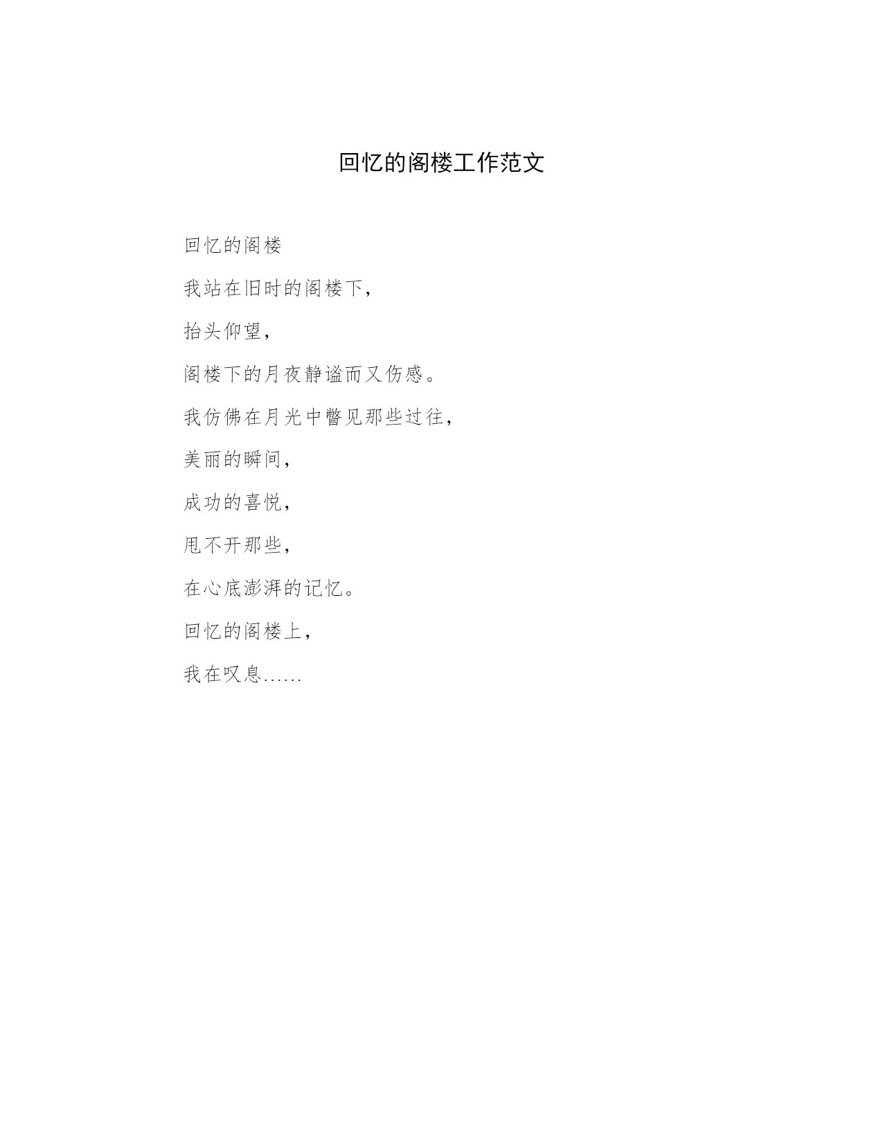 回忆的阁楼工作范文回忆的阁楼我站在旧时的阁楼下,抬头仰望,阁楼下的月夜静谧而又伤感。我仿佛在月光中瞥见那些过往,美丽的瞬间,成功的喜悦,甩不开那些,在心底澎湃的记忆。回忆的阁楼上,我在叹息……
