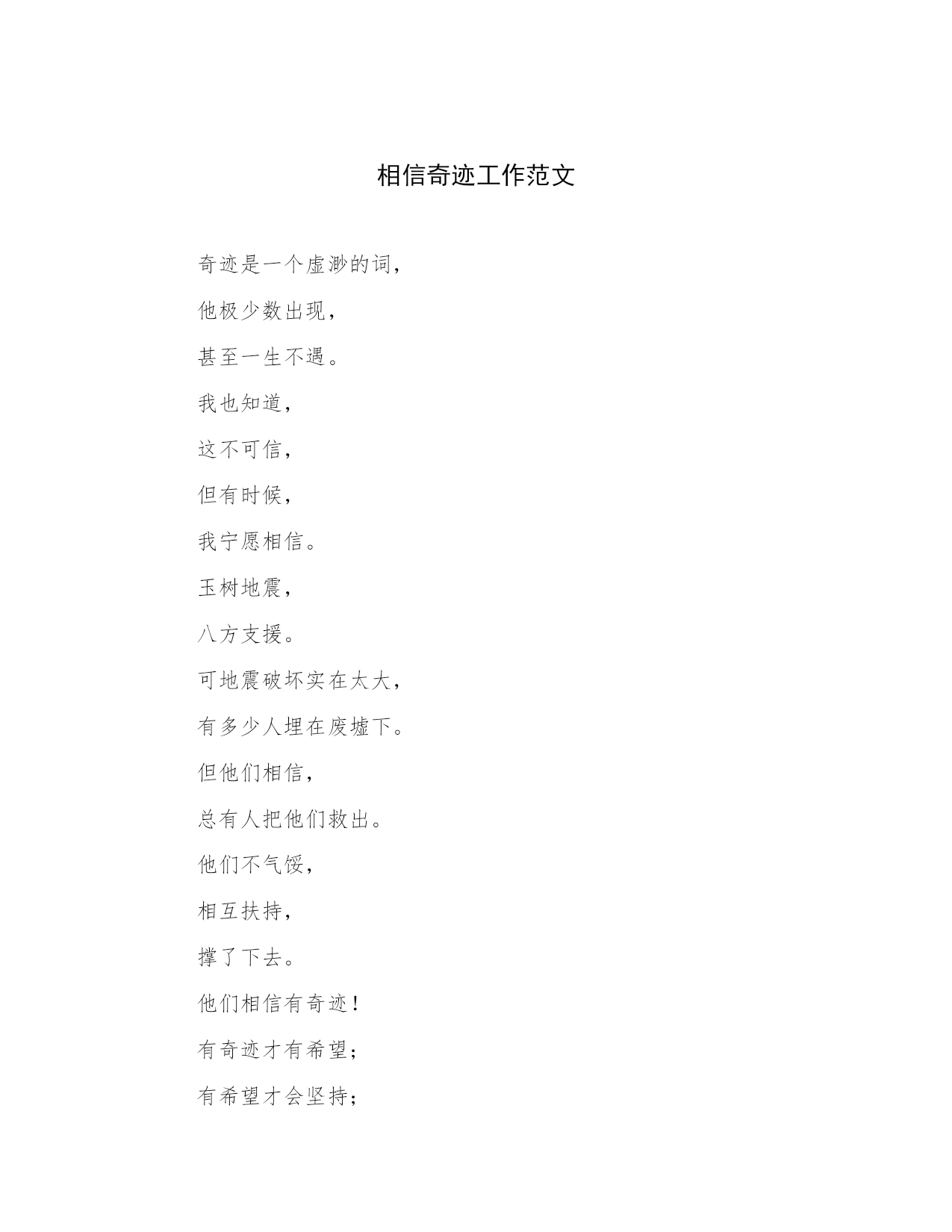 相信奇迹工作范文奇迹是一个虚渺的词,他极少数出现,甚至一生不遇。我也知道,这不可信,但有时候,我宁愿相信。玉树地震,八方支援。可地震破坏实在太大,有多少人埋在废墟下。但他们相信,总有人把他们救出。他们不气馁,相互扶持,撑了下去。他们相信有奇迹!有奇迹才有希望;有希望才会坚持;有坚持才有胜利!相信奇迹,相信生活不会抛弃你,相信你自己。