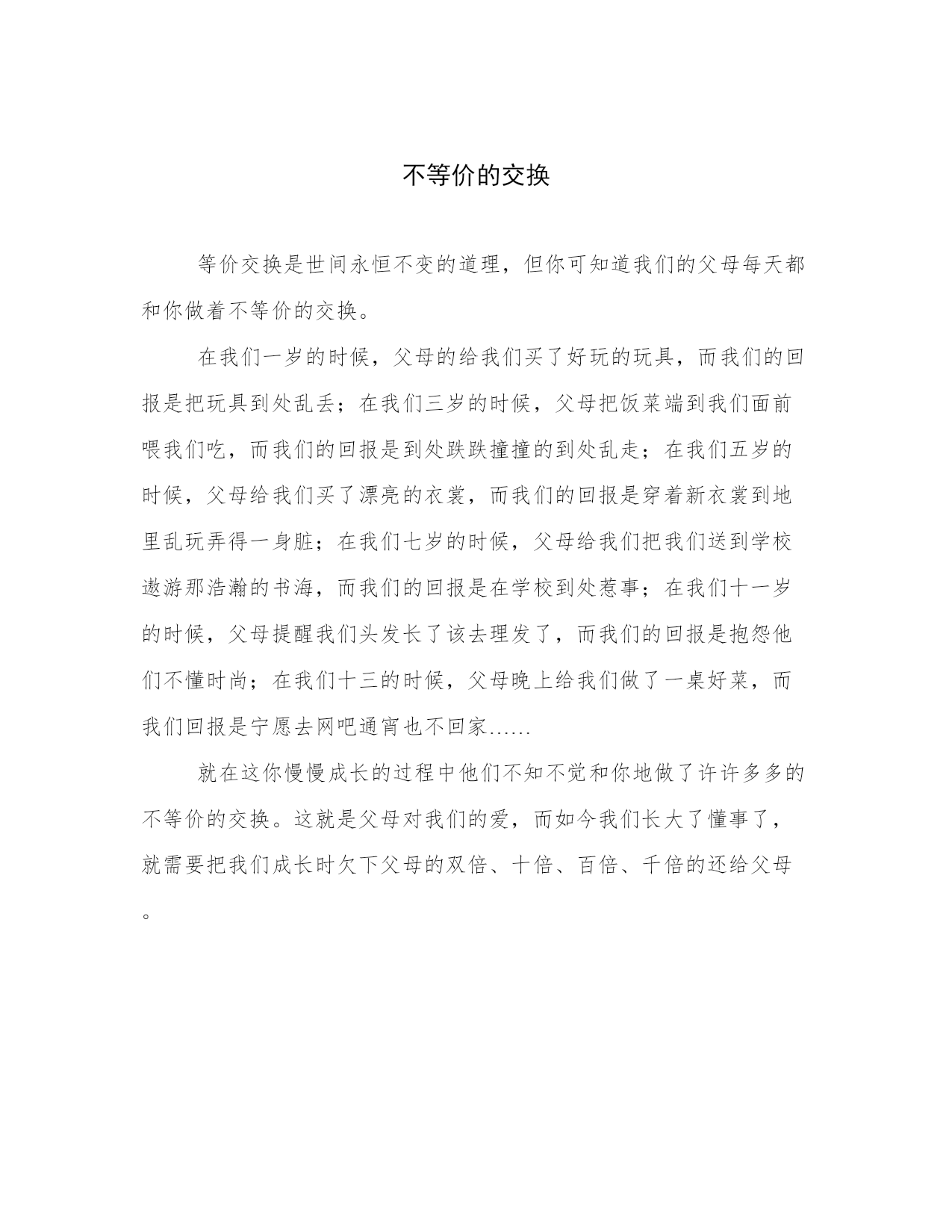 不等价的交换等价交换是世间永恒不变的道理,但你可知道我们的父母每天都和你做着不等价的交换。在我们一岁的时候,父母的给我们买了好玩的玩具,而我们的回报是把玩具到处乱丢;在我们三岁的时候,父母把饭菜端到我们面前喂我们吃,而我们的回报是到处跌跌撞撞的到处乱走;在我们五岁的时候,父母给我们买了漂亮的衣裳,而我们的回报是穿着新衣裳到地里乱玩弄得一身脏;在我们七岁的时候,父母给我们把我们送到学校遨游那浩瀚的书海,而我们的回报是在学校到处惹事;在我们十一岁的时候,父母提醒我们头发长了该去理发了,而我们的回报是抱怨他们不懂时尚;在我们十三的时候,父母晚上给我们做了一桌好菜,而我们回报是宁愿去网吧通宵也不回家……就在这你慢慢成长的过程中他们不知不觉和你地做了许许多多的不等价的交换。这就是父母对我们的爱,而如今我们长大了懂事了,就需要把我们成长时欠下父母的双倍、十倍、百倍、千倍的还给父母。