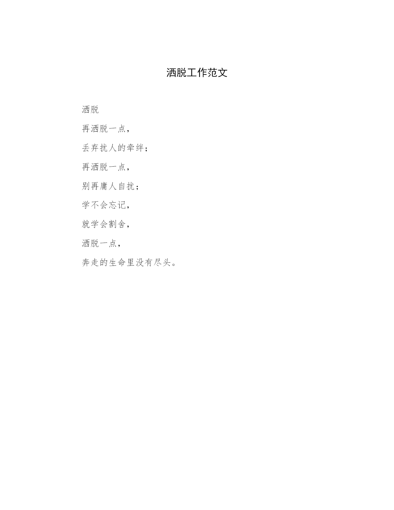 洒脱工作范文洒脱再洒脱一点,丢弃扰人的牵绊;再洒脱一点,别再庸人自扰;学不会忘记,就学会割舍,洒脱一点,奔走的生命里没有尽头。