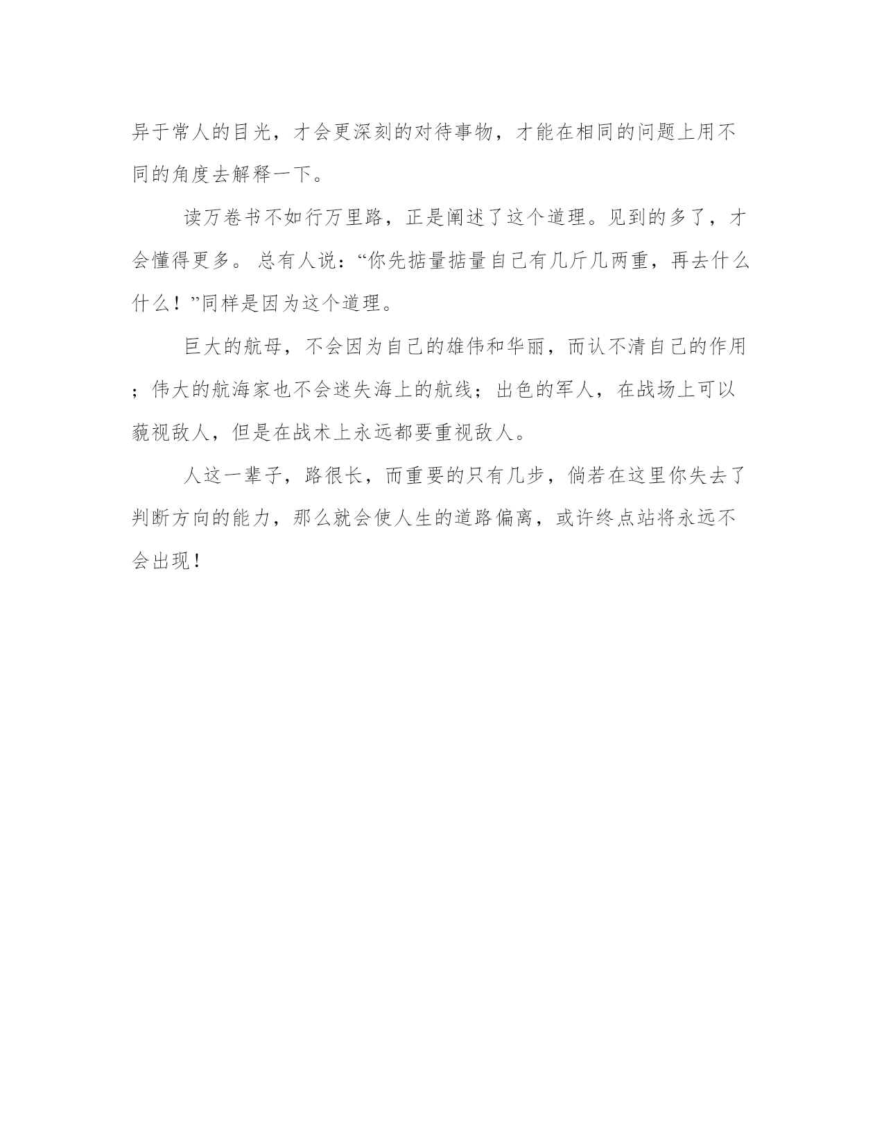 正视自己工作范文有人说过一句老话,骄傲使人退步,谦虚使人进步。正视自己,看待自己,只有知道自己的价值,才能更好的规划和设计未来。正确认清自己,我们才会认清自己未来的道路。我们所畏惧的是盲目自信,不知所谓,迷失未来。古有纸上谈兵的赵括,拥有夸夸其谈的好口才,却没有真才实学,真正的战场永远是瞬息万变,怎么会依照兵书行事?他的盲目使得三十万的大军被坑杀,而赵国最终失去争霸天下的资格。正视自己,不能过高看待,但同样不能看轻自己的价值。就好象在高考前夕时评估自己,一年前信心十足认为考五百多分轻而易举,六百分应该不是问题,可是经过多次的考试,如今的我早已遍体鳞伤,终于可以认清自己的价值,有一个正确的目标。一个虚幻而遥远的目标,只会令人一次次的对自己失望,虽说失败是成功之母,但是太过彻底的失败,还不如找一个力所能及的方向,一步一个脚印,踏实的走下去。人无远虑必有近忧。一个人要拥有长远的目光,看清楚未来的形势,找出一个明确的方向,这片人生的路途上才会十分容易,更加舒坦。有井底之蛙,困于荒井之中,目光投向的只是巴掌大的天空,却自大的评论天下风云;老乌龟见识过了无边无际的大海,看过了风起云涌的浪涛,拥有广阔的见识,所以他有诸多问题的经验,才拥有了异于常人的目光,才会更深刻的对待事物,才能在相同的问题上用不同的角度去解释一下。读万卷书不如行万里路,正是阐述了这个道理。见到的多了,才会懂得更多。总有人说:“你先掂量掂量自己有几斤几两重,再去什么什么!”同样是因为这个道理。巨大的航母,不会因为自己的雄伟和华丽,而认不清自己的作用;伟大的航海家也不会迷失海上的航线;出色的军人,在战场上可以藐视敌人,但是在战术上永远都要重视敌人。人这一辈子,路很长,而重要的只有几步,倘若在这里你失去了判断方向的能力,那么就会使人生的道路偏离,或许终点站将永远不会出现!