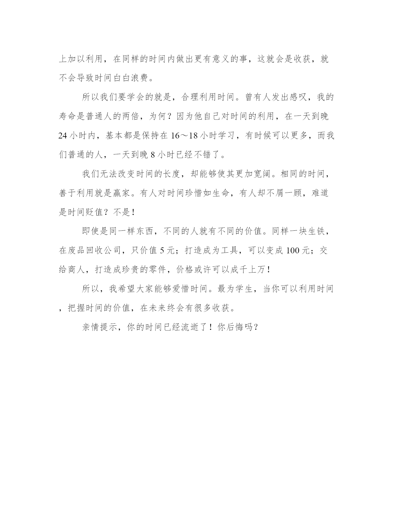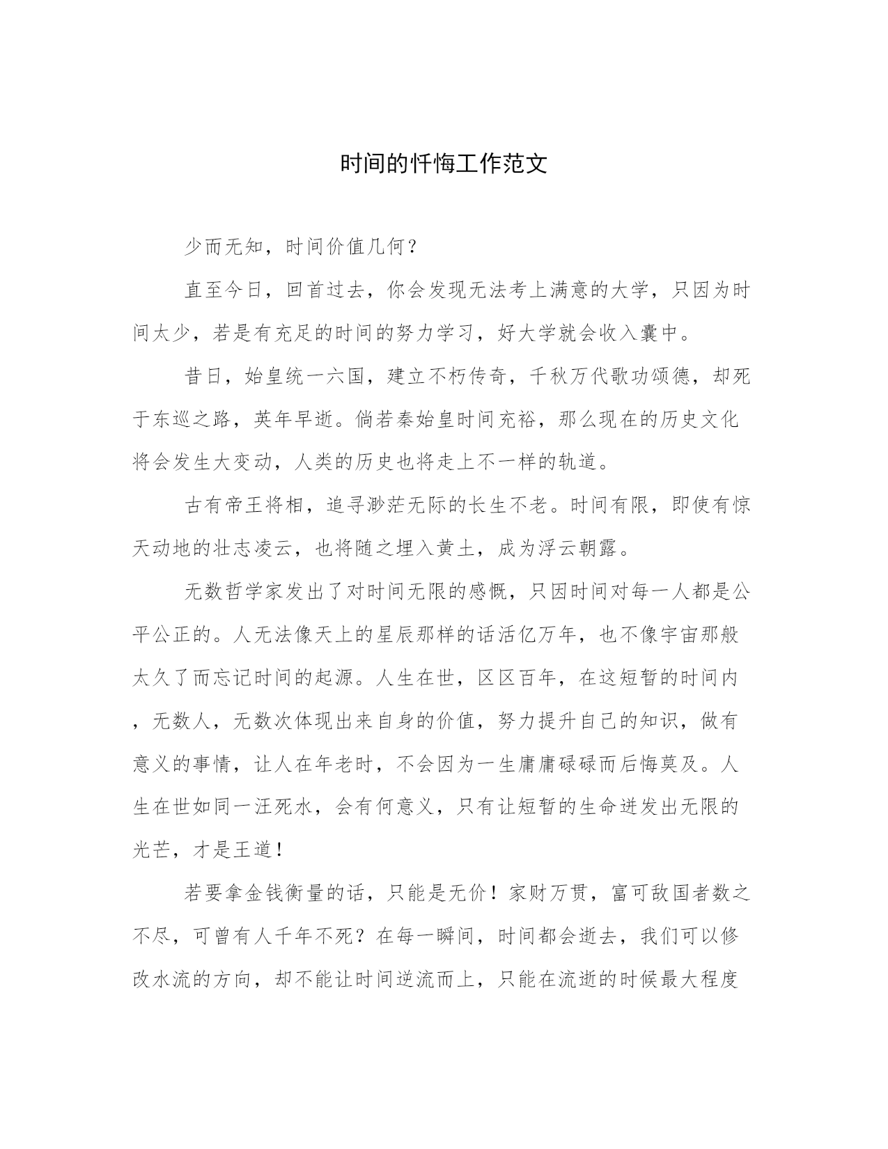 时间的忏悔工作范文少而无知,时间价值几何?直至今日,回首过去,你会发现无法考上满意的大学,只因为时间太少,若是有充足的时间的努力学习,好大学就会收入囊中。昔日,始皇统一六国,建立不朽传奇,千秋万代歌功颂德,却死于东巡之路,英年早逝。倘若秦始皇时间充裕,那么现在的历史文化将会发生大变动,人类的历史也将走上不一样的轨道。古有帝王将相,追寻渺茫无际的长生不老。时间有限,即使有惊天动地的壮志凌云,也将随之埋入黄土,成为浮云朝露。无数哲学家发出了对时间无限的感慨,只因时间对每一人都是公平公正的。人无法像天上的星辰那样的话活亿万年,也不像宇宙那般太久了而忘记时间的起源。人生在世,区区百年,在这短暂的时间内,无数人,无数次体现出来自身的价值,努力提升自己的知识,做有意义的事情,让人在年老时,不会因为一生庸庸碌碌而后悔莫及。人生在世如同一汪死水,会有何意义,只有让短暂的生命迸发出无限的光芒,才是王道!若要拿金钱衡量的话,只能是无价!家财万贯,富可敌国者数之不尽,可曾有人千年不死?在每一瞬间,时间都会逝去,我们可以修改水流的方向,却不能让时间逆流而上,只能在流逝的时候最大程度上加以利用,在同样的时间内做出更有意义的事,这就会是收获,就不会导致时间白白浪费。所以我们要学会的就是,合理利用时间。曾有人发出感叹,我的寿命是普通人的两倍,为何?因为他自己对时间的利用,在一天到晚24小时内,基本都是保持在16~18小时学习,有时候可以更多,而我们普通的人,一天到晚8小时已经不错了。我们无法改变时间的长度,却能够使其更加宽阔。相同的时间,善于利用就是赢家。有人对时间珍惜如生命,有人却不屑一顾,难道是时间贬值?不是!即使是同一样东西,不同的人就有不同的价值。同样一块生铁,在废品回收公司,只价值5元;打造成为工具,可以变成100元;交给商人,打造成珍贵的零件,价格或许可以成千上万!所以,我希望大家能够爱惜时间。最为学生,当你可以利用时间,把握时间的价值,在未来终会有很多收获。亲情提示,你的时间已经流逝了!你后悔吗?