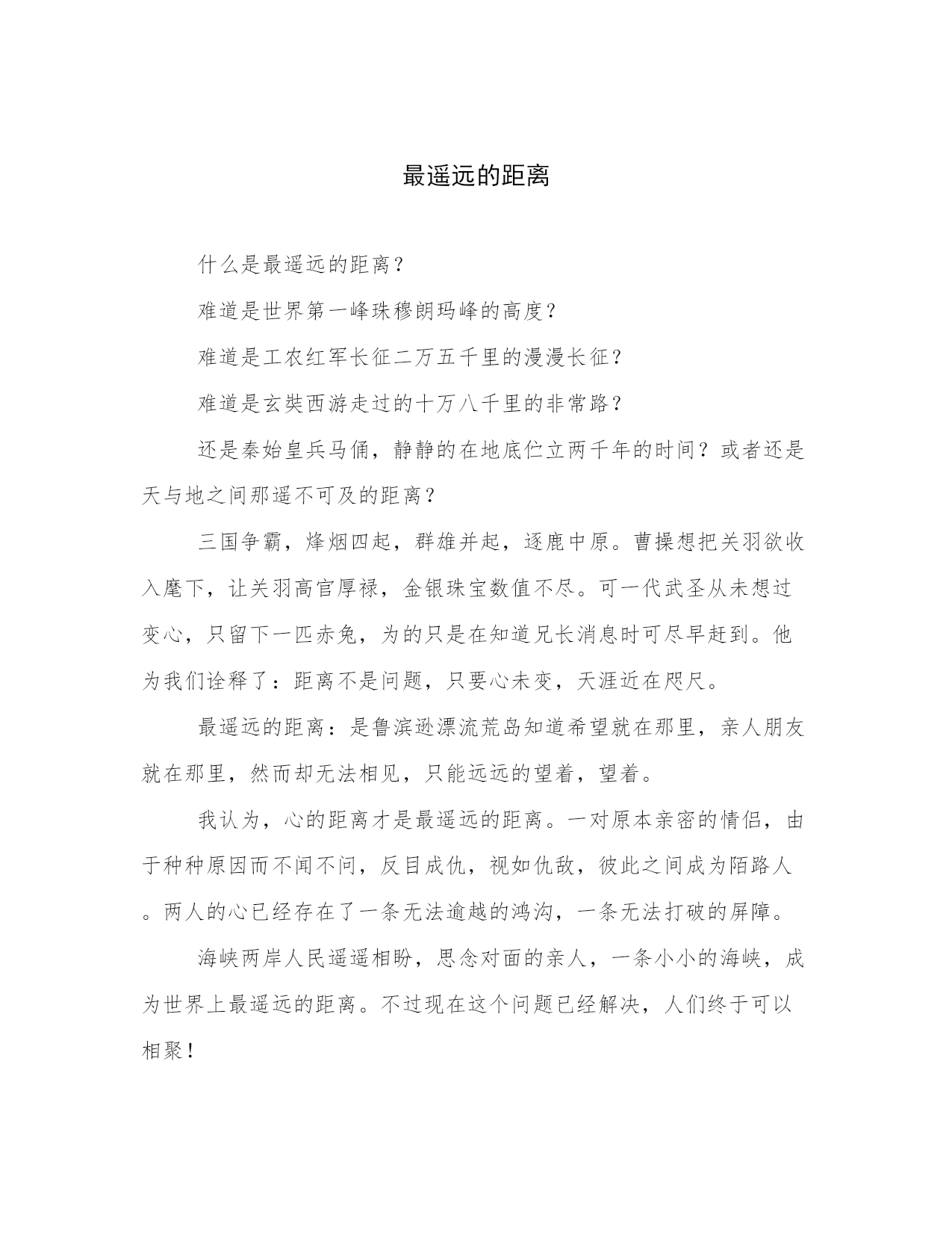 最遥远的距离什么是最遥远的距离?难道是世界第一峰珠穆朗玛峰的高度?难道是工农红军长征二万五千里的漫漫长征?难道是玄奘西游走过的十万八千里的非常路?还是秦始皇兵马俑,静静的在地底伫立两千年的时间?或者还是天与地之间那遥不可及的距离?三国争霸,烽烟四起,群雄并起,逐鹿中原。曹操想把关羽欲收入麾下,让关羽高官厚禄,金银珠宝数值不尽。可一代武圣从未想过变心,只留下一匹赤兔,为的只是在知道兄长消息时可尽早赶到。他为我们诠释了:距离不是问题,只要心未变,天涯近在咫尺。最遥远的距离:是鲁滨逊漂流荒岛知道希望就在那里,亲人朋友就在那里,然而却无法相见,只能远远的望着,望着。我认为,心的距离才是最遥远的距离。一对原本亲密的情侣,由于种种原因而不闻不问,反目成仇,视如仇敌,彼此之间成为陌路人。两人的心已经存在了一条无法逾越的鸿沟,一条无法打破的屏障。海峡两岸人民遥遥相盼,思念对面的亲人,一条小小的海峡,成为世界上最遥远的距离。不过现在这个问题已经解决,人们终于可以相聚!抗日战争时期,中国国产党与国民党政府彼此合作,共御外敌。不过,虽然同时中国人,但是两个党派,彼此的政治不同,成为两党之间的最大间隙,虽然离的很近,但实际上却相距离遥远,远的无法磨合,只能最终兵戎相见。世界上最遥远的距离,不是生与死,也不是你站在我面前,你却不知道我的心思,而是人与人之间心的距离!
